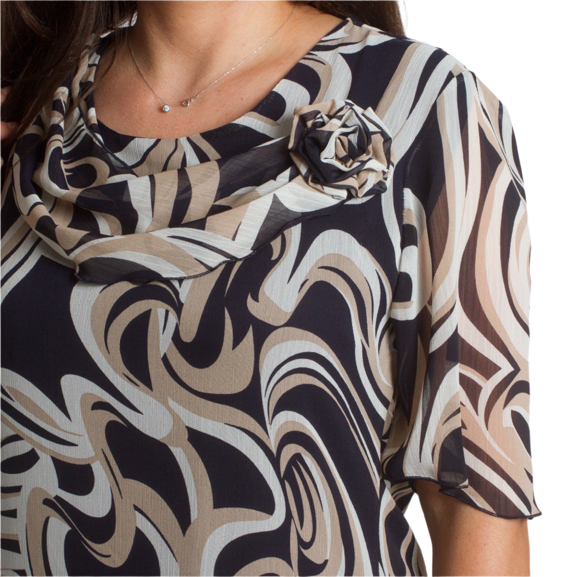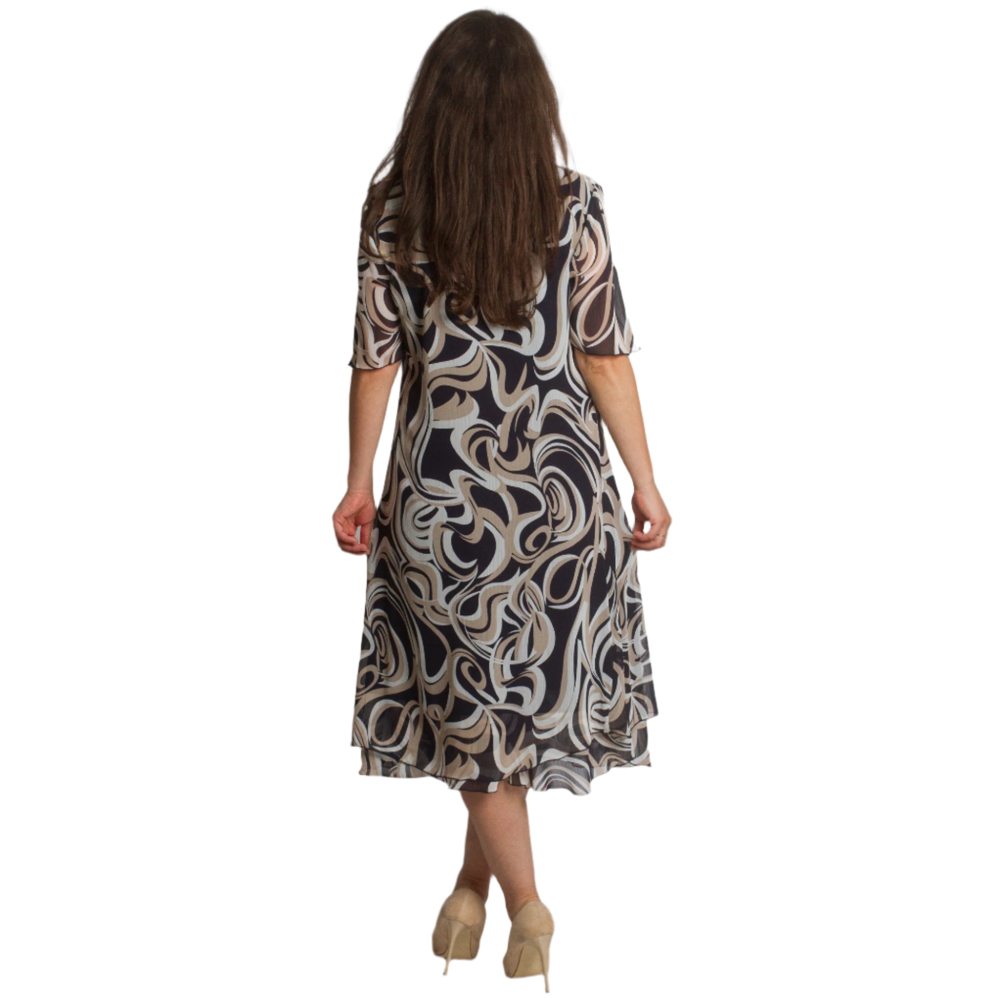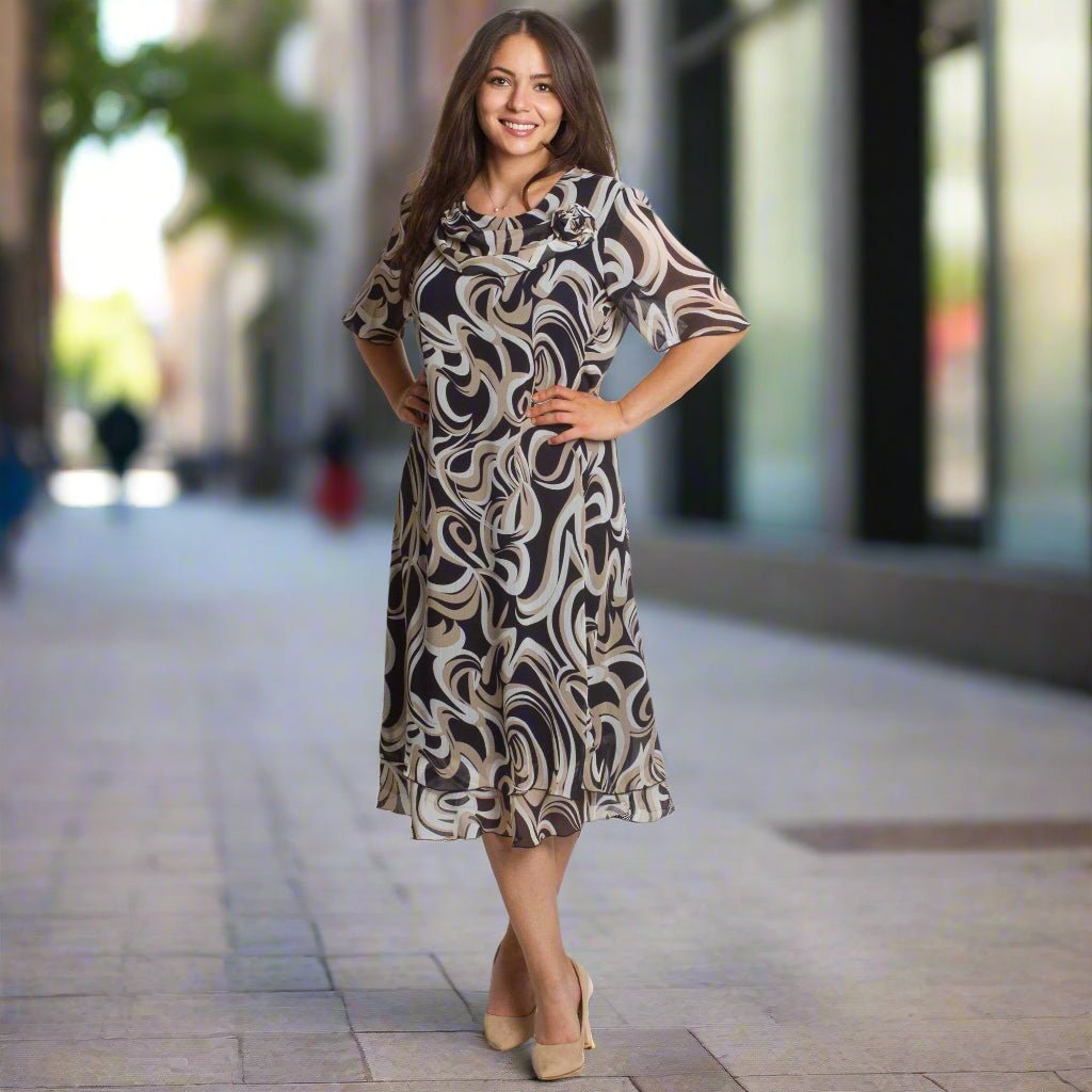 Adaugă eleganță și stil garderobei tale cu această rochie formală din șifon, creată special pentru doamnele plus-size. Modelul are o croială dreaptă și căptușeală elastică, care oferă confort pe tot parcursul zilei. Fundalul negru este combinat cu un model abstract bej spectaculos, iar pe umăr există o decorațiune elegantă - o floare confecționată din aceeași țesătură, oferind un finisaj unic look-ului. Este potrivită pentru sezonul primăvară-vară și ocazii formale precum sărbători, nunți sau cocktailuri.