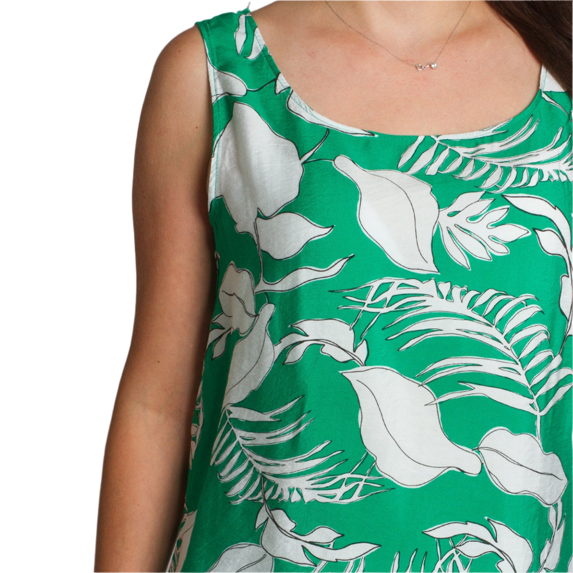 Top de damă proaspăt și elegant, într-o culoare verde intens, cu un imprimeu tropical elegant în alb. Modelul are un decolteu tip barcă și o croială lejeră care oferă confort și libertate de mișcare. Materialul este moale și elastic - cu un conținut ridicat de bumbac, ceea ce îl face o alegere ideală pentru zilele călduroase de primăvară-vară. Acest top este potrivit atât pentru viața de zi cu zi, cât și pentru ocazii mai elegante.