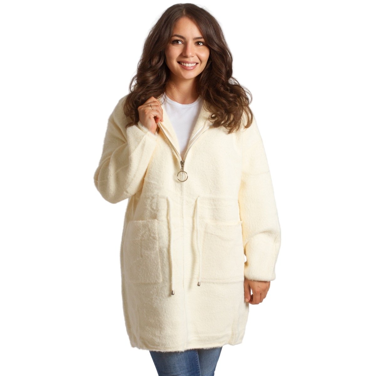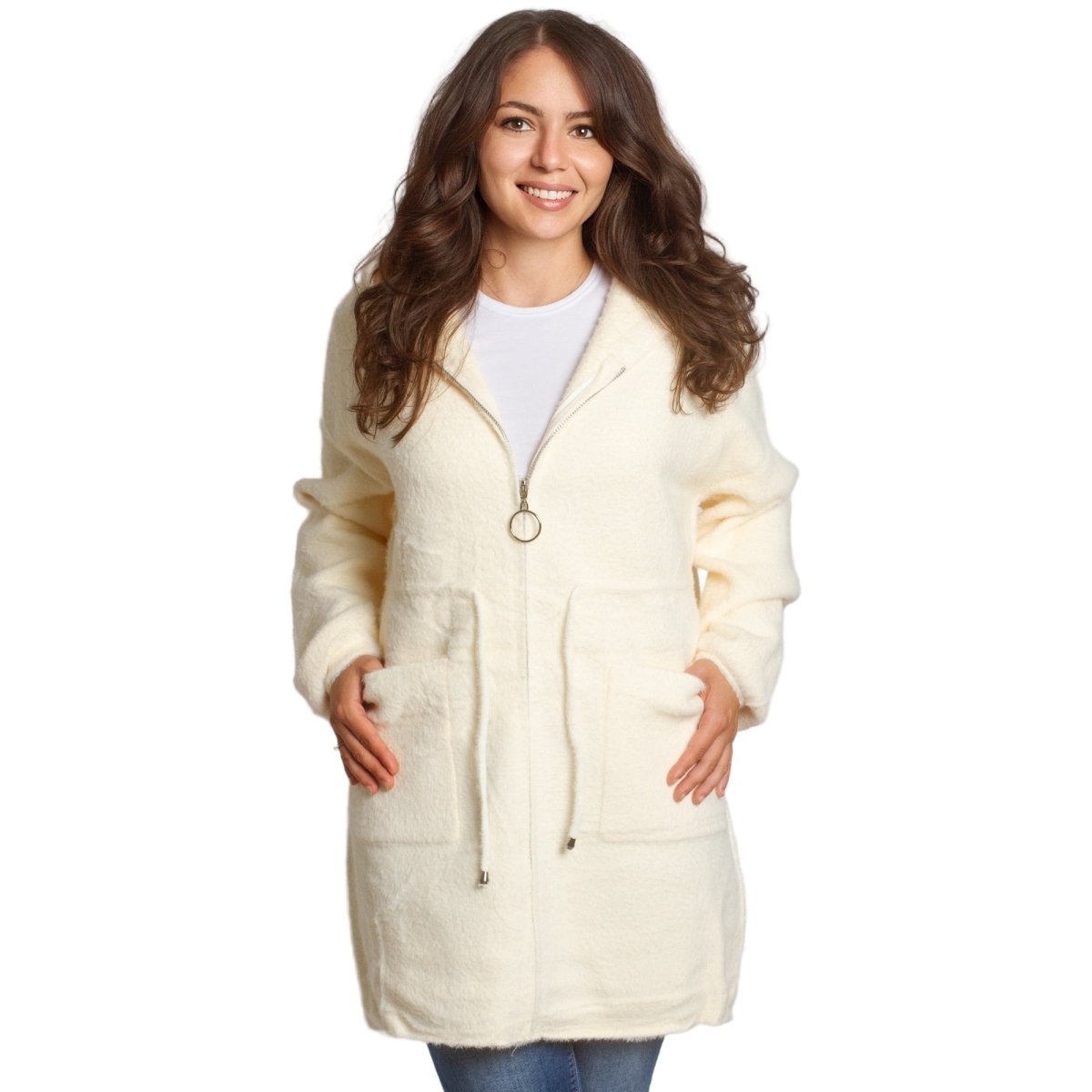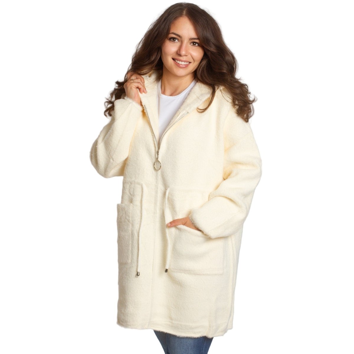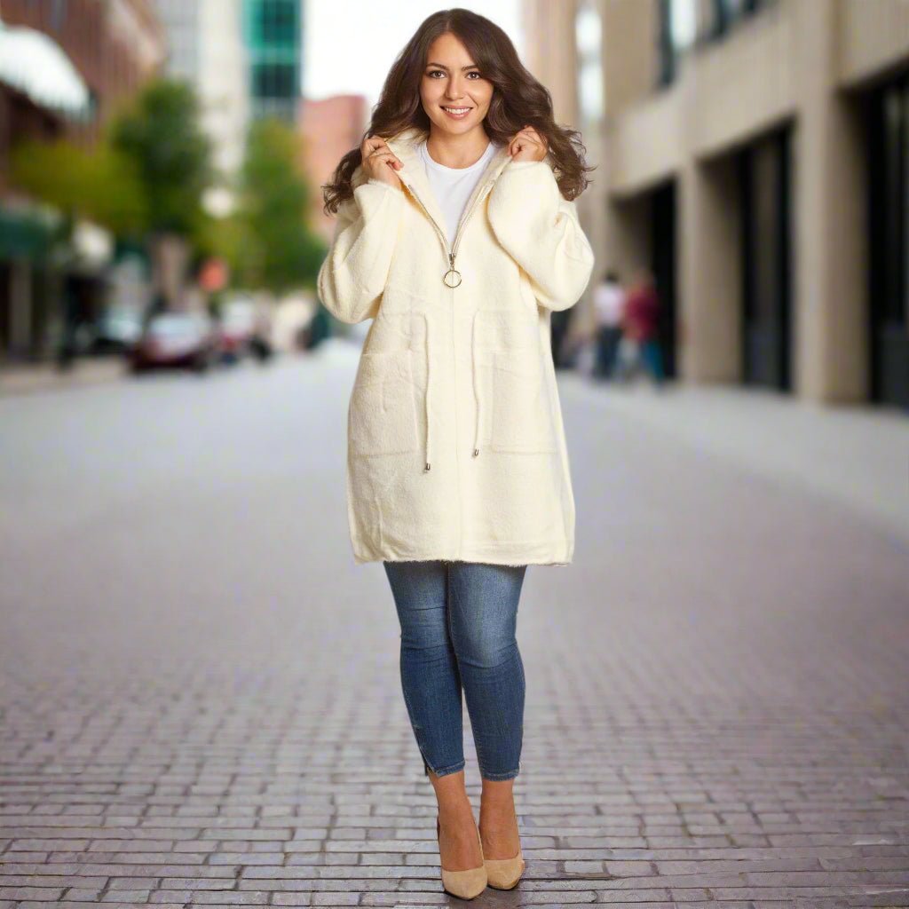Jachetă de damă din burete bouclé, într-o elegantă culoare verde măsliniu, confecționată din 70% poliamidă, 25% poliester și 5% elastan. Modelul are glugă și buzunare, ideală pentru sezonul toamnă-iarnă. O alegere practică și elegantă atât pentru viața de zi cu zi, cât și pentru ocazii formale.