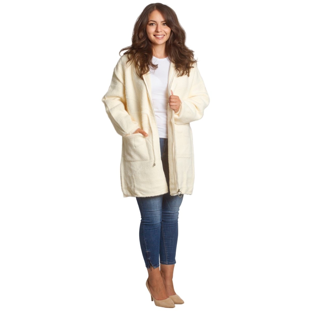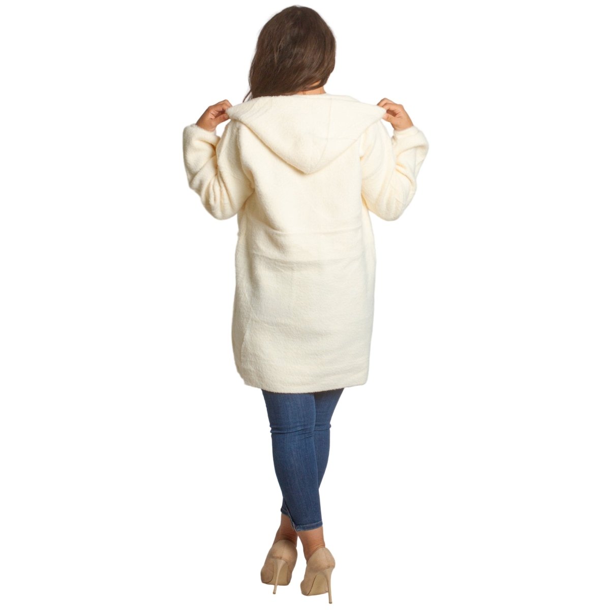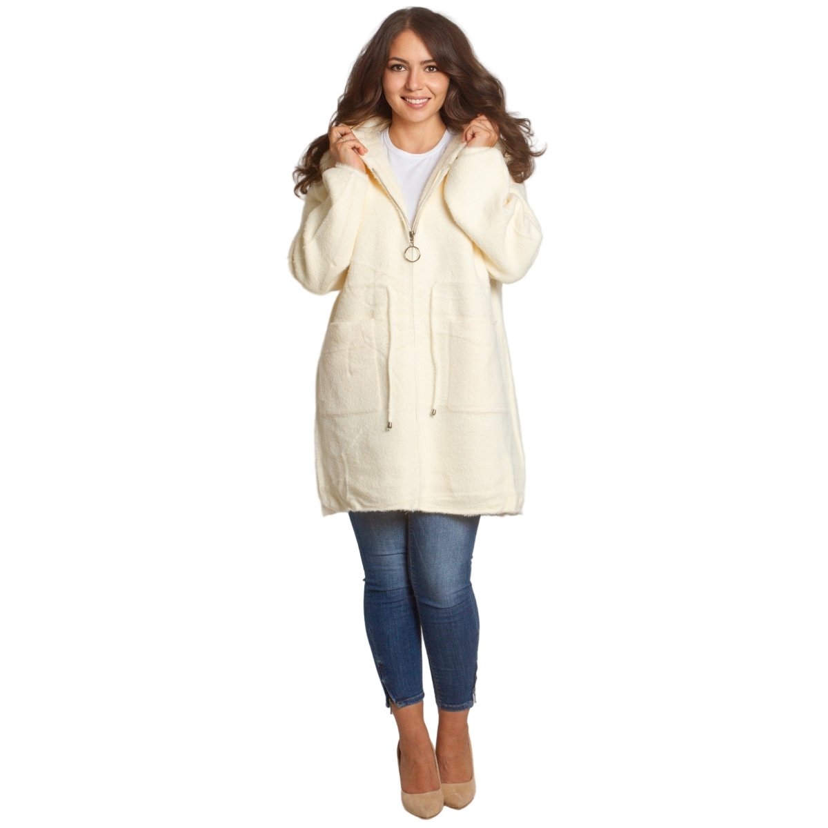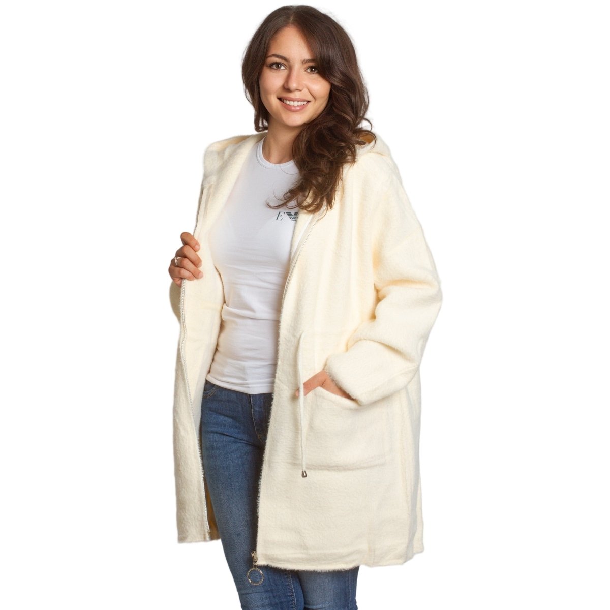 Jachetă de damă din burete bouclé, într-o elegantă culoare verde măsliniu, confecționată din 70% poliamidă, 25% poliester și 5% elastan. Modelul are glugă și buzunare, ideală pentru sezonul toamnă-iarnă. O alegere practică și elegantă atât pentru viața de zi cu zi, cât și pentru ocazii formale.