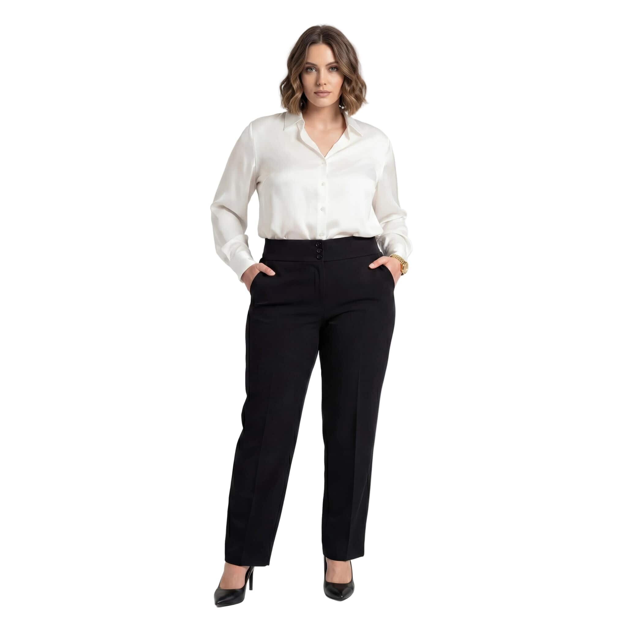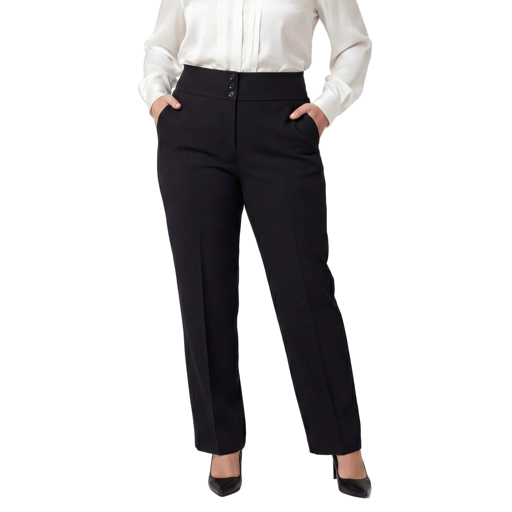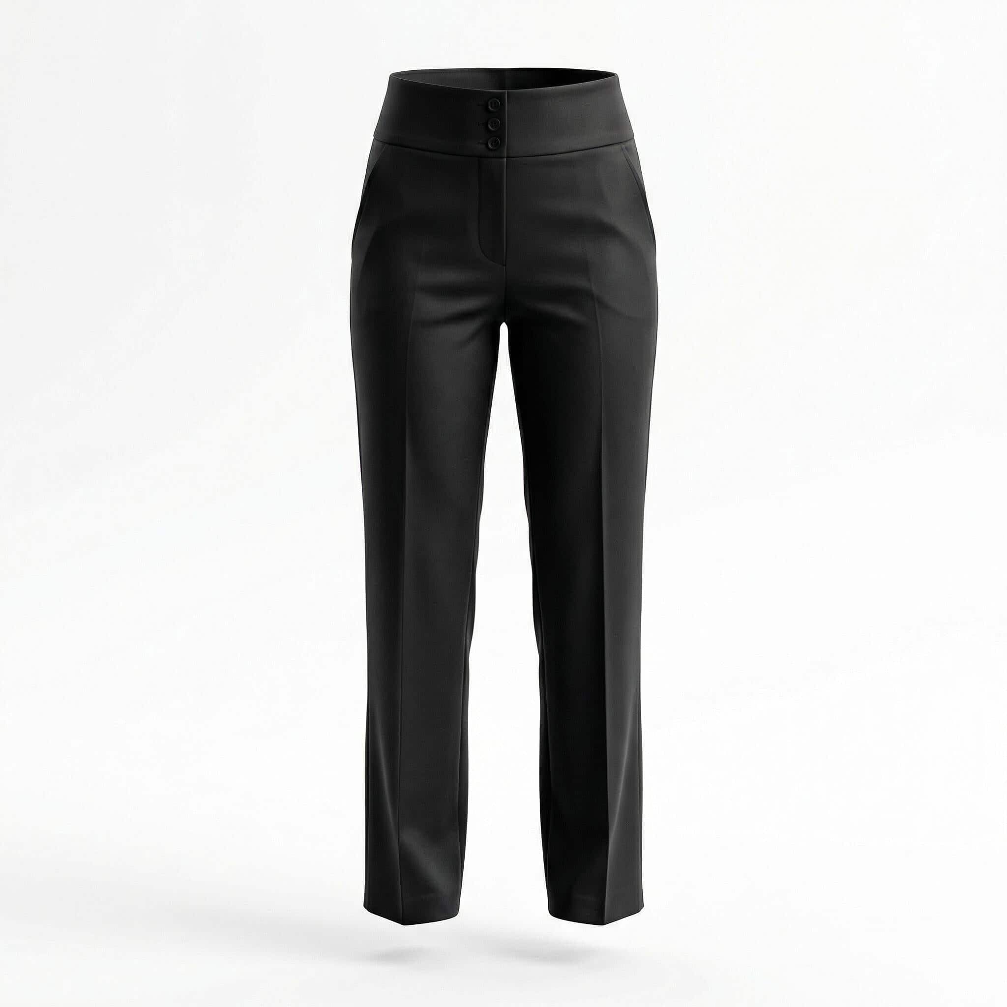 Pantaloni de damă negri, eleganți, cu dungă și nasturi