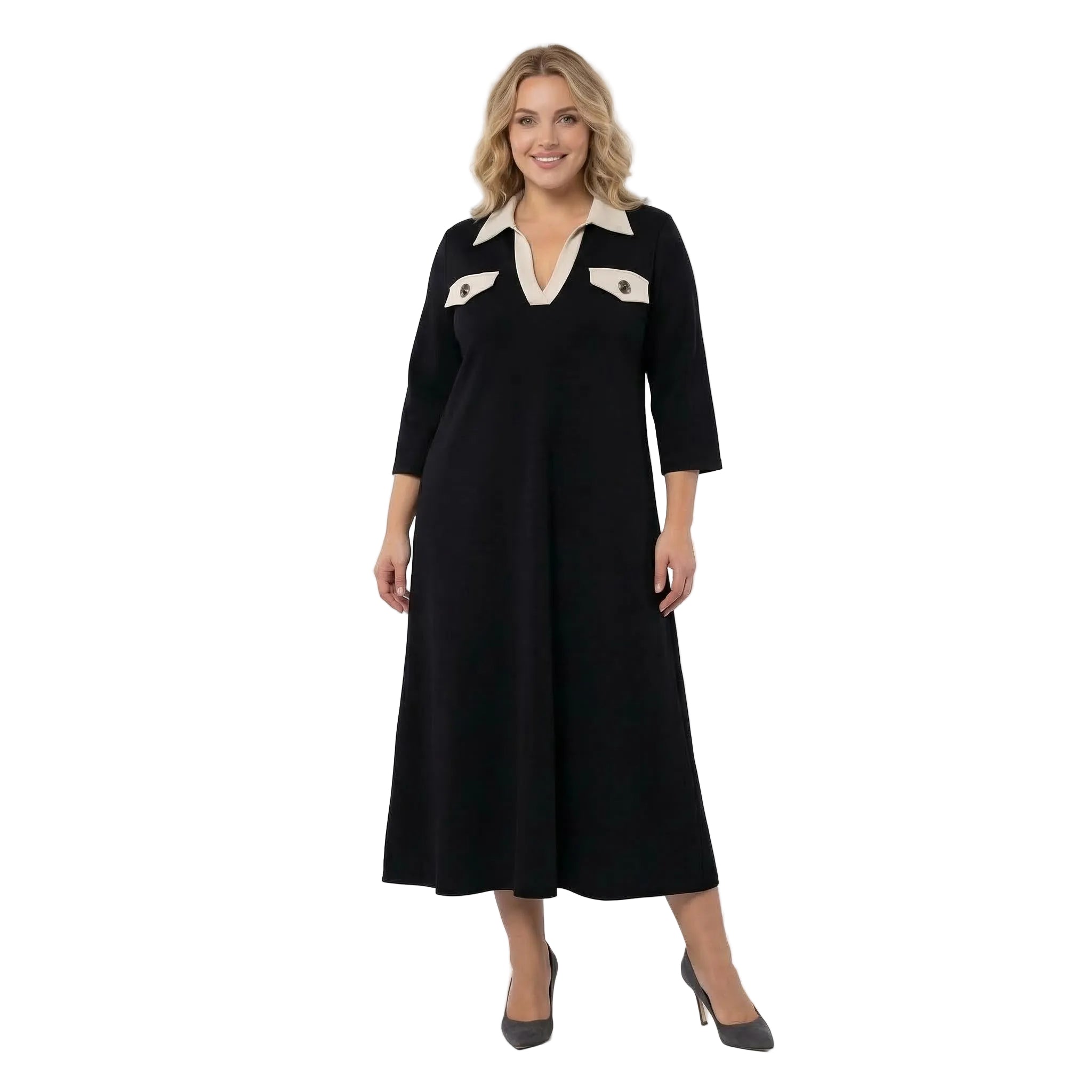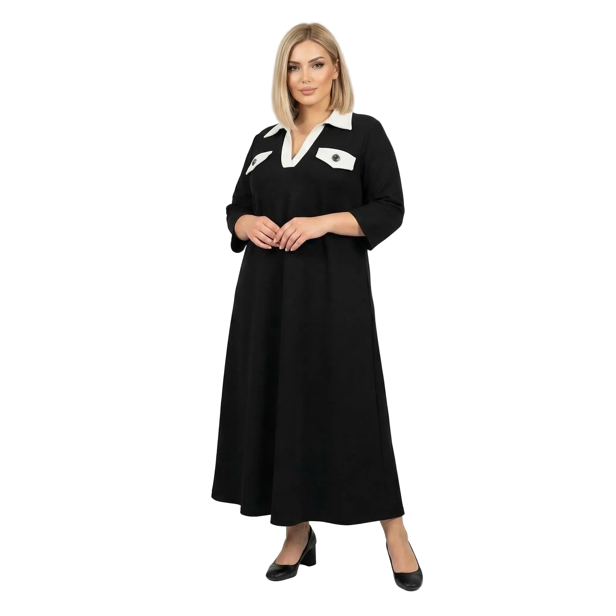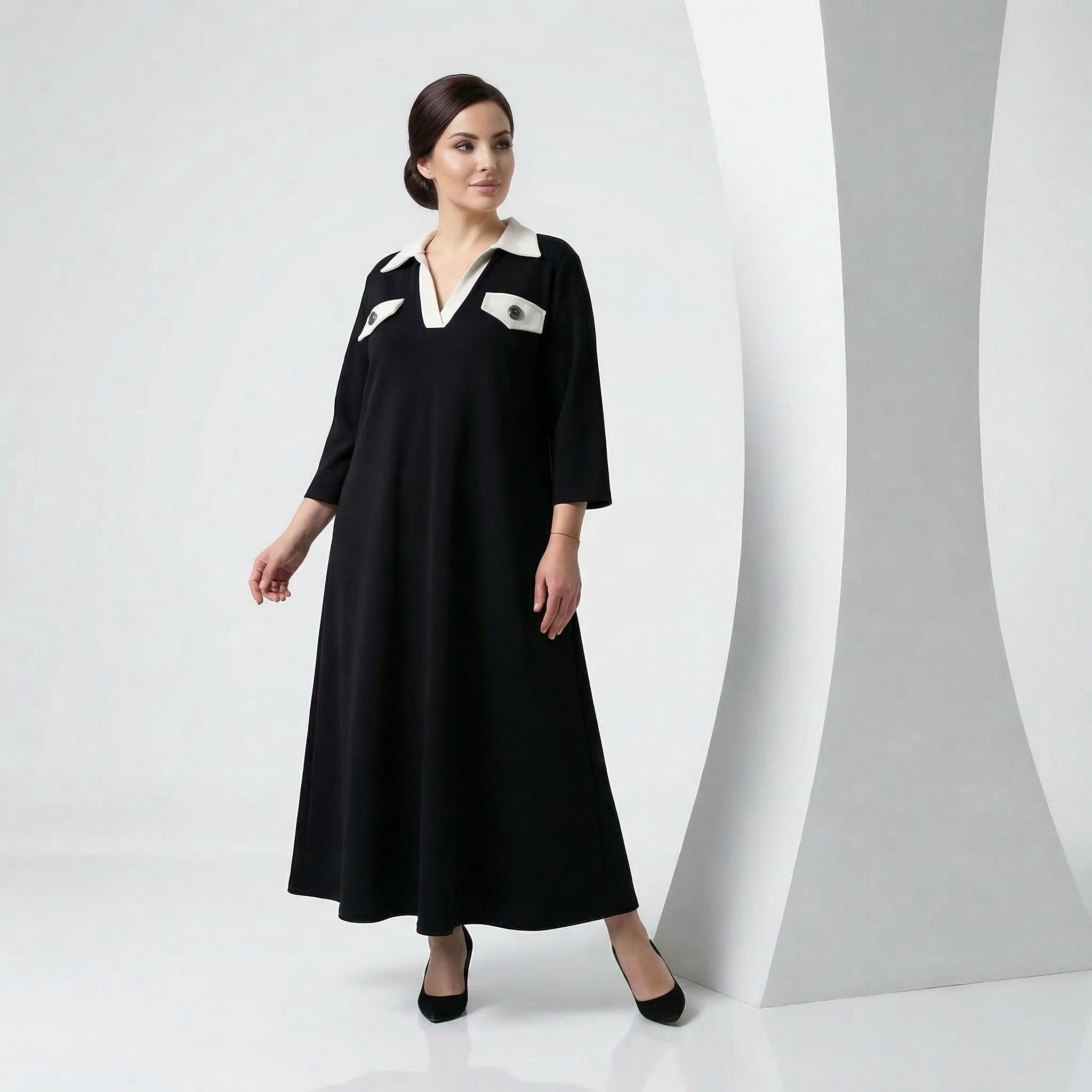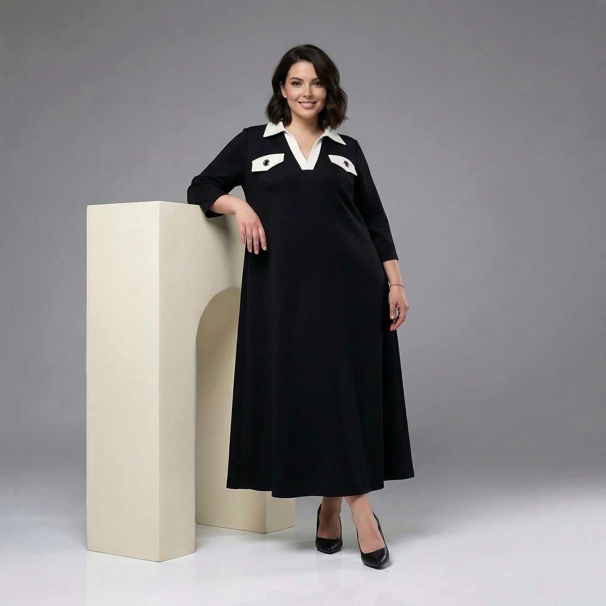 Представяме ви стилна и елегантна официална макси рокля в класически черен цвят, създадена специално за дами с извивки. Този изящен модел съчетава комфорт и изтънченост благодарение на меката, сравнително плътна еластична материя, която пада тежко и създава красиво, гладко драпиране. Кройката е свободна и разкроена в А-силует, осигурявайки пълна свобода на движението и безупречна грация при всяка стъпка. Акцентът пада върху дълбокото V-образно деколте, завършено с ефектна контрастна якичка, и декоративните джобчета на гърдите, украсени с релефни метални копчета. Със своите елегантни 7/8 ръкави, роклята е перфектният избор за преходния сезон и всяко официално събитие, на което искате да излъчвате увереност и стил.