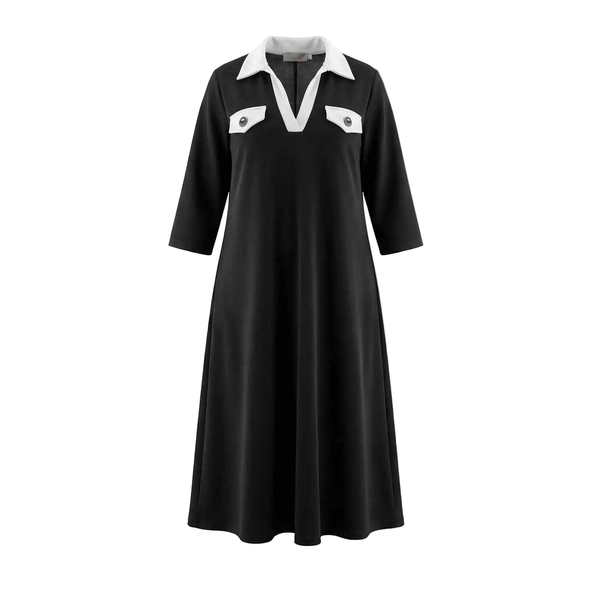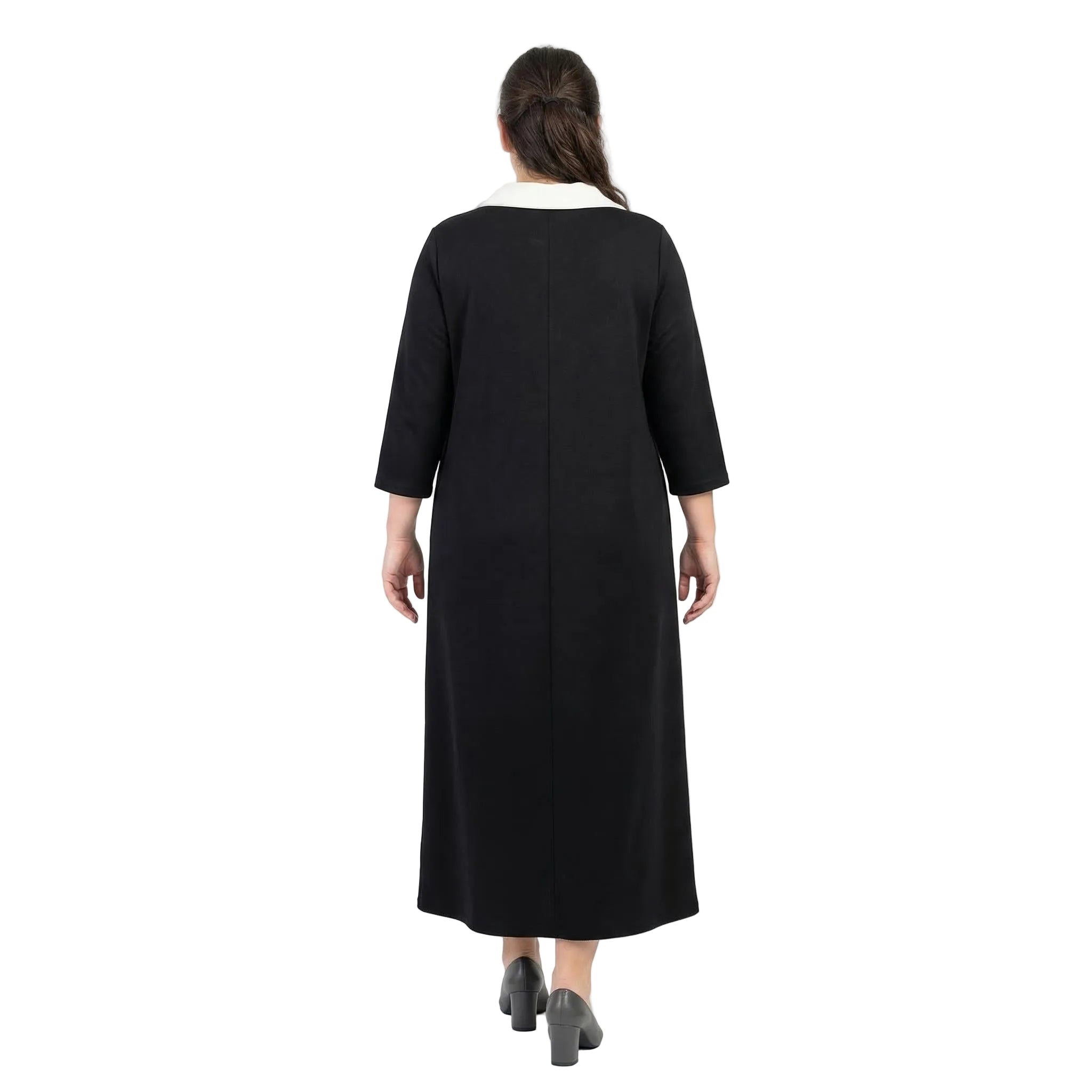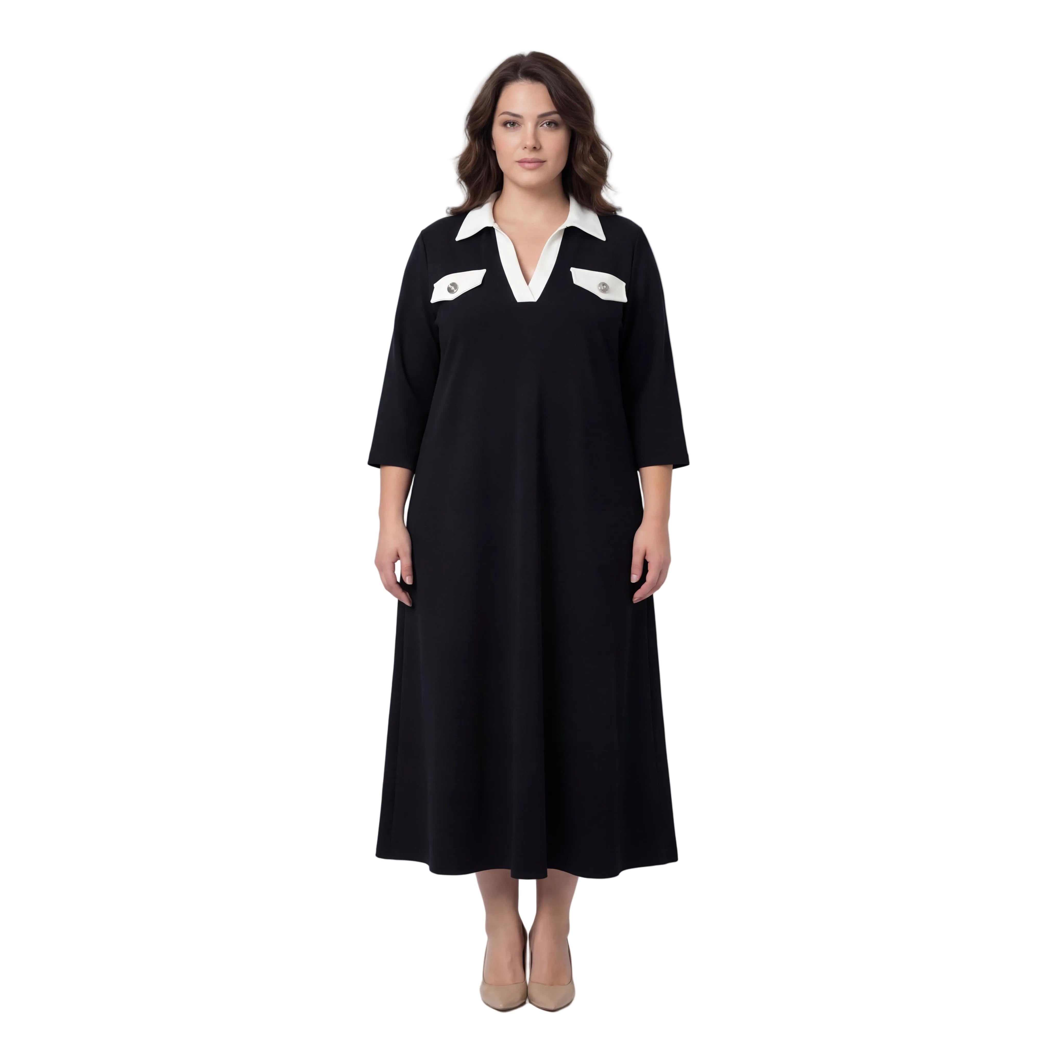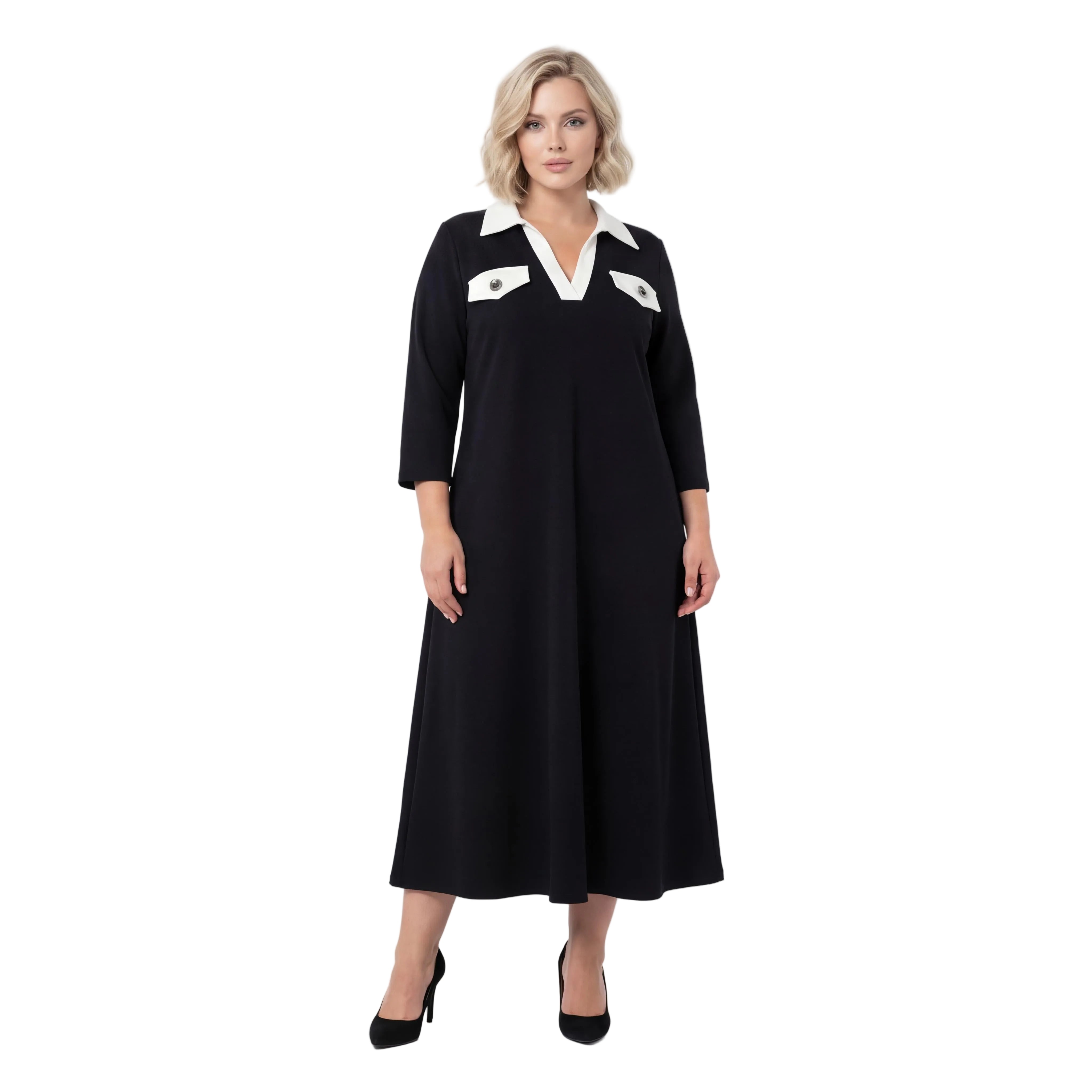 Представяме ви стилна и елегантна официална макси рокля в класически черен цвят, създадена специално за дами с извивки. Този изящен модел съчетава комфорт и изтънченост благодарение на меката, сравнително плътна еластична материя, която пада тежко и създава красиво, гладко драпиране. Кройката е свободна и разкроена в А-силует, осигурявайки пълна свобода на движението и безупречна грация при всяка стъпка. Акцентът пада върху дълбокото V-образно деколте, завършено с ефектна контрастна якичка, и декоративните джобчета на гърдите, украсени с релефни метални копчета. Със своите елегантни 7/8 ръкави, роклята е перфектният избор за преходния сезон и всяко официално събитие, на което искате да излъчвате увереност и стил.