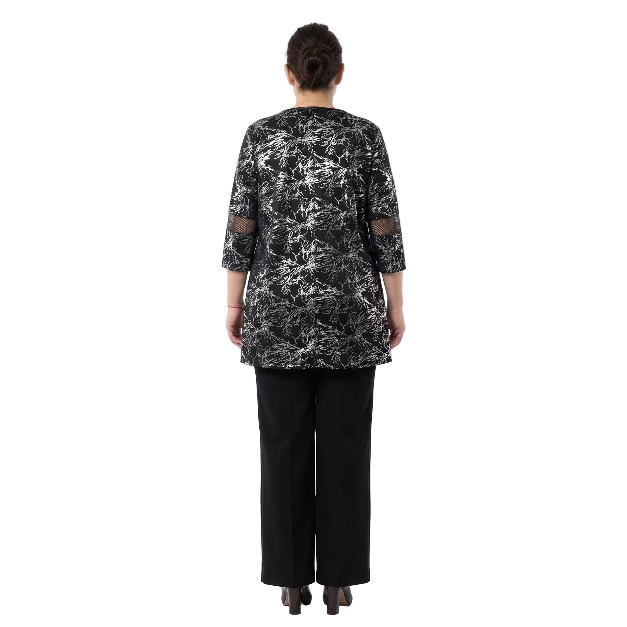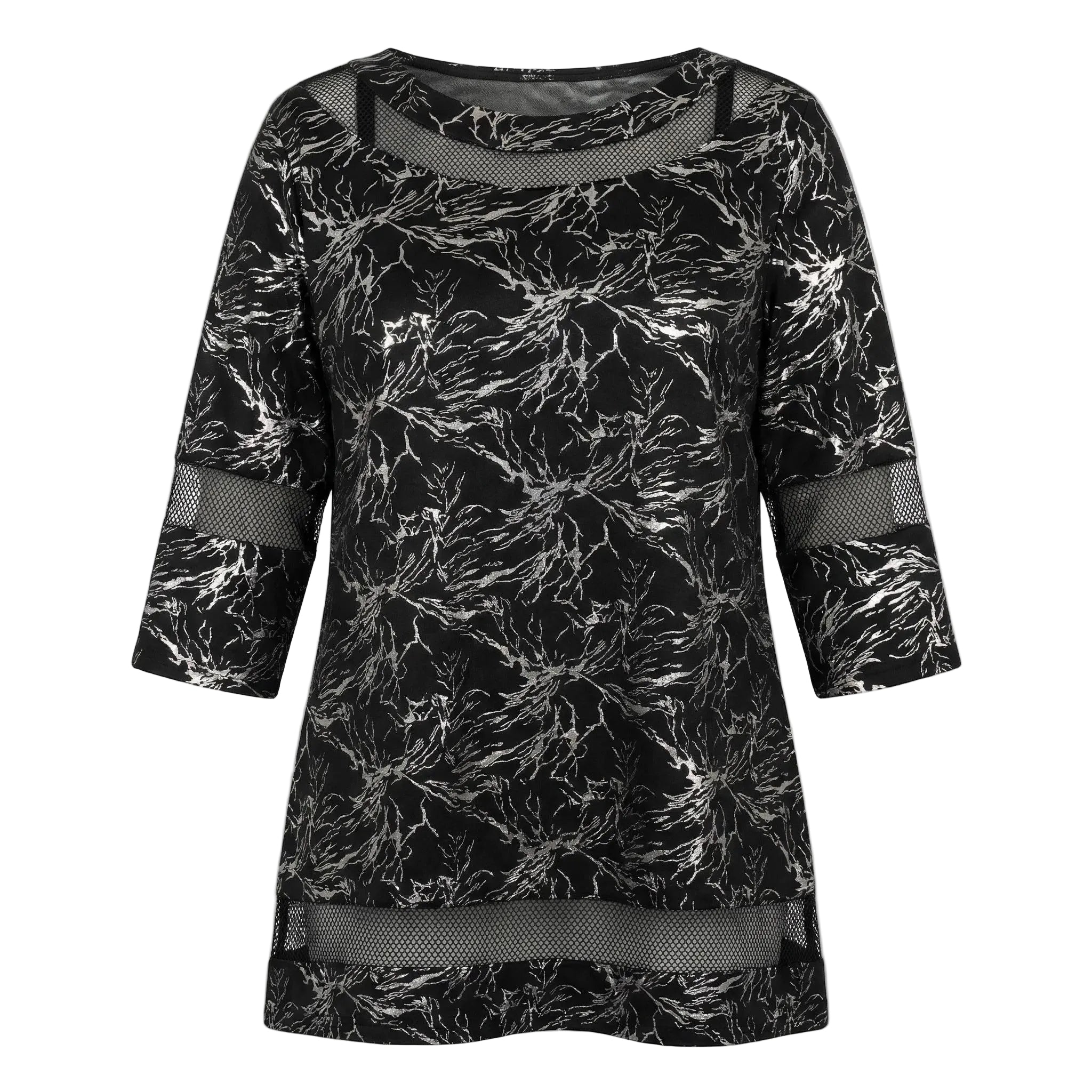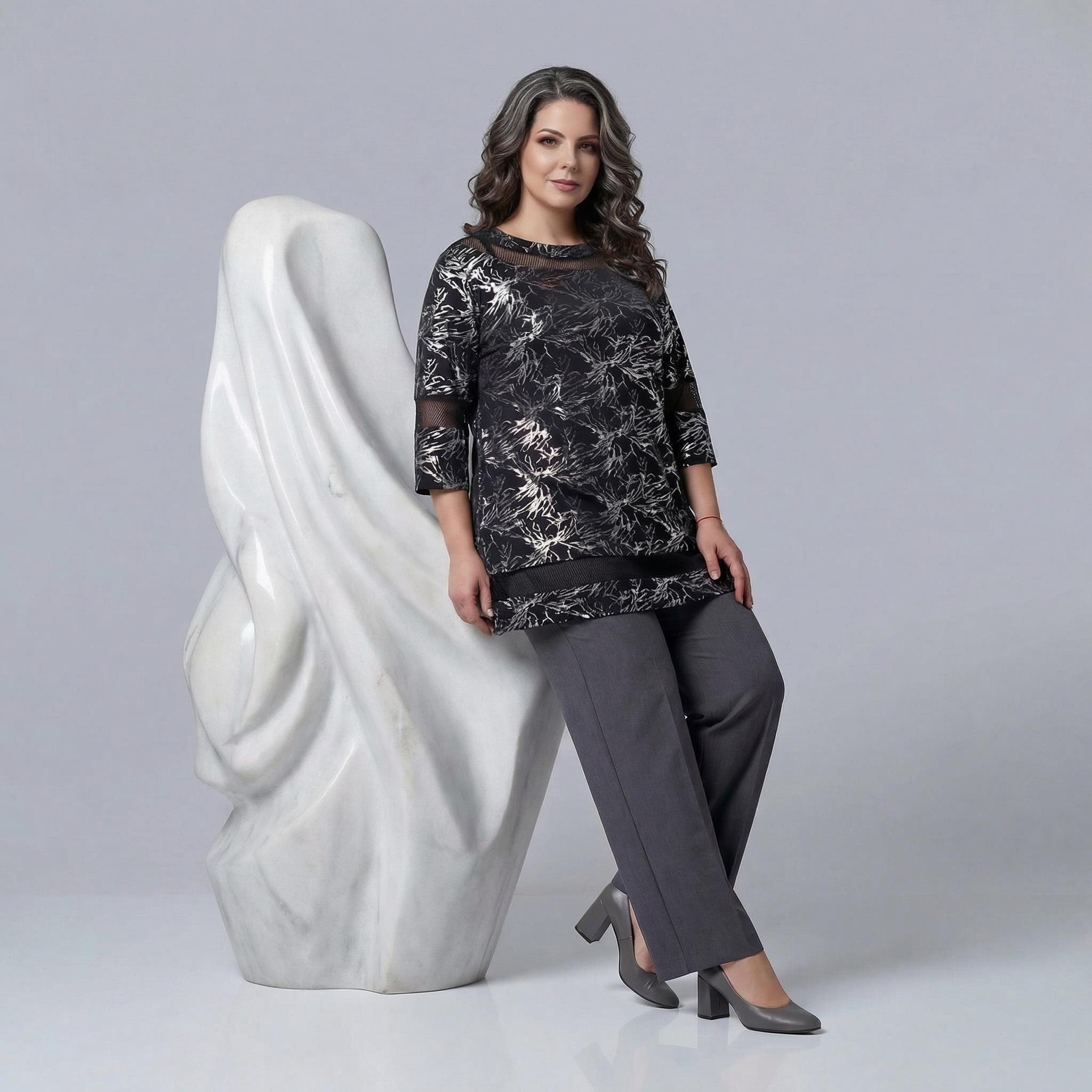 Открийте съвършения баланс между стил и комфорт с тази елегантна черна официална макси туника. Изработена от меко падаща, еластична материя, тя се отличава с красив абстрактен сребрист фолиев принт, който придава изискан метален блясък на визията. Моделът е със свободна, разкроена кройка тип А-силует, която осигурява максимална свобода на движението и стои безупречно на дами с пищни форми. Деликатните мрежести платки на деколтето тип лодка, 3/4 ръкавите и долната част добавят нотка женственост и изтънченост, правейки туниката идеалния избор за вашите специални официални събития през пролетно-летния сезон.
