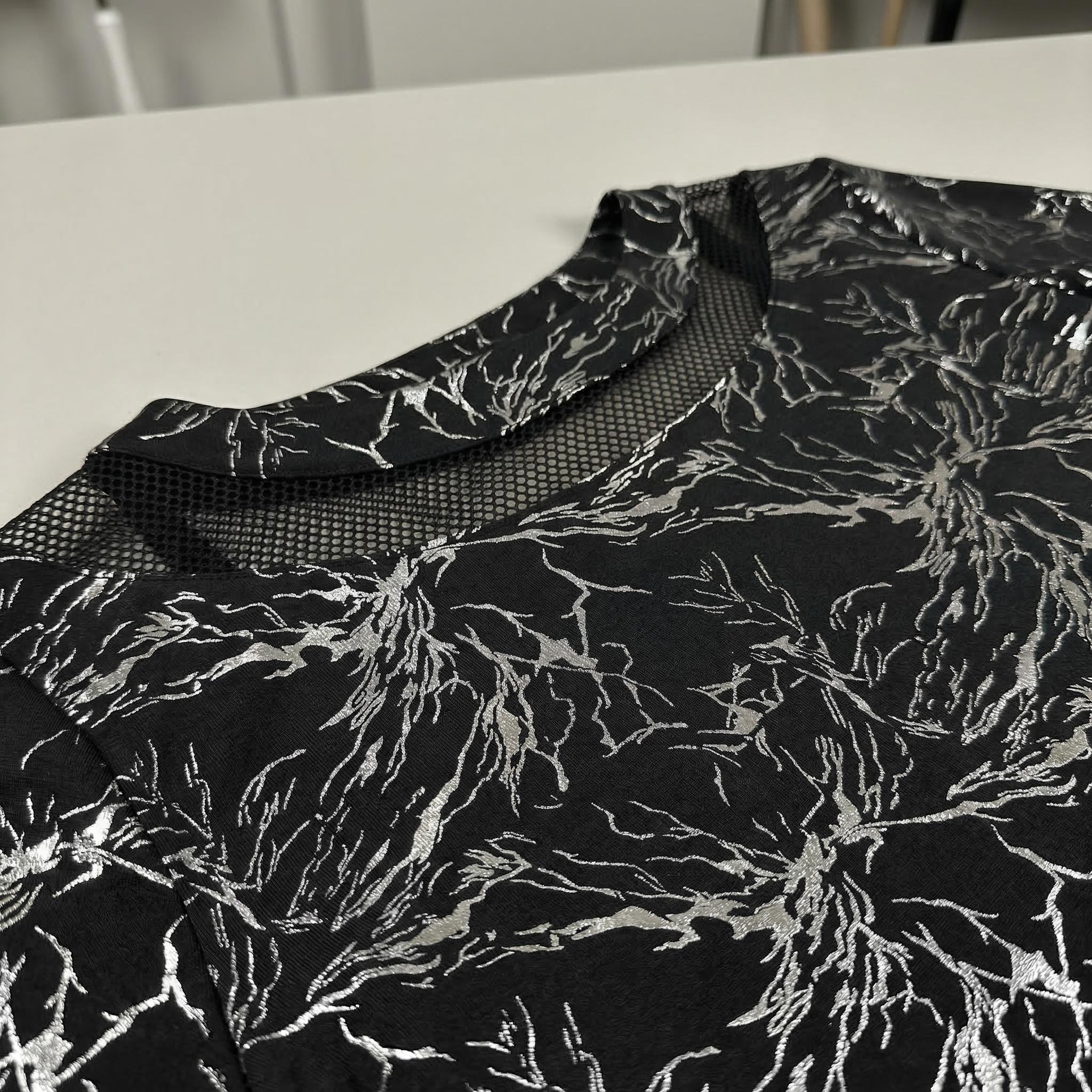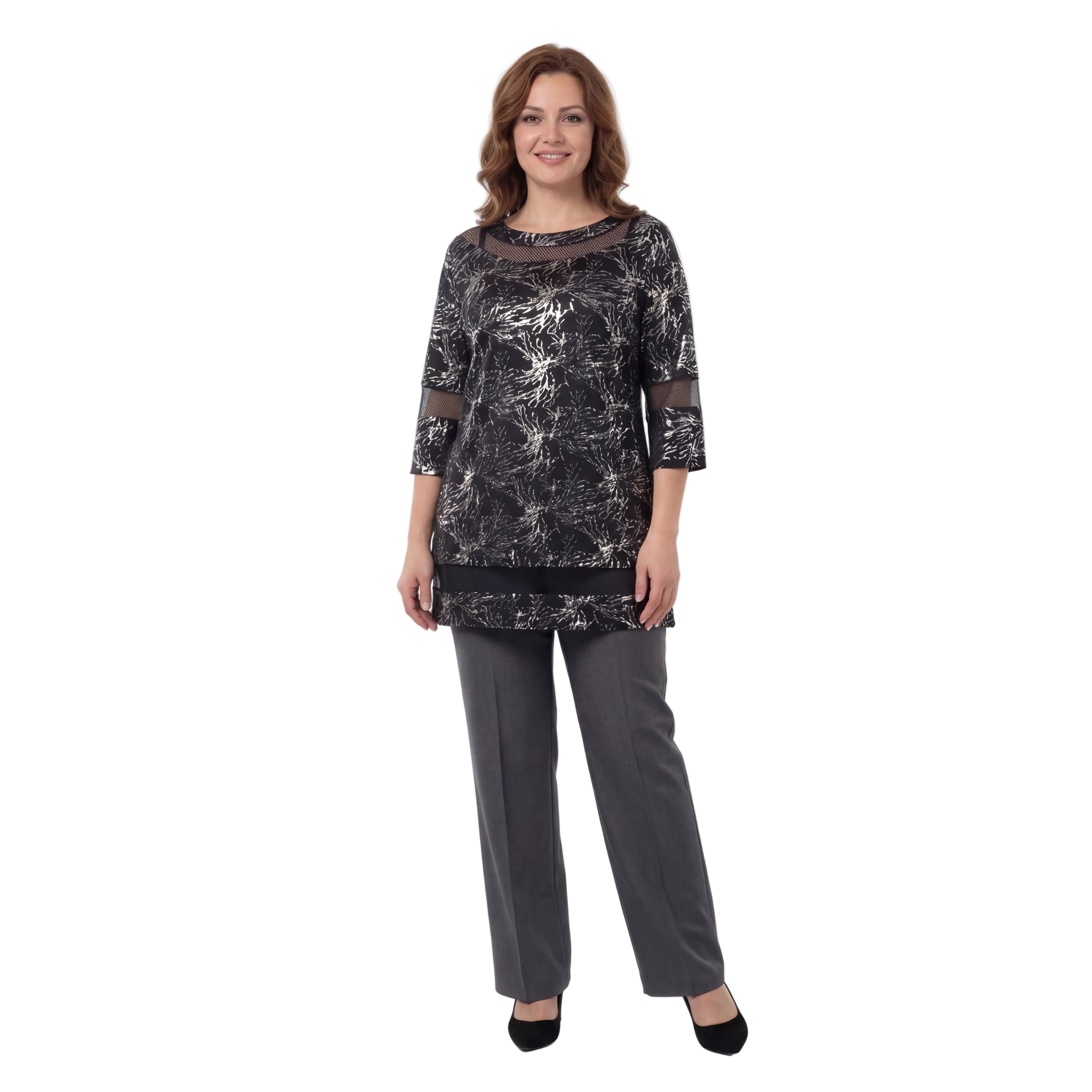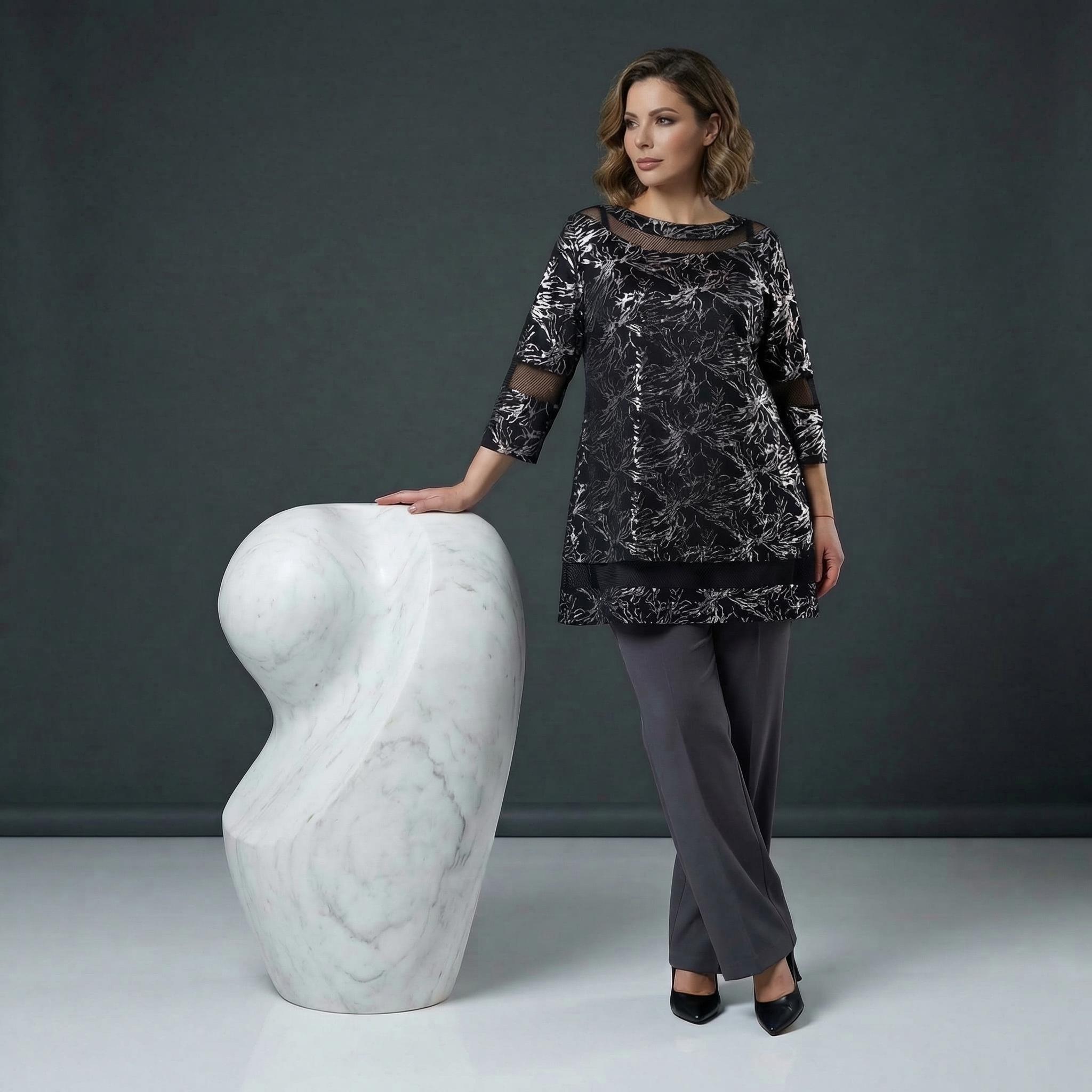 Открийте съвършения баланс между стил и комфорт с тази елегантна черна официална макси туника. Изработена от меко падаща, еластична материя, тя се отличава с красив абстрактен сребрист фолиев принт, който придава изискан метален блясък на визията. Моделът е със свободна, разкроена кройка тип А-силует, която осигурява максимална свобода на движението и стои безупречно на дами с пищни форми. Деликатните мрежести платки на деколтето тип лодка, 3/4 ръкавите и долната част добавят нотка женственост и изтънченост, правейки туниката идеалния избор за вашите специални официални събития през пролетно-летния сезон.