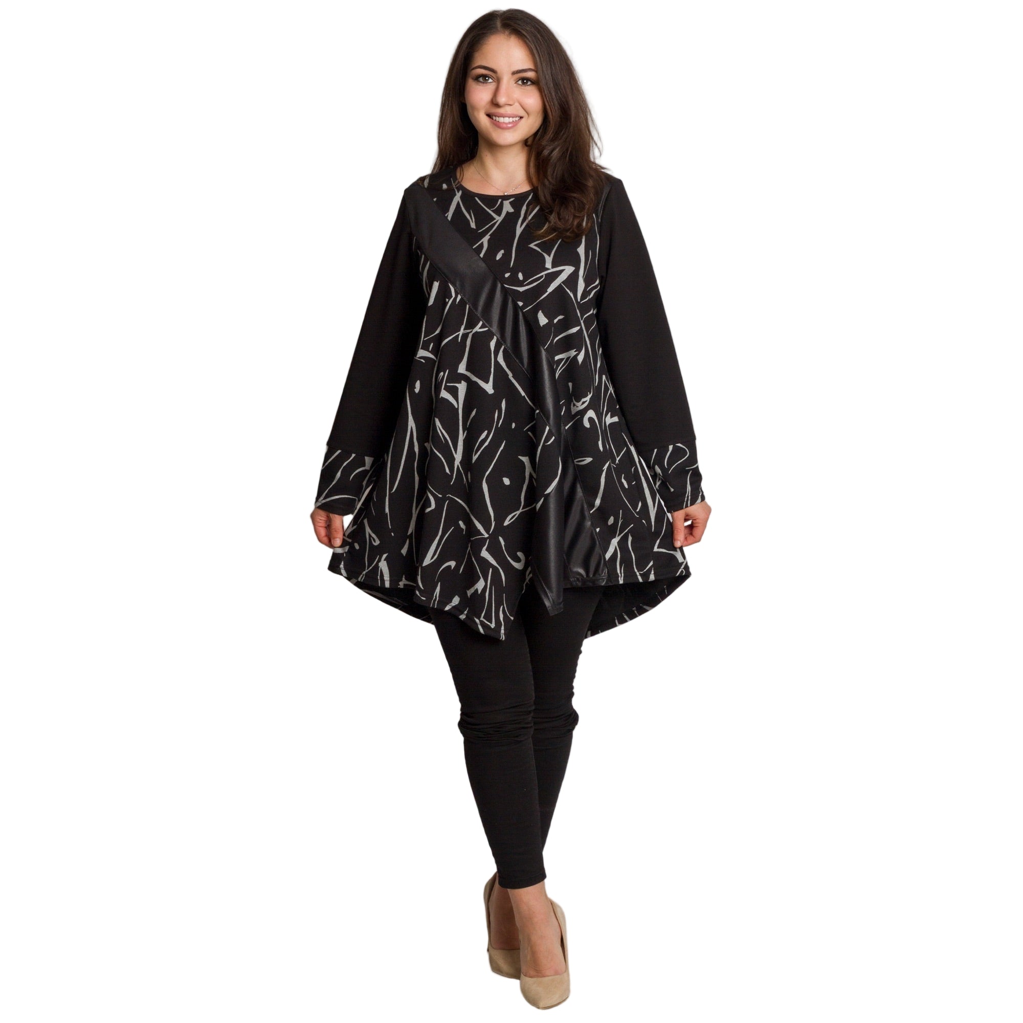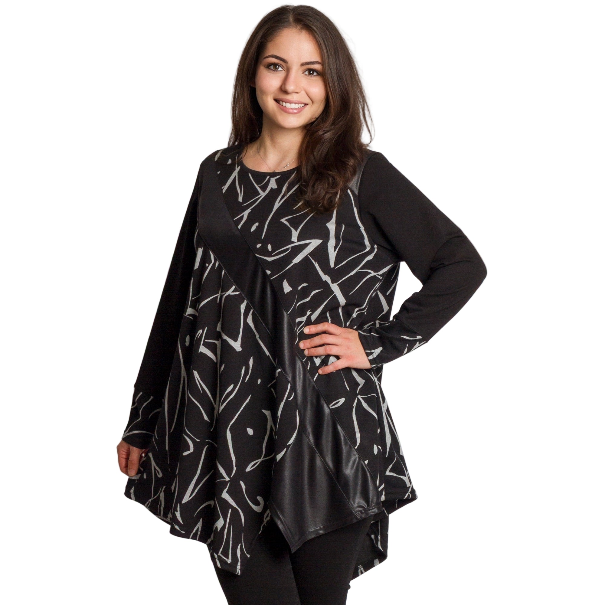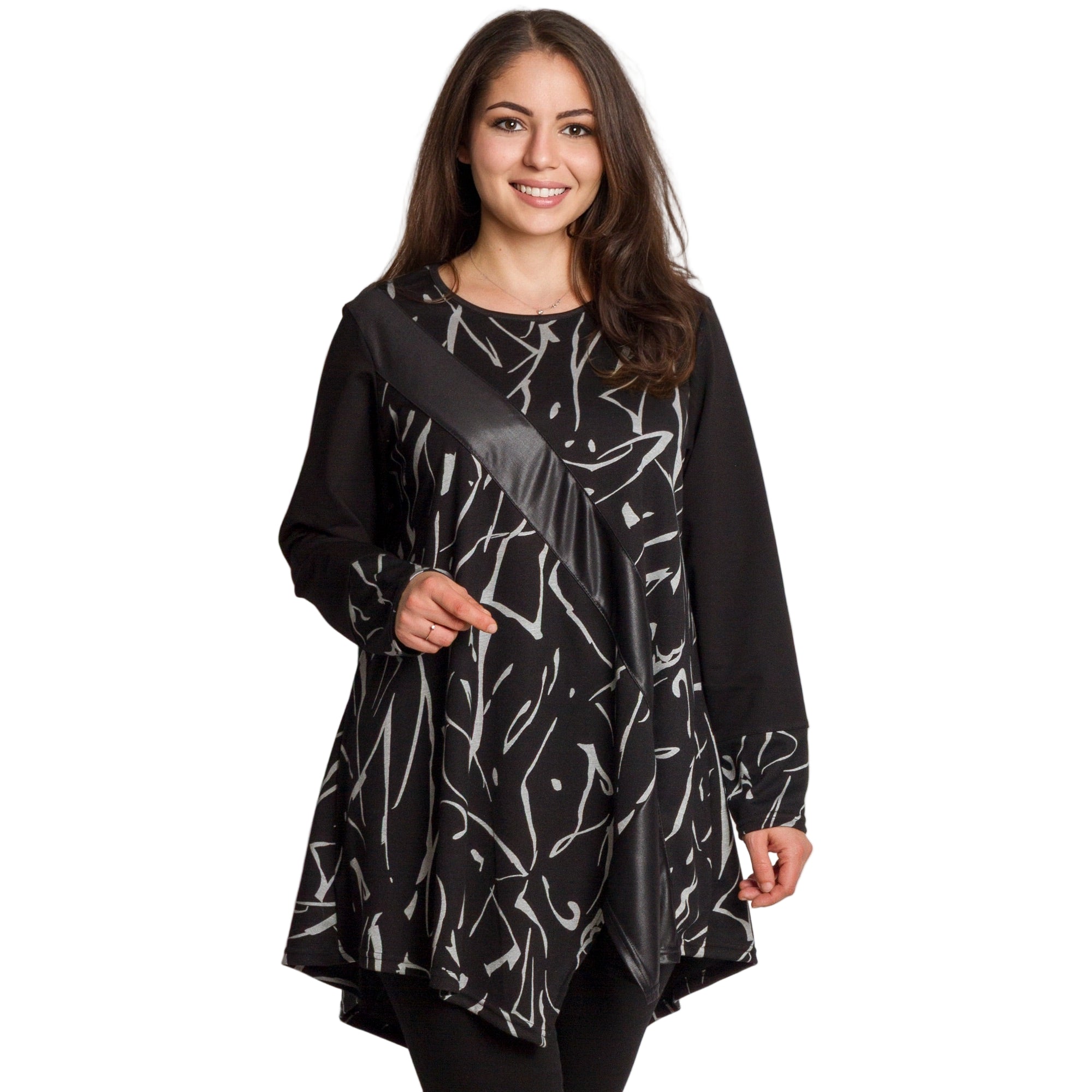 Adaugă culoare și eleganță ținutei tale cu această tunică lejeră în mărimi maxi. Modelul prezintă un imprimeu superb în tonuri bogate de verde și albastru, completat de un accent diagonal albastru închis din țesătură satinată, care adaugă rafinament și alungește vizual silueta. Croiul este lejer și confortabil, cu decolteu rotund și mâneci scurte - o alegere ideală atât pentru ocazii de zi cu zi, cât și pentru ocazii mai formale.