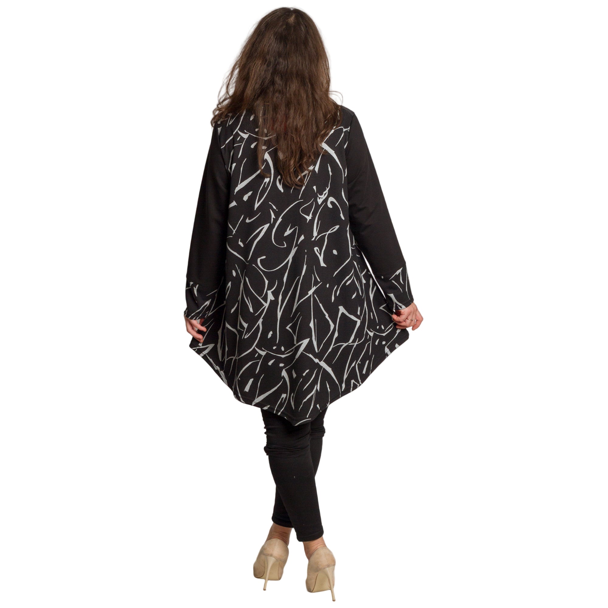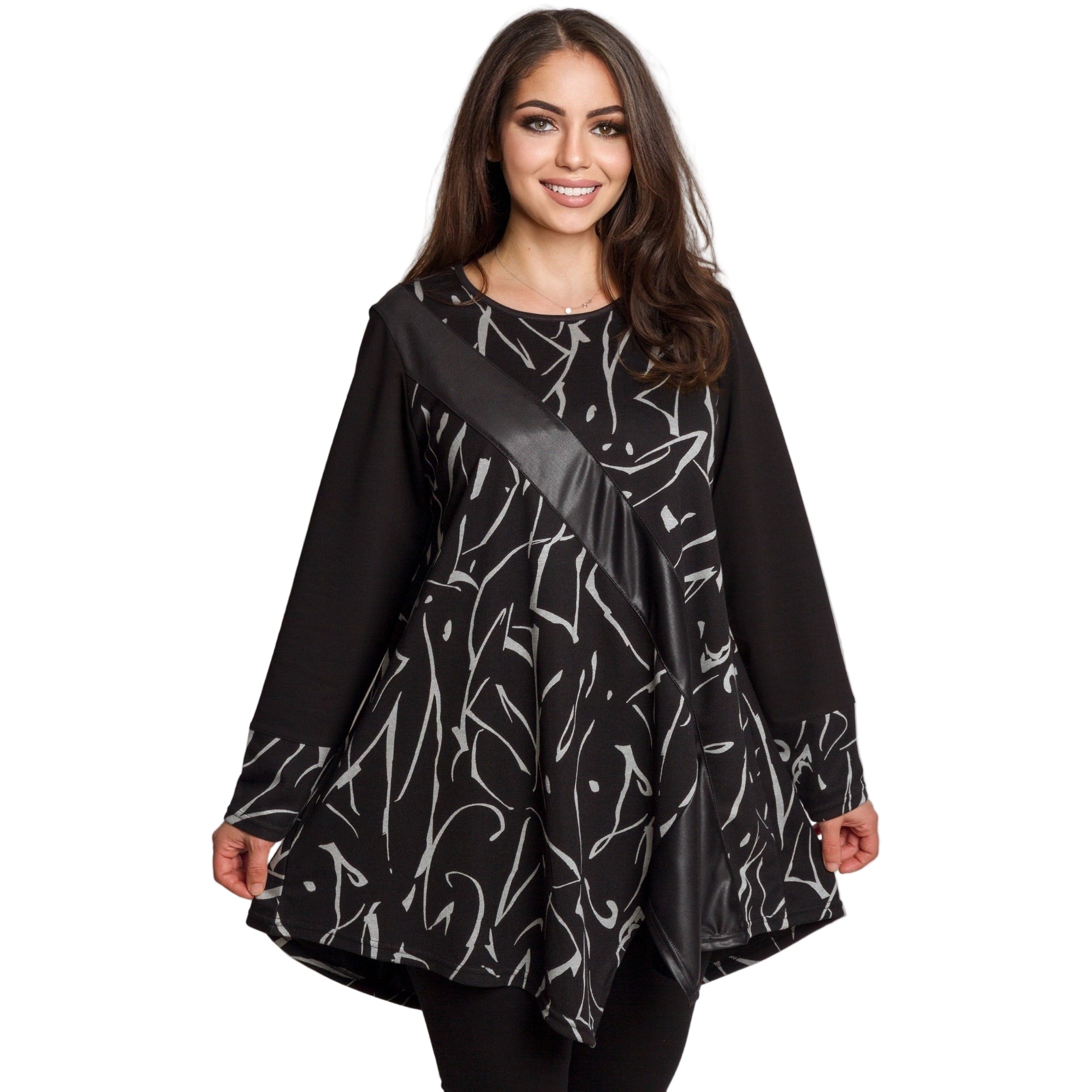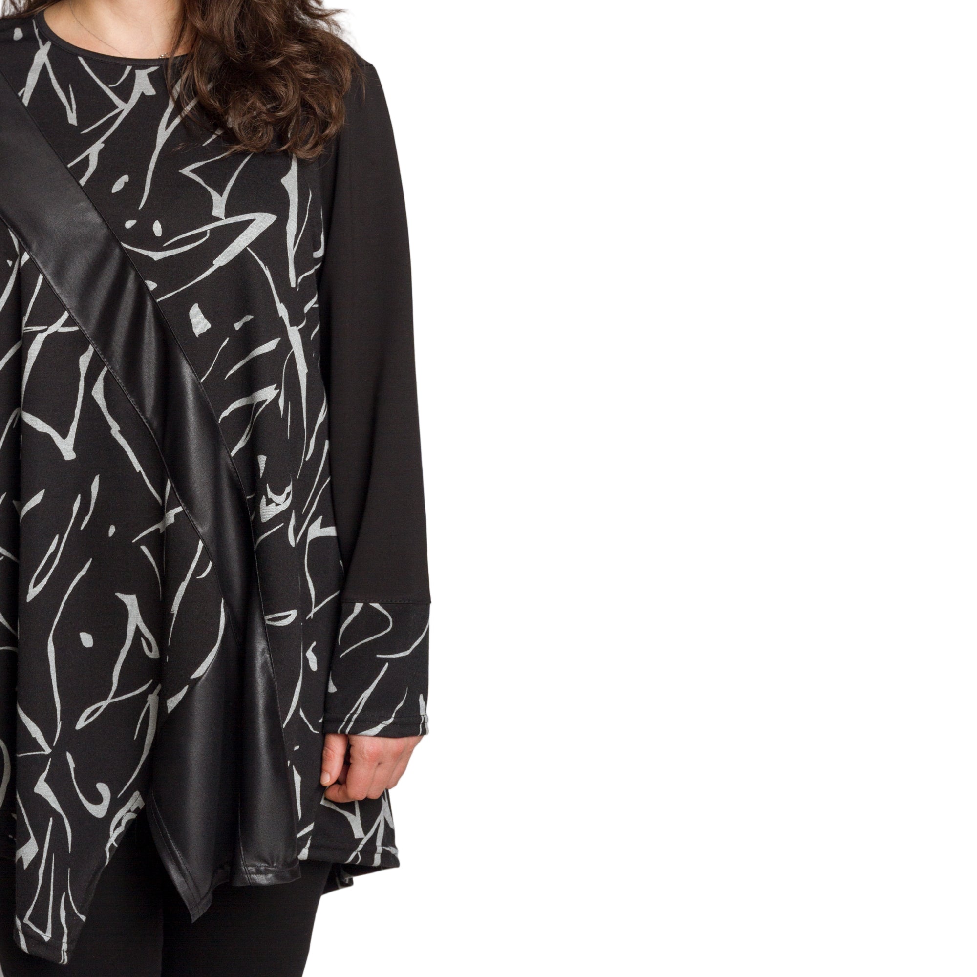 Adaugă culoare și eleganță ținutei tale cu această tunică lejeră în mărimi maxi. Modelul prezintă un imprimeu superb în tonuri bogate de verde și albastru, completat de un accent diagonal albastru închis din țesătură satinată, care adaugă rafinament și alungește vizual silueta. Croiul este lejer și confortabil, cu decolteu rotund și mâneci scurte - o alegere ideală atât pentru ocazii de zi cu zi, cât și pentru ocazii mai formale.