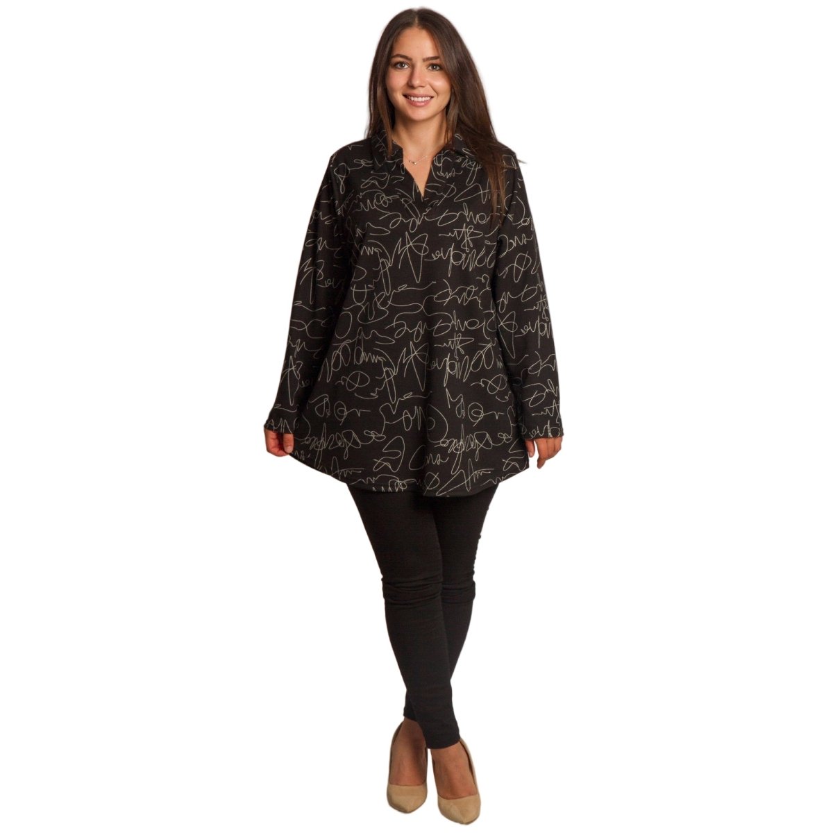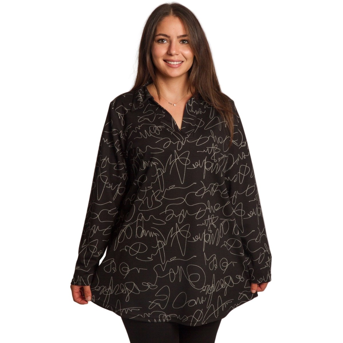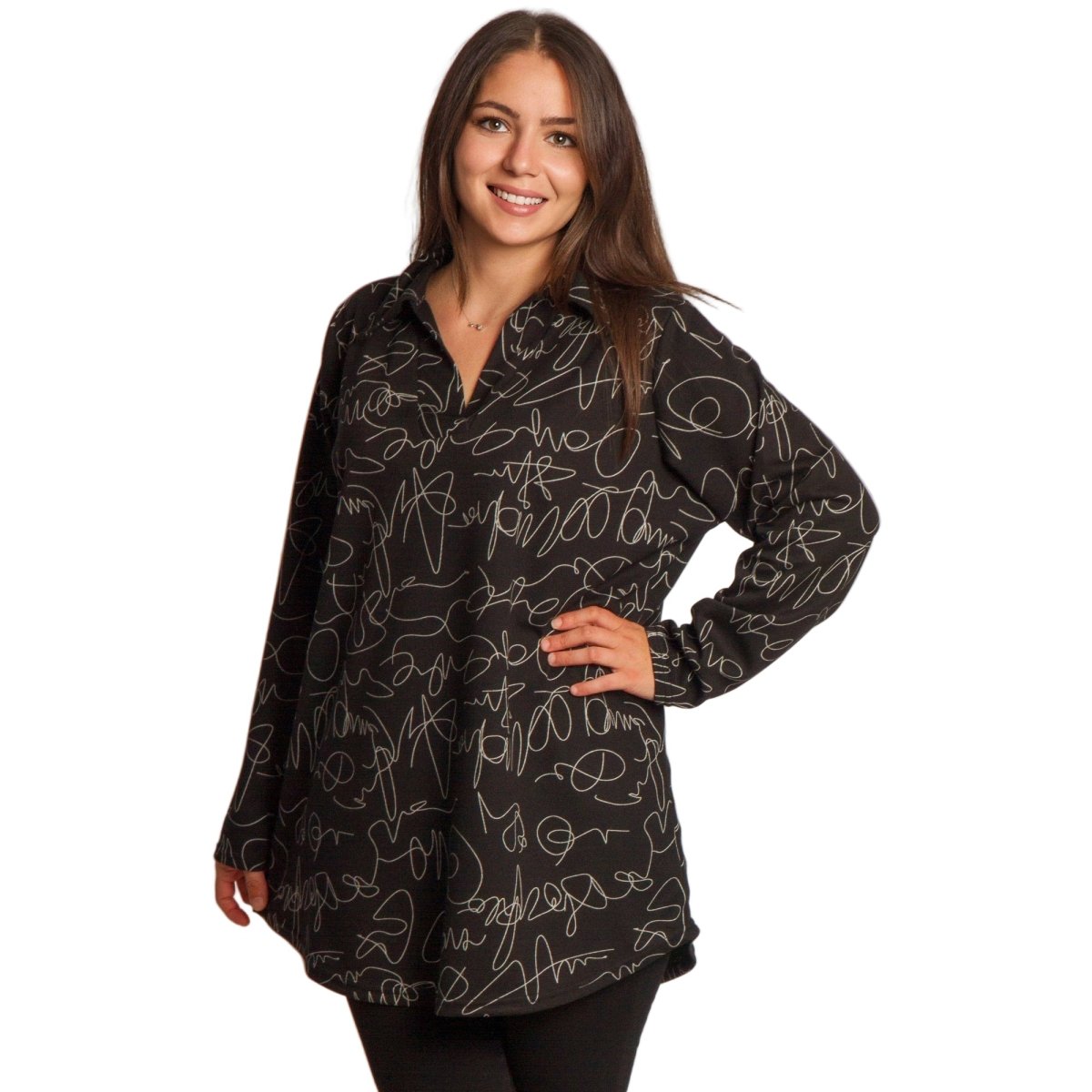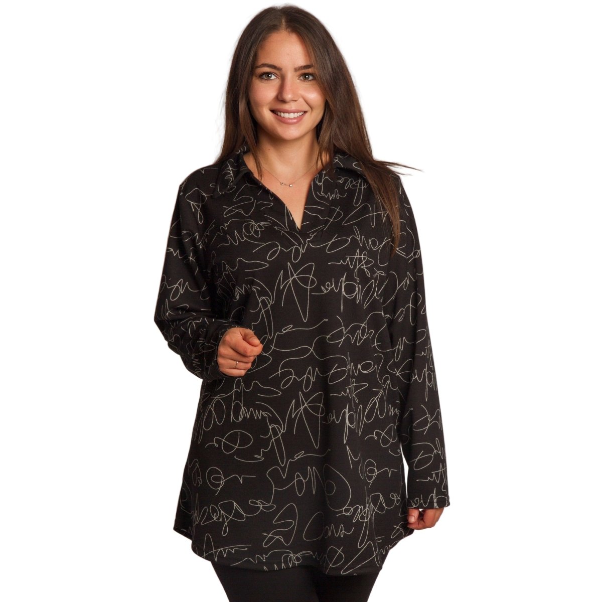 Radiază încredere și stil cu această tunică elegantă, special concepută pentru doamnele cu forme voluptuoase. Modelul combină șifonul vaporos cu un maiou cusut, care oferă confort și opacitate maxime. Croiul lejer și mânecile 3/4 adaugă feminitate și lejeritate, în timp ce imprimeul floral izbitor în roșu intens pe o bază neagră creează un aspect superb, potrivit pentru ocazii formale, sărbători și momente speciale.