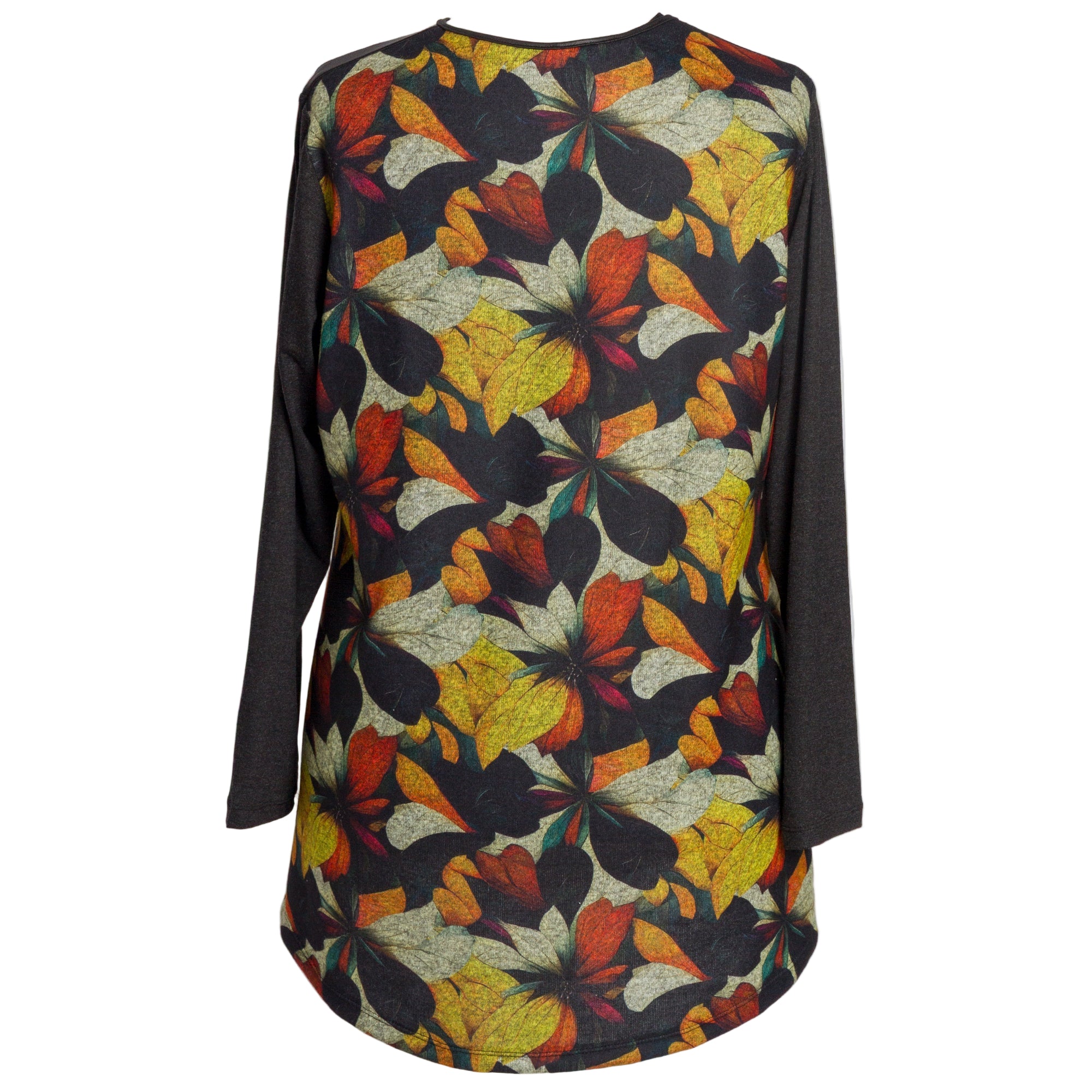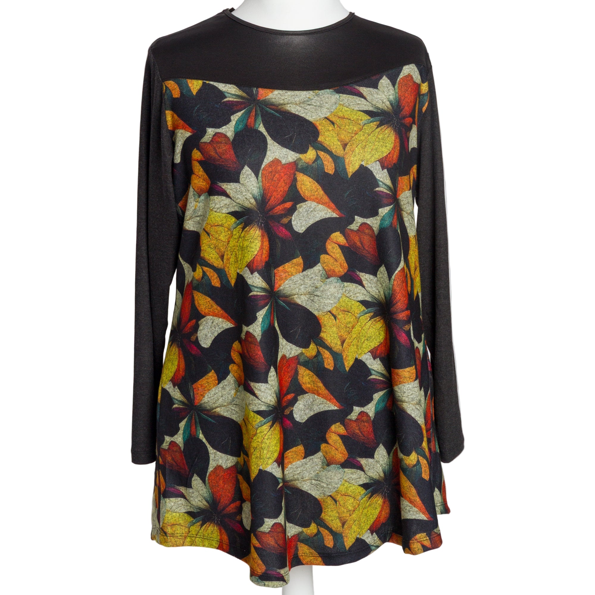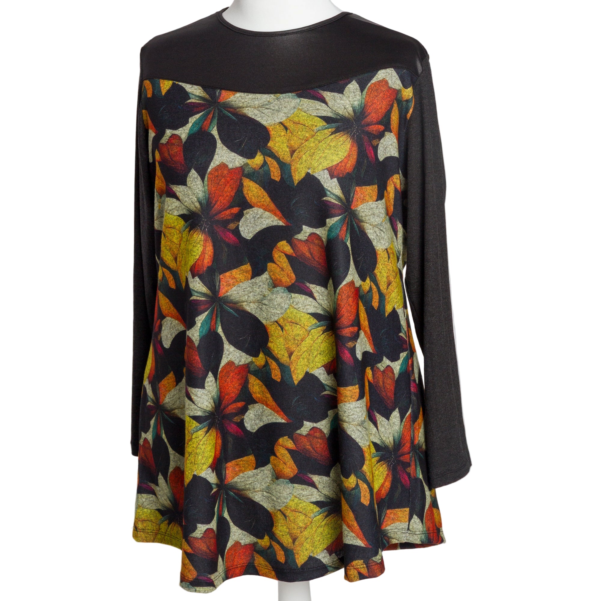 Adaugă culoare și eleganță ținutei tale cu această tunică lejeră în mărimi maxi. Modelul prezintă un imprimeu superb în tonuri bogate de verde și albastru, completat de un accent diagonal albastru închis din țesătură satinată, care adaugă rafinament și alungește vizual silueta. Croiul este lejer și confortabil, cu decolteu rotund și mâneci scurte - o alegere ideală atât pentru ocazii de zi cu zi, cât și pentru ocazii mai formale.