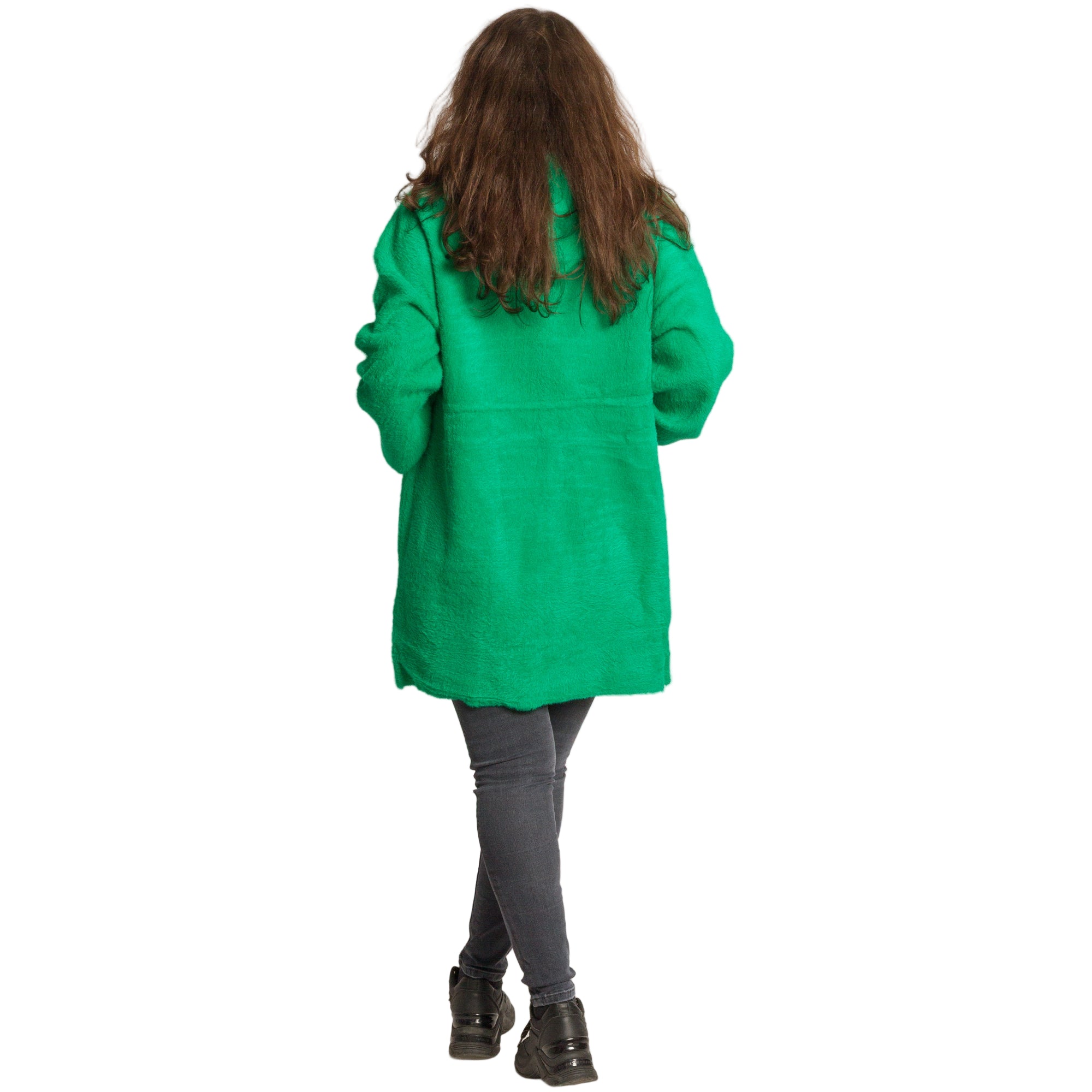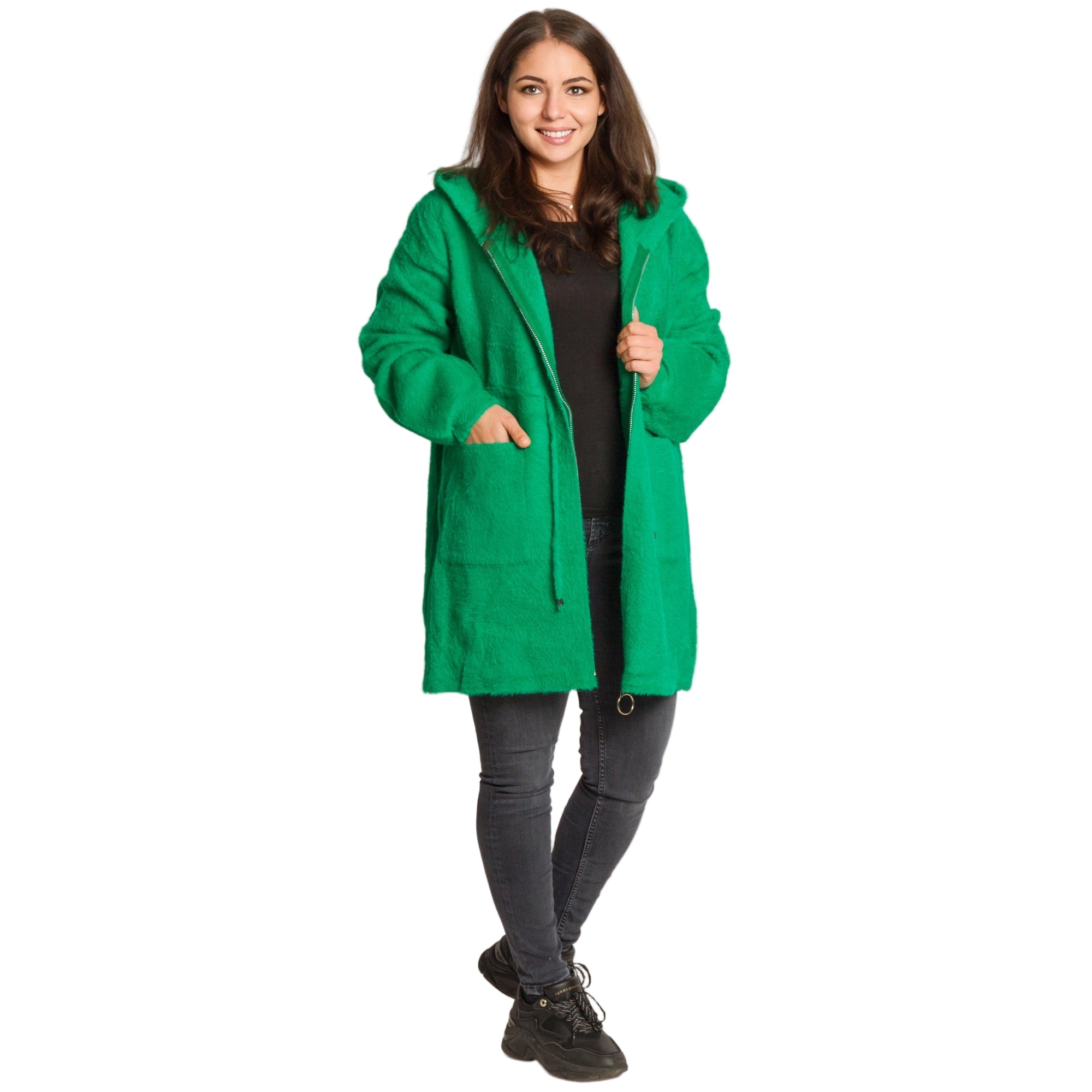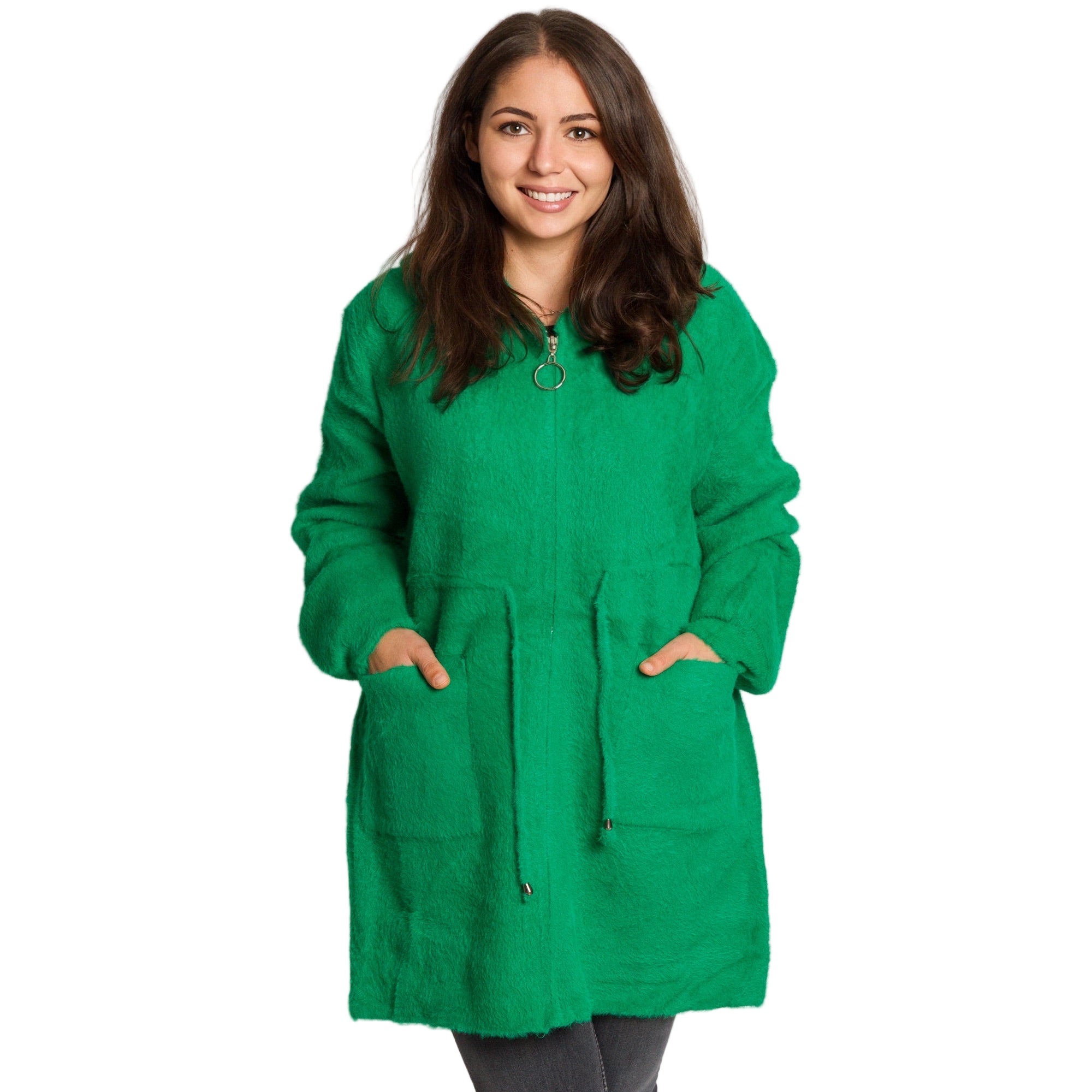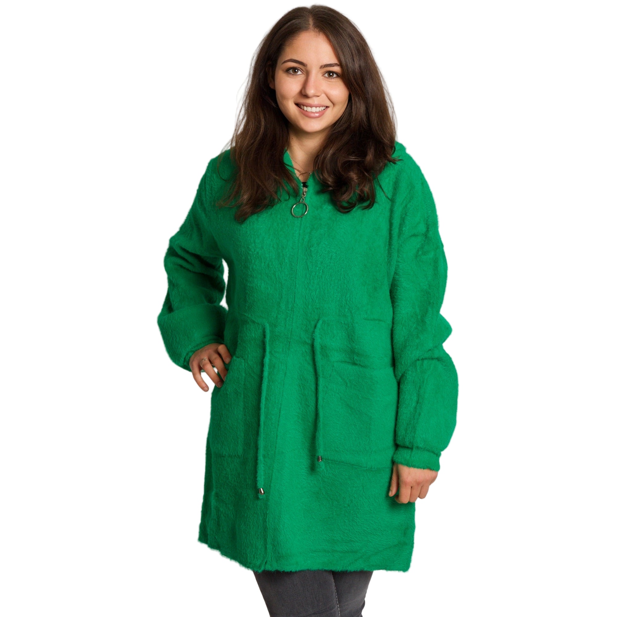 Jachetă de damă din burete bouclé, într-o elegantă culoare verde măsliniu, confecționată din 70% poliamidă, 25% poliester și 5% elastan. Modelul are glugă și buzunare, ideală pentru sezonul toamnă-iarnă. O alegere practică și elegantă atât pentru viața de zi cu zi, cât și pentru ocazii formale.