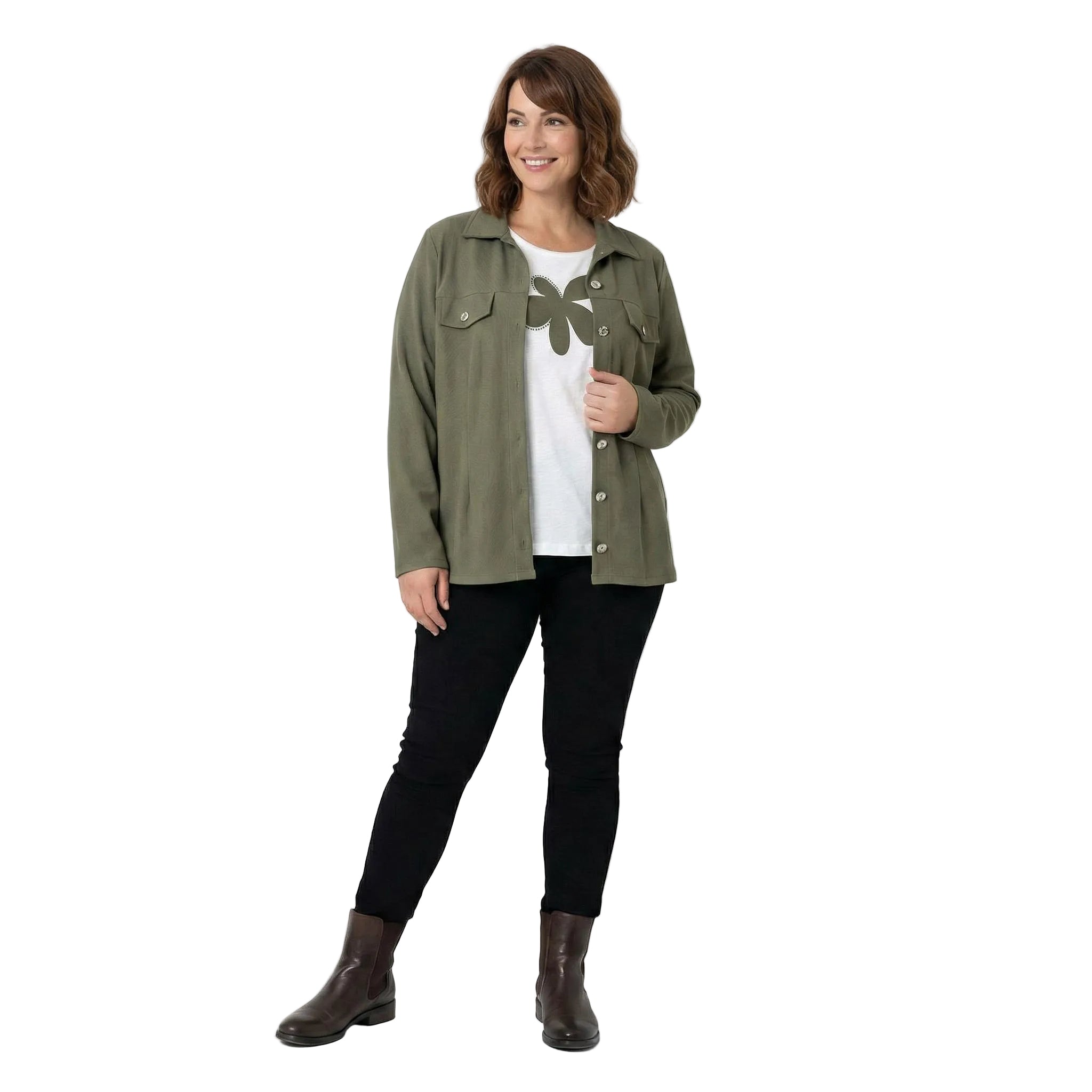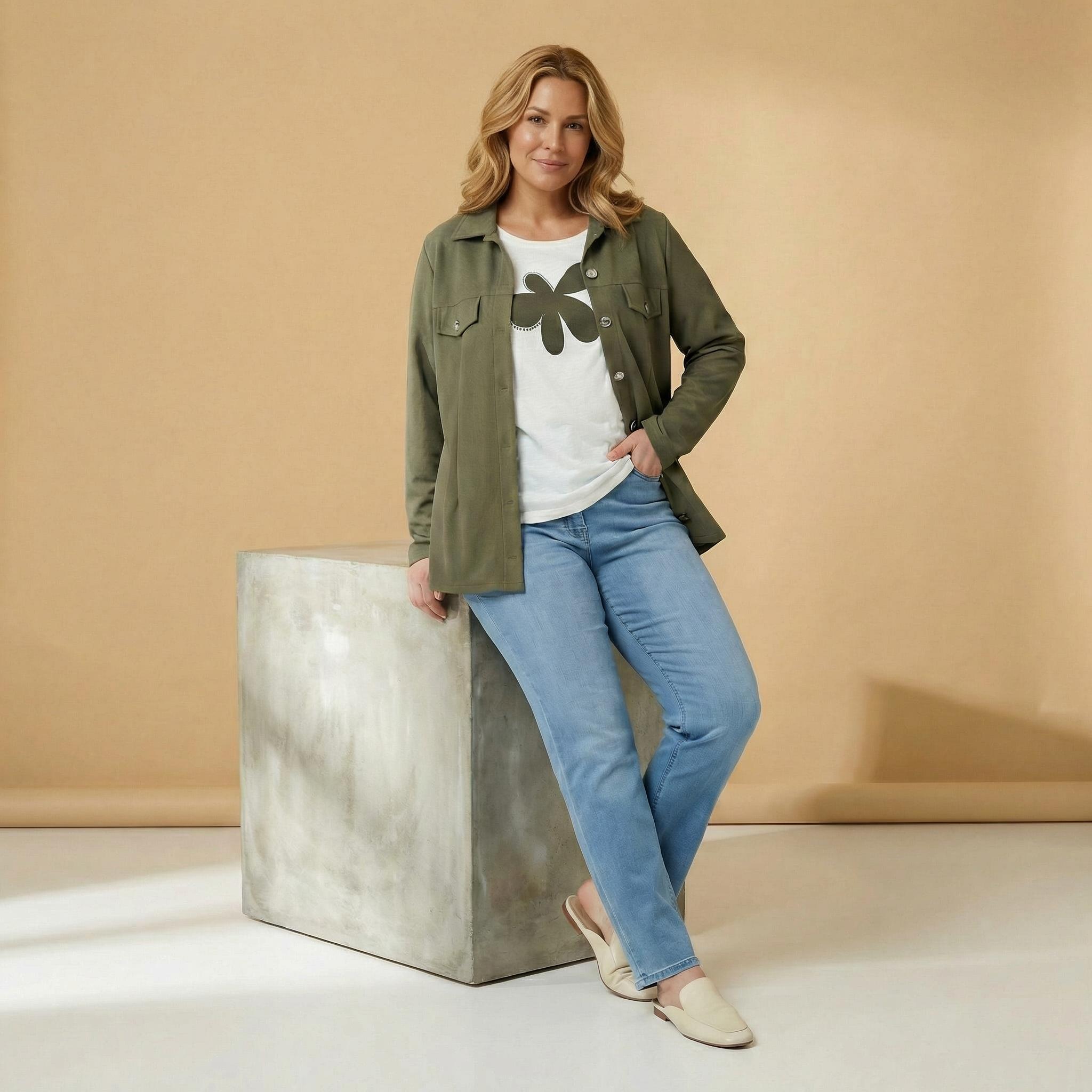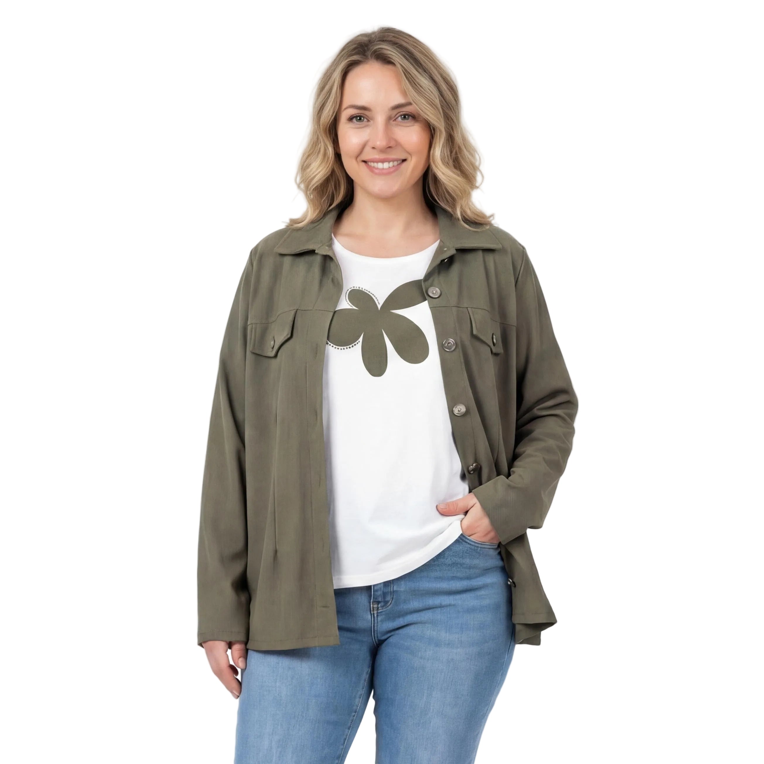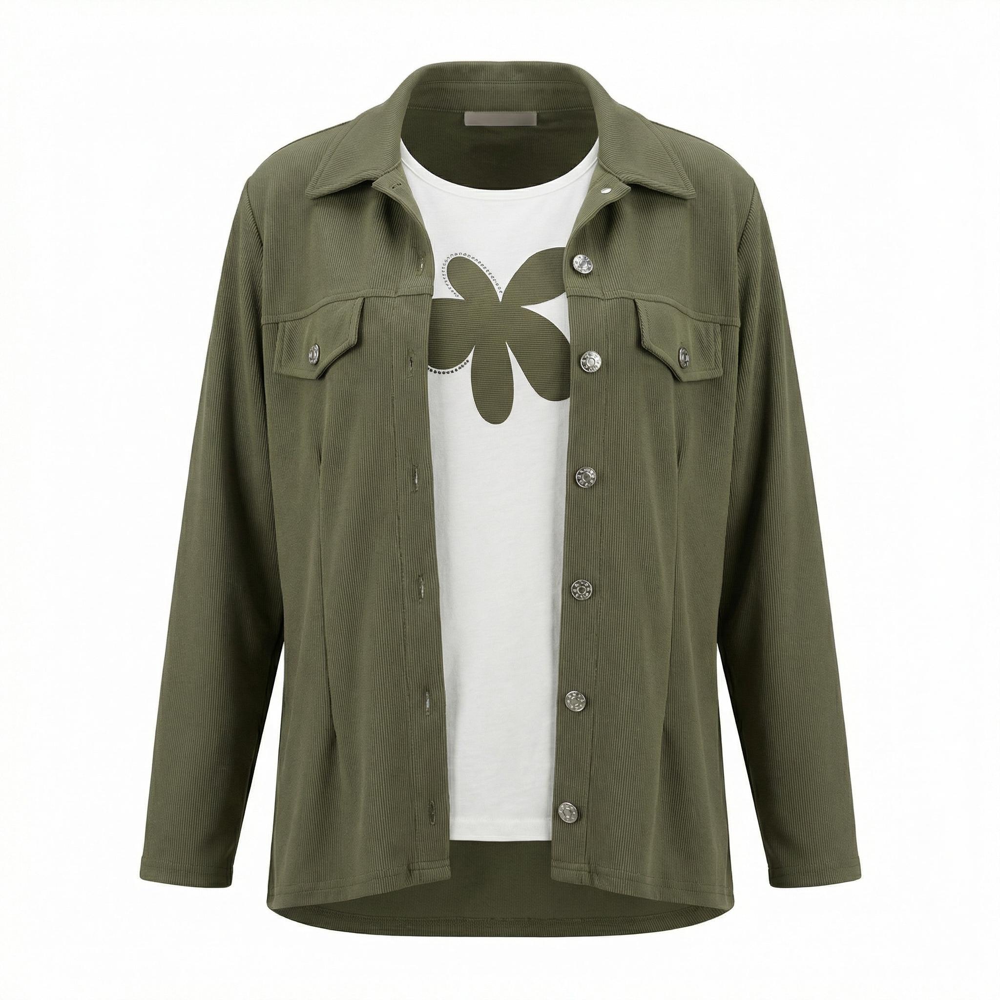 Освежете гардероба си за новия сезон с този стилен дамски комплект от две части в цвят каки. Моделът е специално създаден за дами, които ценят удобството и модерната визия в ежедневието. Комплектът включва комфортна тениска с атрактивна щампа и елегантно сако тип риза с копчета и джобове. Изработен от еластична материя, този сет осигурява свобода на движение и пада тежко и красиво по тялото. Практичната кройка позволява лесно комбиниране на частите поотделно, превръщайки го в универсално решение за пролетта и лятото. Релефната текстура на горната част добавя изтънченост, докато свежият принт на тениската внася настроение във вашата визия.