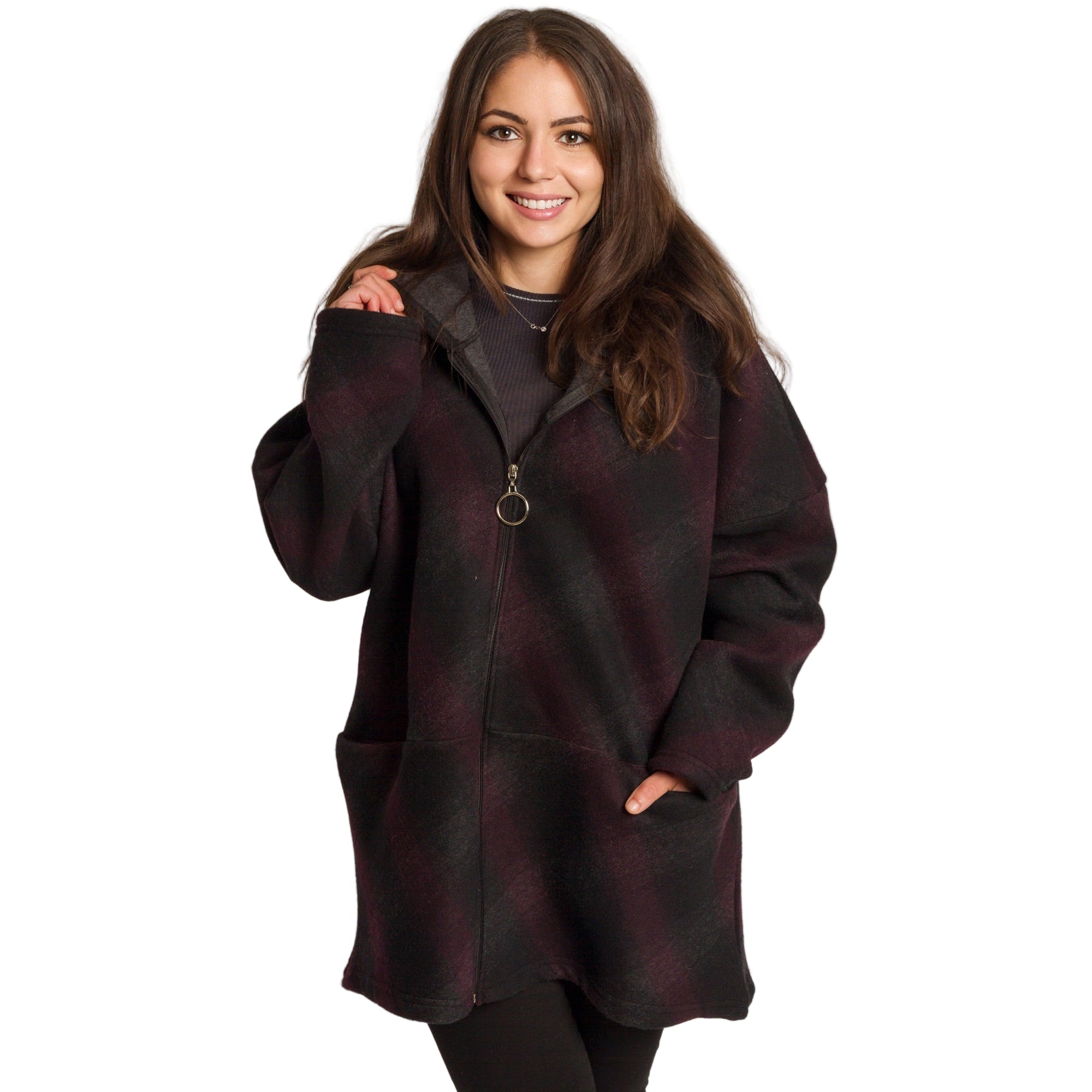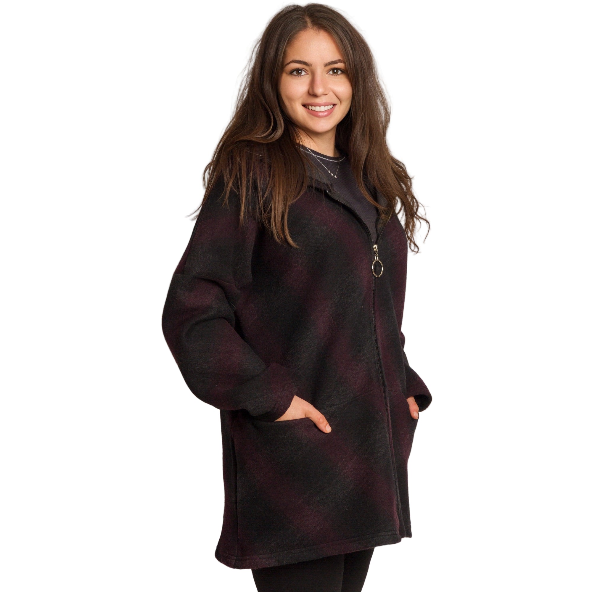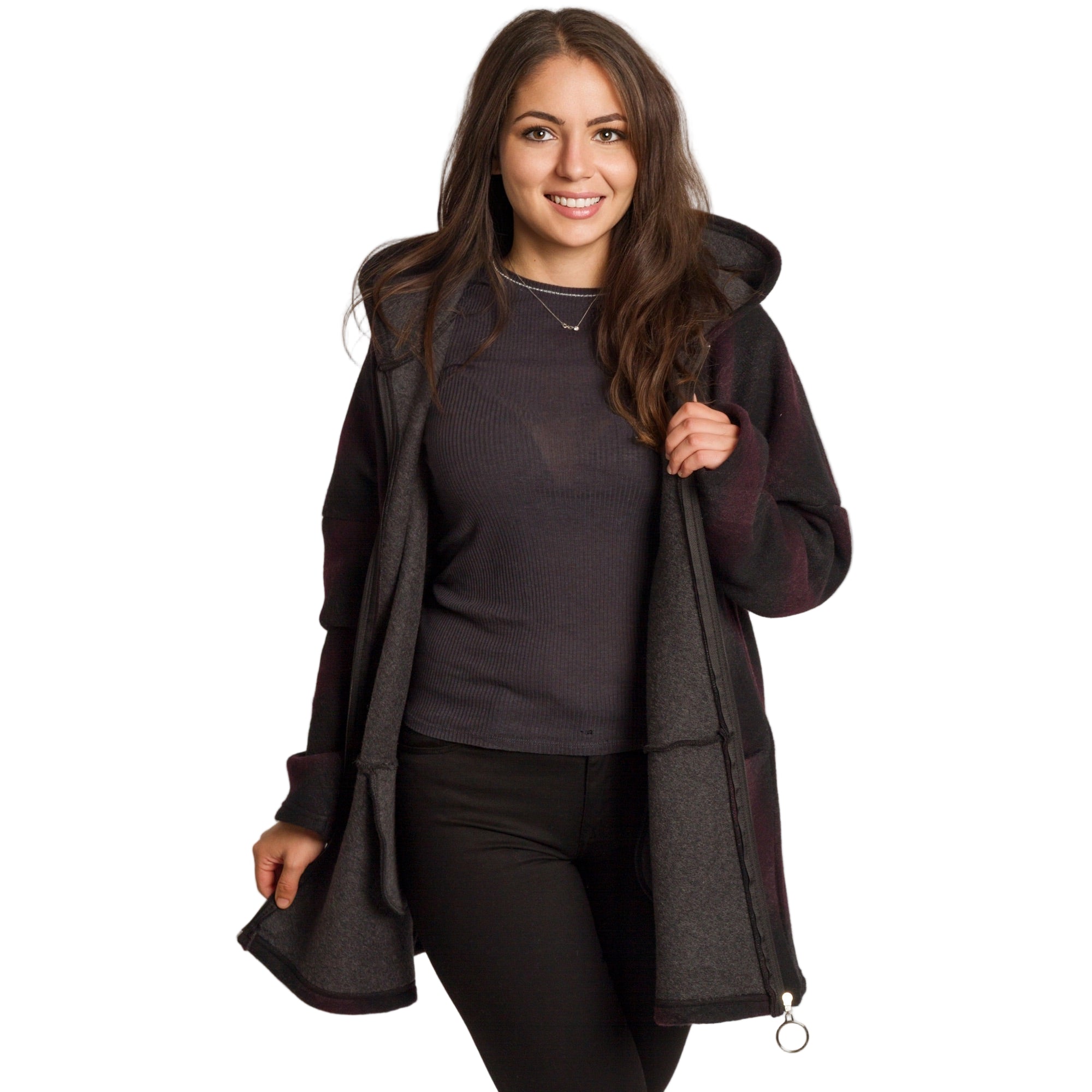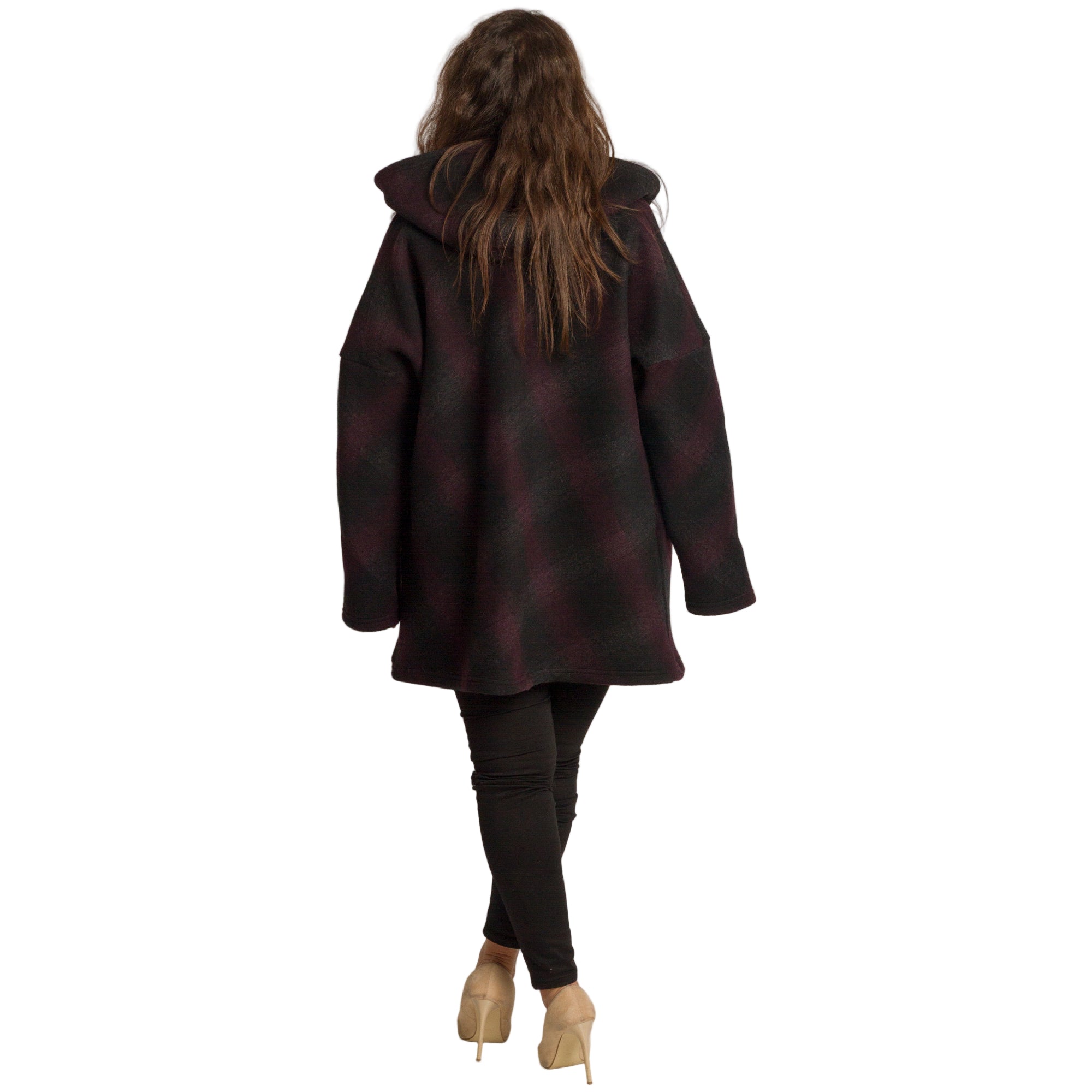 Palton bicolor cu glugă, îmbinând stilul și căldura. Model cu croială decupată și fermoar pentru o închidere convenabilă, confecționat din 50% lână și 50% acril. Alegerea ideală pentru zilele reci de iarnă.