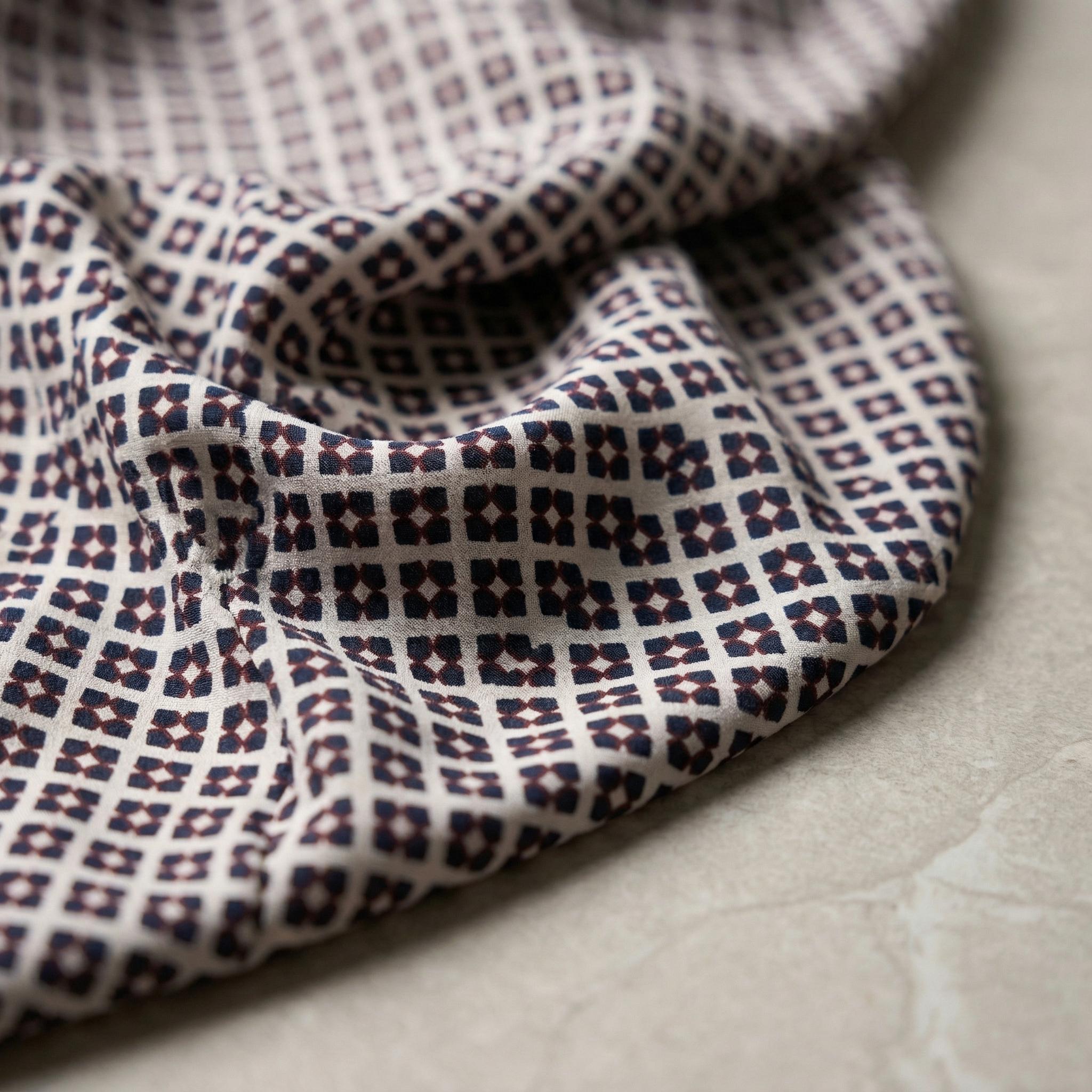 Цвят: Ефектен геометричен принт в бежови и кафяви нюанси (шарен).