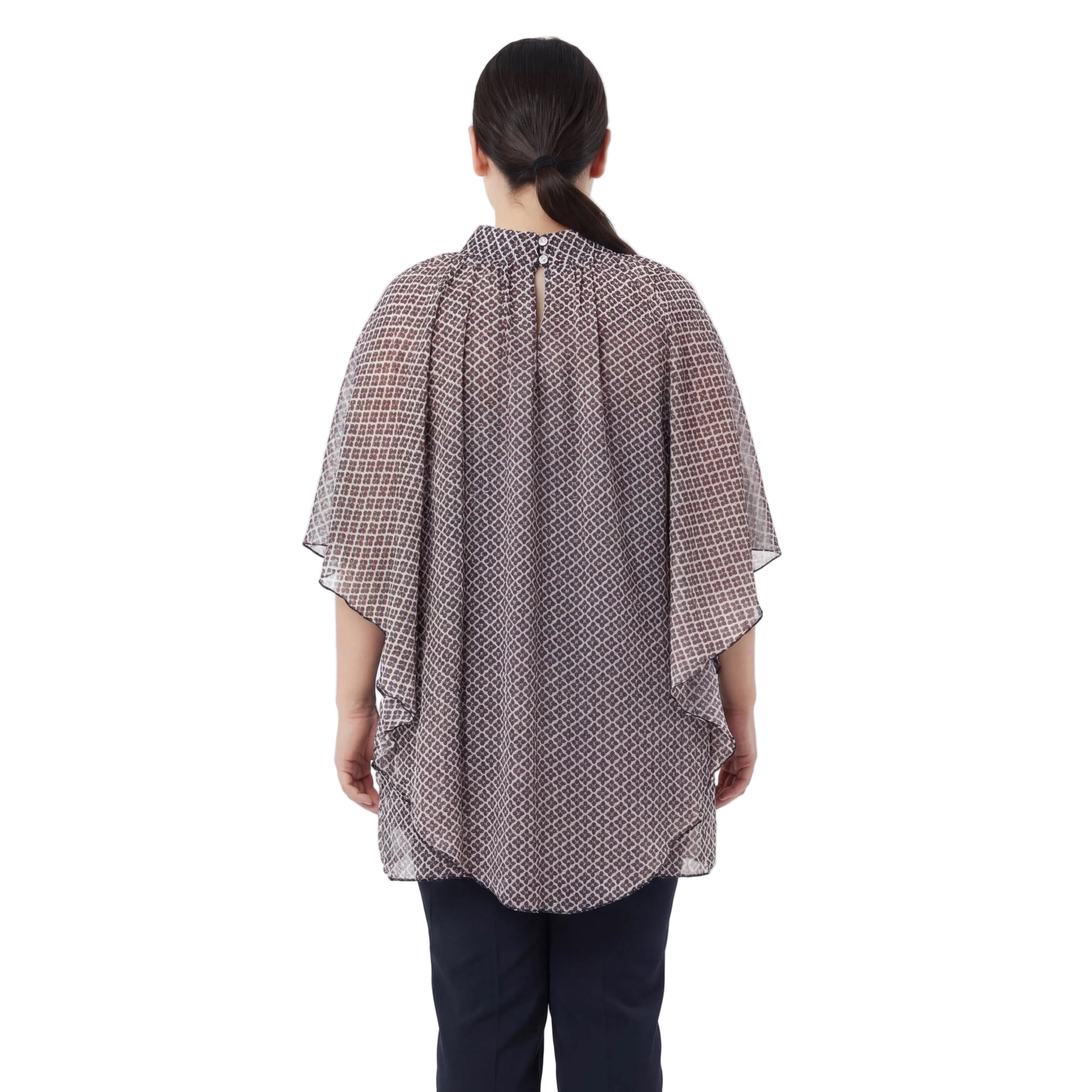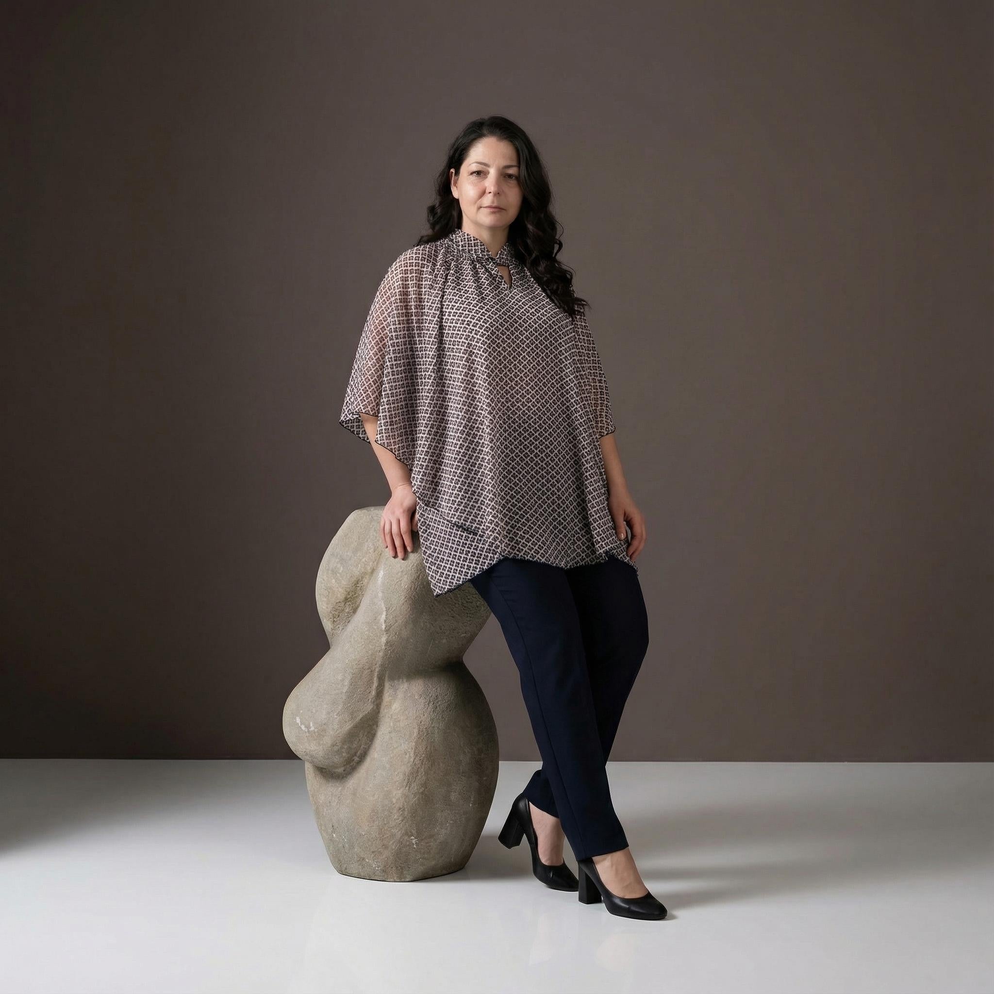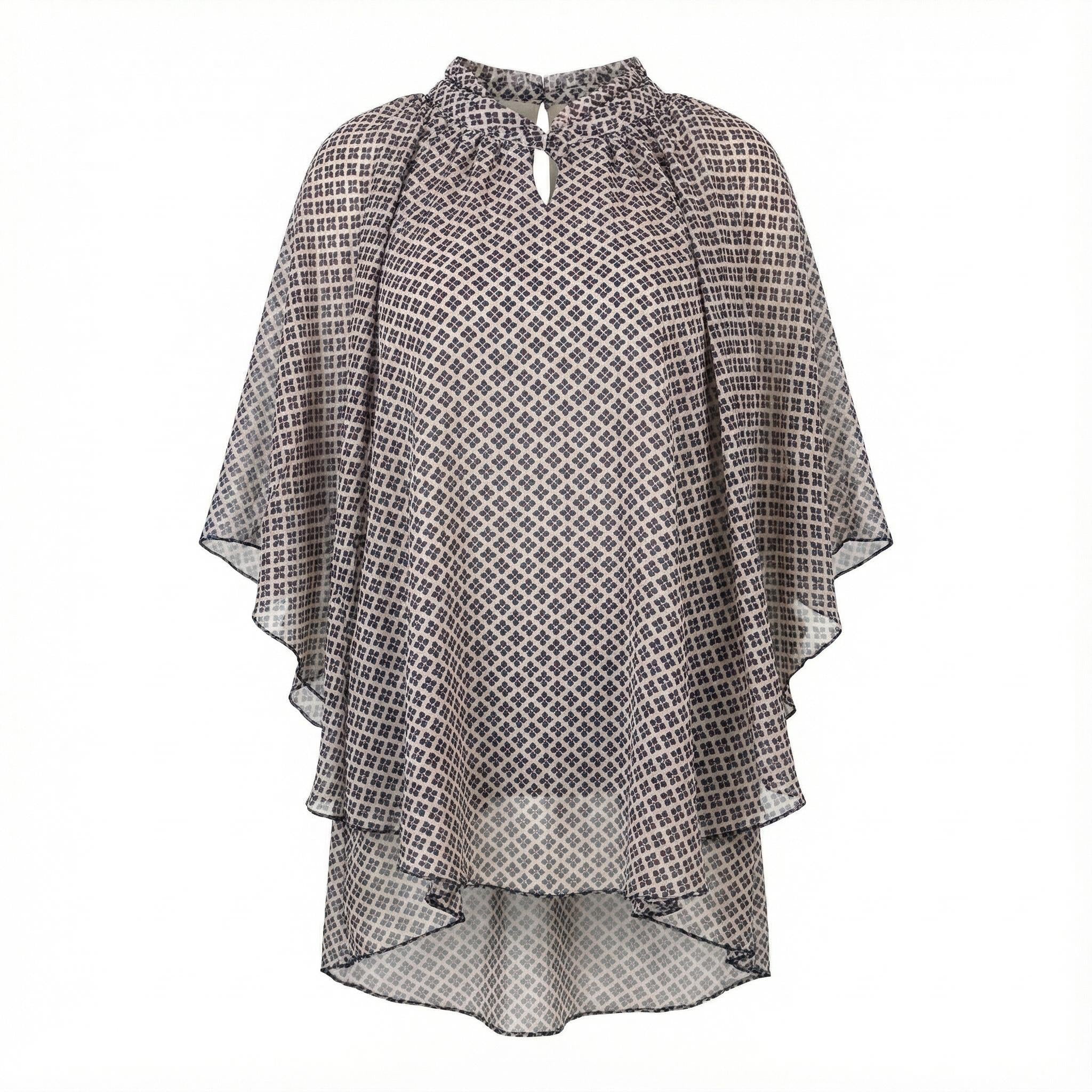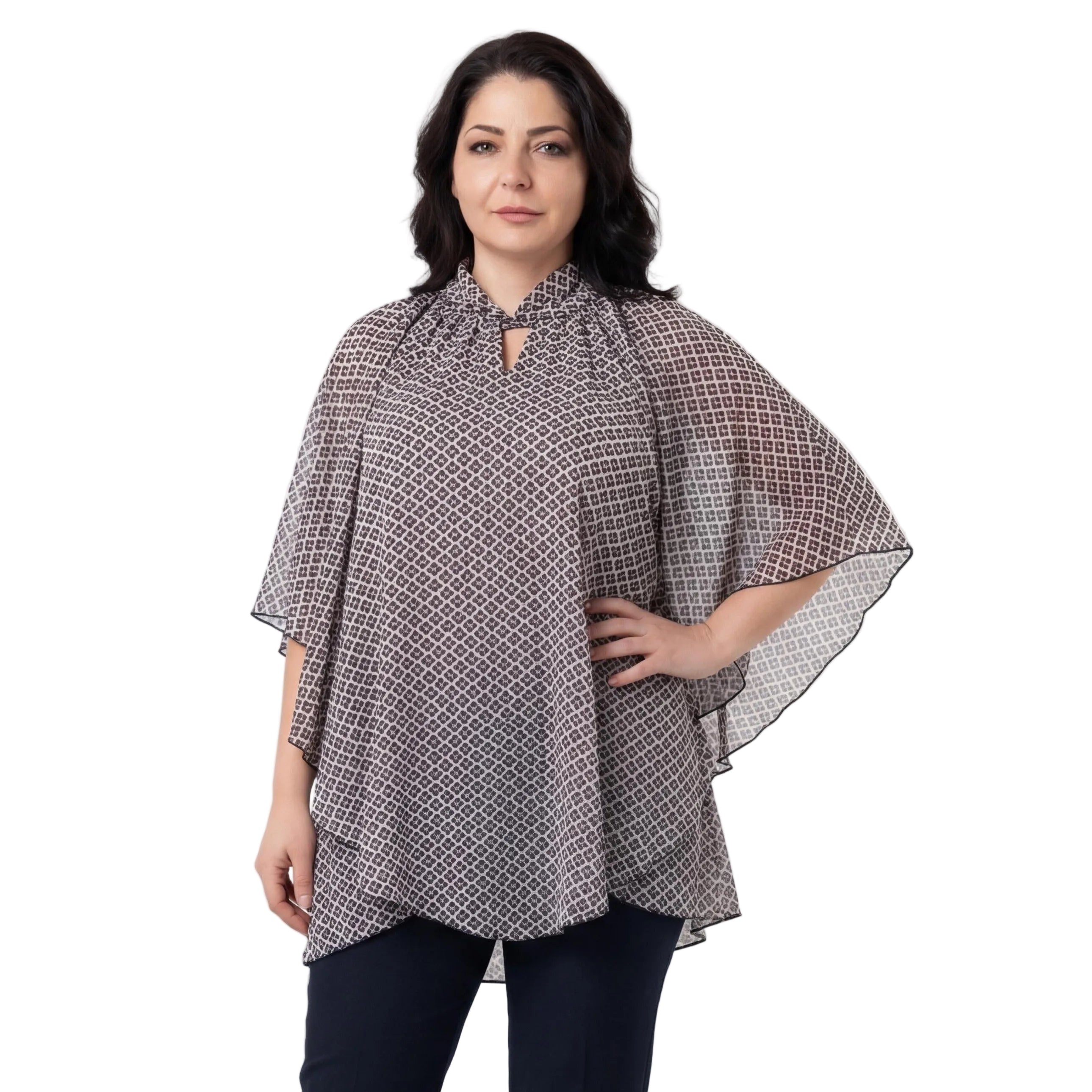 Почувствайте се като истинска богиня на стила с нашата нова официална туника, създадена специално, за да отпразнува вашата женственост. Тази дреха съчетава комфорта на меката вискозна подплата с ефирната елегантност на шифонената наметка, която пада свободно около тялото ви като нежно пончо. Геометричният принт в топли бежови и тъмнокафяви нюанси добавя артистичен и модерен акцент, докато деликатният вълнообразен подгъв придава завършеност и финес. Кройката е проектирана да осигури пълна свобода на движението, без да прилепва, позволявайки ви да излъчвате увереност на всяко официално събитие или специална вечеря.