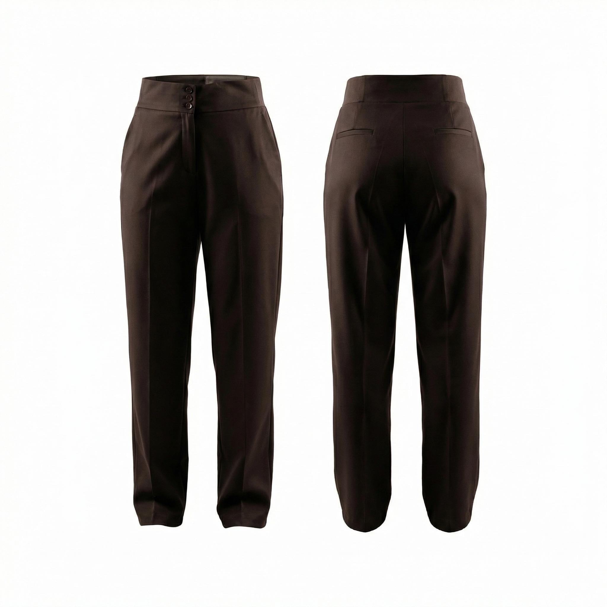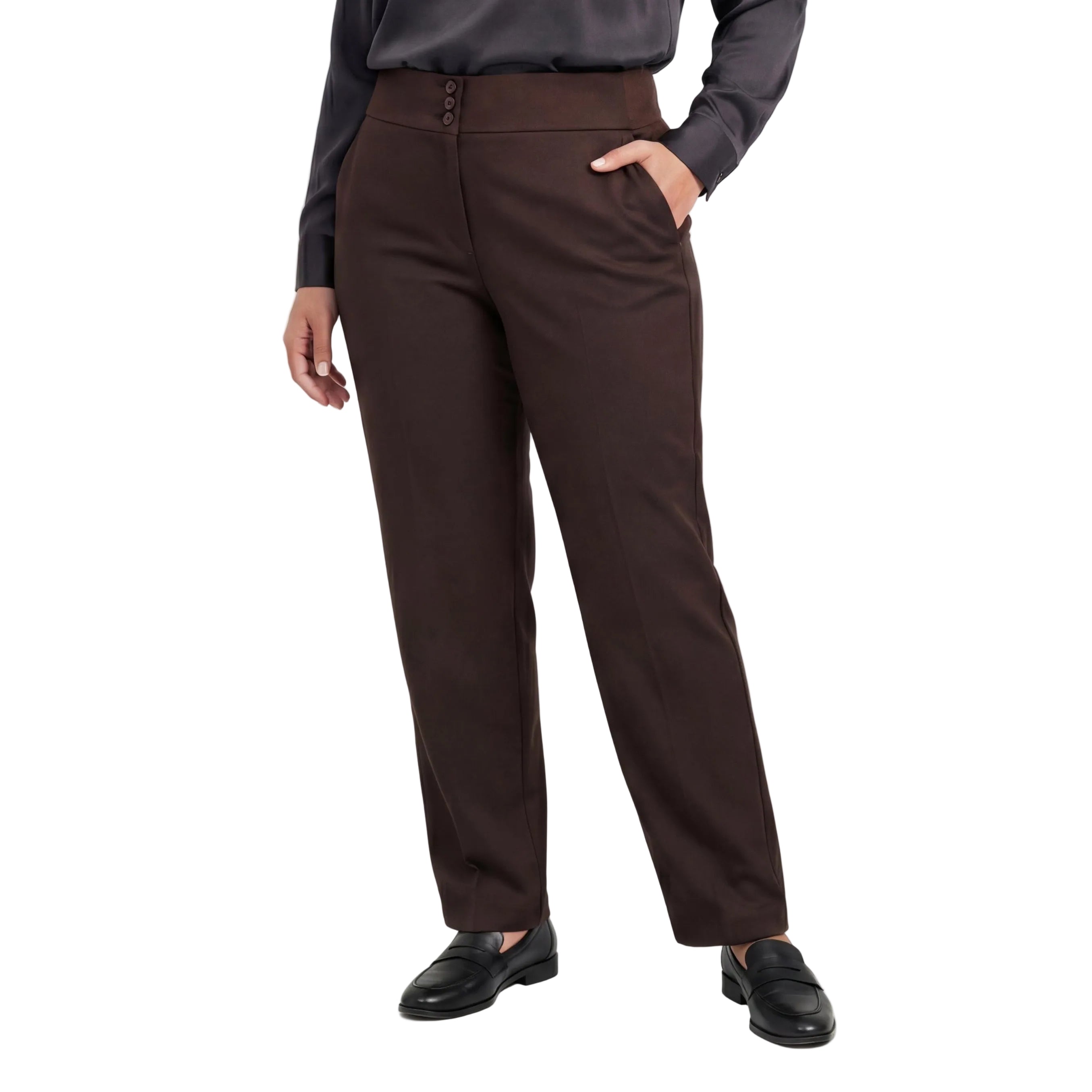 Преоткрийте стила и удобството през този сезон с нашия елегантен кафяв панталон, създаден специално за дами с извивки. Моделът се отличава с класическа права кройка, която издължава визуално фигурата, и висока талия, акцентирана с три стилни копчета. За максимален комфорт през целия ден, коланът е снабден с ластик в двата края, което осигурява перфектно прилягане без пристягане. Изработен от гладка и приятна на допир материя с добавена вискоза и еластан, този панталон е идеален избор както за деловото ежедневие, така и за специални поводи.