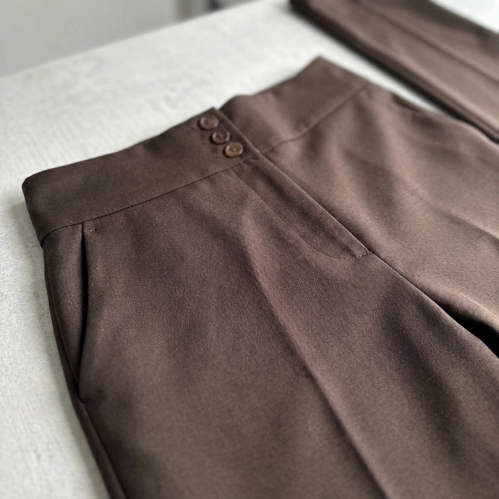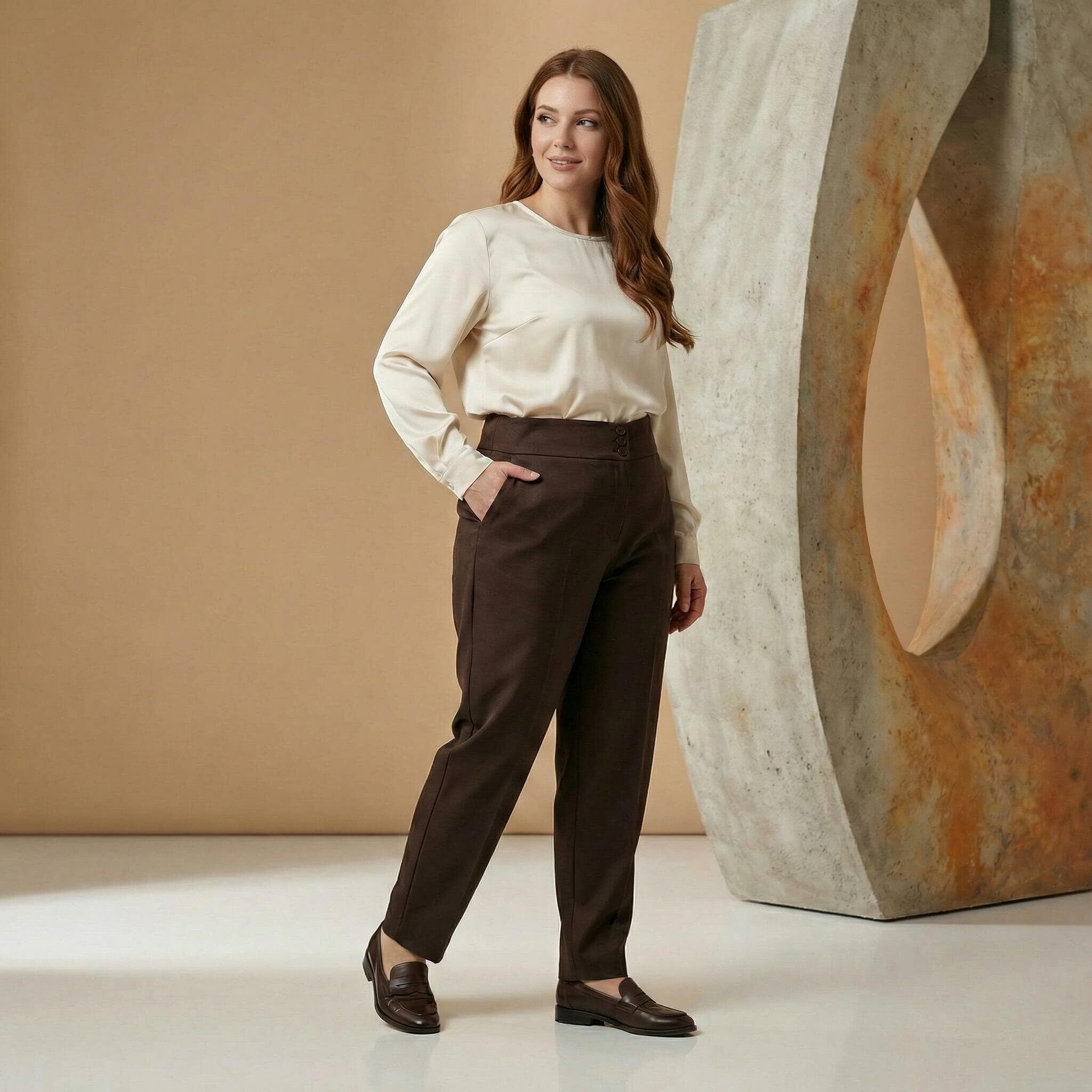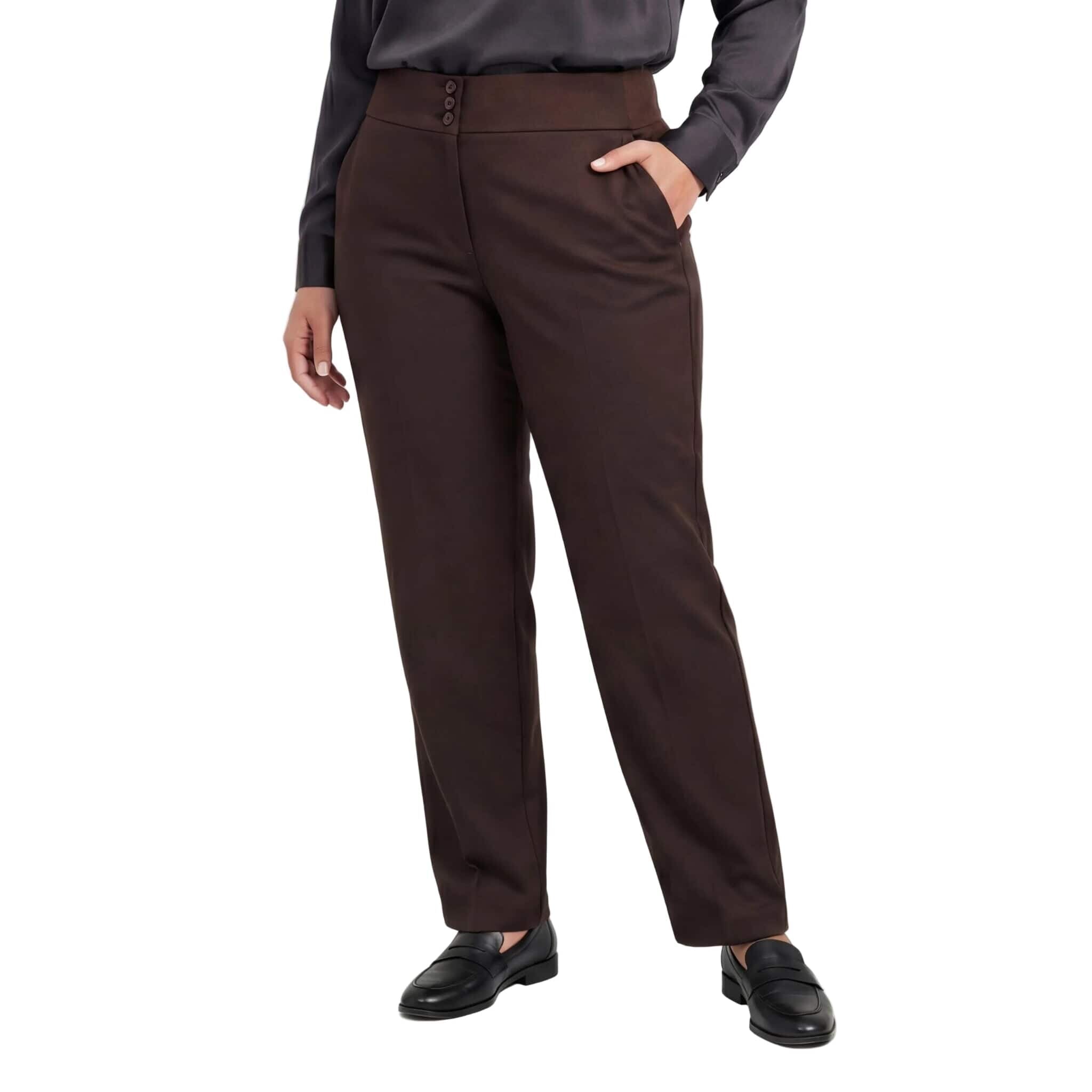 Pantaloni eleganți maro cu talie înaltă și nasturi, mărimi mari