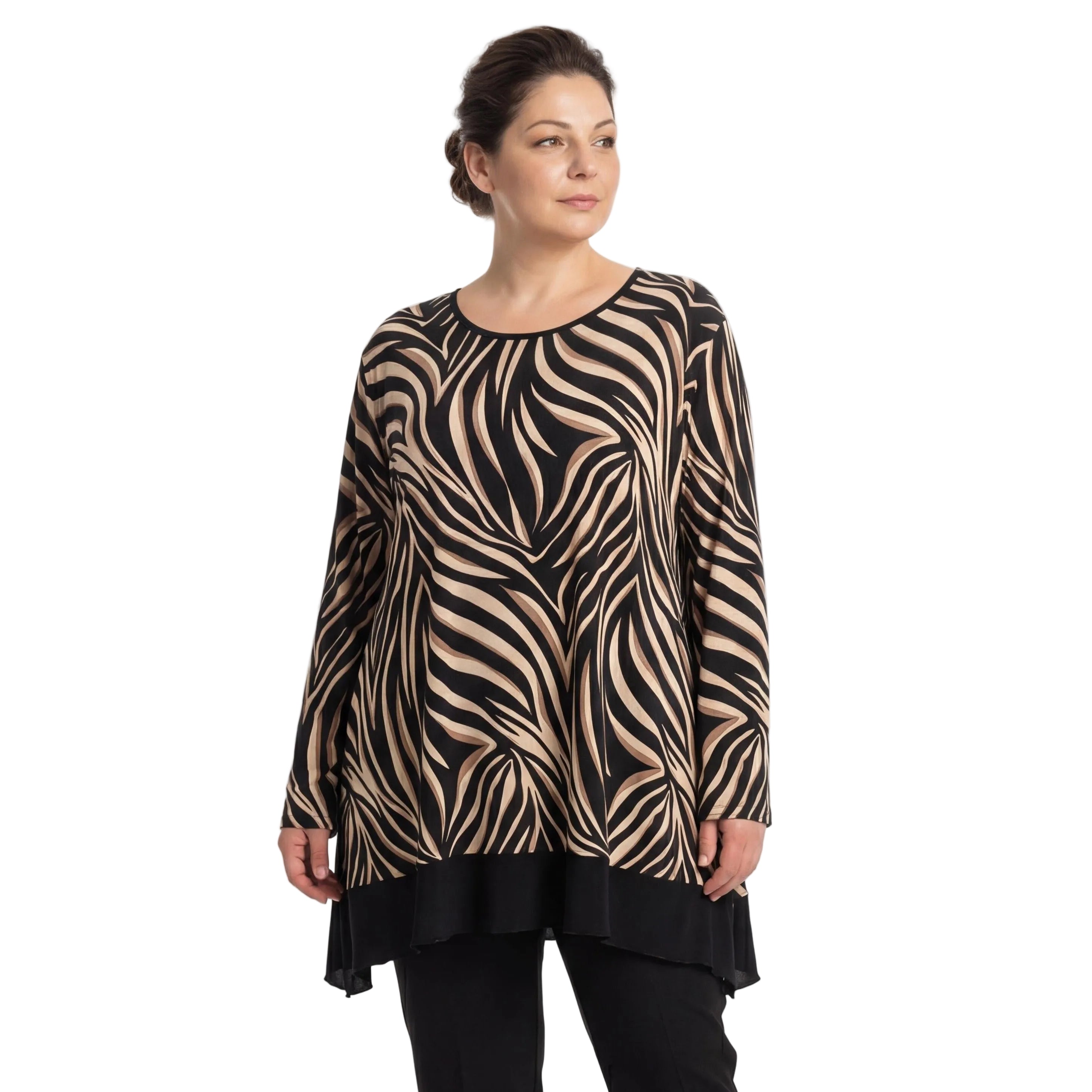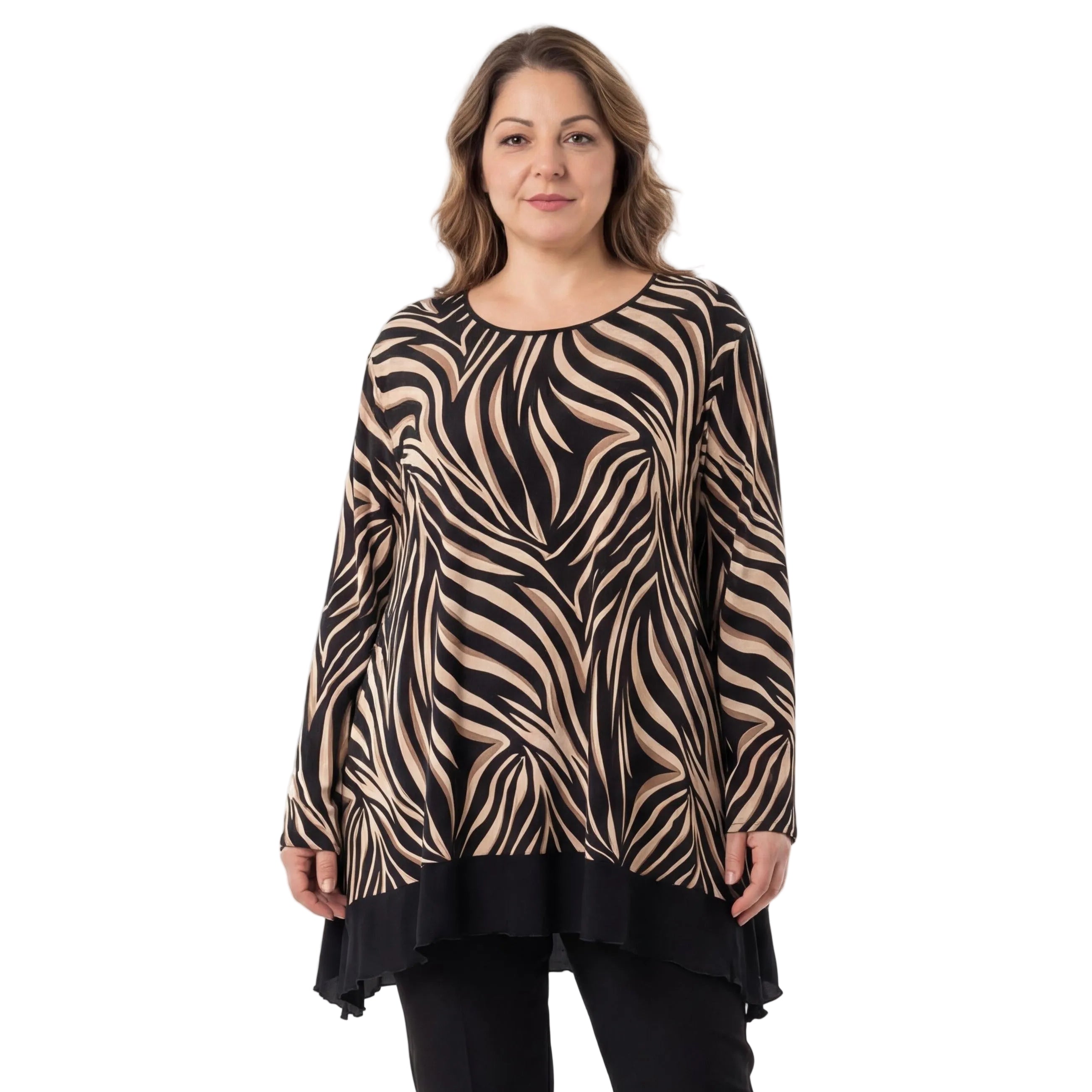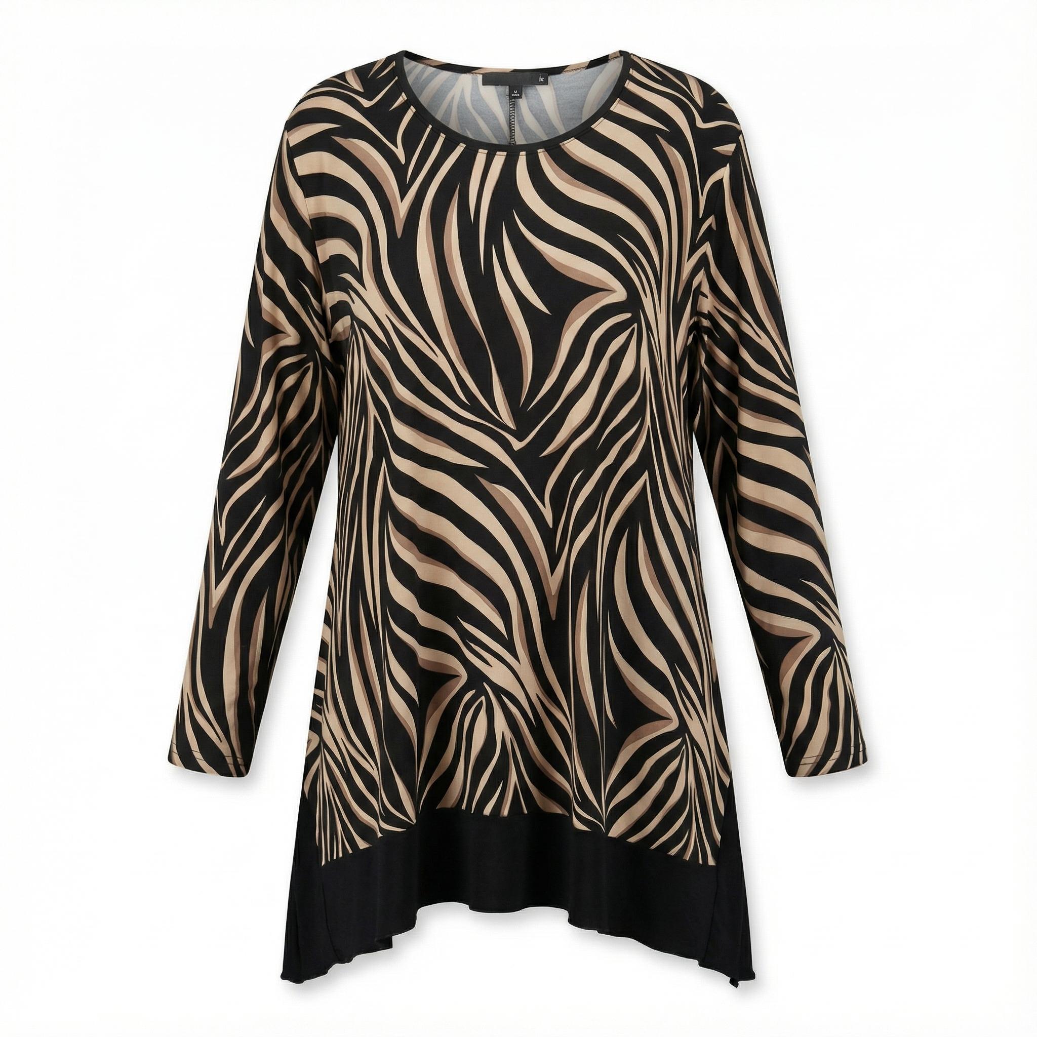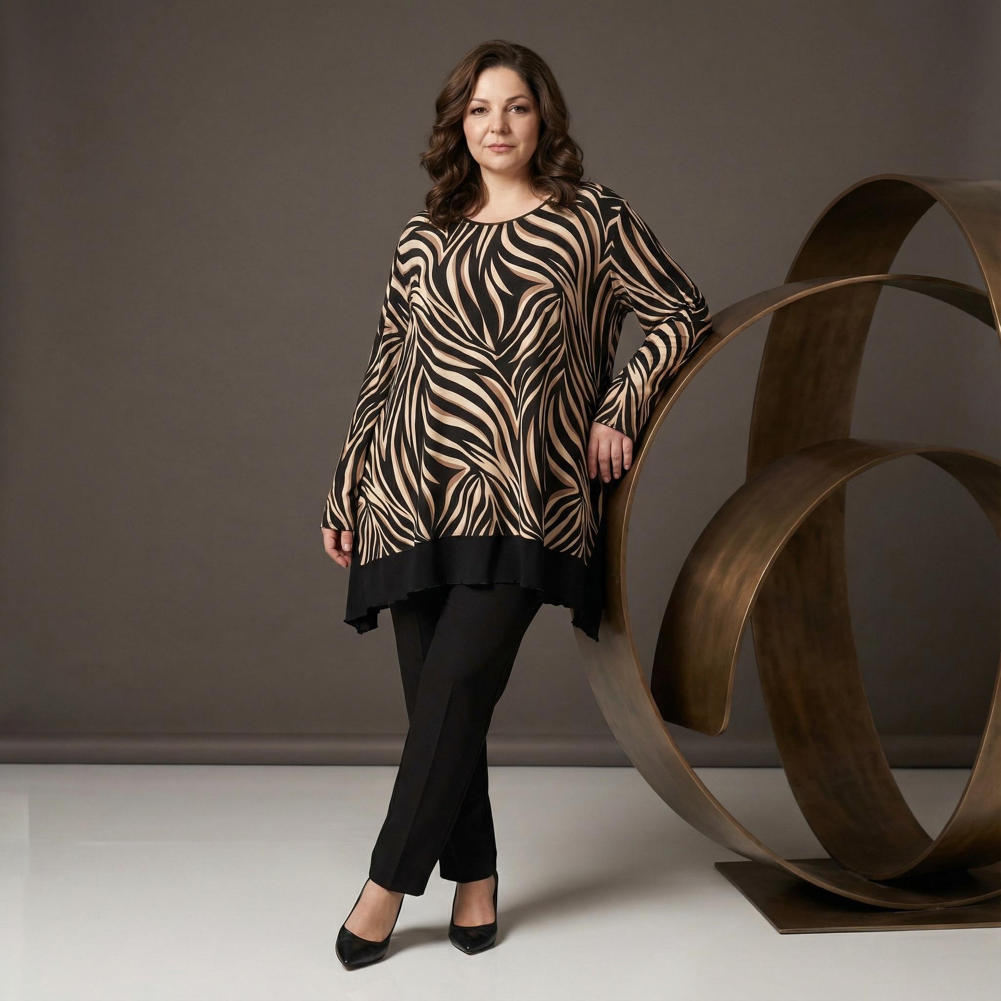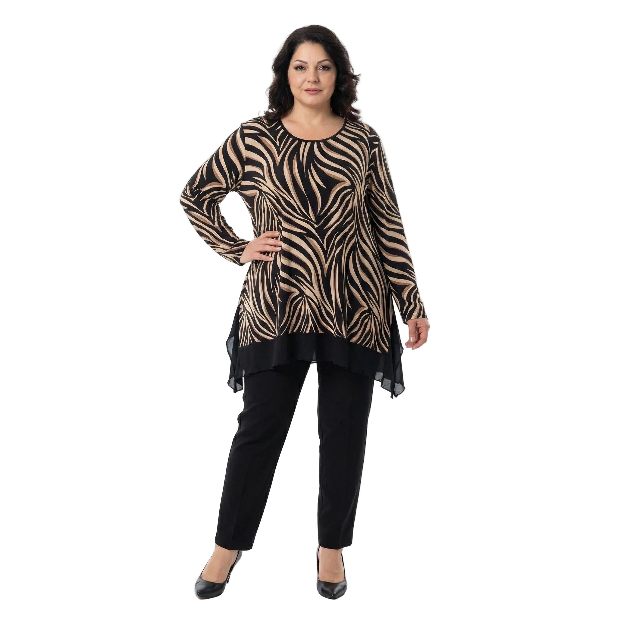 Преобразете визията си с тази изискана туника, създадена да подчертае красотата на женствения силует. Моделът съчетава класическата елегантност на черното с меки нюанси на капучино в модерен, вълнообразен принт, който привлича погледа с финес.