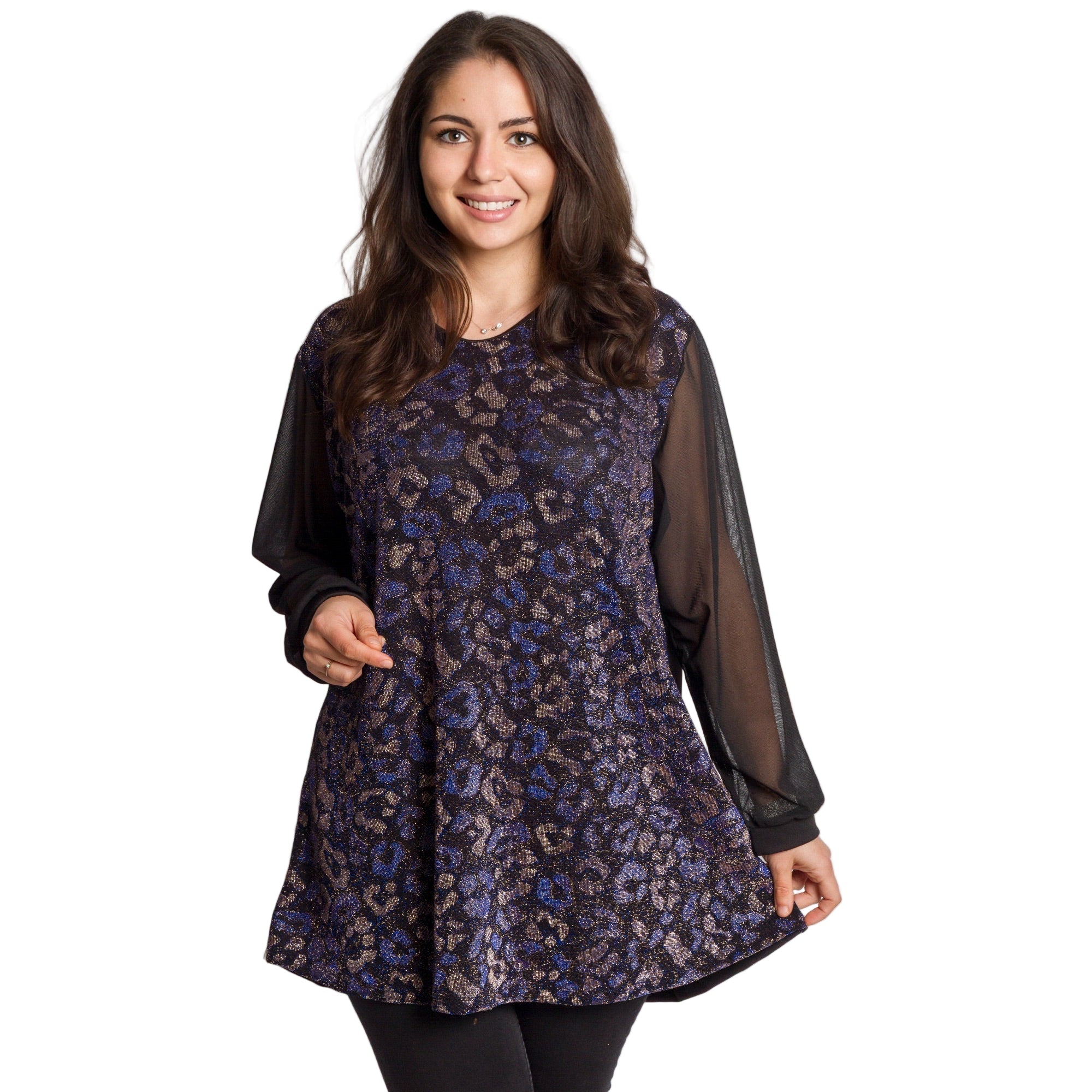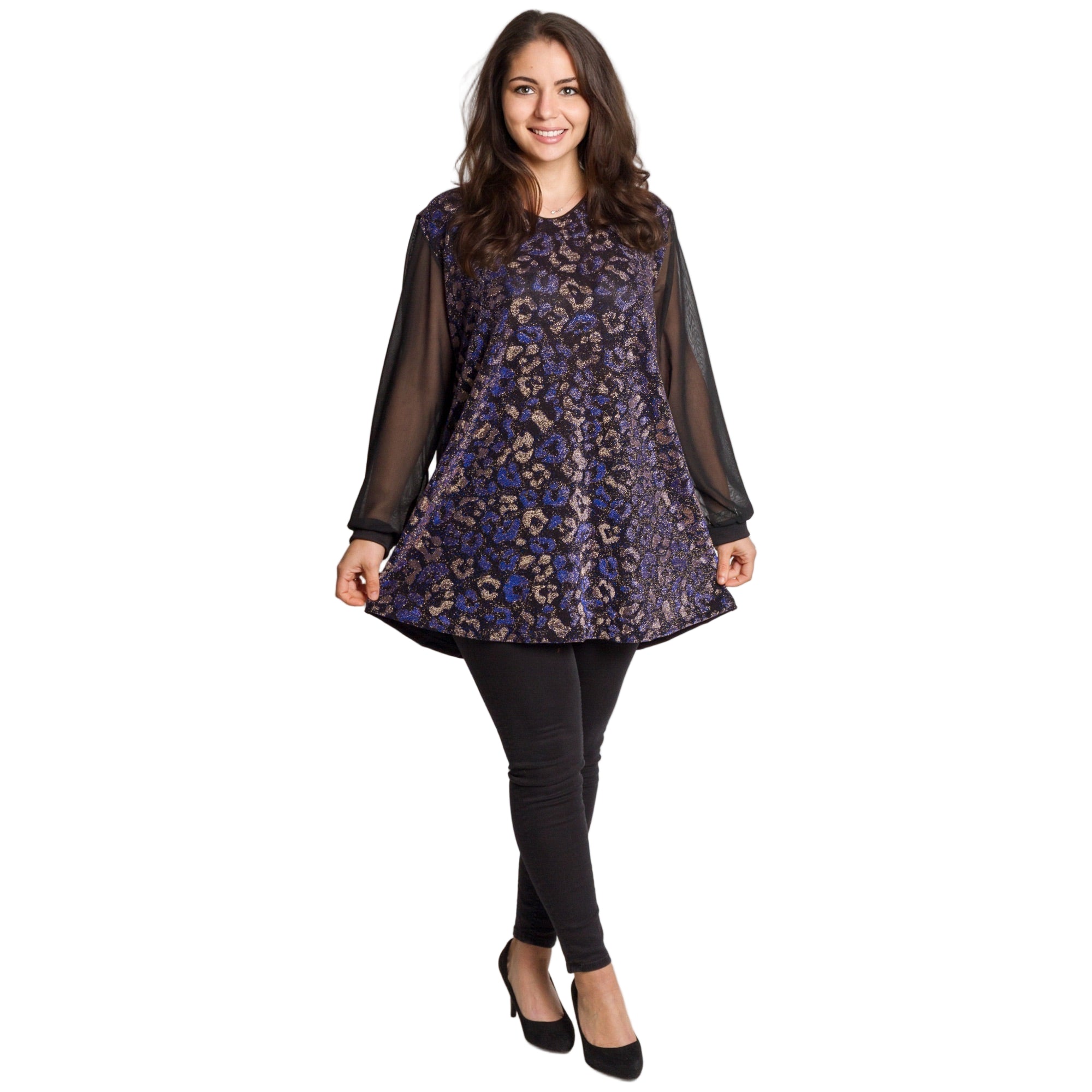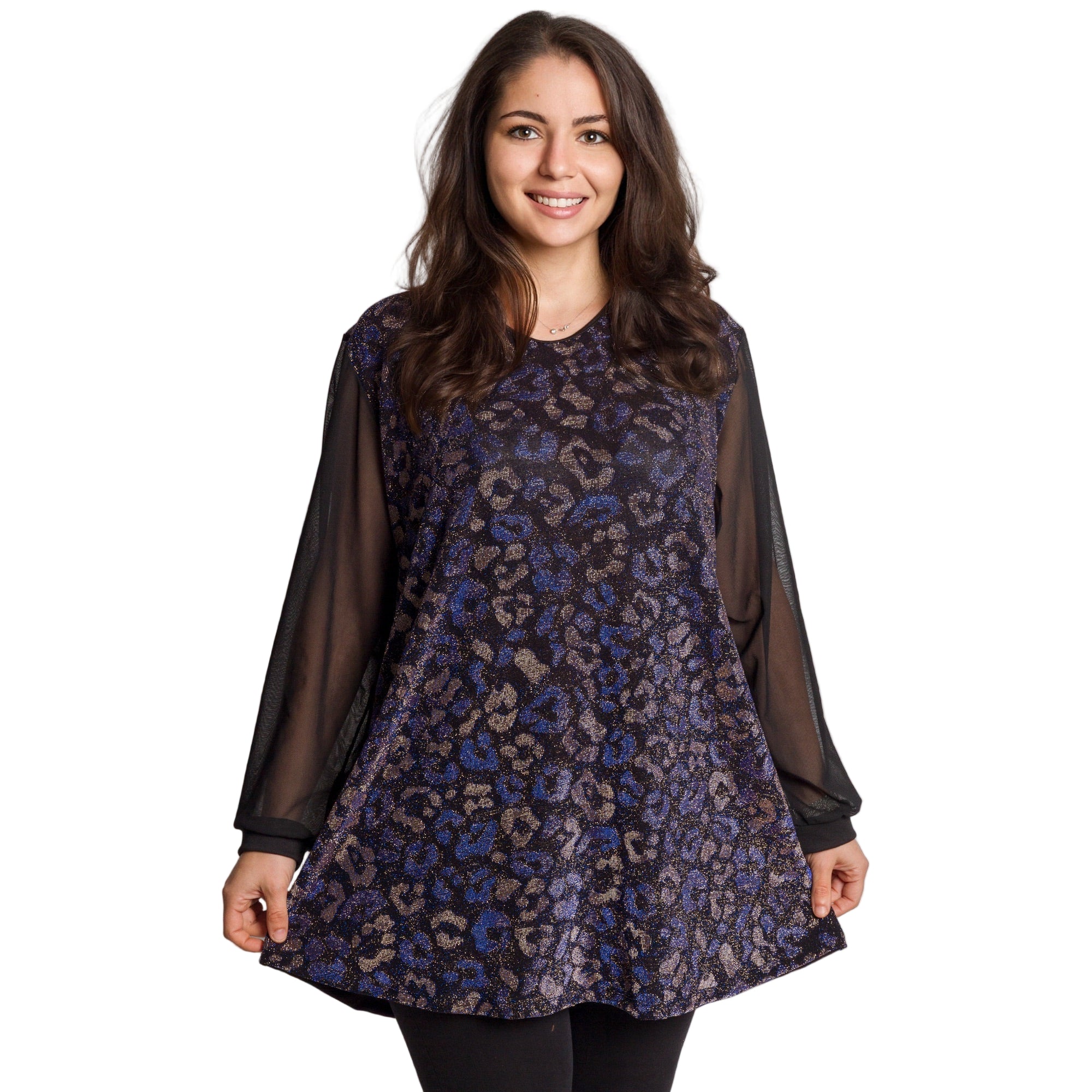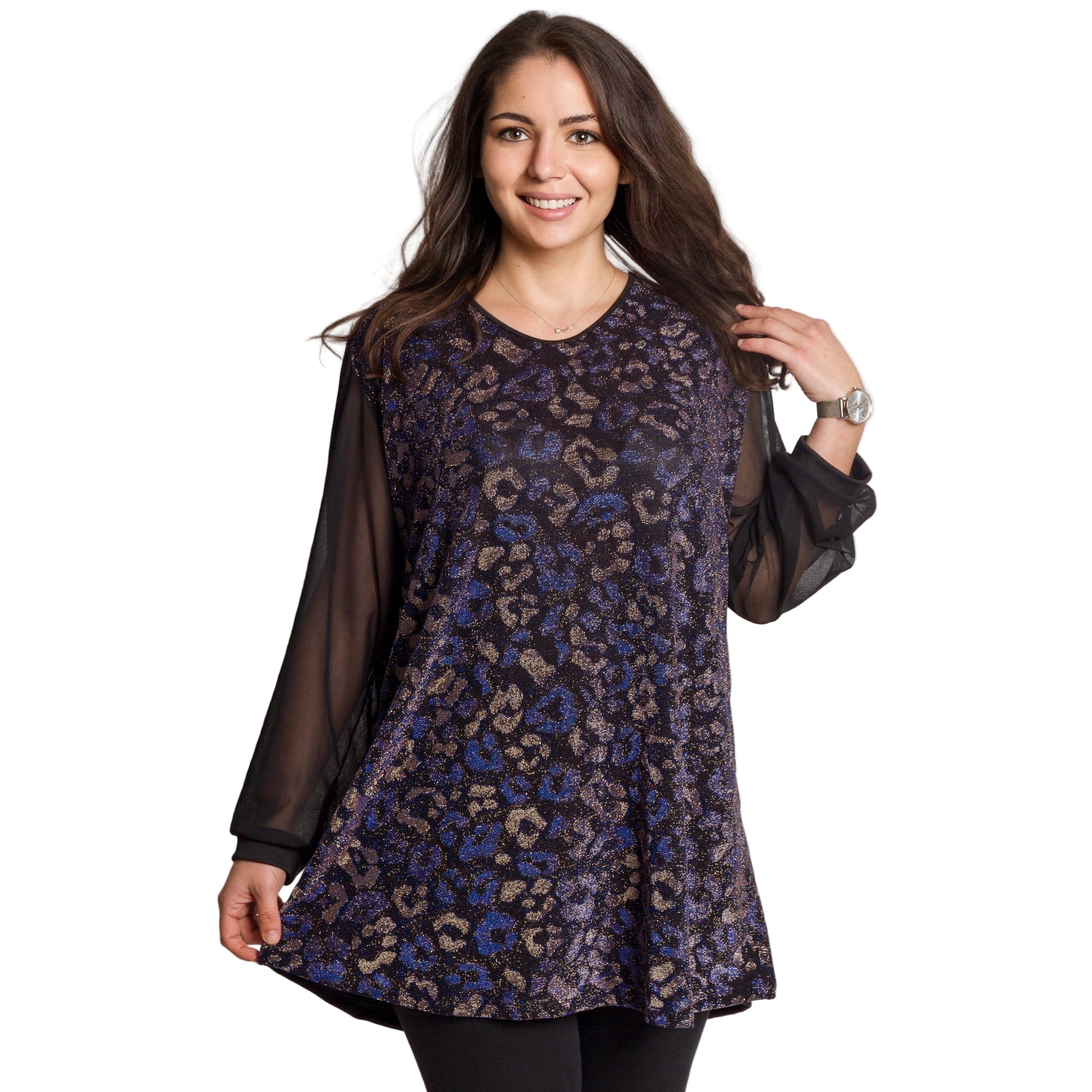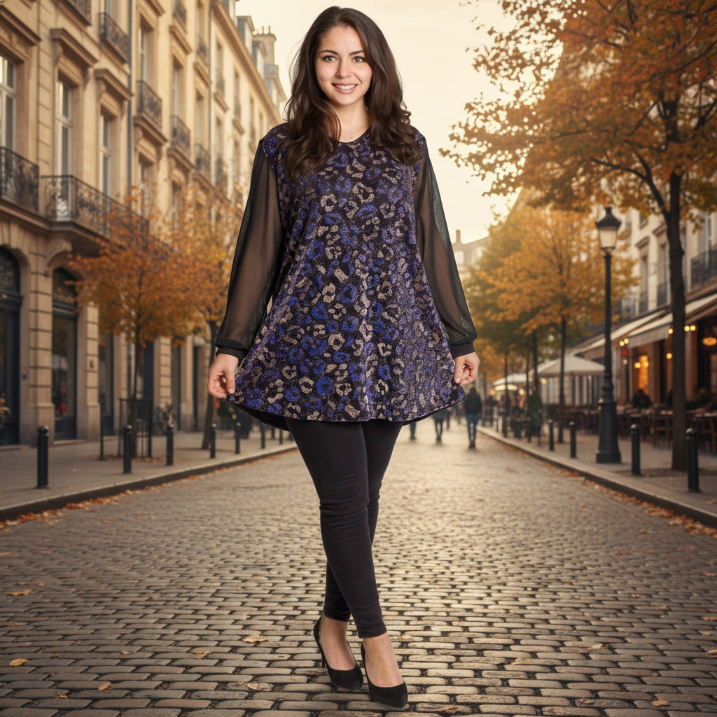 Adaugă culoare și eleganță ținutei tale cu această tunică lejeră în mărimi maxi. Modelul prezintă un imprimeu superb în tonuri bogate de verde și albastru, completat de un accent diagonal albastru închis din țesătură satinată, care adaugă rafinament și alungește vizual silueta. Croiul este lejer și confortabil, cu decolteu rotund și mâneci scurte - o alegere ideală atât pentru ocazii de zi cu zi, cât și pentru ocazii mai formale.