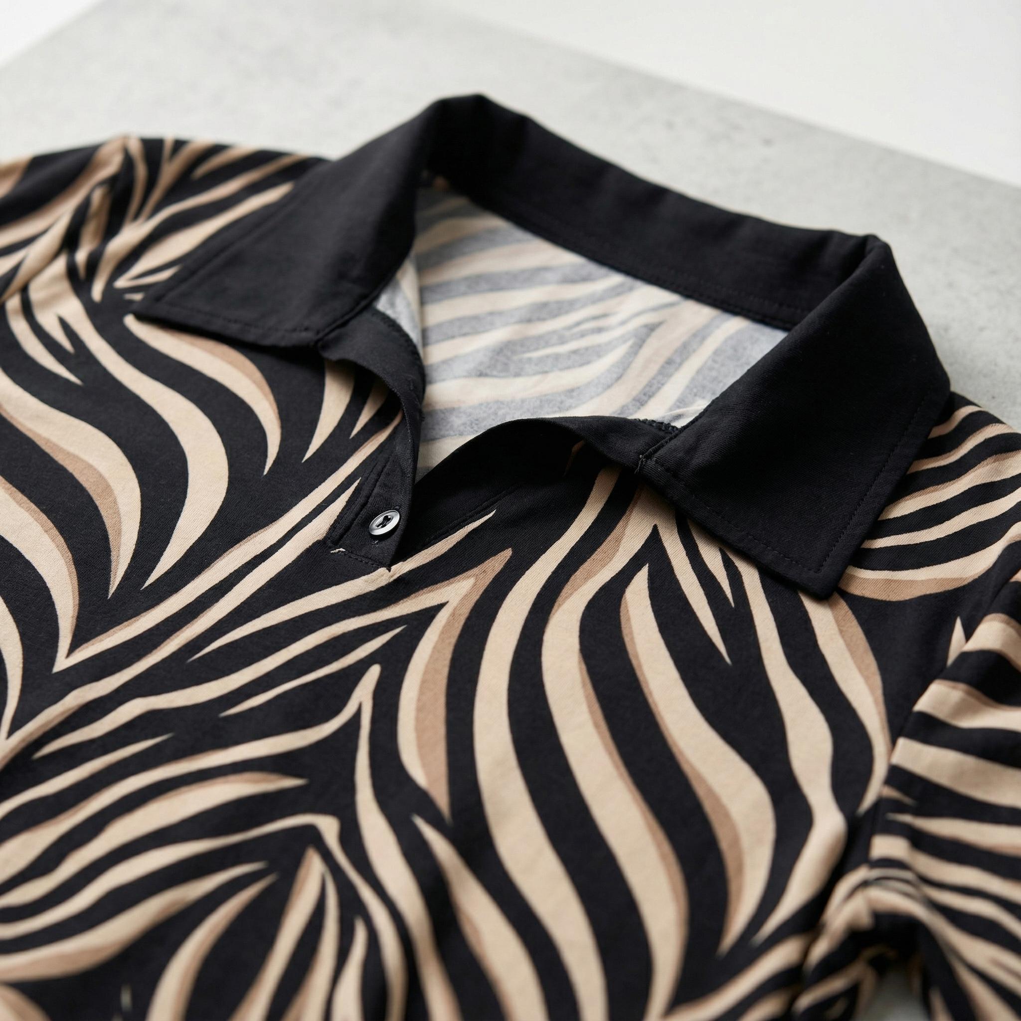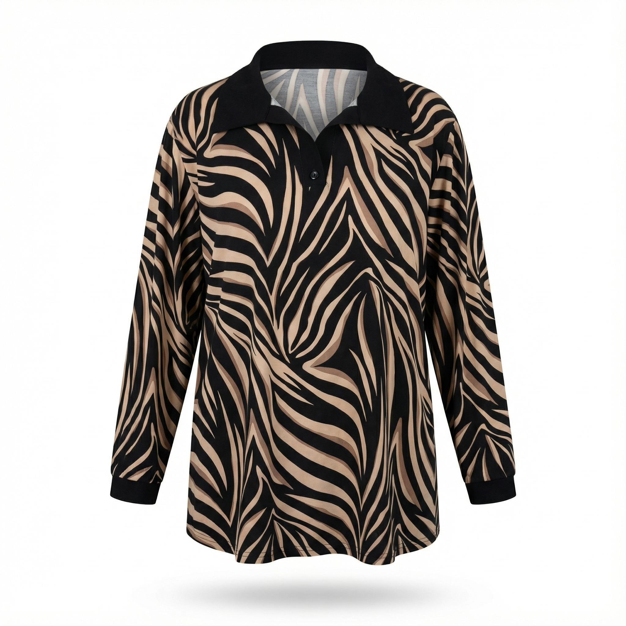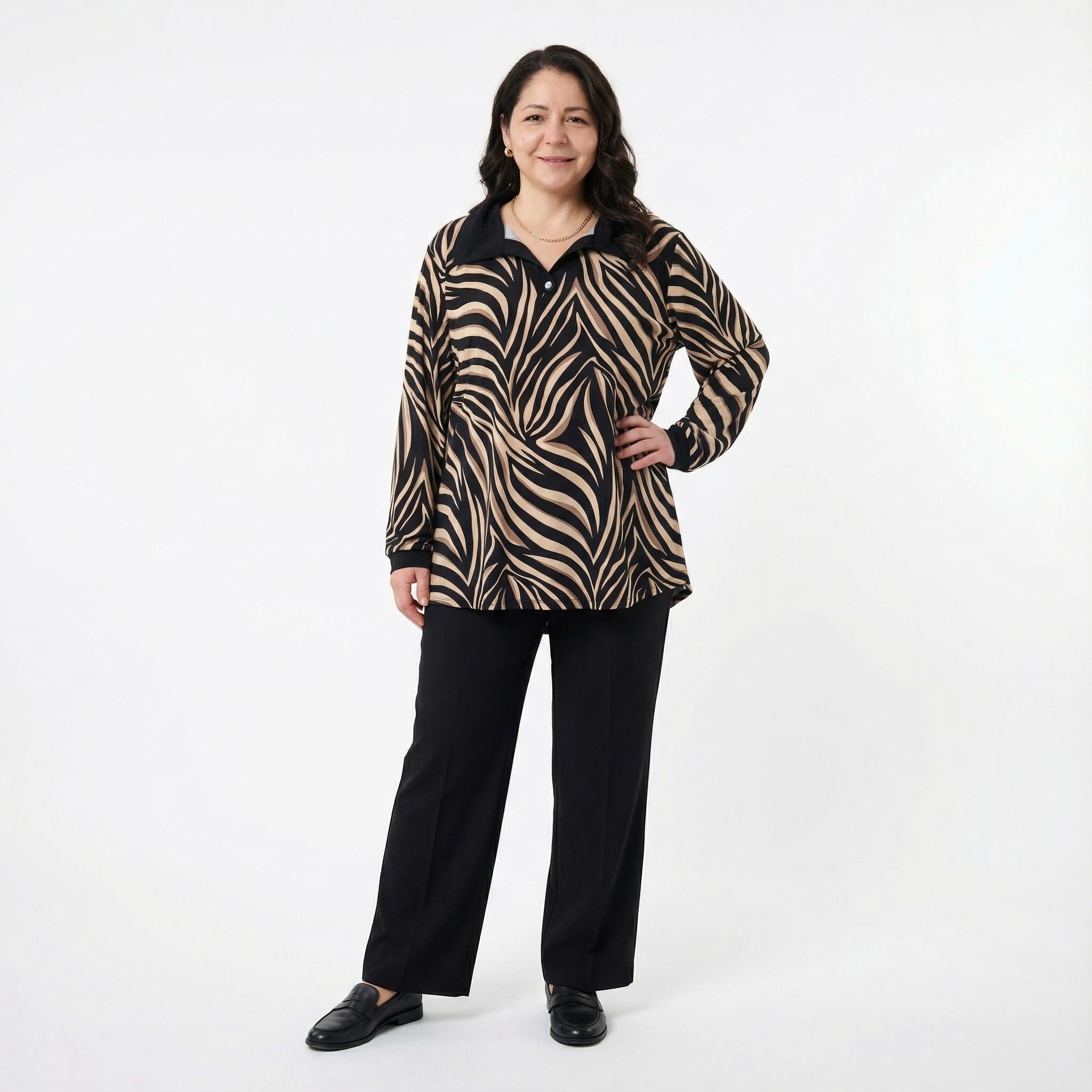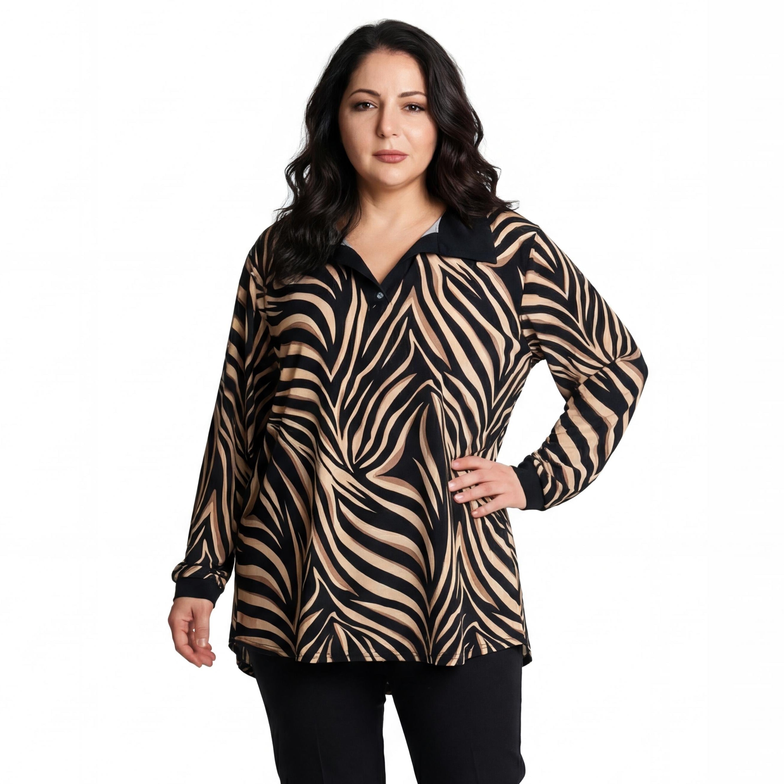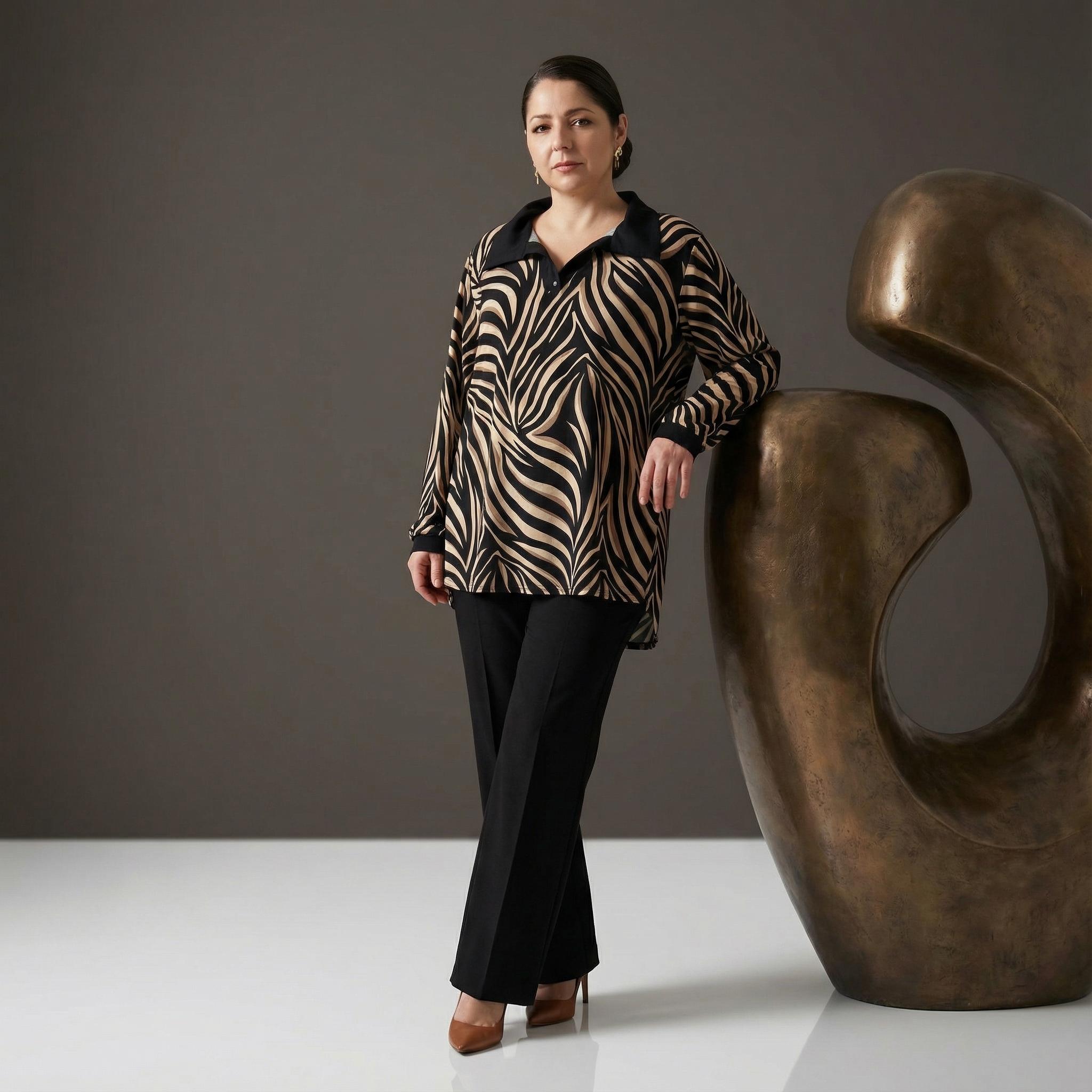 Открийте перфектния баланс между модерен стил и безкомпромисна класа с нашата нова елегантна туника. Създадена специално за дамата, която цени изразителния стил, тази дреха съчетава мекотата на висококачественото вискозно трико с изчистената елегантност на официалната визия. Абстрактният зебра десен в черно и бежово придава съвременно излъчване, докато плътната черна яка и маншетите красиво очертават силуета и добавят доза финес.