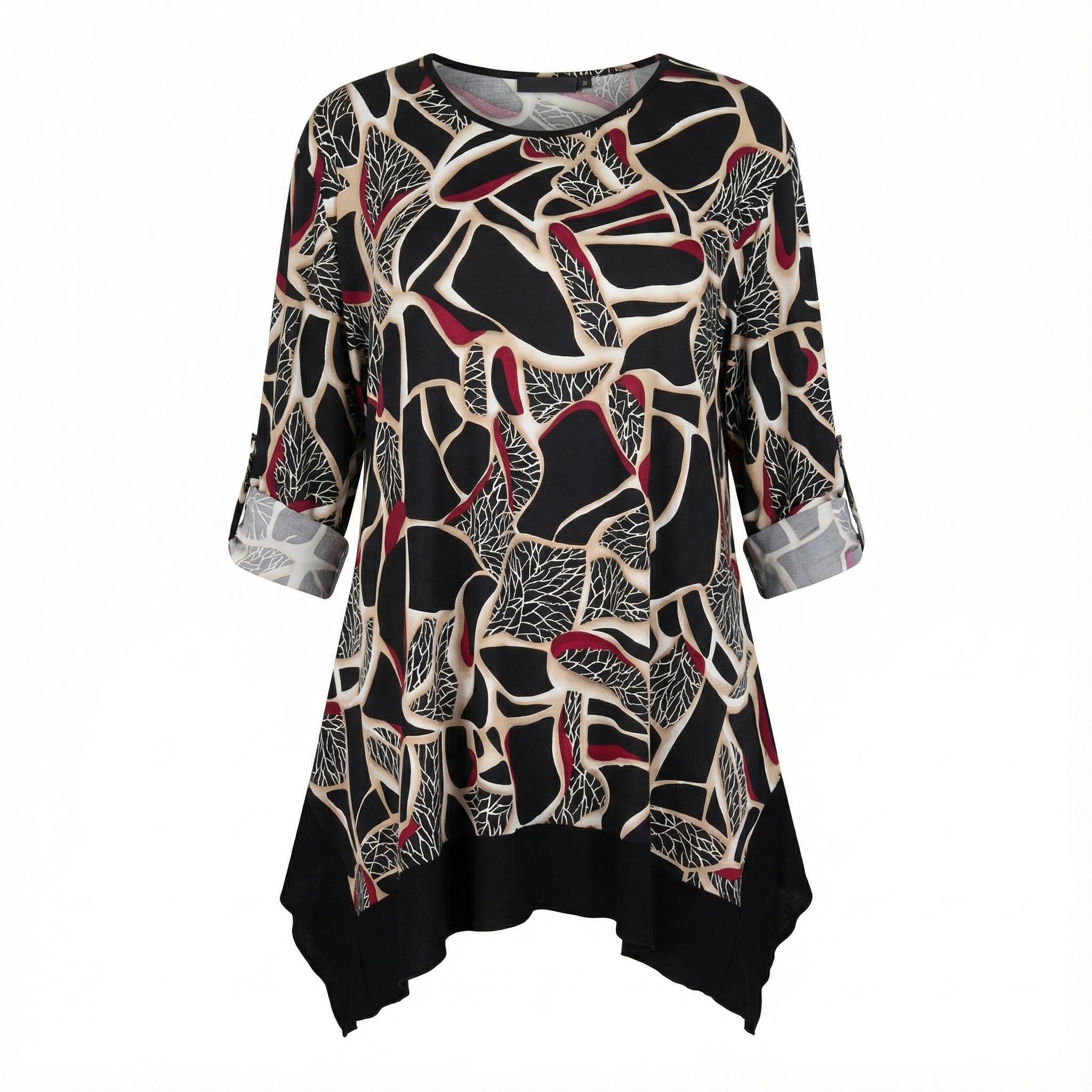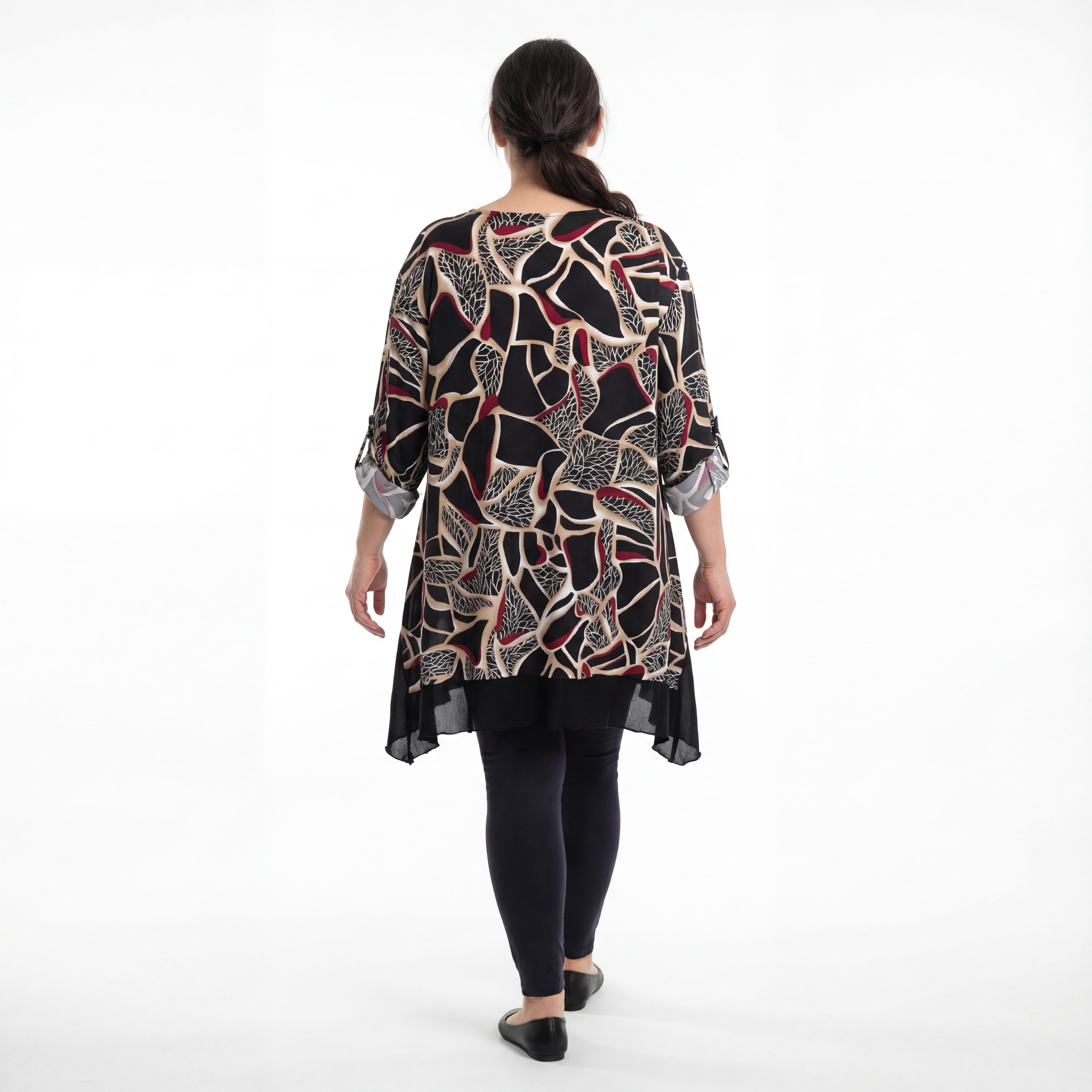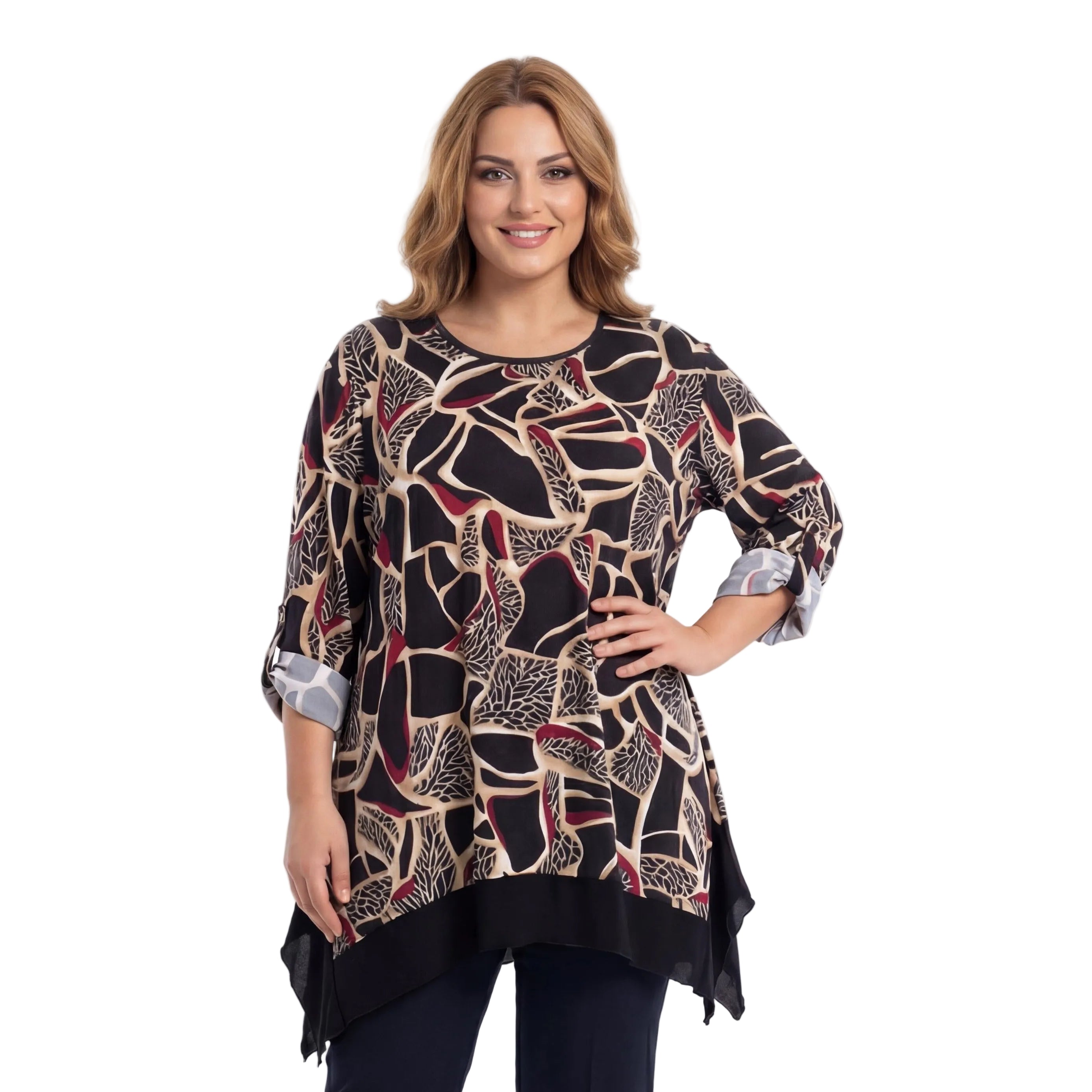 Акцентът на модела е ефектният асиметричен подгъв с издължени краища, който добавя динамика и модерно излъчване при ходене. Дългите ръкави разполагат с практично копче за навиване, позволяващо лесна промяна на визията. Независимо дали я съчетаете с официален панталон за специален повод или с удобен клин за елегантно ежедневие, тази туника е вашето решение за увереност и стил.