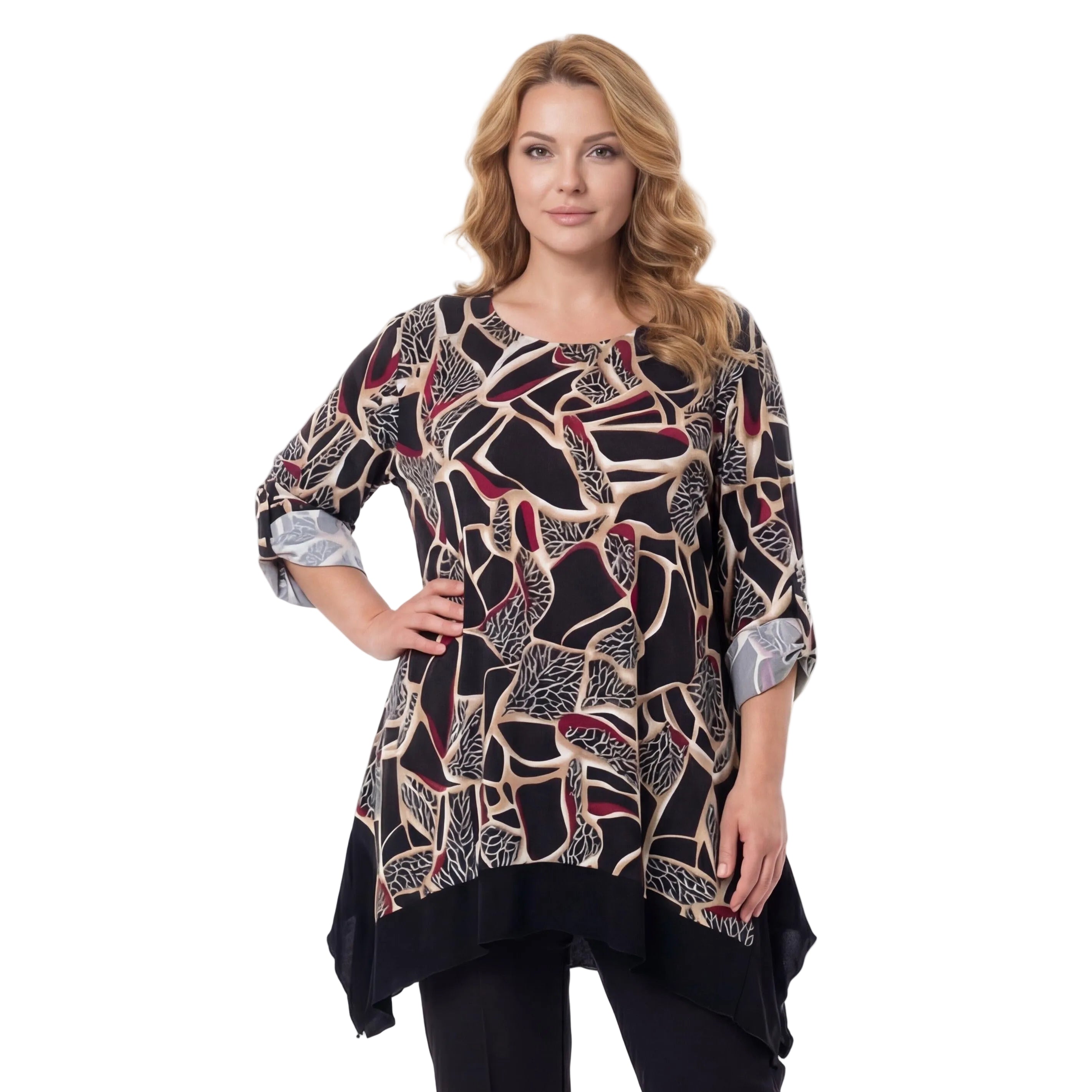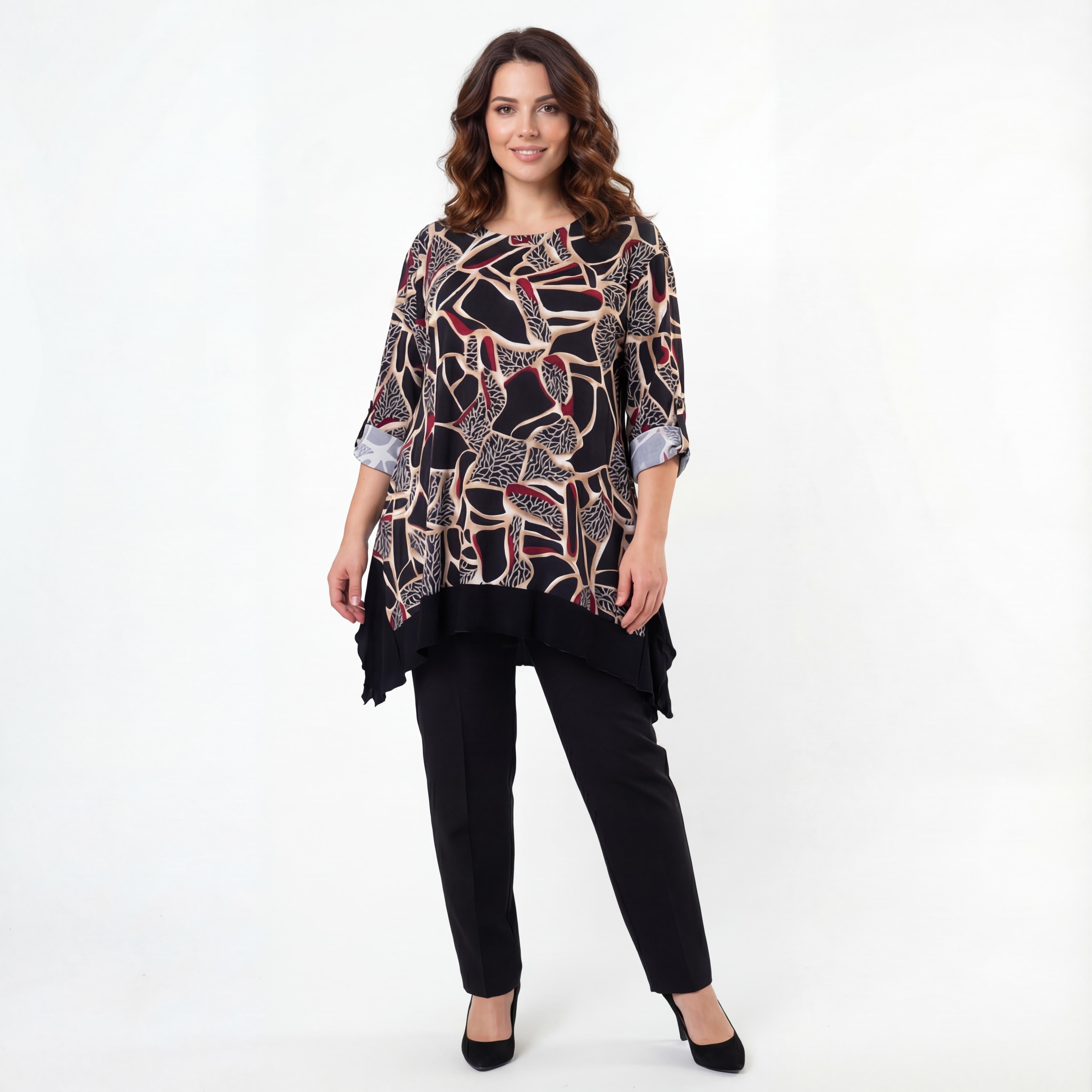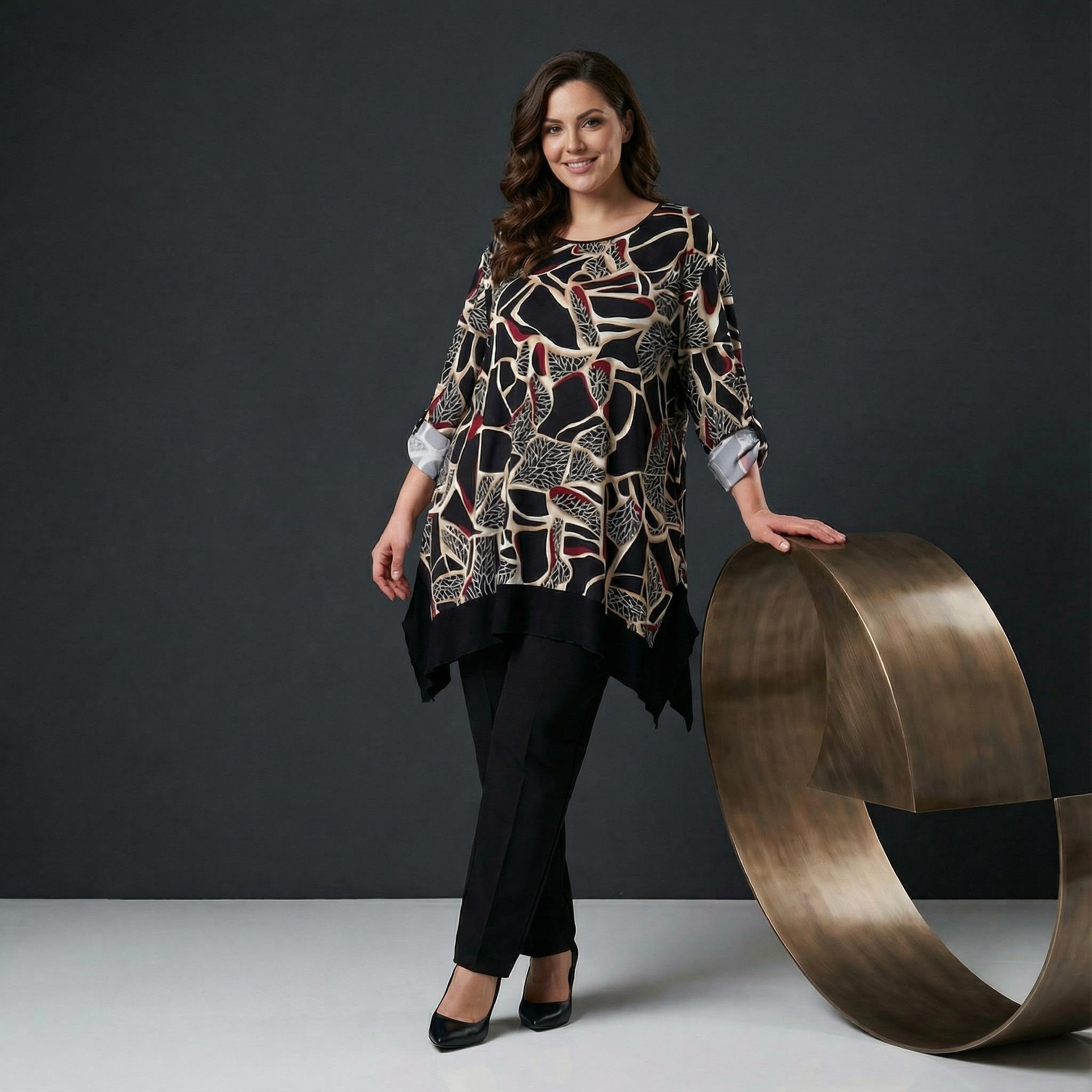 Открийте перфектния баланс между артистичен стил и безкомпромисен комфорт с нашата нова елегантна туника в големи размери. Създадена специално за дамата с извивки, тази дреха впечатлява с абстрактен вълнообразен десен, който придава дълбочина и характер на визията. Мекото вискозно трико гали кожата и пада тежко, оформяйки красив и женствеен силует, докато разкроената А-образна линия осигурява пълна свобода на движение.