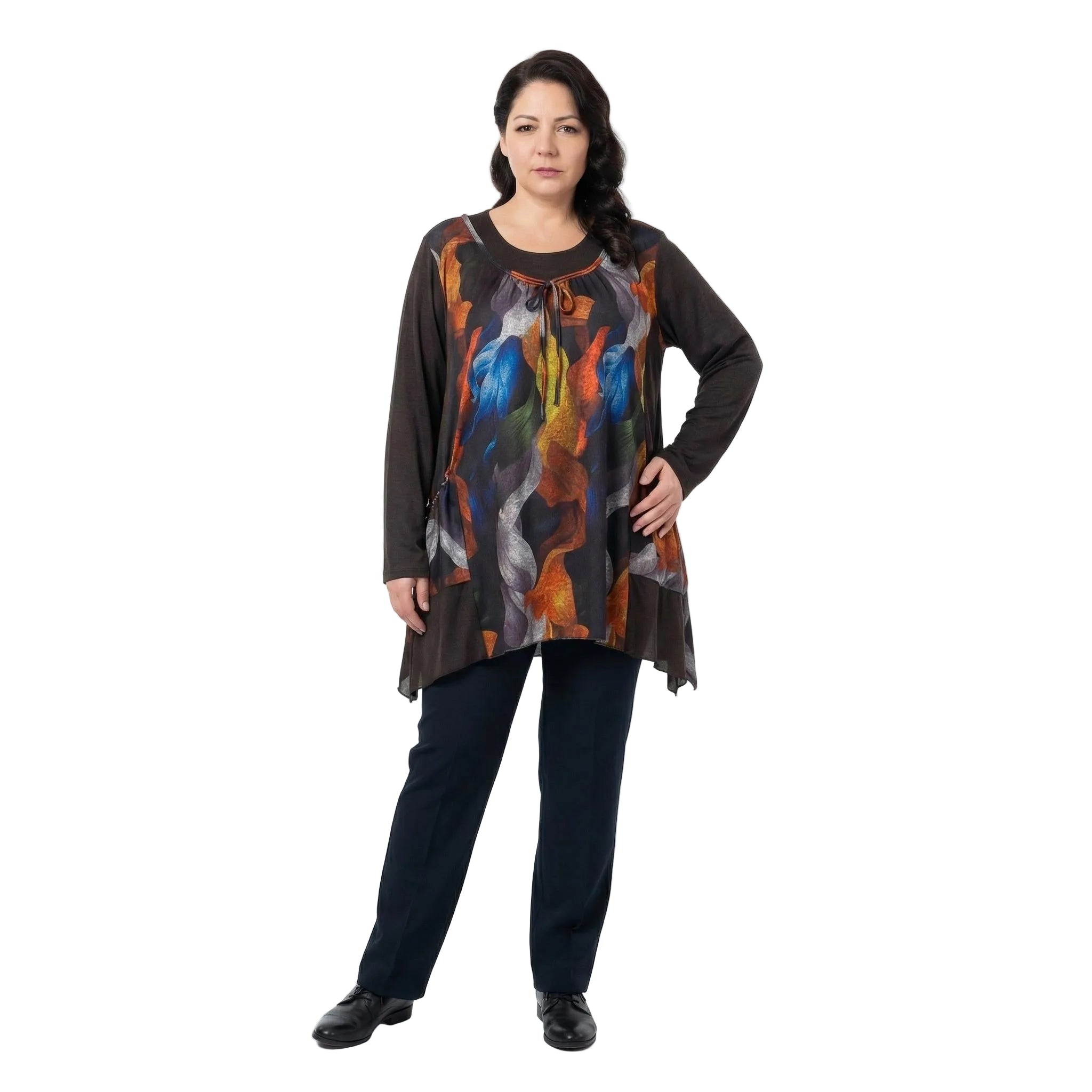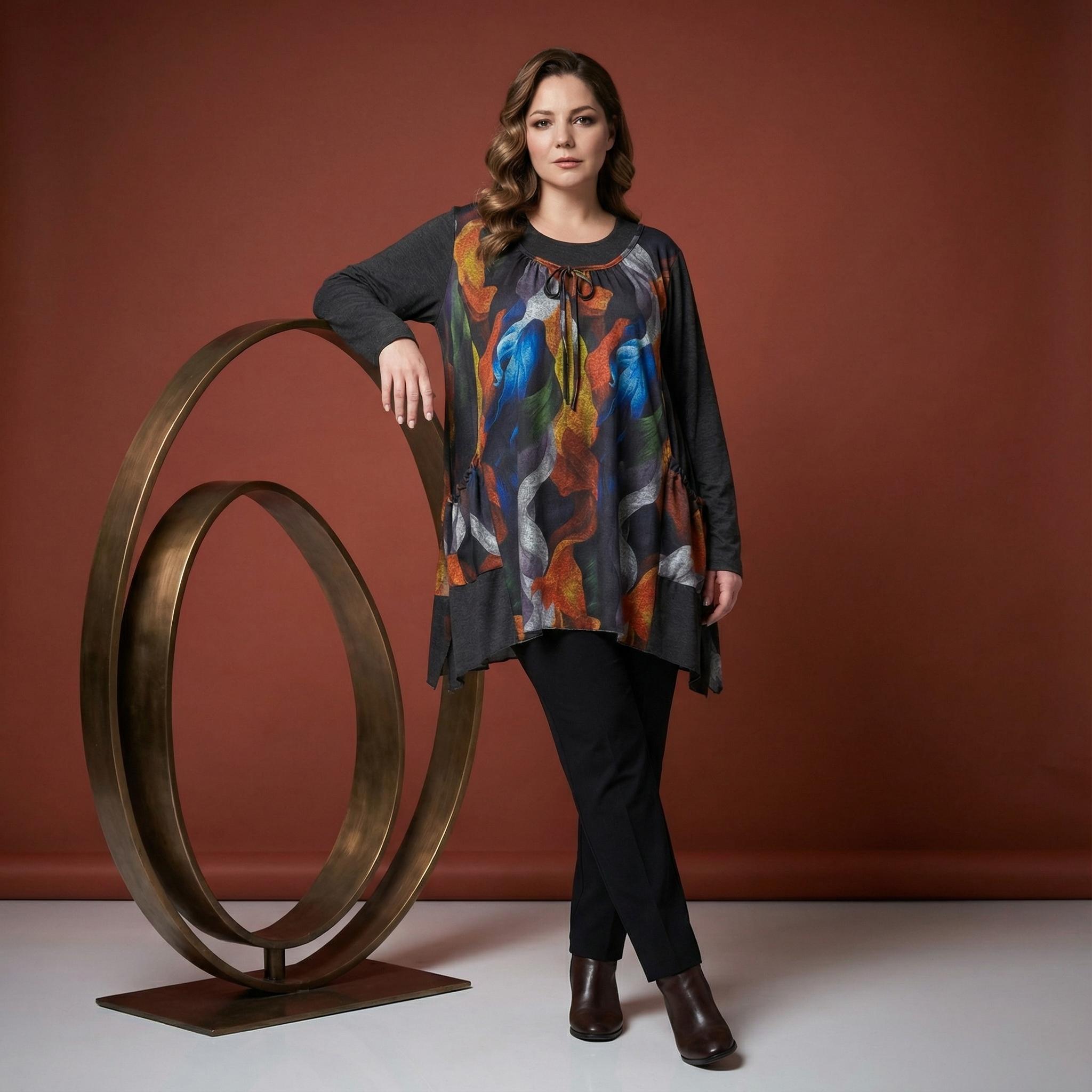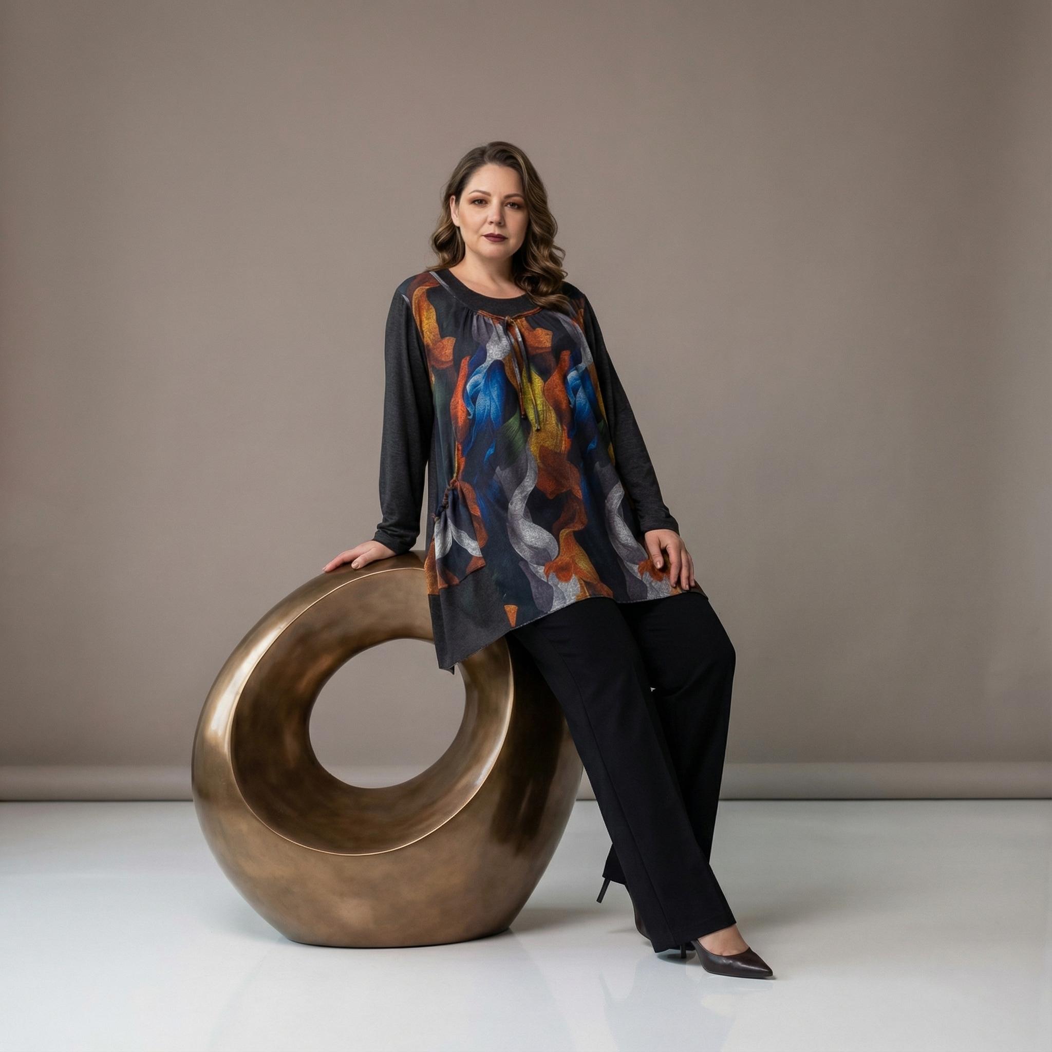 Открийте перфектния баланс между комфорт и стил с тази изящна туника, създадена да подчертава красотата на женствените извивки. Комбинацията от класическо черно и артистичен принт в абстрактни форми превръща модела в истинско вдъхновение за визията ви. Мекото трико от вискоза пада тежко и плавно, осигурявайки свобода на движението, докато асиметричният подгъв тип „кърпичка“ добавя динамика и визуално издължава силуета. Това е дрехата, с която ще се чувствате неотразима и спокойна – идеална както за динамичния делничен ден, така и за специална вечеря с приятели.