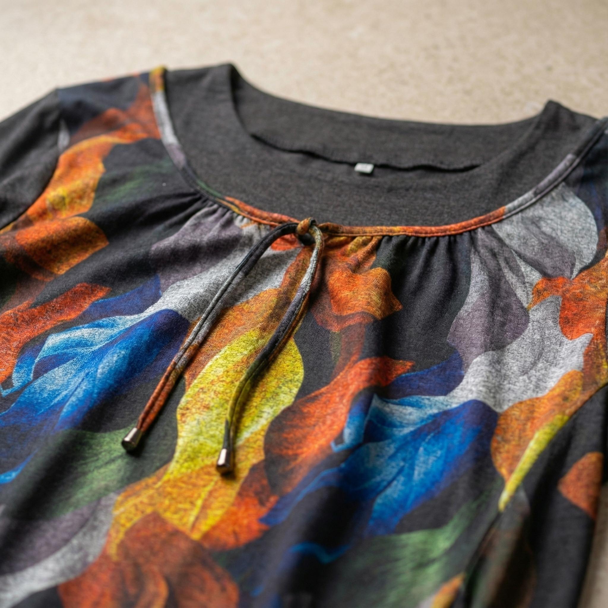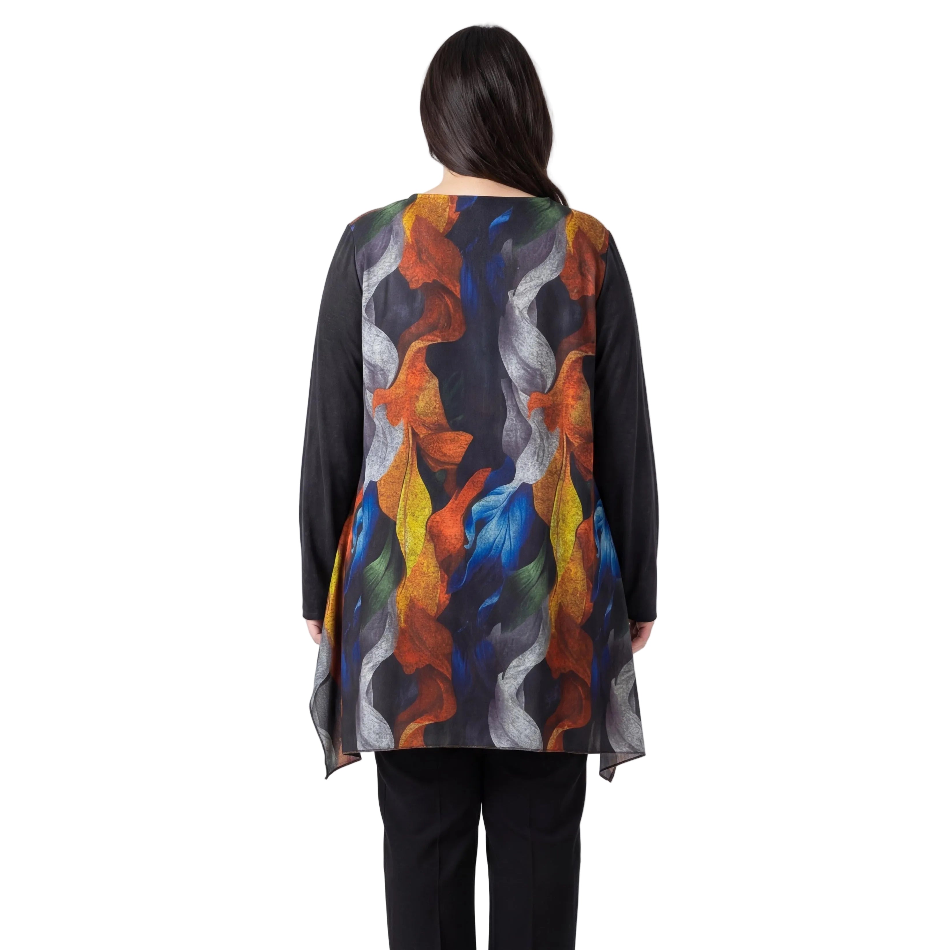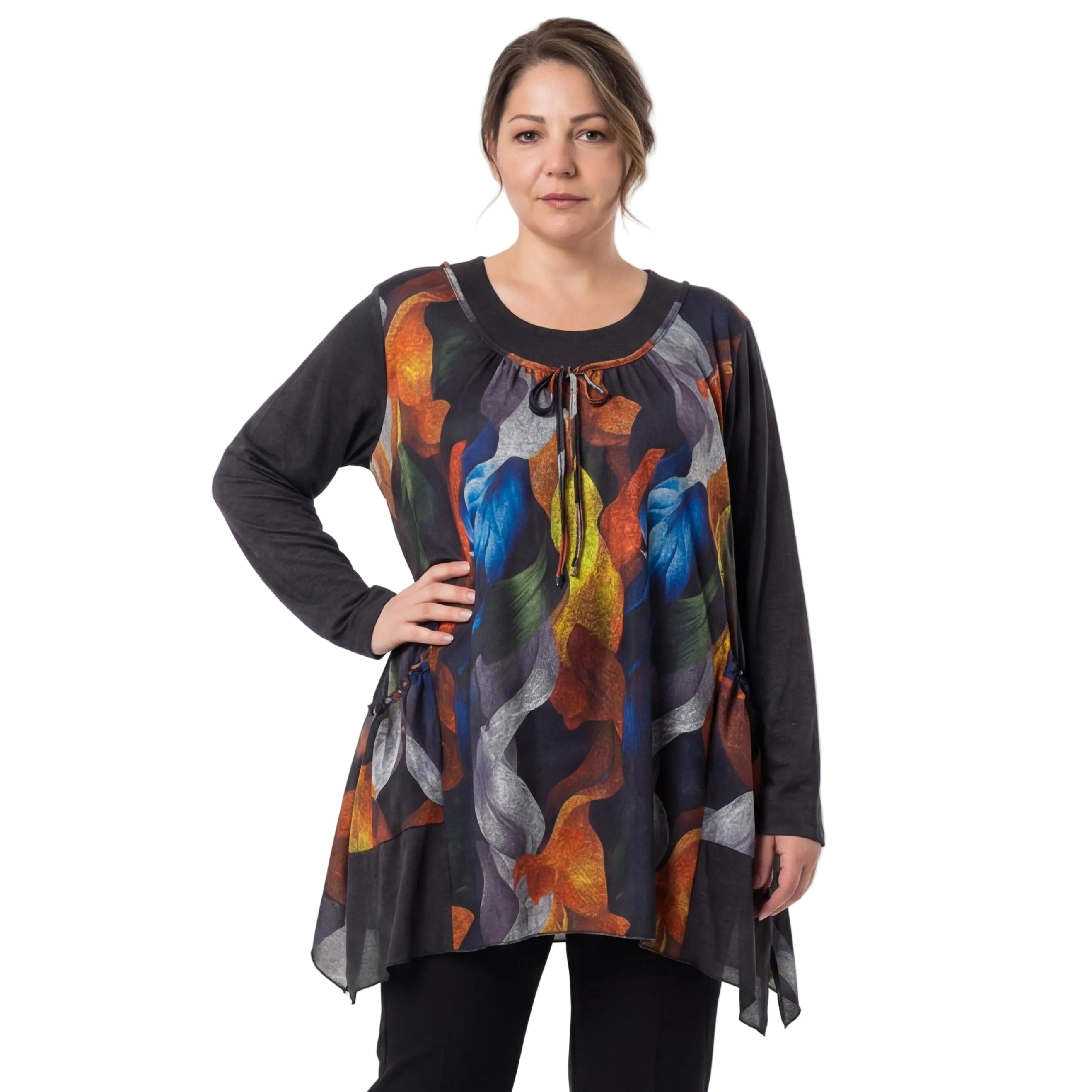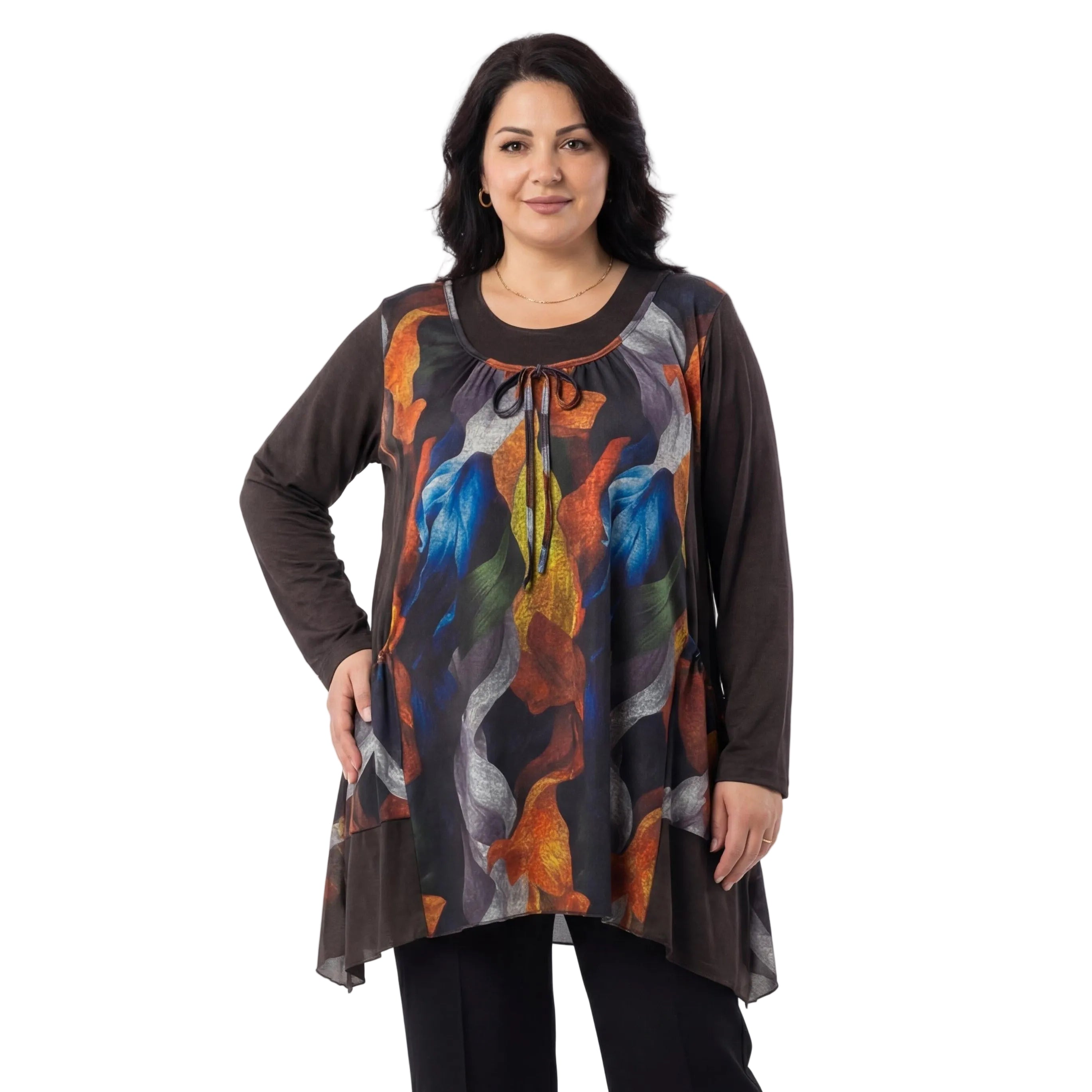 Открийте перфектния баланс между комфорт и стил с тази изящна туника, създадена да подчертава красотата на женствените извивки. Комбинацията от класическо черно и артистичен принт в абстрактни форми превръща модела в истинско вдъхновение за визията ви. Мекото трико от вискоза пада тежко и плавно, осигурявайки свобода на движението, докато асиметричният подгъв тип „кърпичка“ добавя динамика и визуално издължава силуета. Това е дрехата, с която ще се чувствате неотразима и спокойна – идеална както за динамичния делничен ден, така и за специална вечеря с приятели.