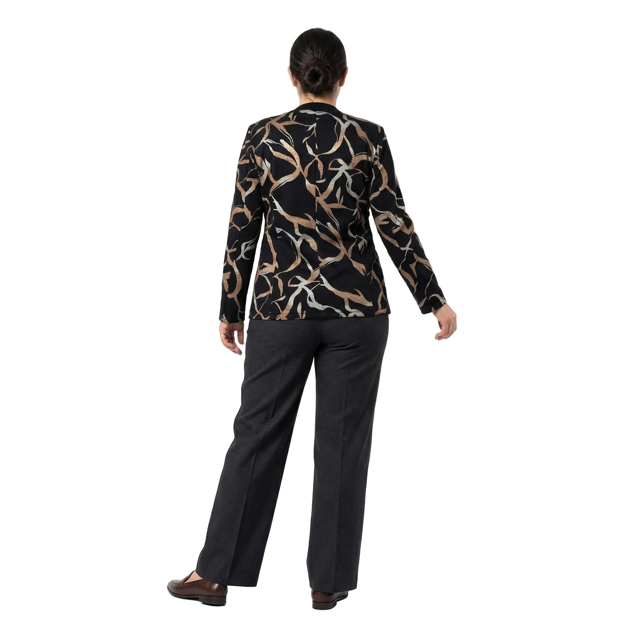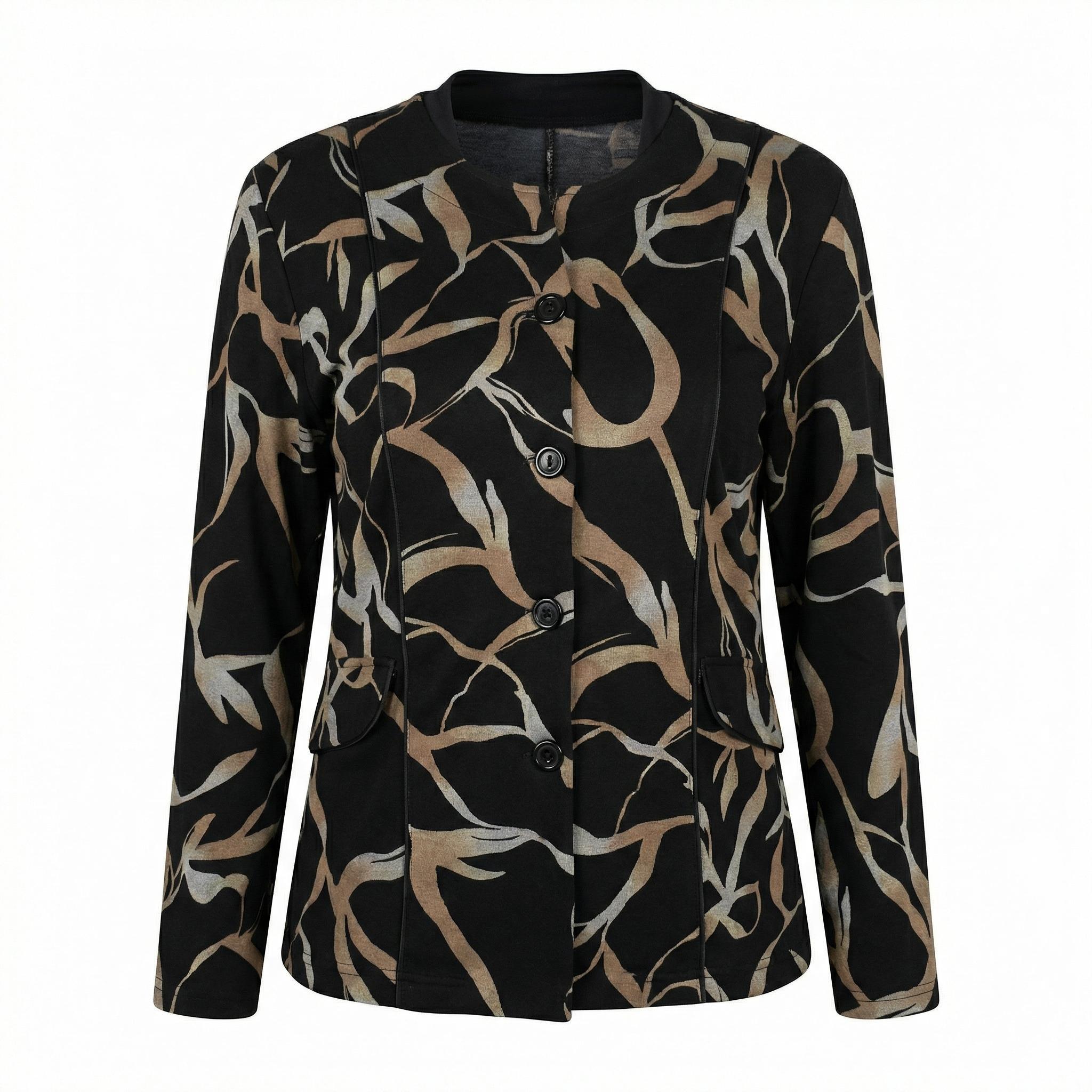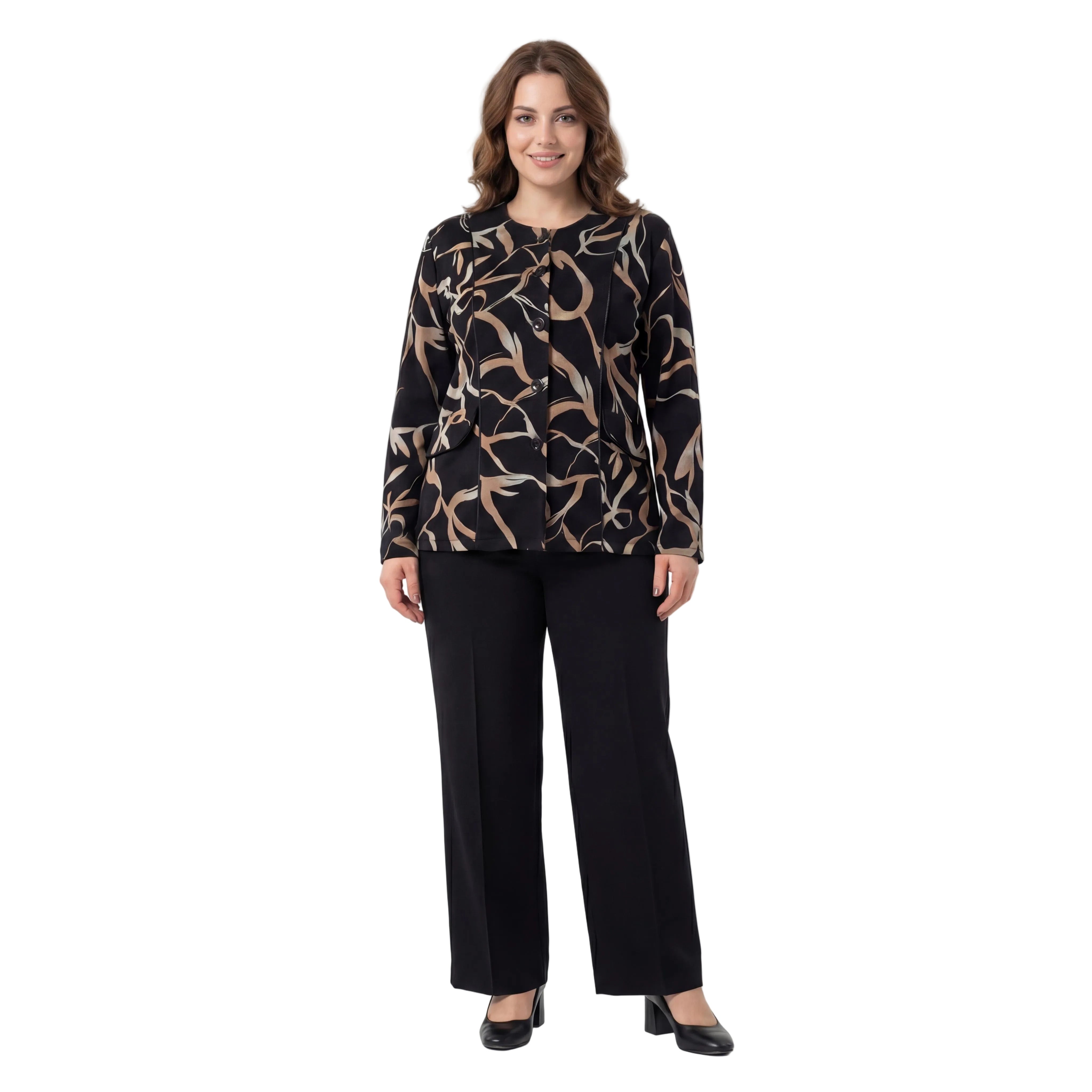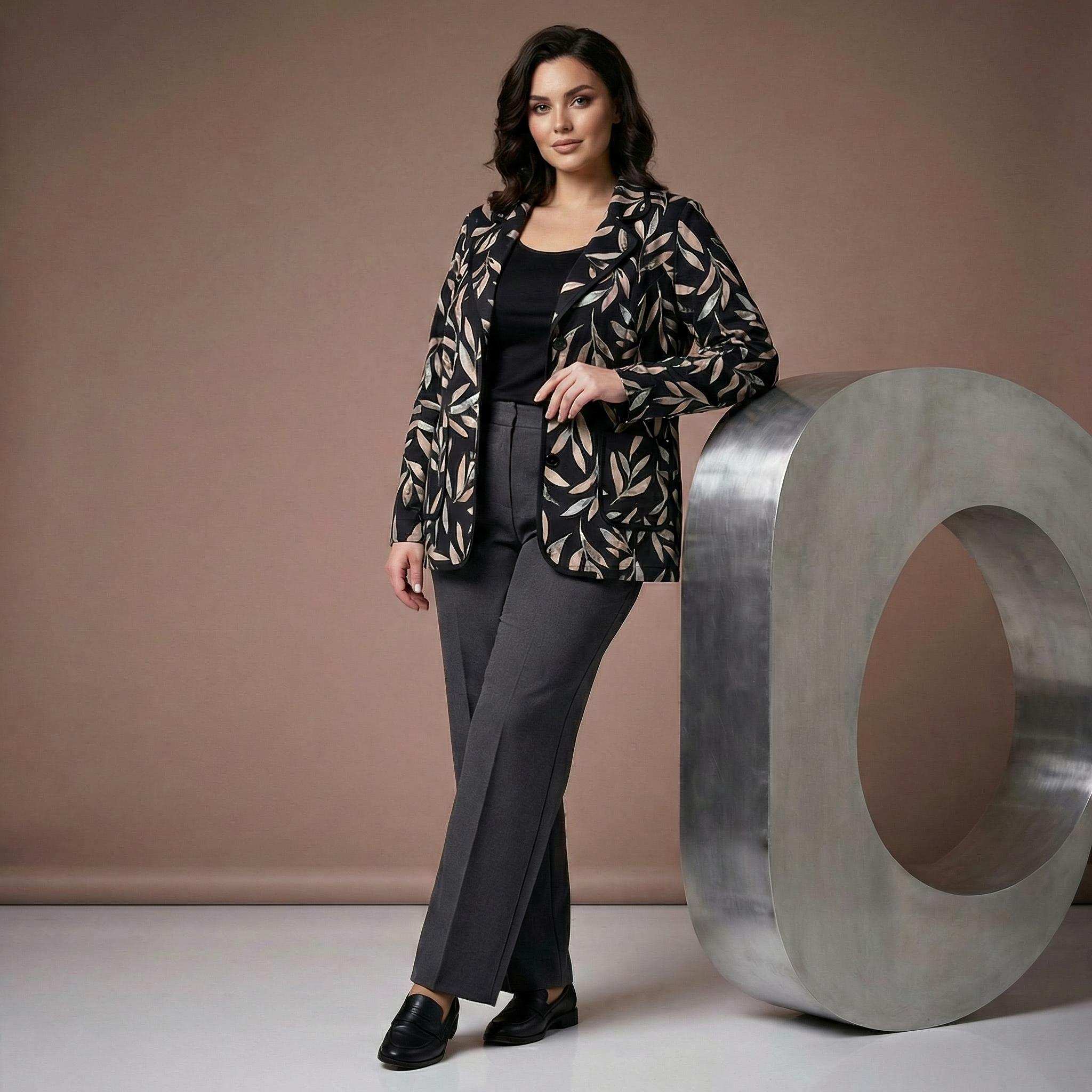 Открийте перфектния баланс между стил и комфорт с това елегантно макси сако, създадено специално за дами с извивки. Изработено от висококачествена материя с преобладаващо съдържание на вискоза, то гали кожата и осигурява усещане за мекота през целия ден. Моделът впечатлява с красив абстрактен десен върху класическа черна основа, който придава изтънченост и модерно излъчване на визията. Правата кройка и еластичността на материята гарантират свобода на движенията, докато липсата на подплата прави сакото леко и гъвкаво като жилетка, но със структурата на официална дреха. Декоративните джобове и стилните копчета завършват дизайна, превръщайки го в идеален избор както за деловия гардероб, така и за специални поводи през есенно-зимния сезон.