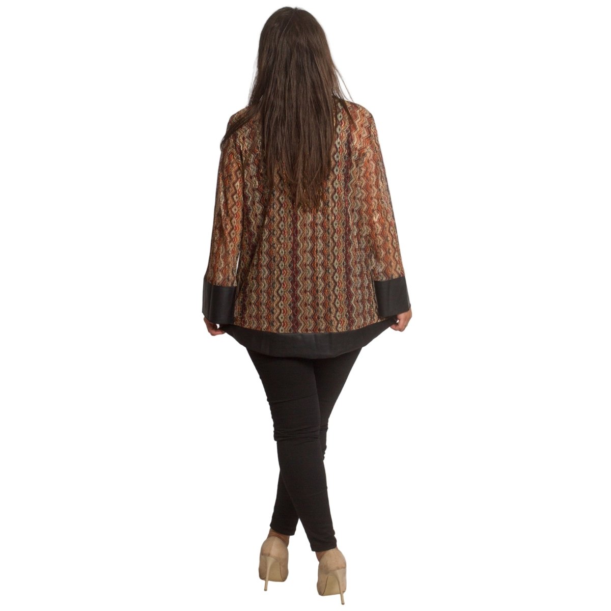 Radiază încredere și stil cu această tunică elegantă, special concepută pentru doamnele cu forme voluptuoase. Modelul combină șifonul vaporos cu un maiou cusut, care oferă confort și opacitate maxime. Croiul lejer și mânecile 3/4 adaugă feminitate și lejeritate, în timp ce imprimeul floral izbitor în roșu intens pe o bază neagră creează un aspect superb, potrivit pentru ocazii formale, sărbători și momente speciale.