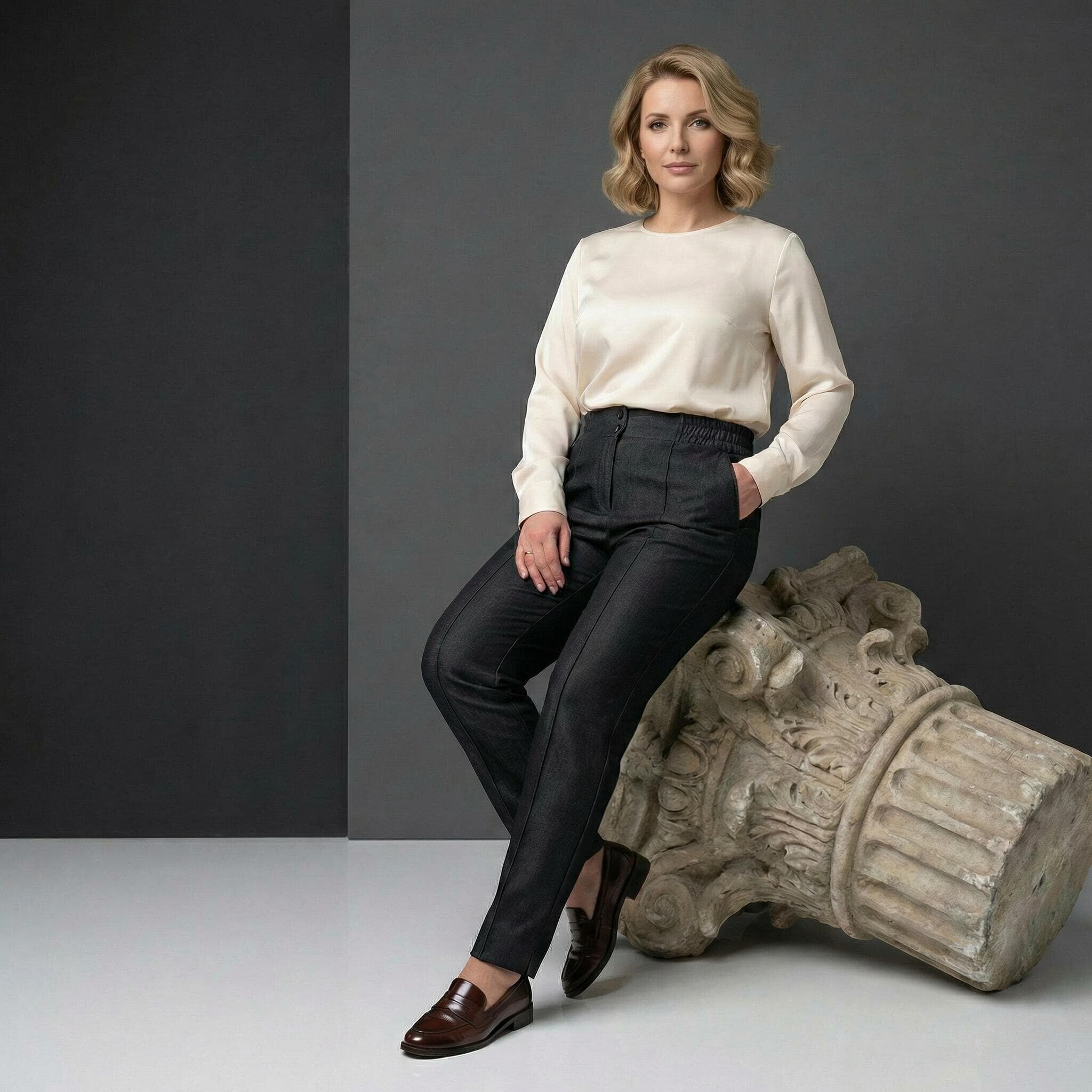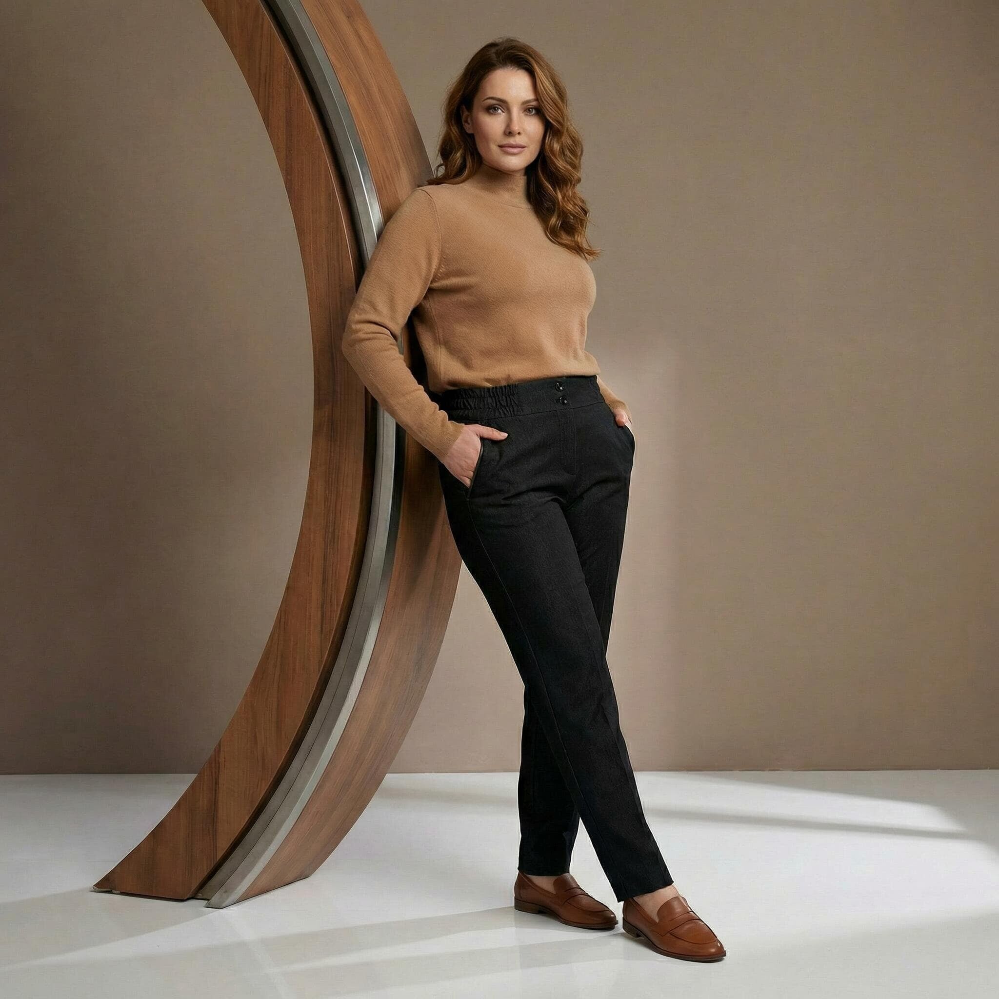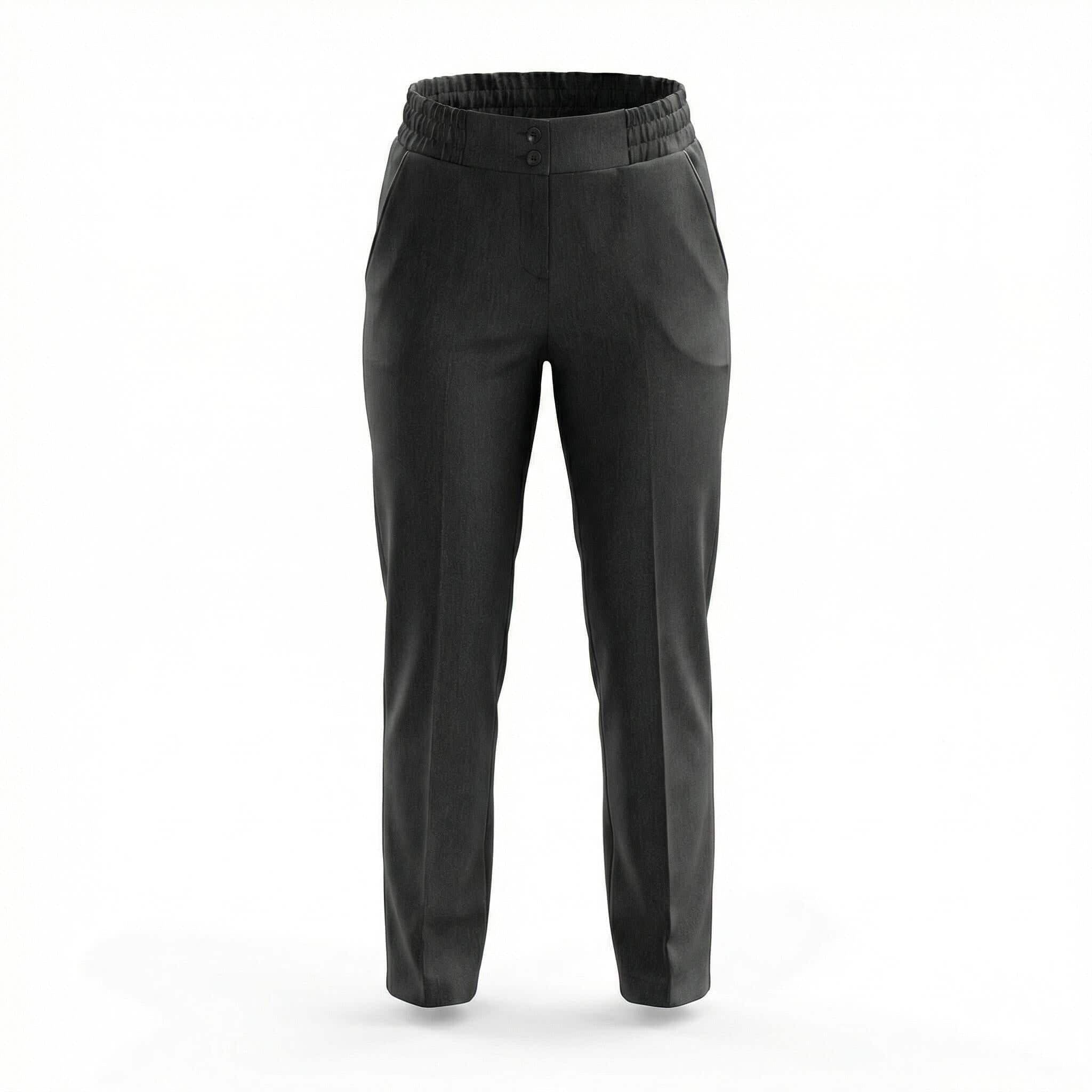 Pantaloni negri de damă, eleganți, cu croială dreaptă și talie elastică, mărimi mari