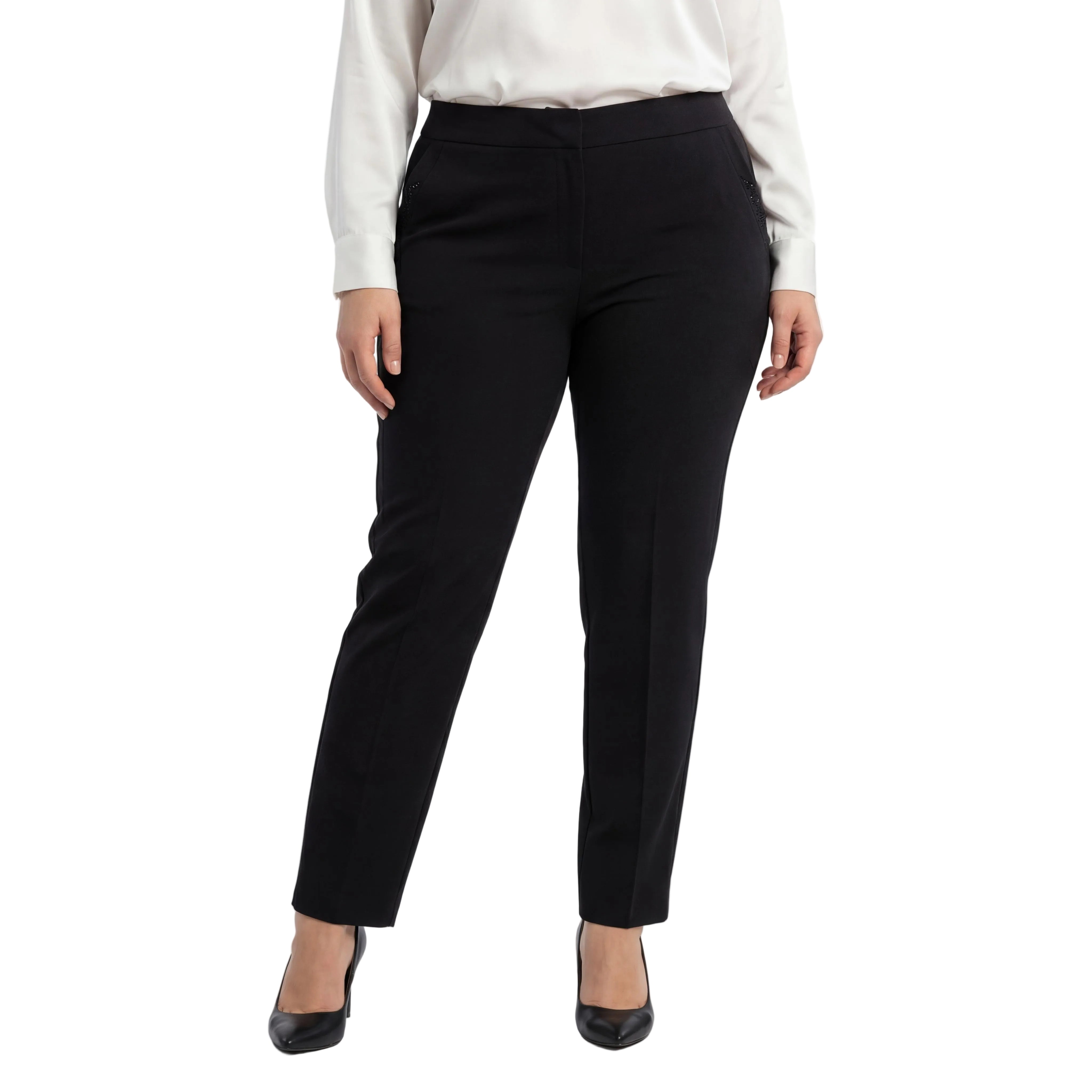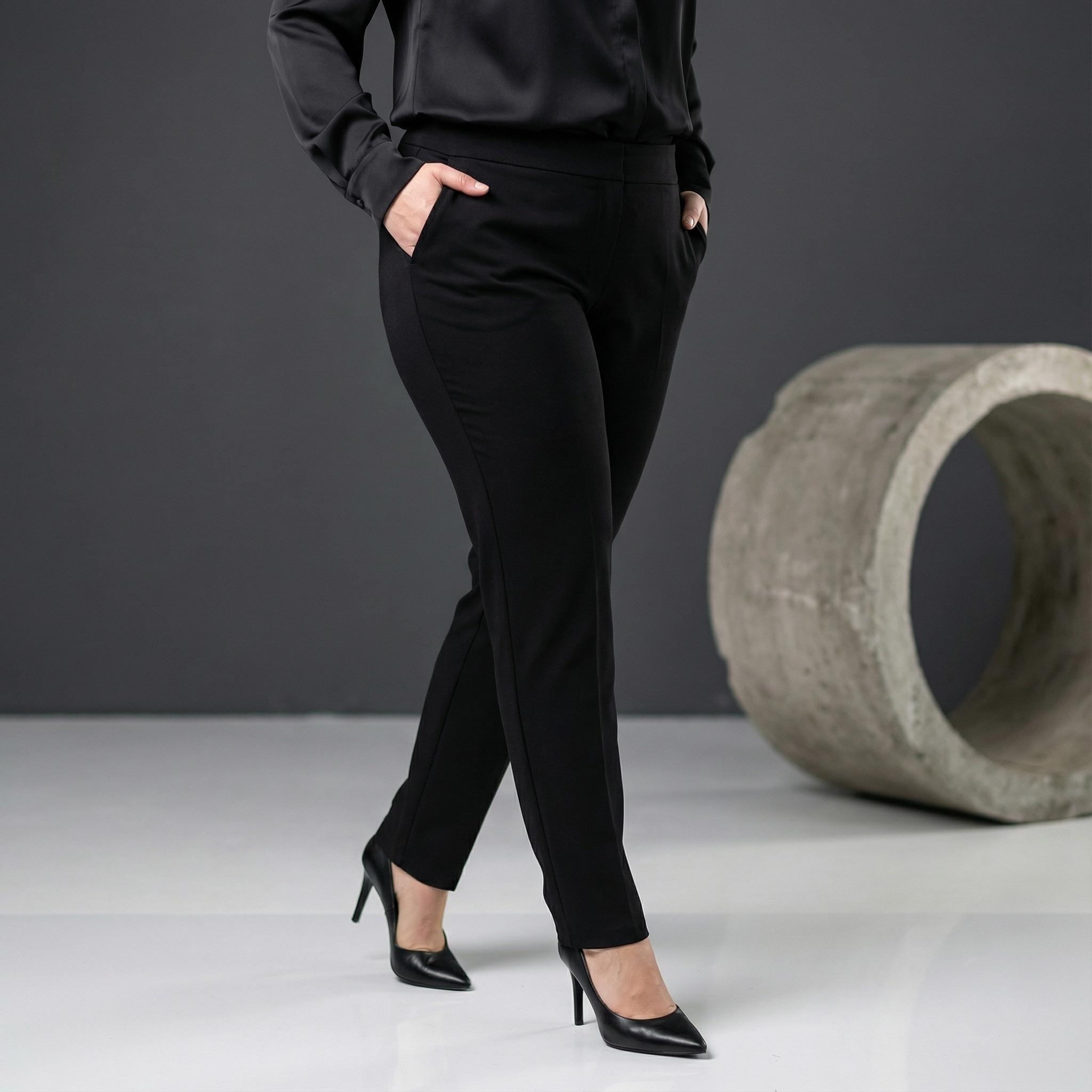 Представете си дреха, която съчетава безупречната елегантност на официалния стил с комфорта на любимото Ви домашно облекло. Този черен панталон в големи размери е създаден точно с тази мисъл – да бъде незаменима основа на Вашия гардероб, върху която да изразите личния си стил. Изработен от висококачествена, дишаща вискоза с еластан, той пада тежко и гладко, създавайки елегантен силует, а дискретният кант от тъмни камъни добавя щипка лукс, подходящ както за офиса, така и за вечерно събитие. Кройката е проектирана специално за дами с извивки – без ципове и копчета, само с удобна еластична талия, която Ви позволява да се движите свободно и уверено през целия ден.