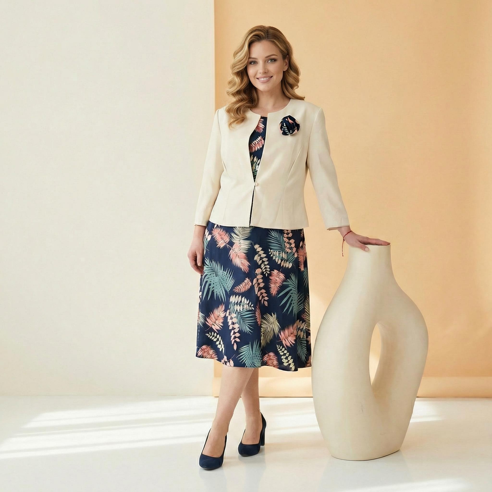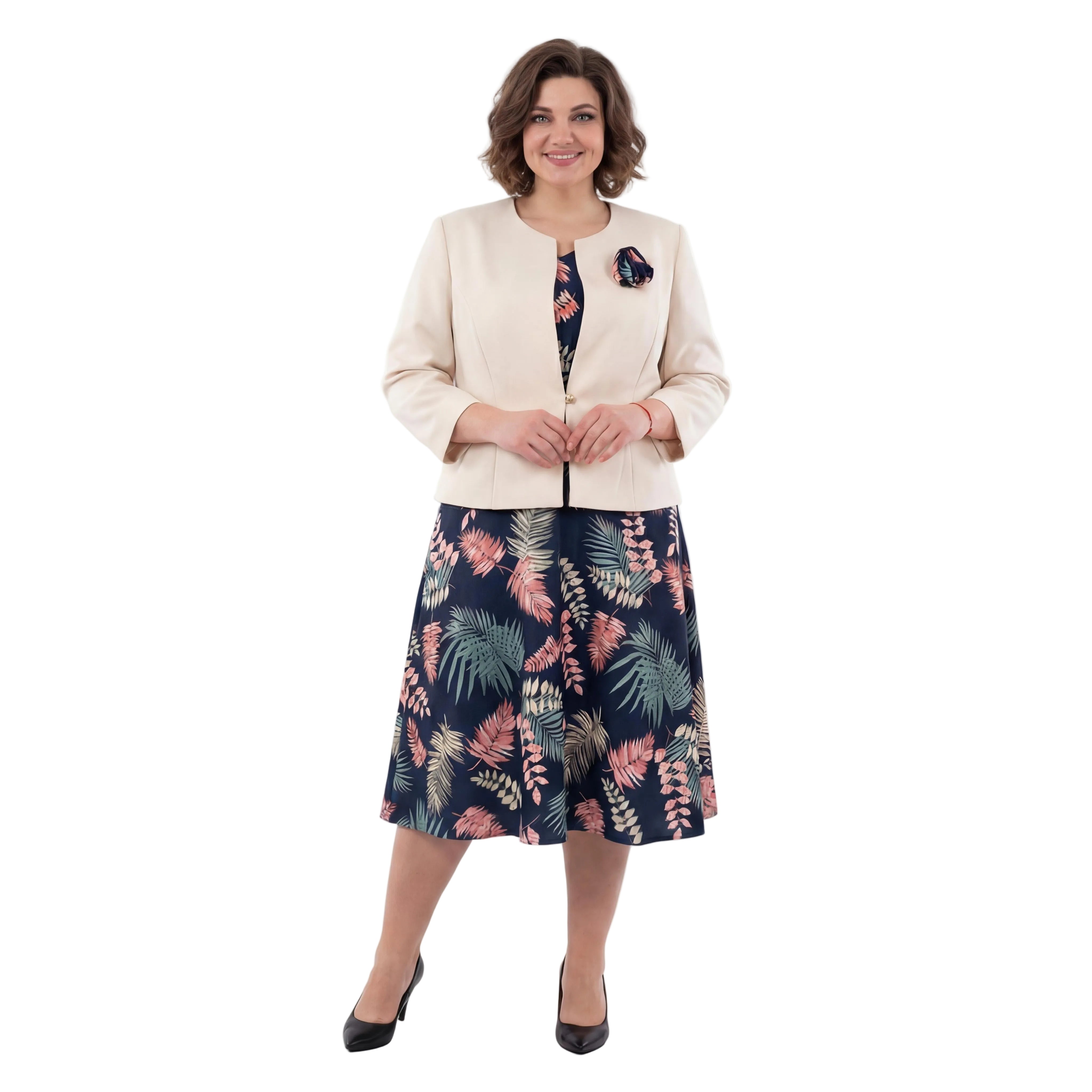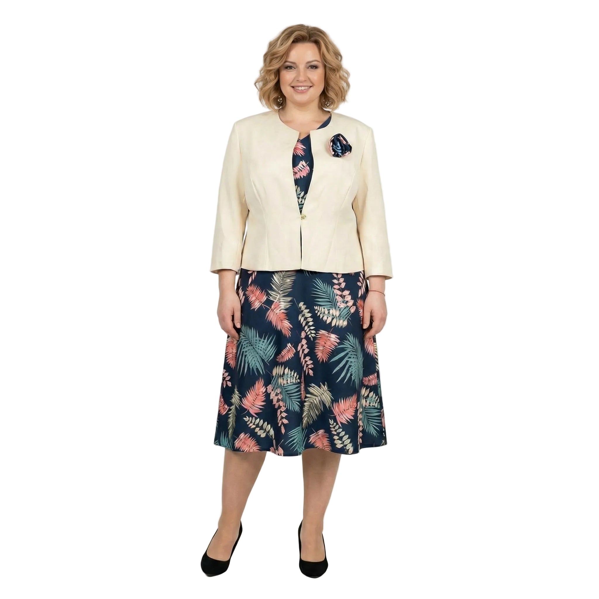 Открийте перфектния баланс между изисканост и комфорт с този официален дамски костюм, специално създаден за дами с елегантни извивки. Комплектът се състои от две части – стилна рокля с права кройка и флорални мотиви, която нежно описва силуета без да пристяга, и класическо бежово сако, което придава завършеност на визията. Изработен от висококачествена вискоза с еластан, материята е мека, дишаща и приятна на допир, осигурявайки увереност през целия ден. Сакото се закопчава с едно копче и е украсено с деликатен елемент от роза, добавяйки романтичен акцент. Този модел е идеалният избор за сватба, кръщене или друг специален повод през пролетно-летния сезон.