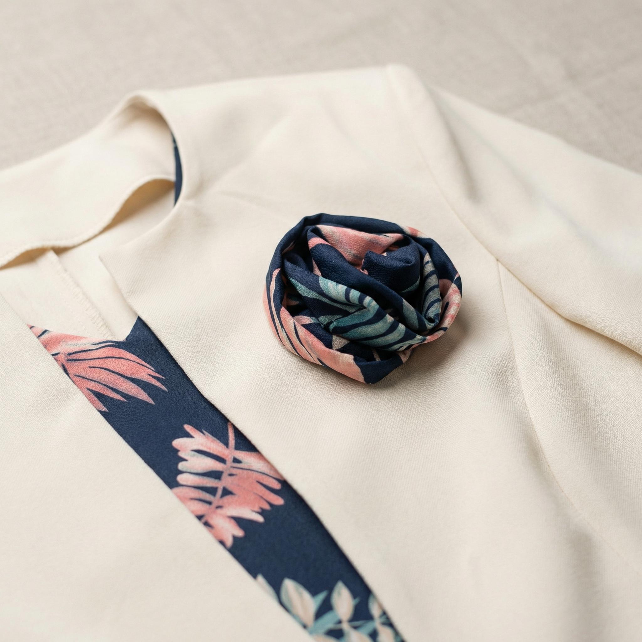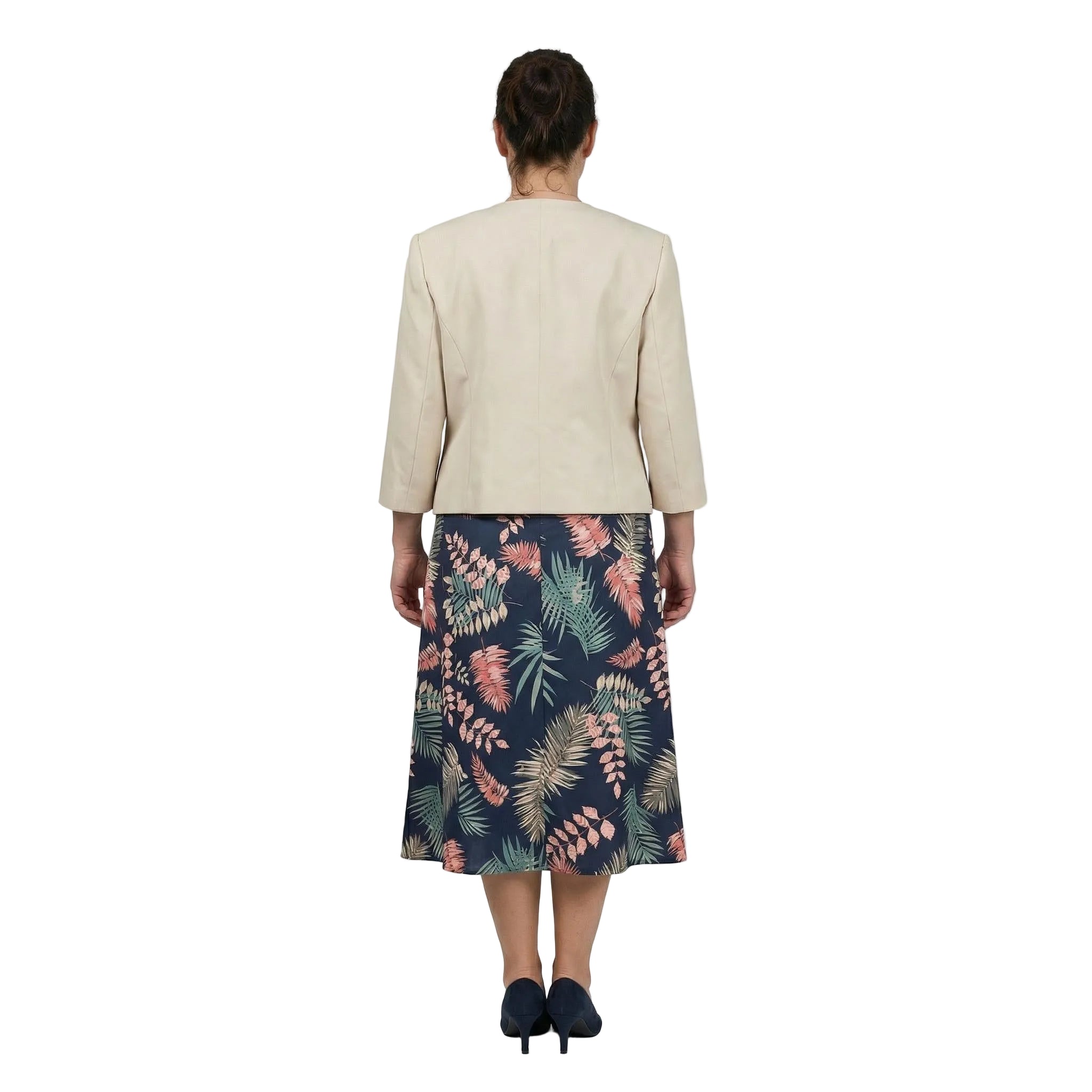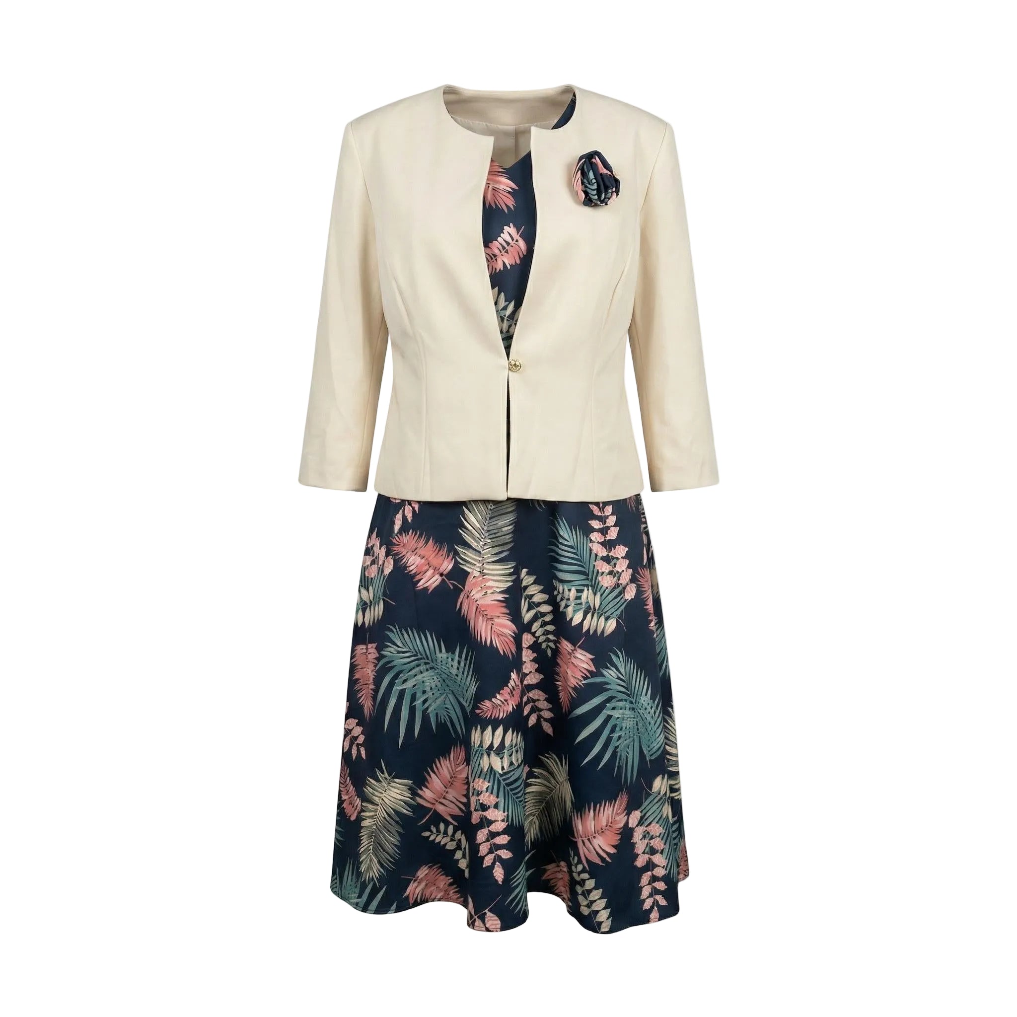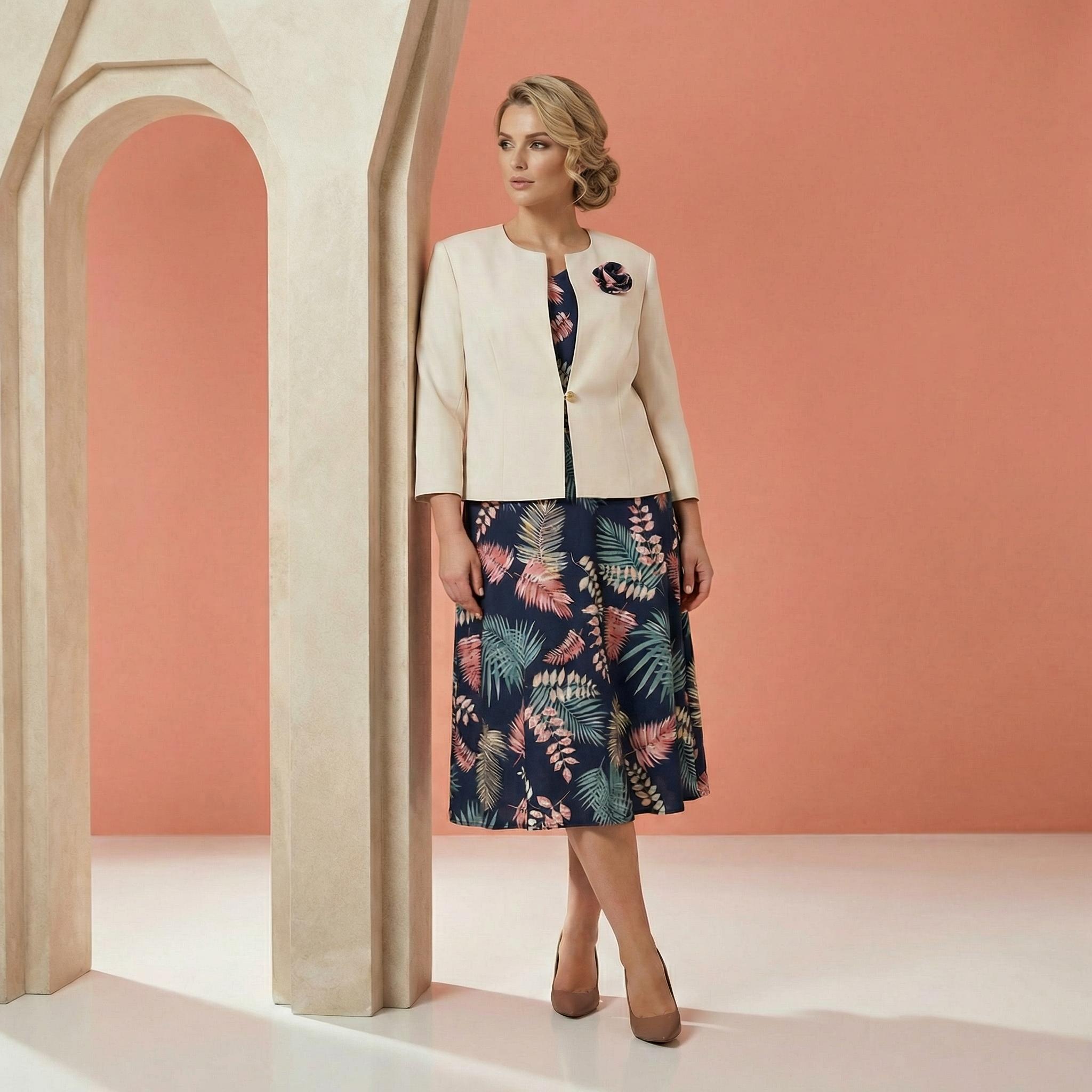 Открийте перфектния баланс между изисканост и комфорт с този официален дамски костюм, специално създаден за дами с елегантни извивки. Комплектът се състои от две части – стилна рокля с права кройка и флорални мотиви, която нежно описва силуета без да пристяга, и класическо бежово сако, което придава завършеност на визията. Изработен от висококачествена вискоза с еластан, материята е мека, дишаща и приятна на допир, осигурявайки увереност през целия ден. Сакото се закопчава с едно копче и е украсено с деликатен елемент от роза, добавяйки романтичен акцент. Този модел е идеалният избор за сватба, кръщене или друг специален повод през пролетно-летния сезон.