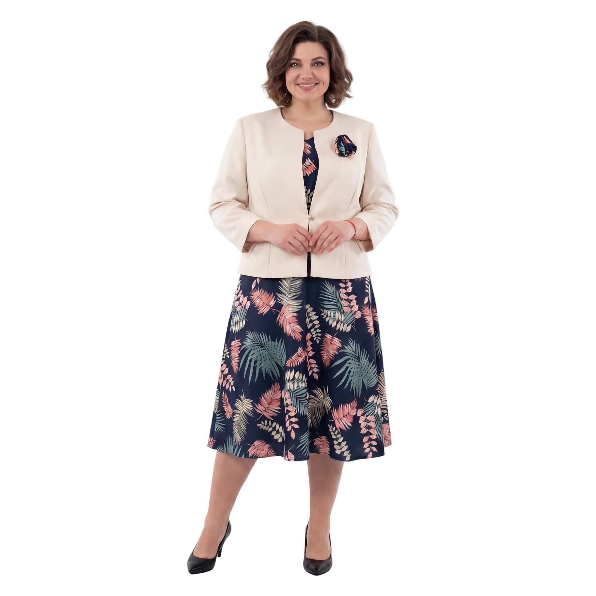 Descoperiți echilibrul perfect între rafinament și confort cu acest costum formal de damă, special conceput pentru doamnele cu forme elegante. Setul este format din două piese – o rochie stilată, croială dreaptă, cu motive florale, care subliniază delicat silueta fără a strânge, și un sacou clasic bej, care completează perfect ținuta. Realizat din vâscoză de înaltă calitate cu elastan, materialul este moale, respirabil și plăcut la atingere, asigurând încredere pe tot parcursul zilei. Sacoul se încheie cu un nasture și este decorat cu un element delicat în formă de trandafir, adăugând un accent romantic. Acest model este alegerea ideală pentru o nuntă, un botez sau orice altă ocazie specială din sezonul primăvară-vară.