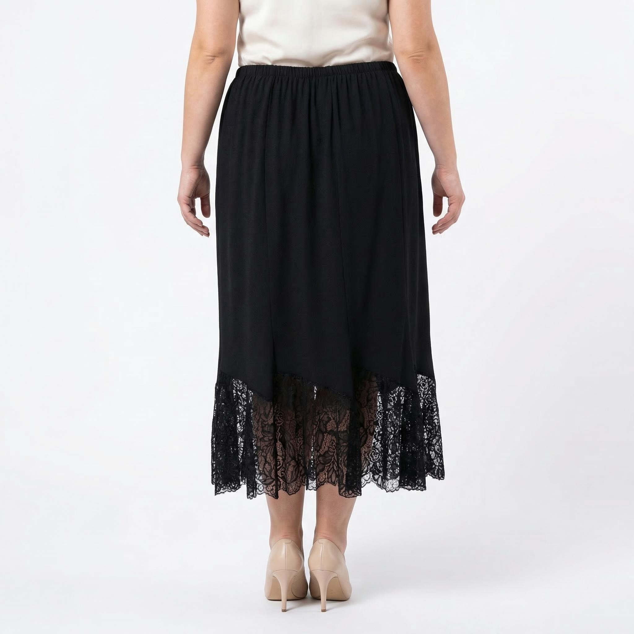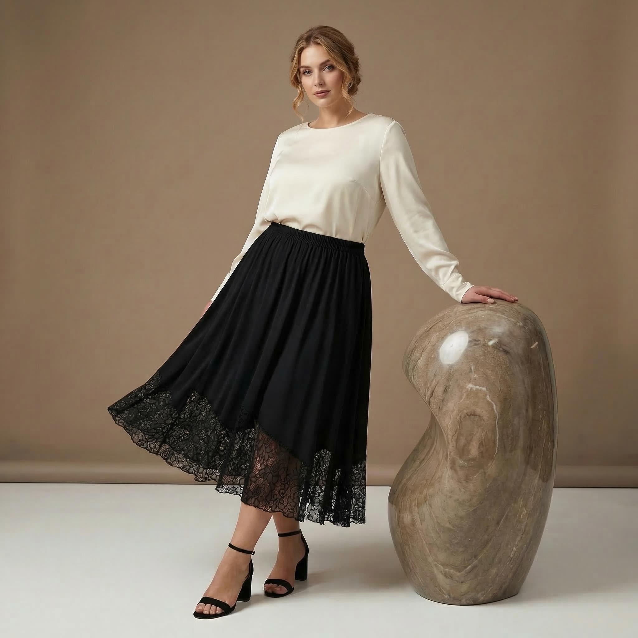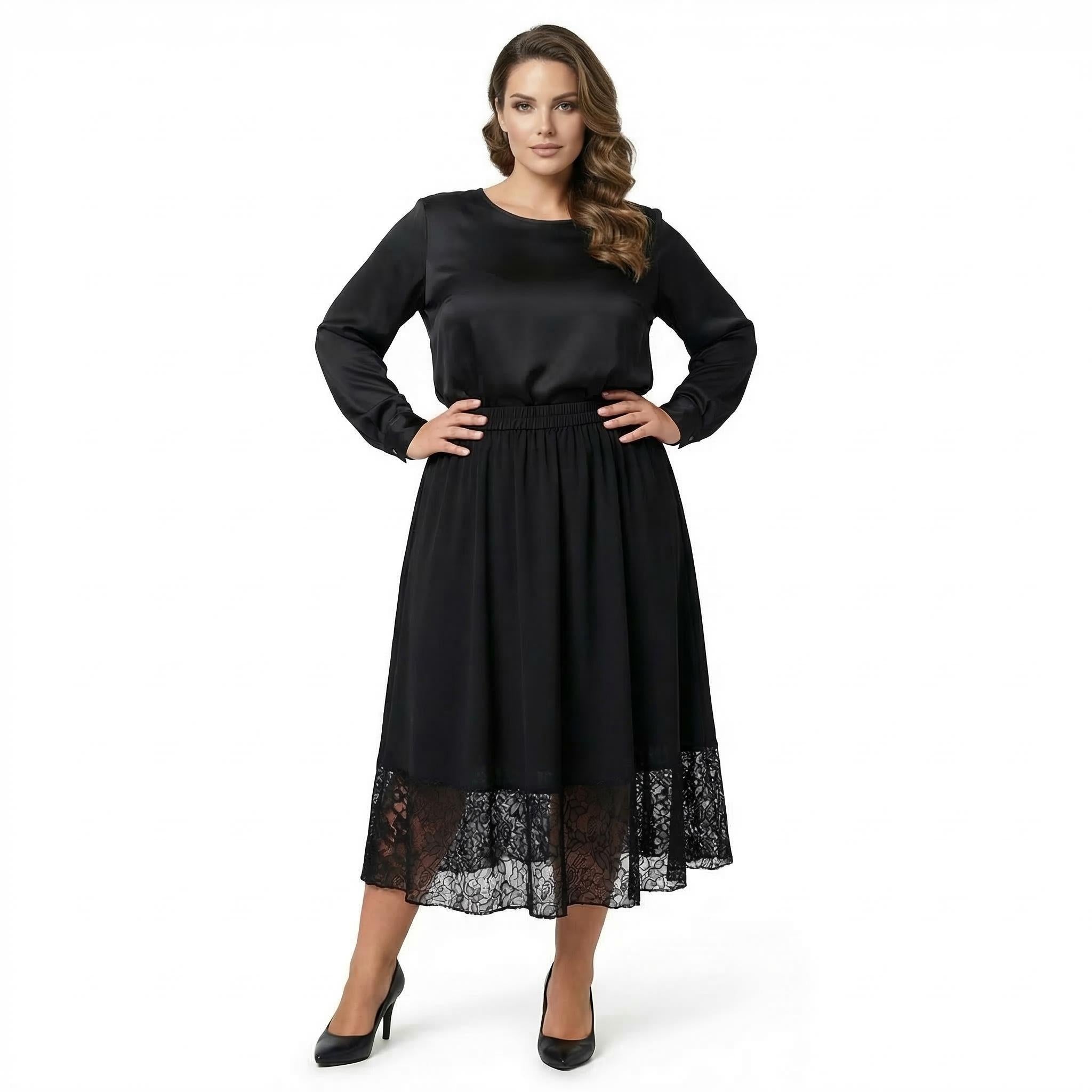 Открийте перфектния баланс между стил и комфорт с тази елегантна черна макси пола с дантела, създадена специално за дами с извивки. Изработена от мека, падаща тежко материя, тя се спуска плавно в женствен разкроен силует, който подчертава грацията на всяко движение. Дизайнът се отличава с удобен изцяло набран ластичен колан в талията, който осигурява безупречно прилягане и свобода през целия ден.
