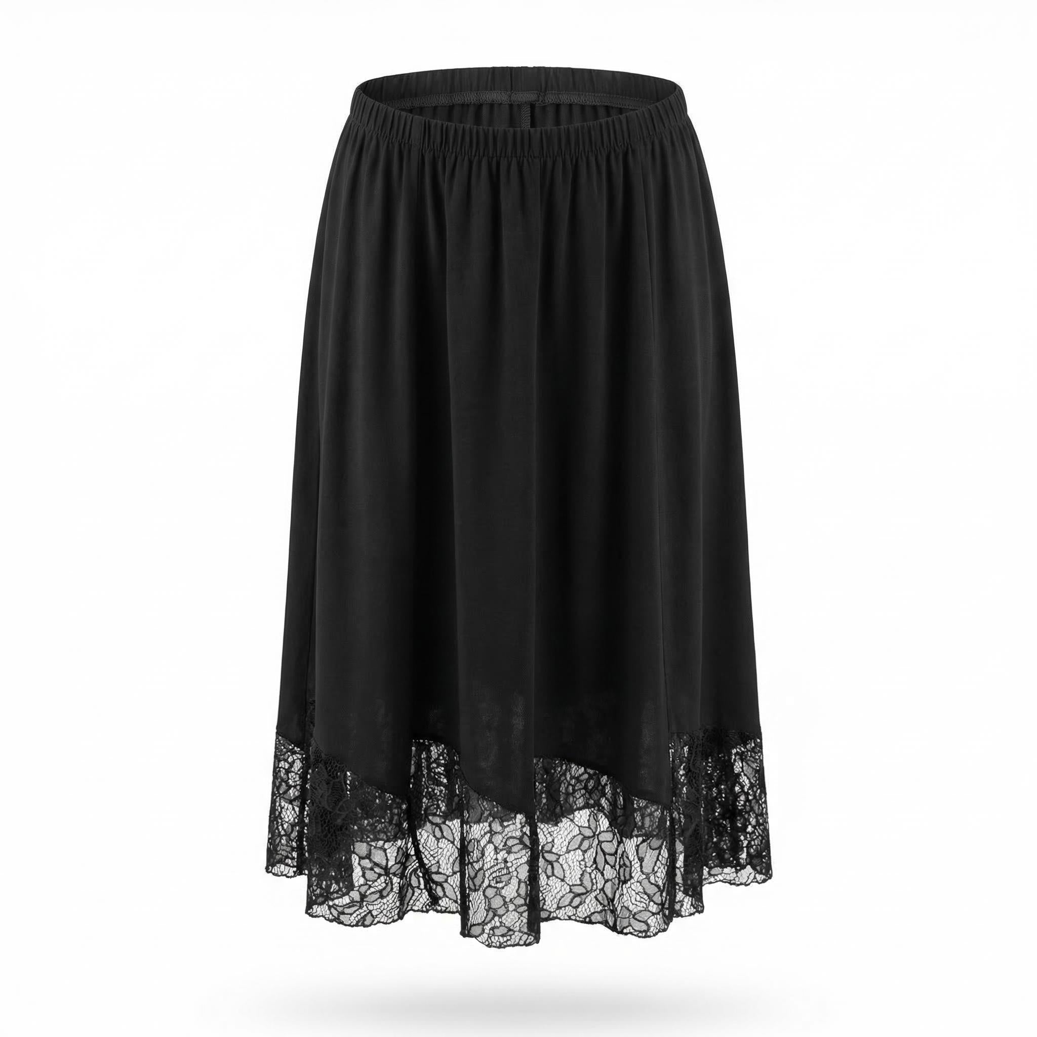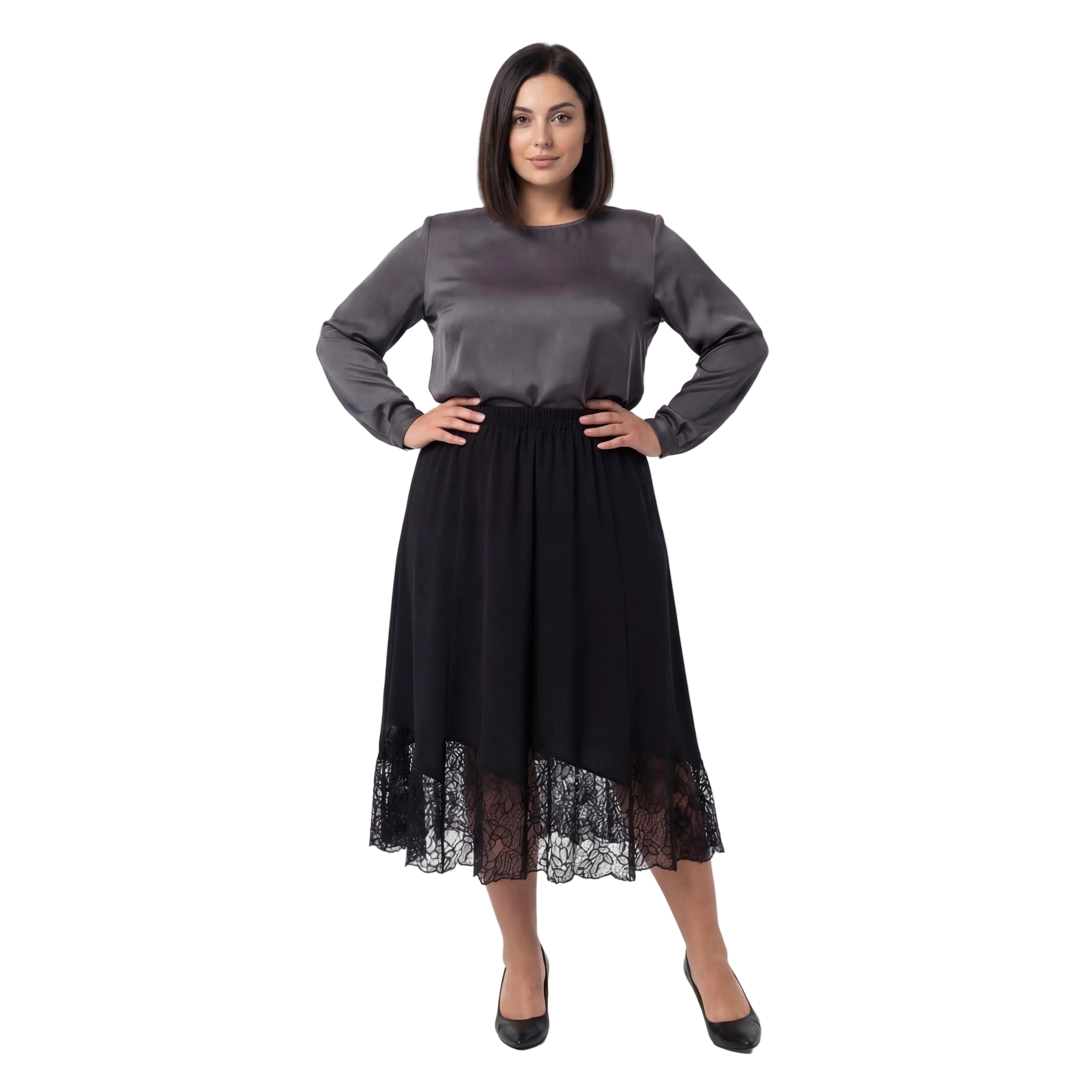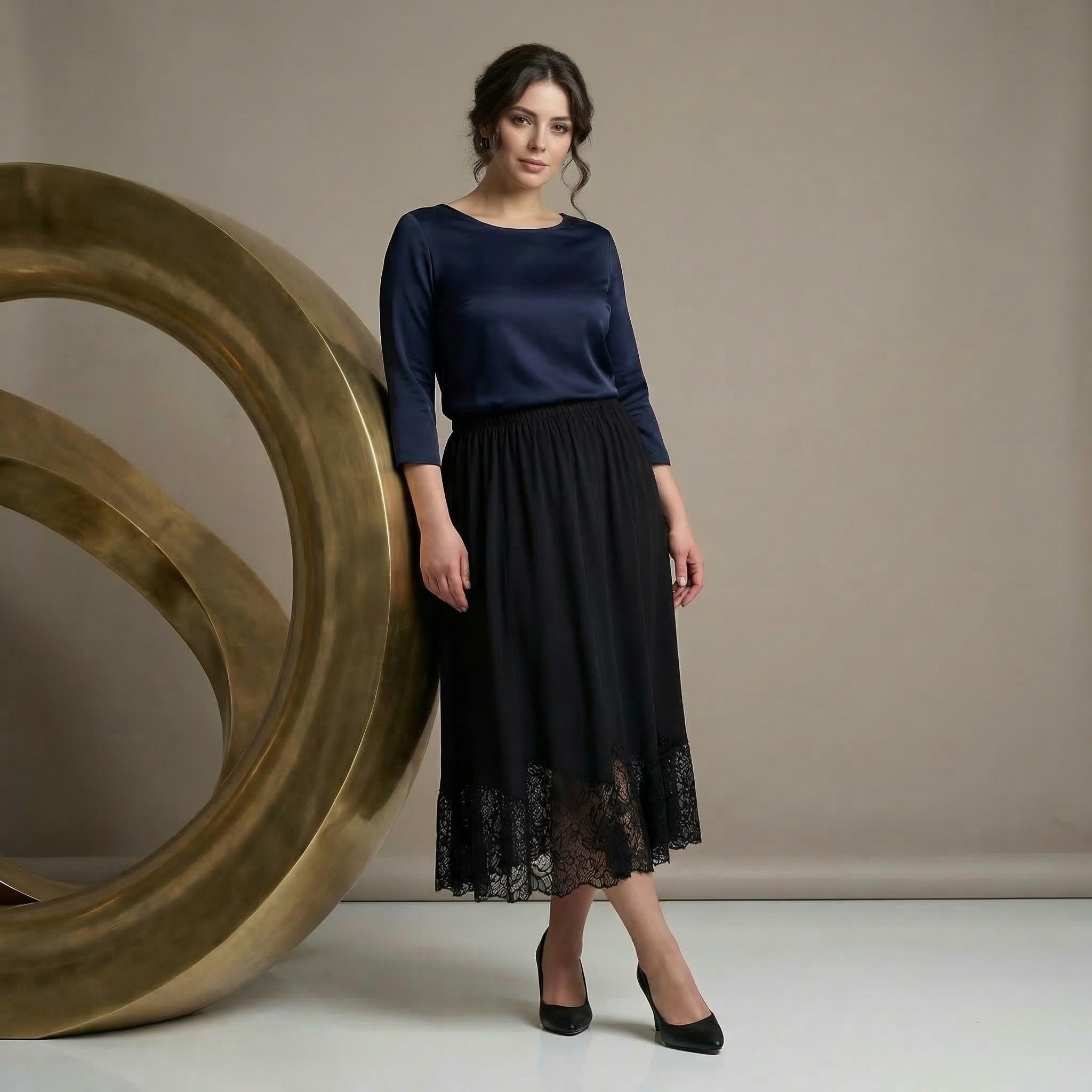 Открийте перфектния баланс между стил и комфорт с тази елегантна черна макси пола с дантела, създадена специално за дами с извивки. Изработена от мека, падаща тежко материя, тя се спуска плавно в женствен разкроен силует, който подчертава грацията на всяко движение. Дизайнът се отличава с удобен изцяло набран ластичен колан в талията, който осигурява безупречно прилягане и свобода през целия ден.