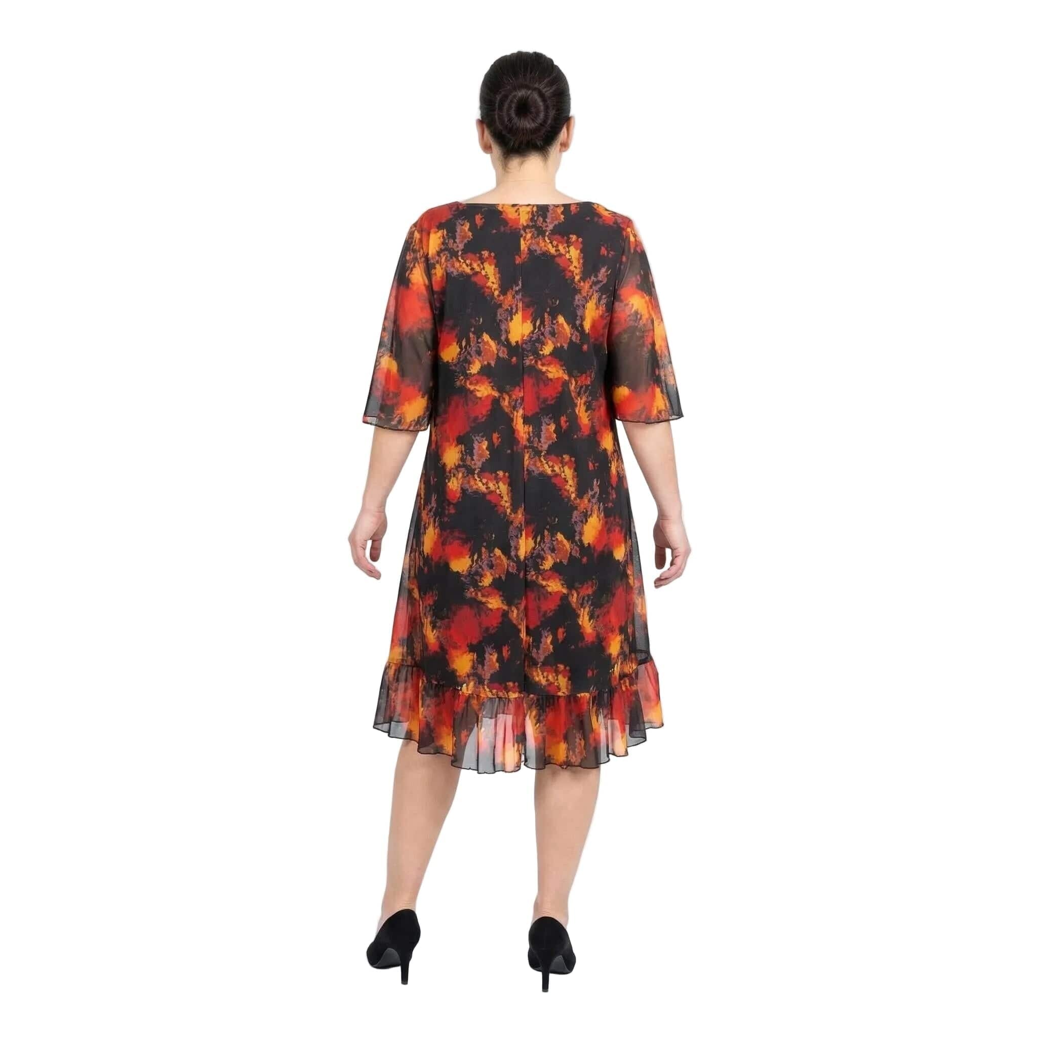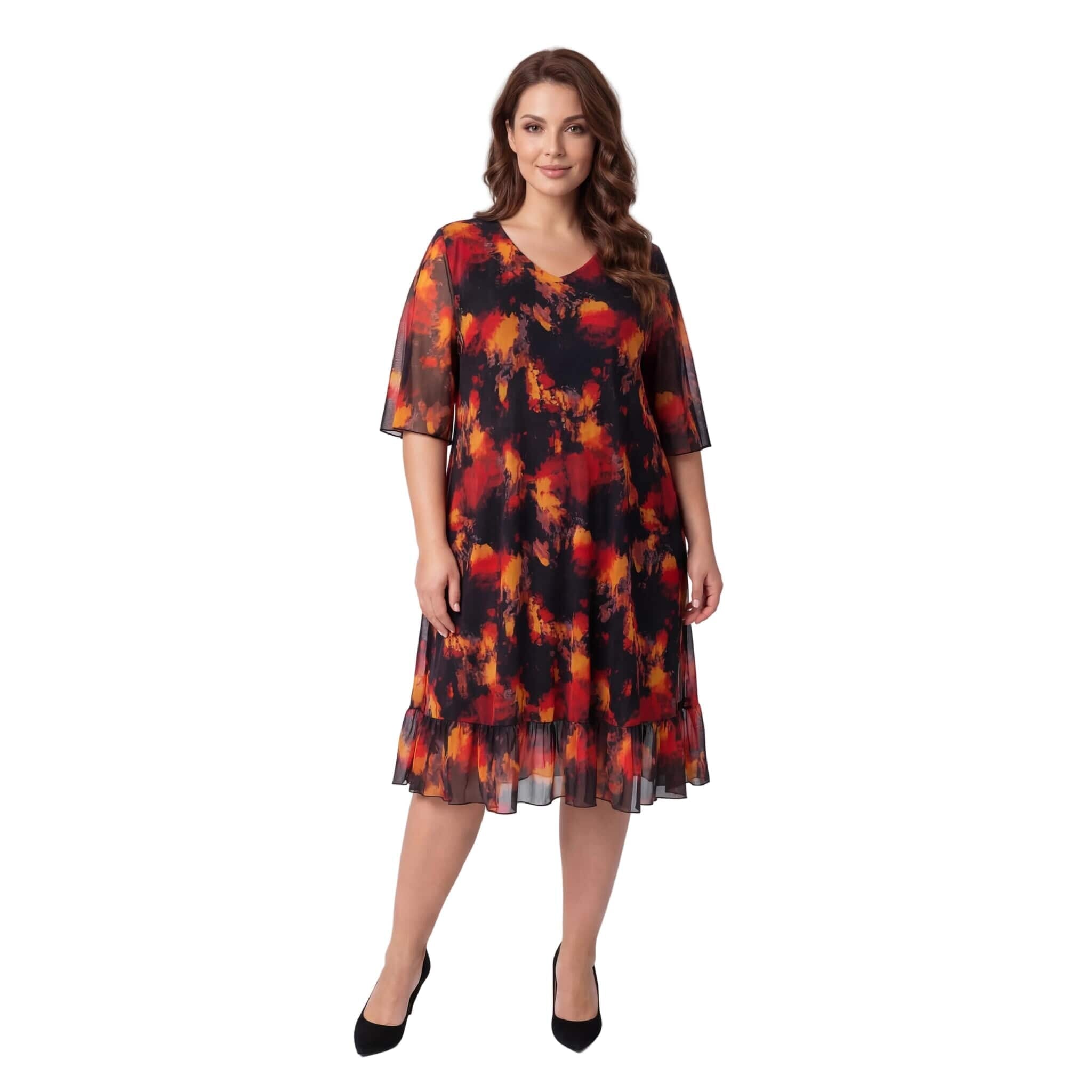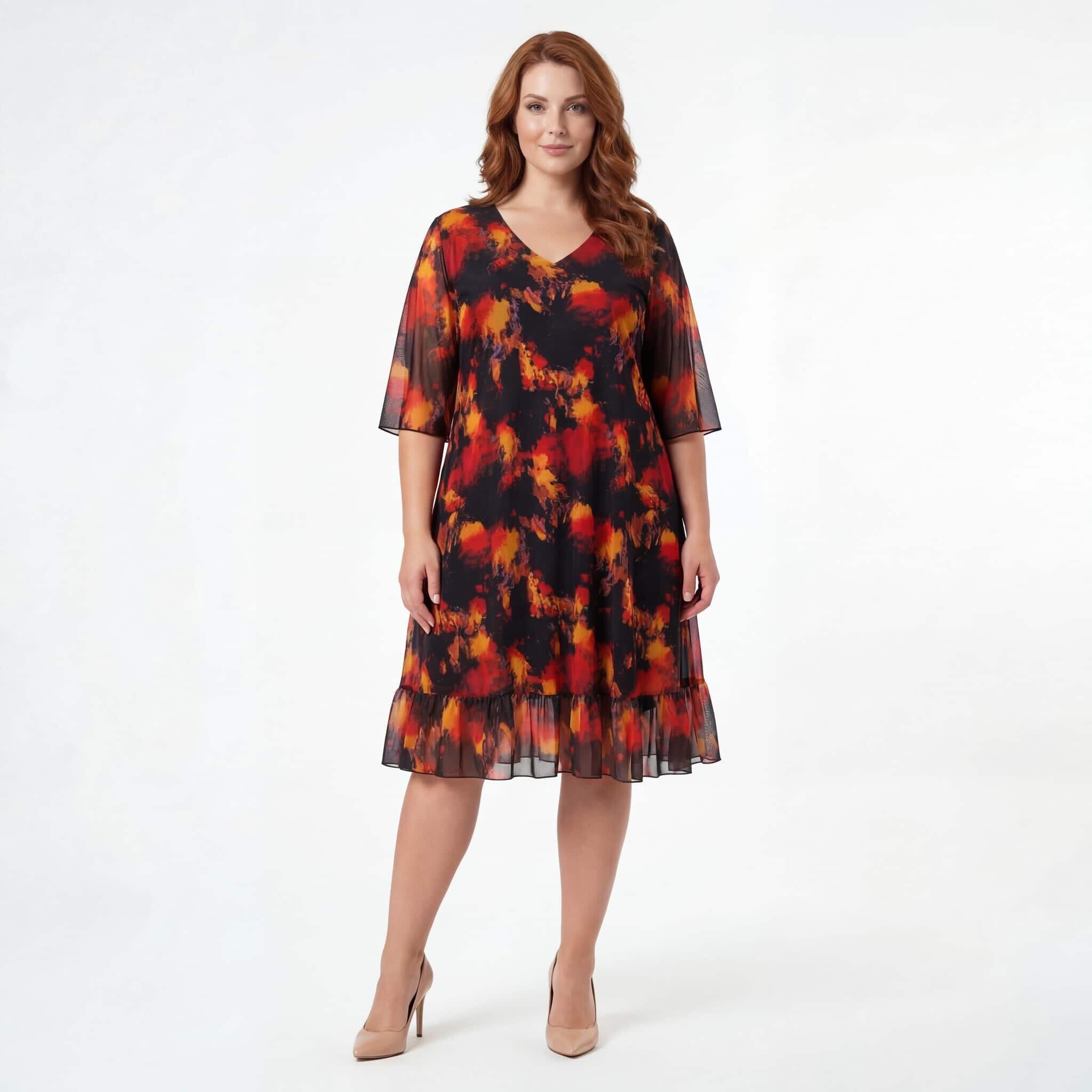 Открийте перфектния баланс между стил и комфорт с тази елегантна официална макси рокля в черно. Проектирана специално за дами с по-пищни форми, тази разкроена рокля нежно подчертава предимствата на женския силует. Моделът се отличава с ефирна шифонена горна част и впечатляващ абстрактен принт в огнени тонове, който приковава погледите. V-образното деколте визуално издължава фигурата, докато широките прозрачни ръкави и ефектният подгъв с волан добавят нотка романтика и грация към всяко движение. Снабдена с комфортна еластична подплата и дължина под коляното, тази рокля е вашият безупречен избор за всяко специално събитие.