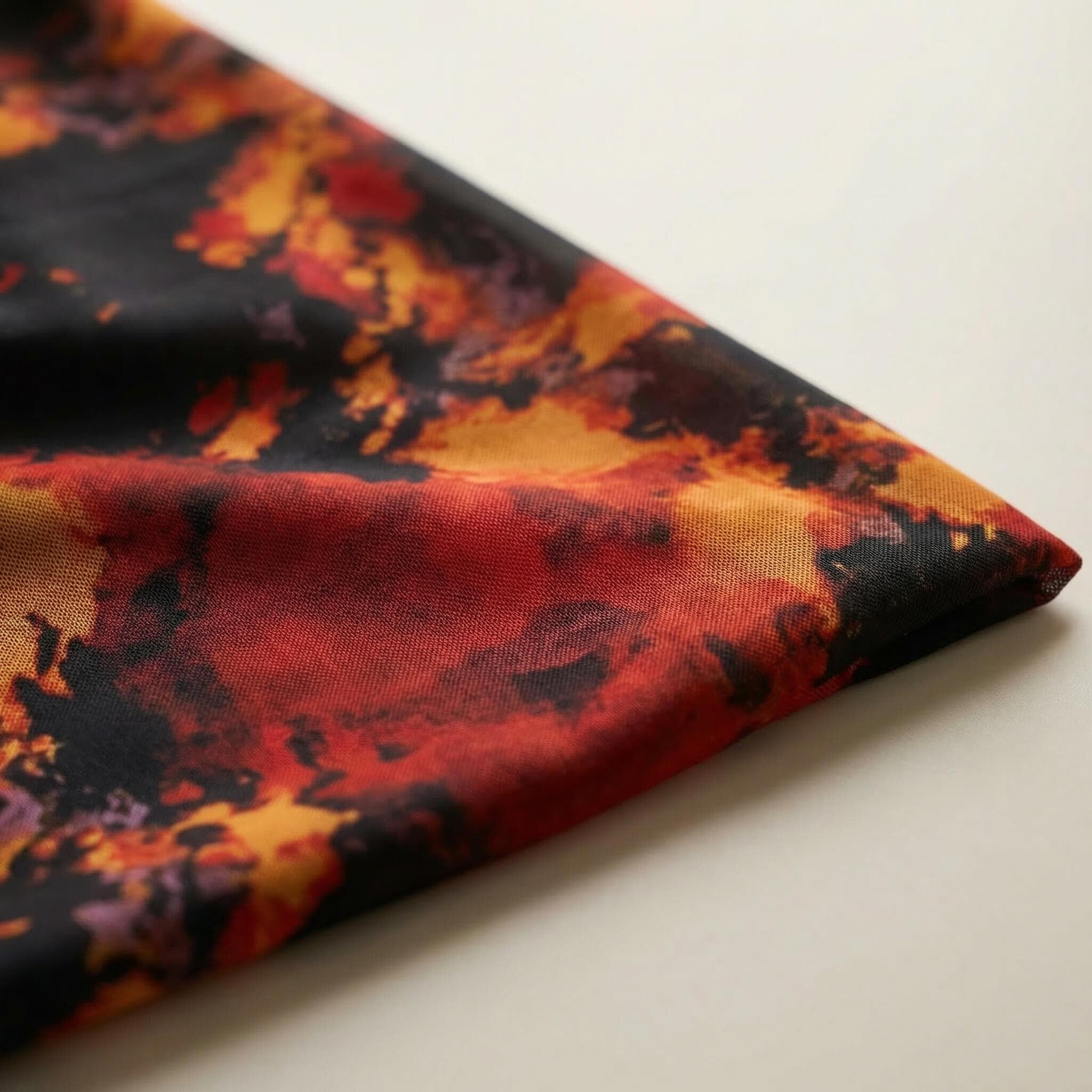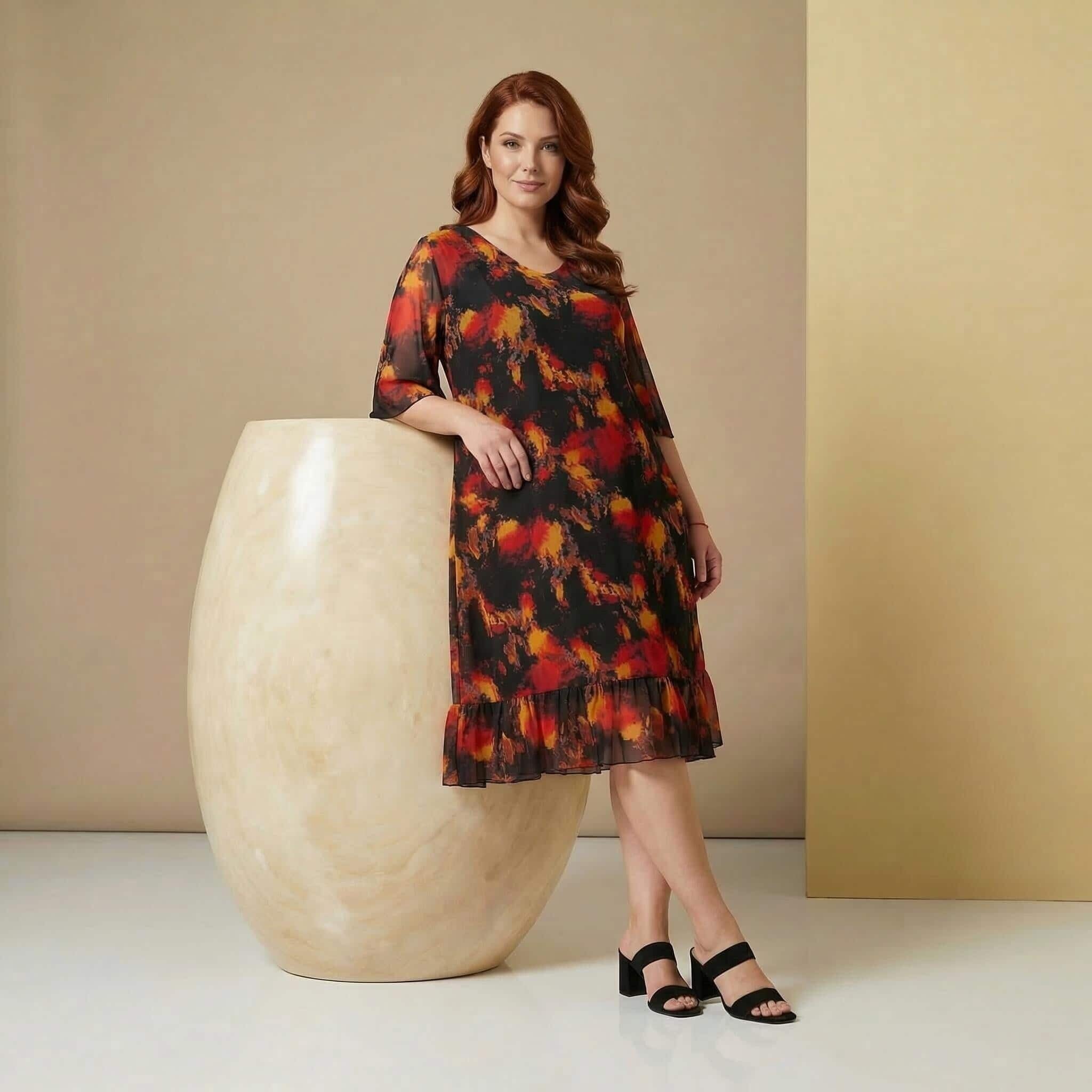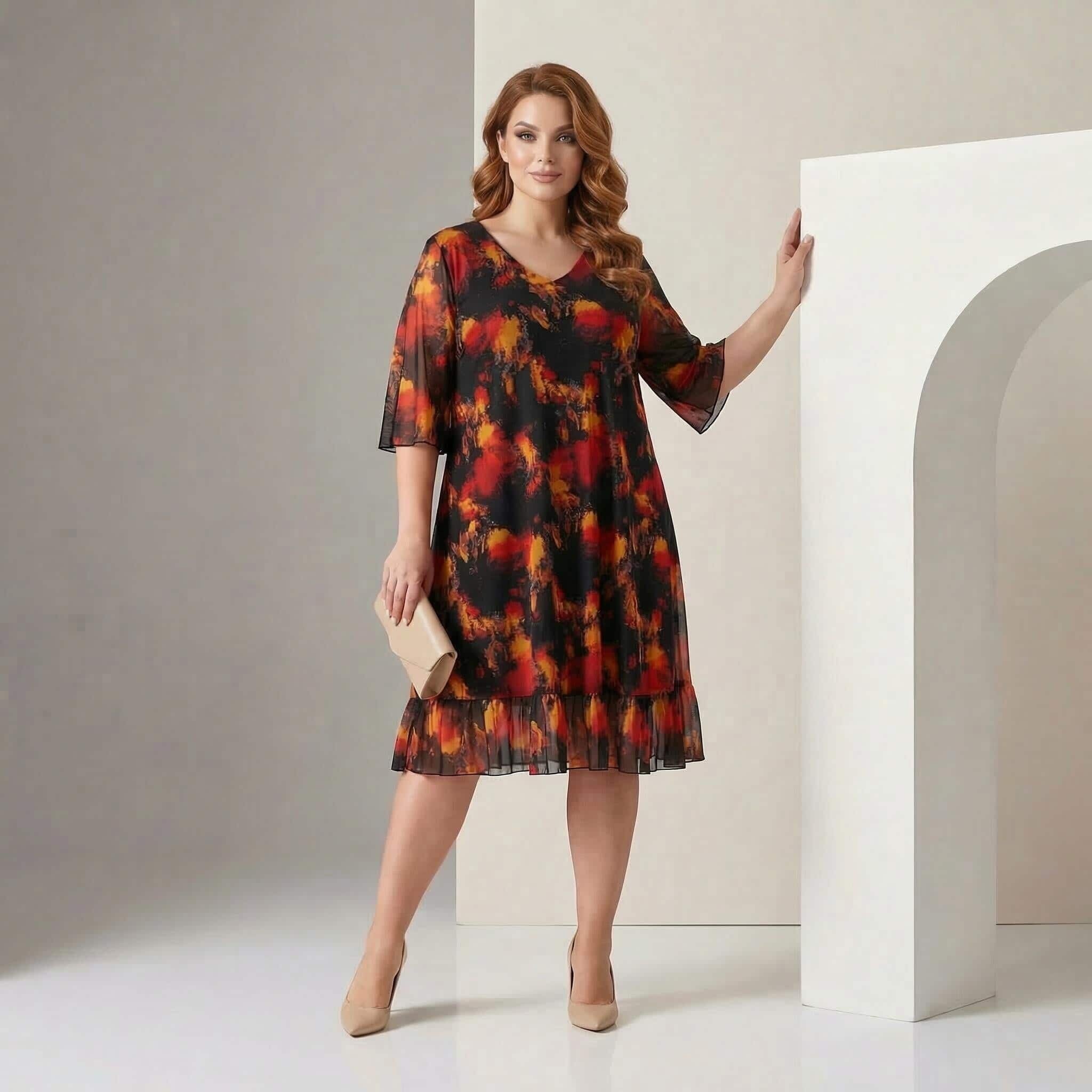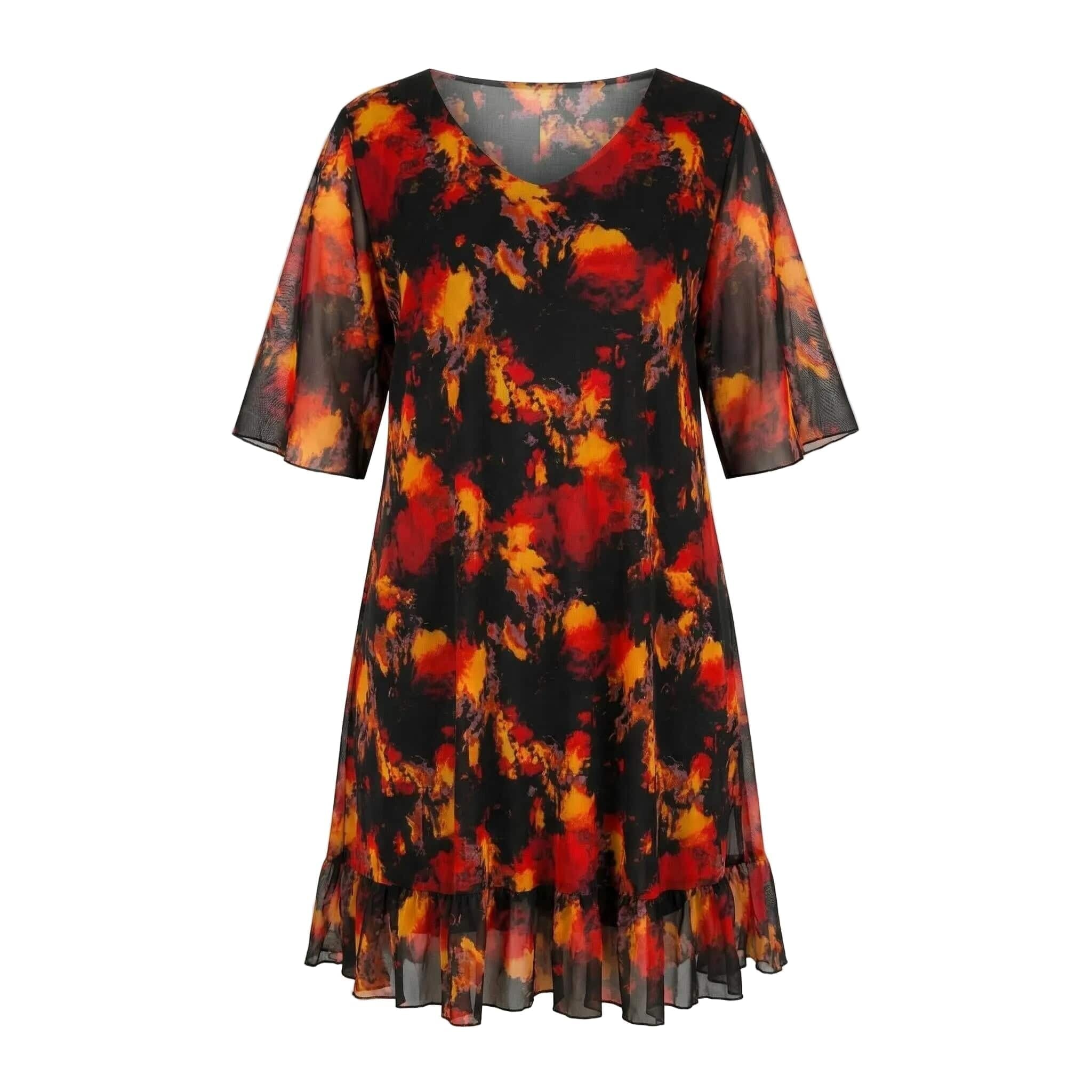 Открийте перфектния баланс между стил и комфорт с тази елегантна официална макси рокля в черно. Проектирана специално за дами с по-пищни форми, тази разкроена рокля нежно подчертава предимствата на женския силует. Моделът се отличава с ефирна шифонена горна част и впечатляващ абстрактен принт в огнени тонове, който приковава погледите. V-образното деколте визуално издължава фигурата, докато широките прозрачни ръкави и ефектният подгъв с волан добавят нотка романтика и грация към всяко движение. Снабдена с комфортна еластична подплата и дължина под коляното, тази рокля е вашият безупречен избор за всяко специално събитие.