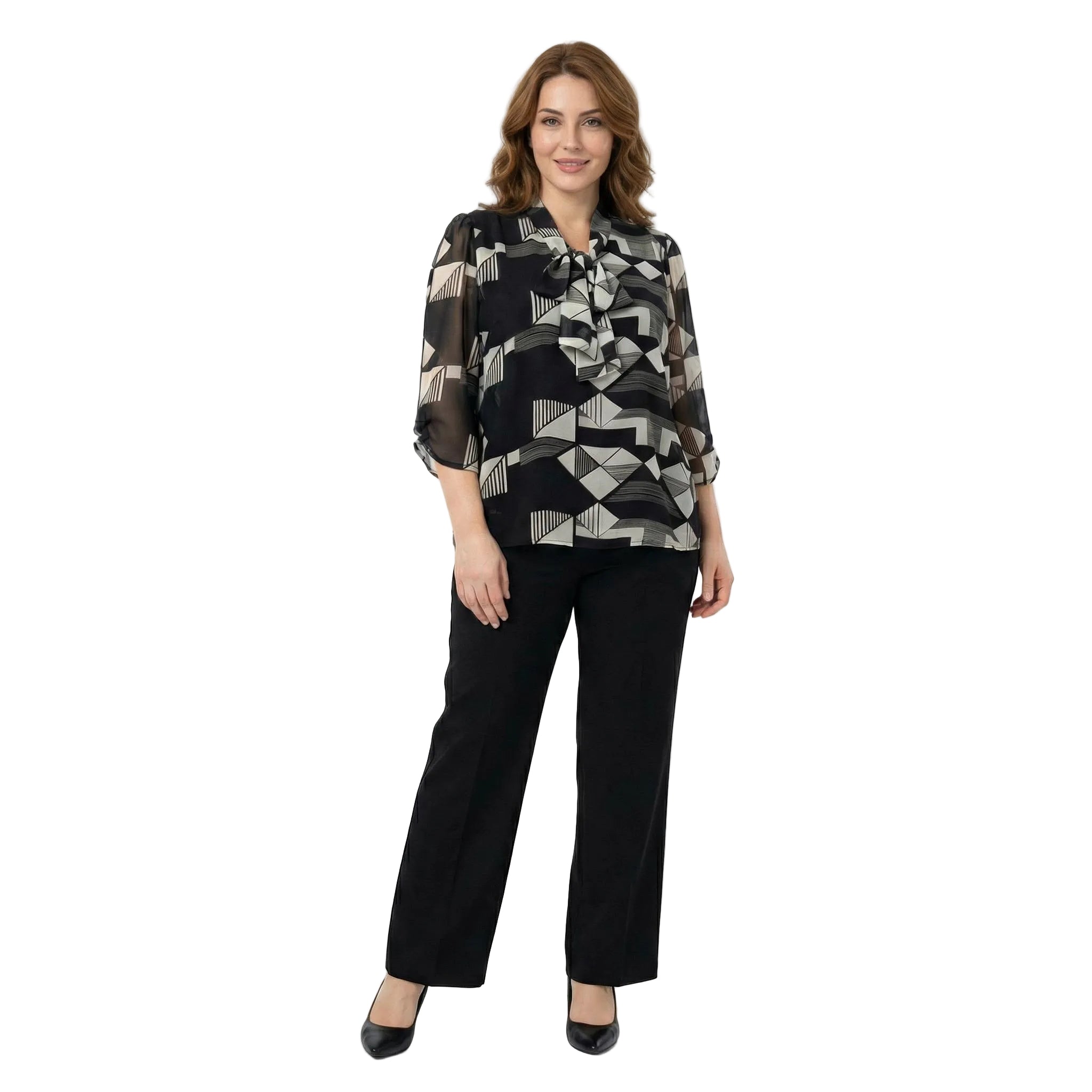 Представяме ви изискана официална туника в макси размер, създадена да подчертае вашата елегантност и увереност. Моделът в класически черен цвят впечатлява с красиво оформено деколте, акцентирано с ефектна панделка, която придава женственост и стил. Свободната кройка е допълнена от широк 7/8 ръкав, осигуряващ свобода на движение и феерично излъчване. Туниката разполага с комфортна подплата и е набрана в долната част с ластик, което оформя приятен силует и гарантира безупречно прилягане. Идеално решение както за специален повод, така и за стилно ежедневие през преходния сезон.