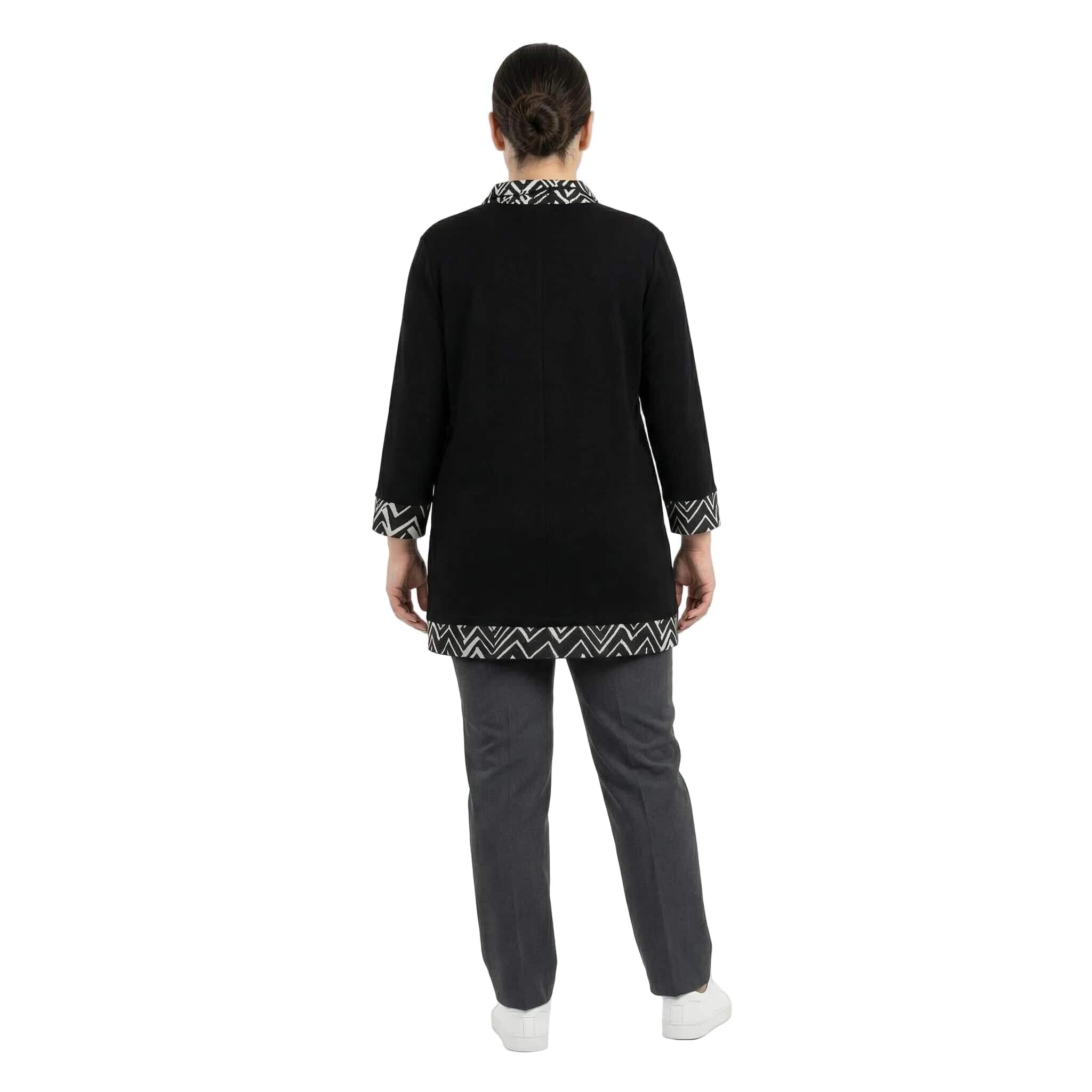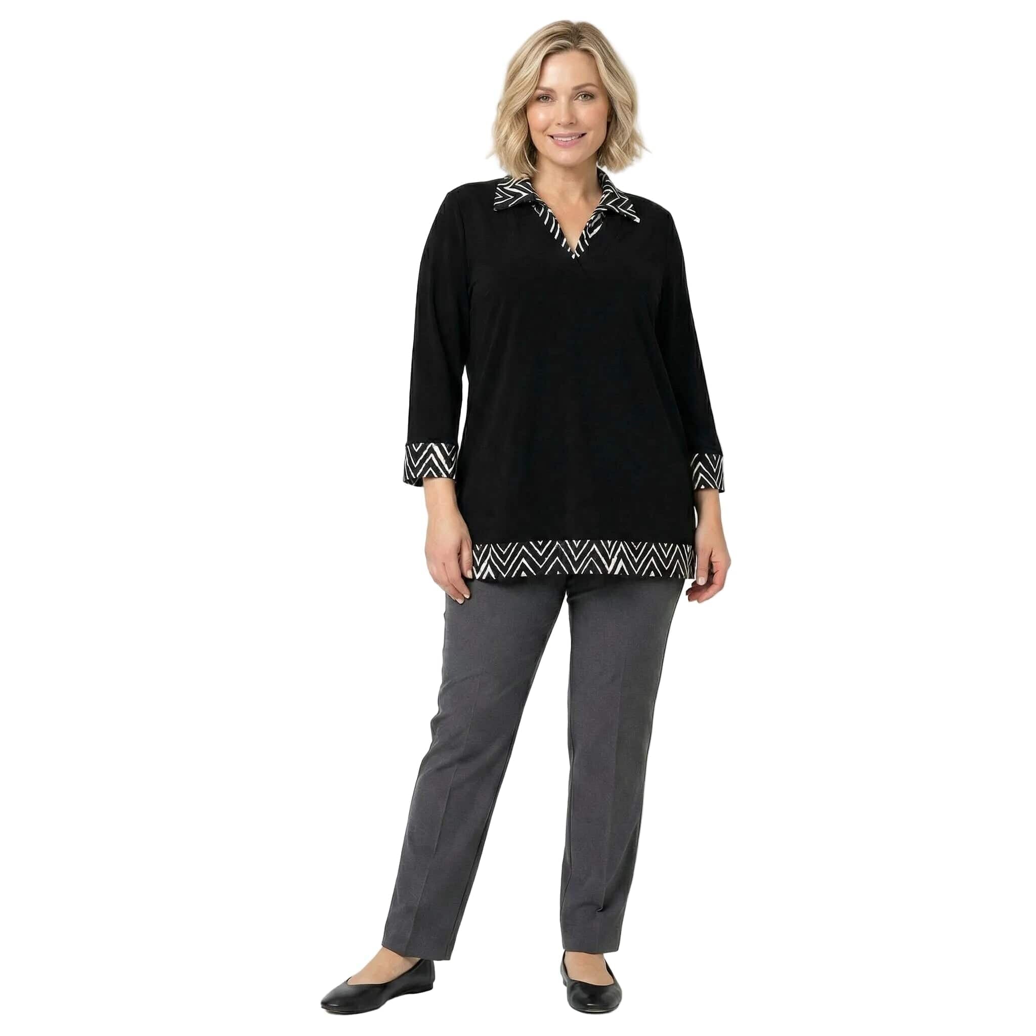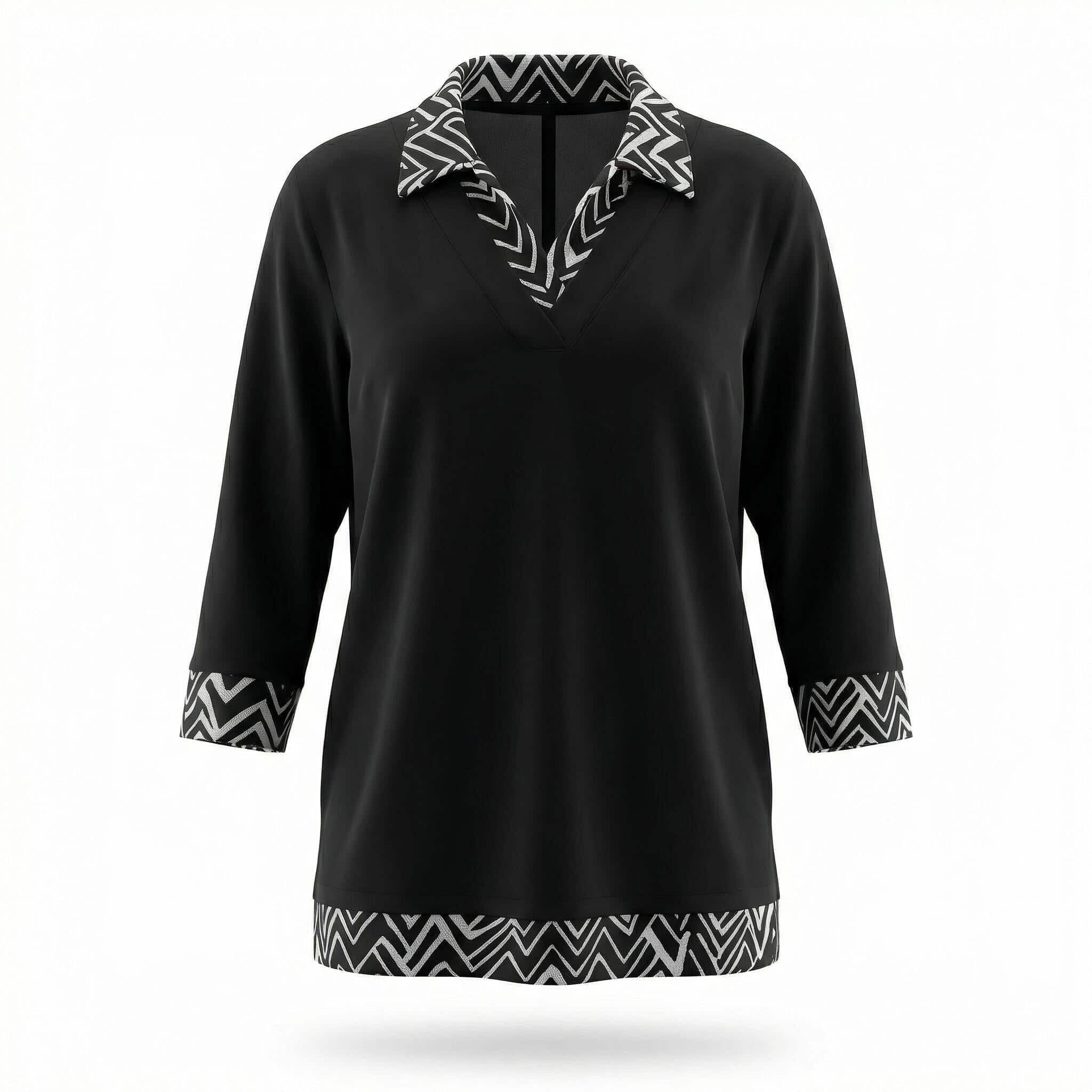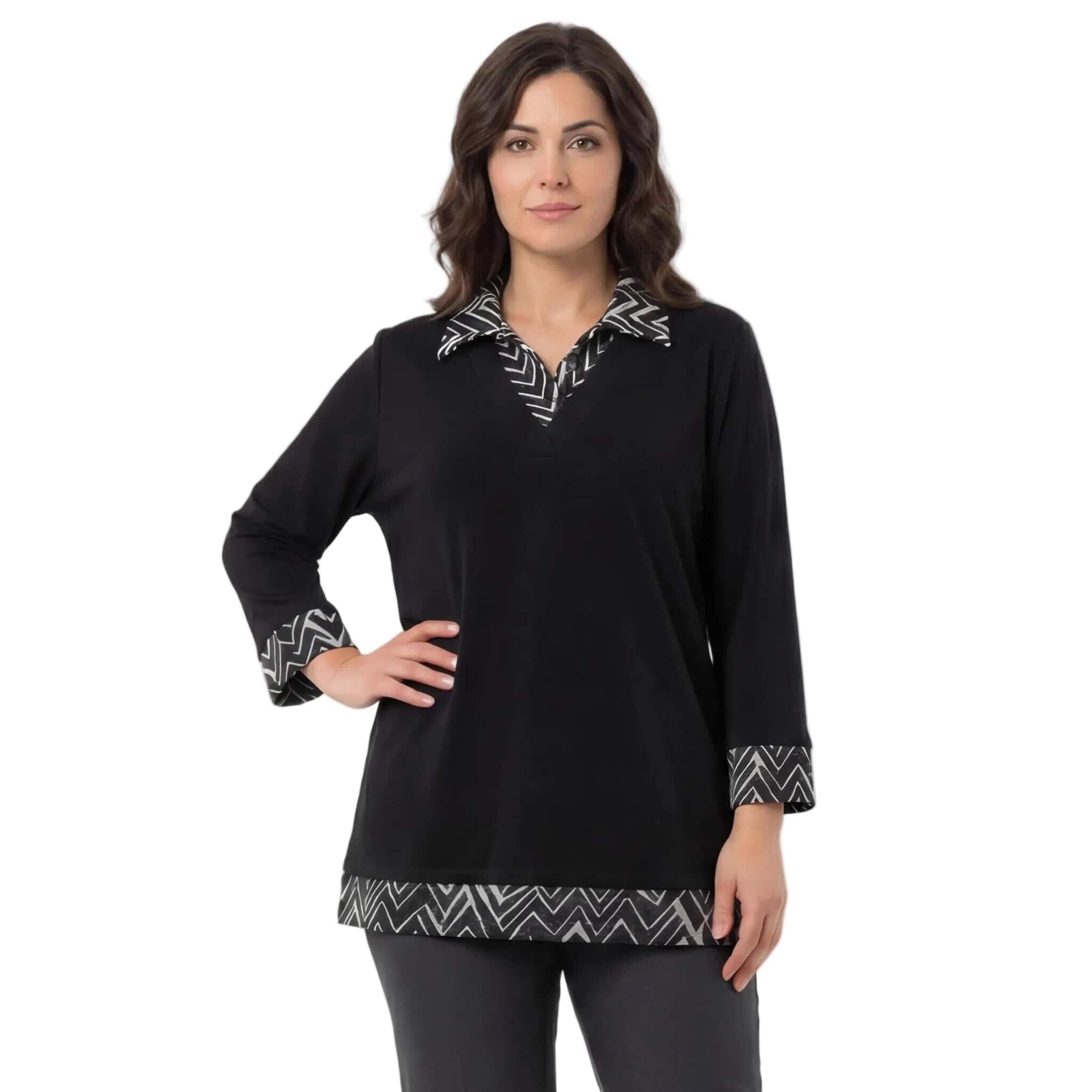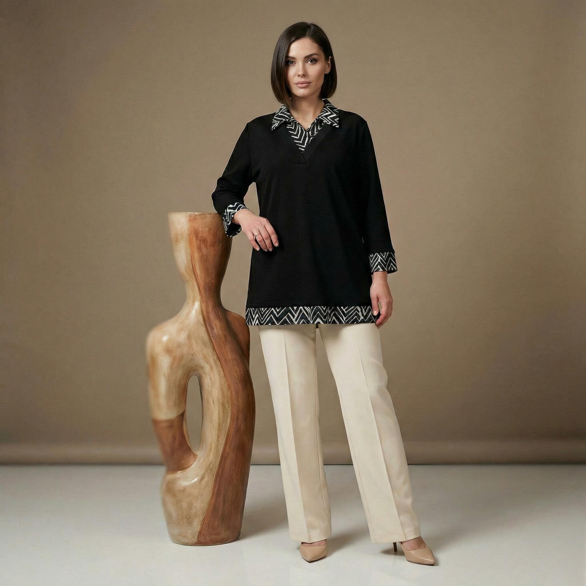 Открийте перфектния баланс между строга елегантност и модерен комфорт с тази официална туника в наситено черно, създадена специално за дамите с извивки. Моделът впечатлява със своята стилна черно-бяла якичка и координирани маншети на ръкавите, които придават изискан и завършен вид на визията. Допълнителният акцент в долната предна част хармонира с горната част на дрехата, създавайки цялостна и балансирана естетика. Изработена от плътна и приятна на допир материя с отлична еластичност, тази туника пада тежко и гладко, осигурявайки свобода на движенията. Правата кройка издължава оптически силуета и осигурява комфорт през целия ден, правейки модела идеален избор както за деловото ежедневие, така и за специални поводи през есенно-зимния сезон.