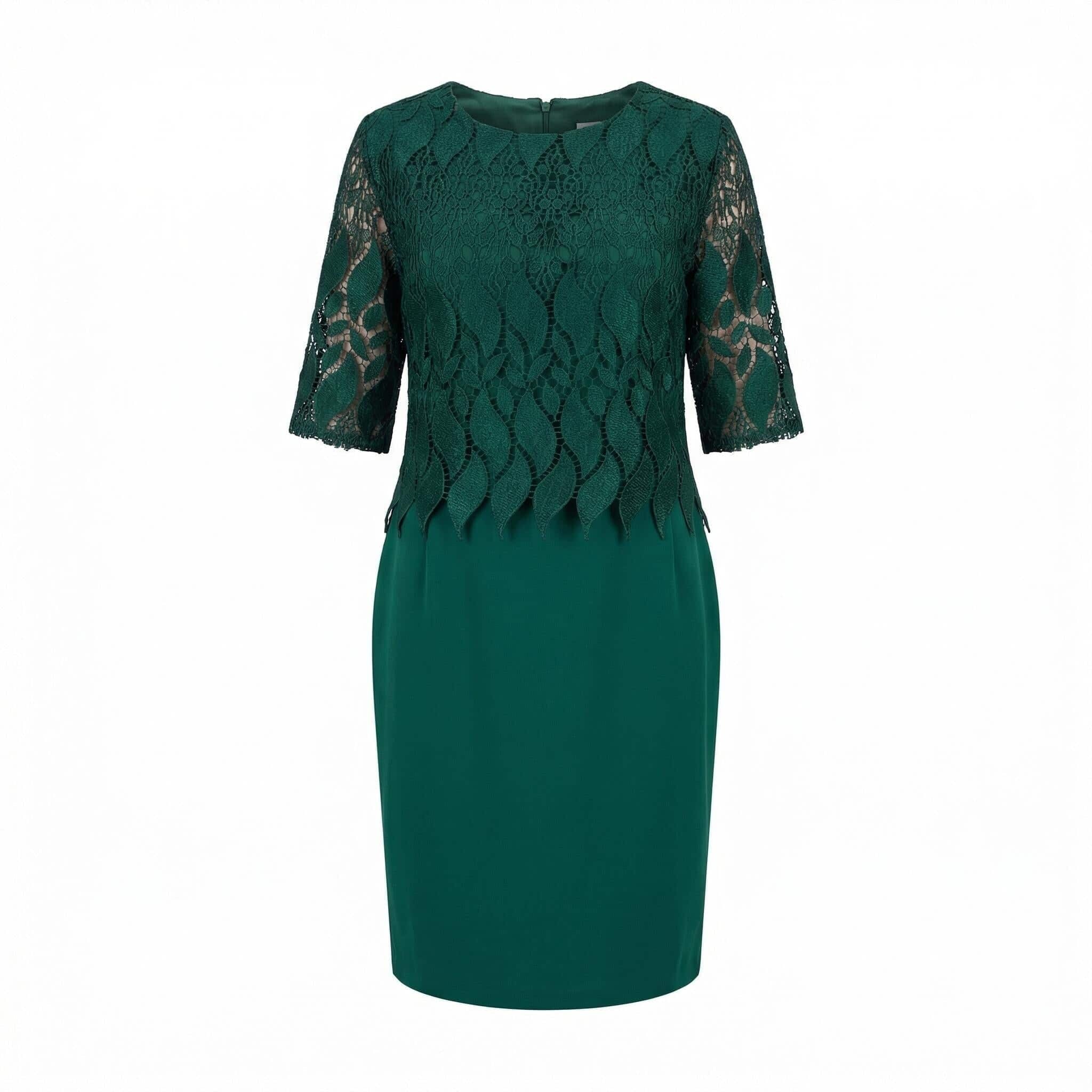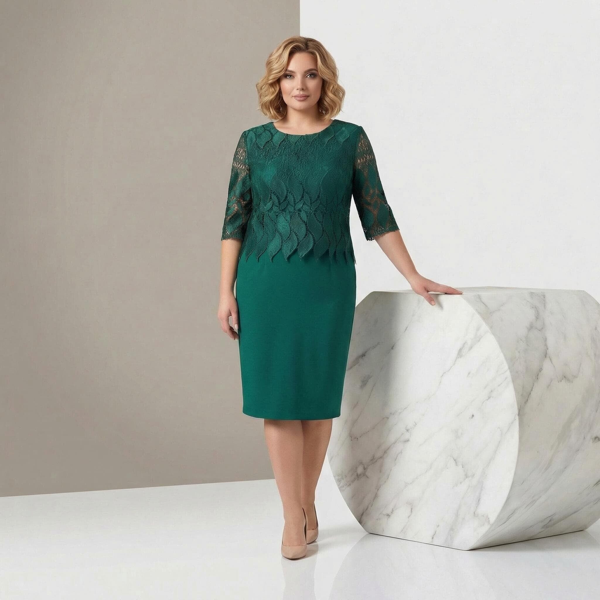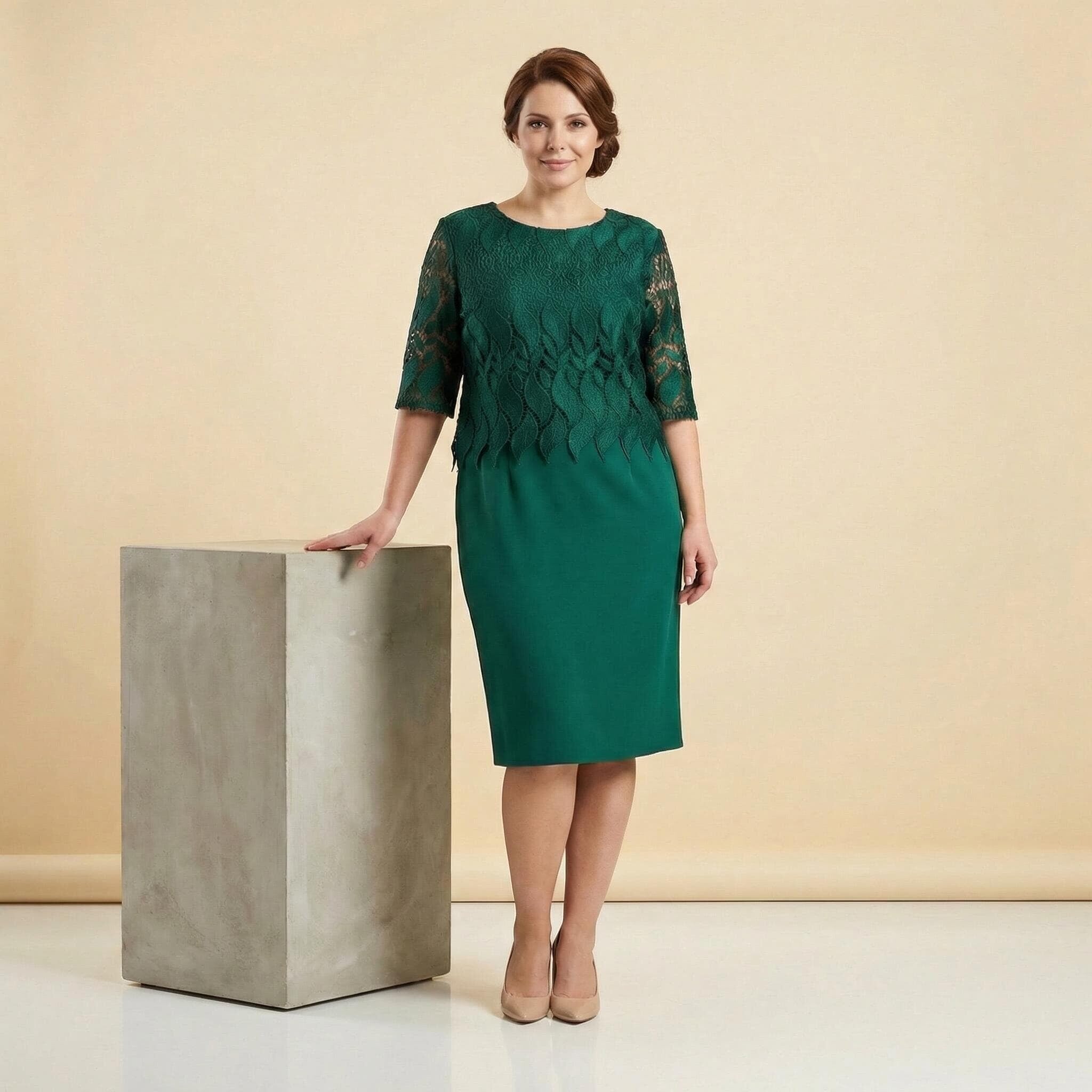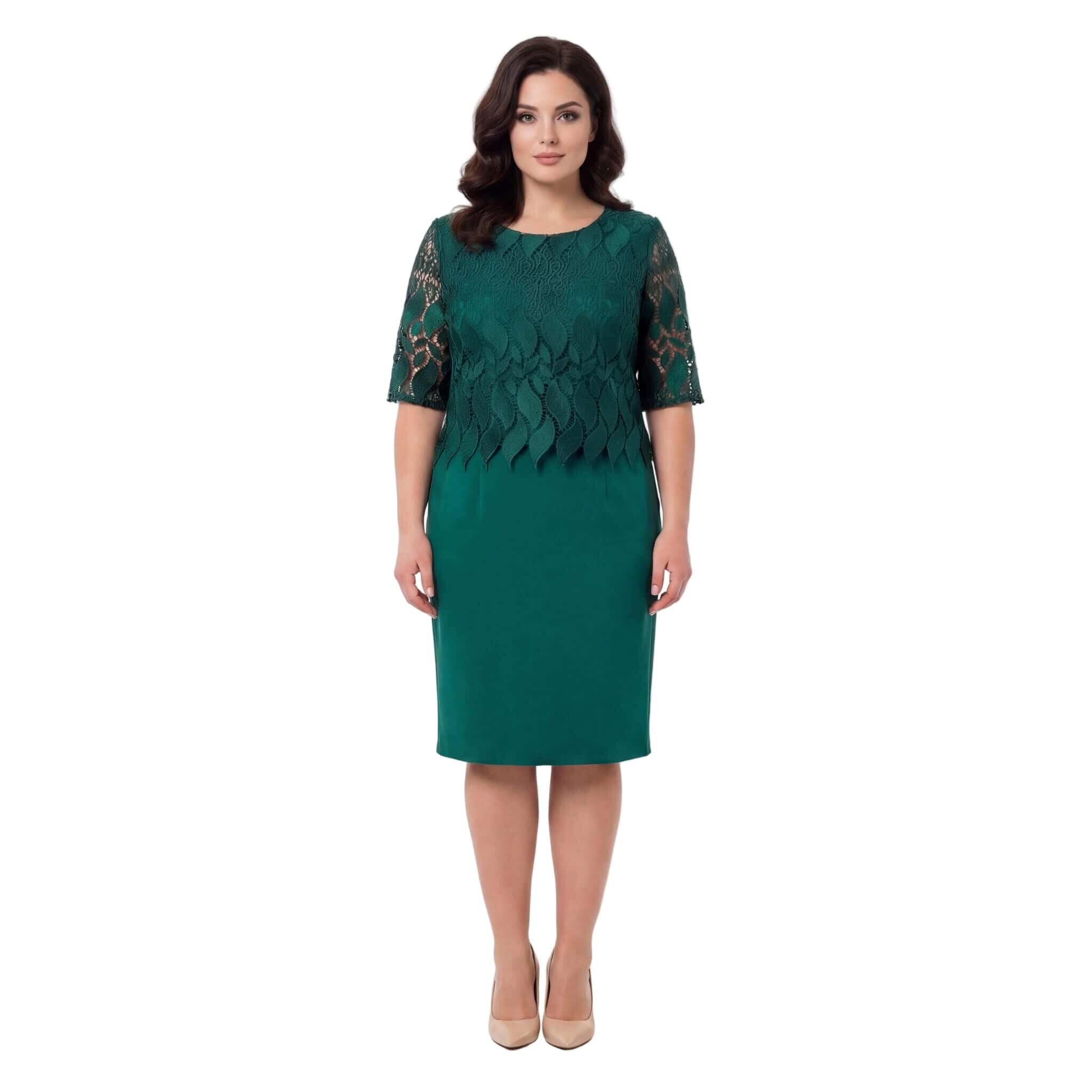 Почувствайте се неотразима и уверена с тази изящна официална макси рокля в актуален масленозелен цвят. Моделът е създаден специално за дами с пищни форми, като съчетава безупречна елегантност с усещане за лекота. Горната част впечатлява с фина дантела с красиви мотиви, която придава изтънченост на визията, докато долната част е изработена от мека и падаща вискозна материя. Правата кройка деликатно следва линиите на тялото, без да очертава излишно, а облото деколте завършва стилния силует. Тази рокля е перфектният избор за сватба, кръщене или вечерно събитие, гарантирайки ви комфорт и комплименти през целия празник.