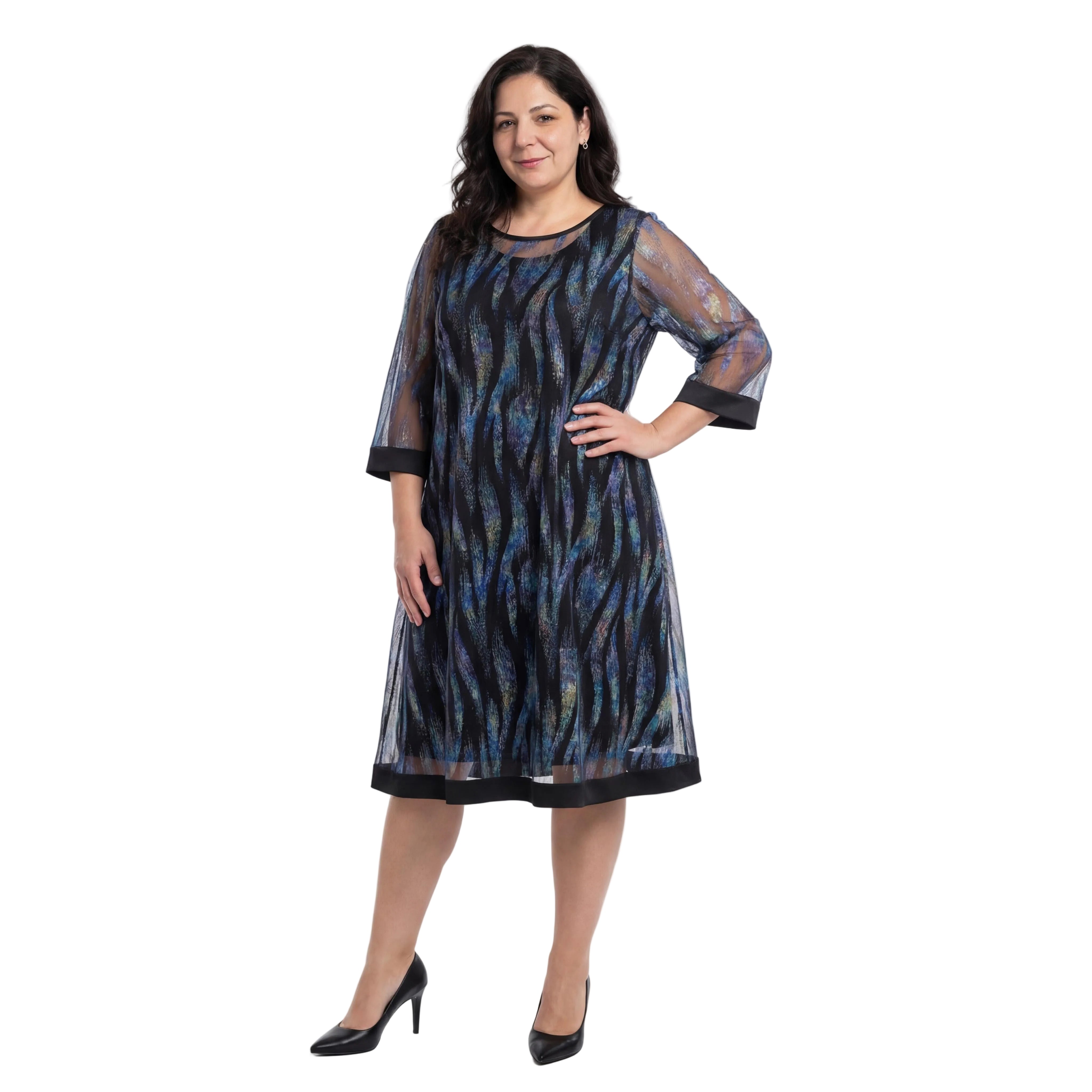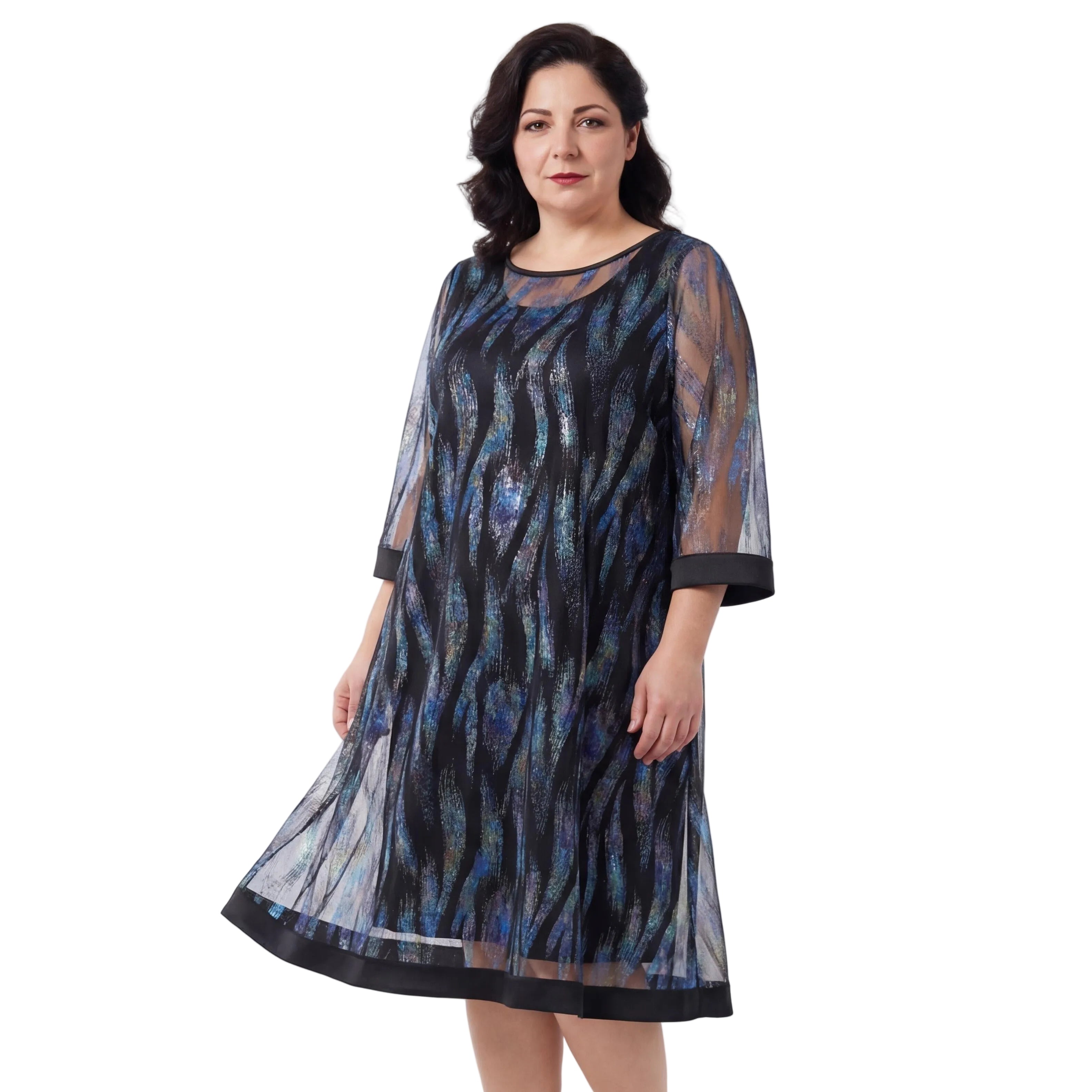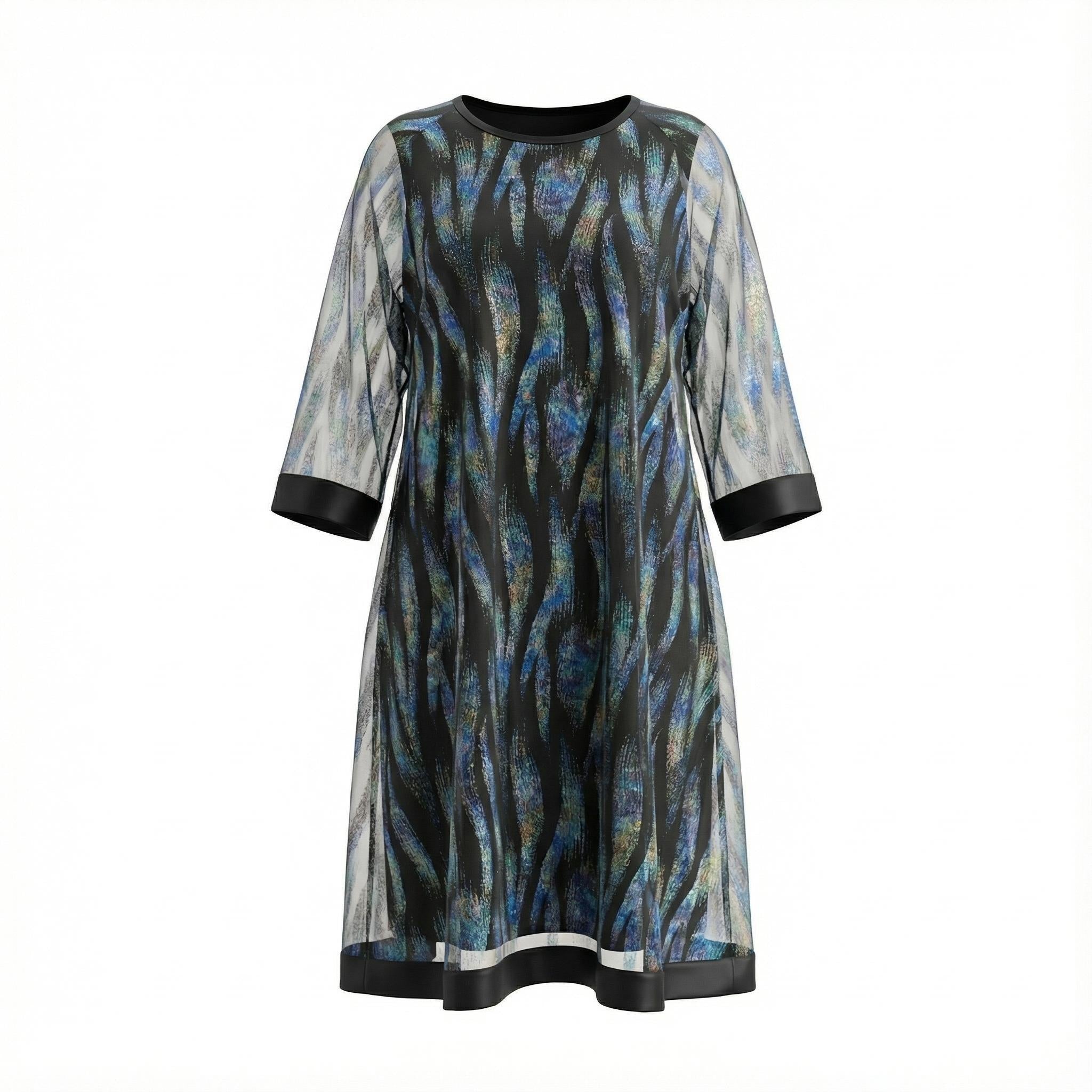 Дизайн: Комбинация от непрозрачна трикотажна основа и горна част от ефирен шифон с абстрактен принт.