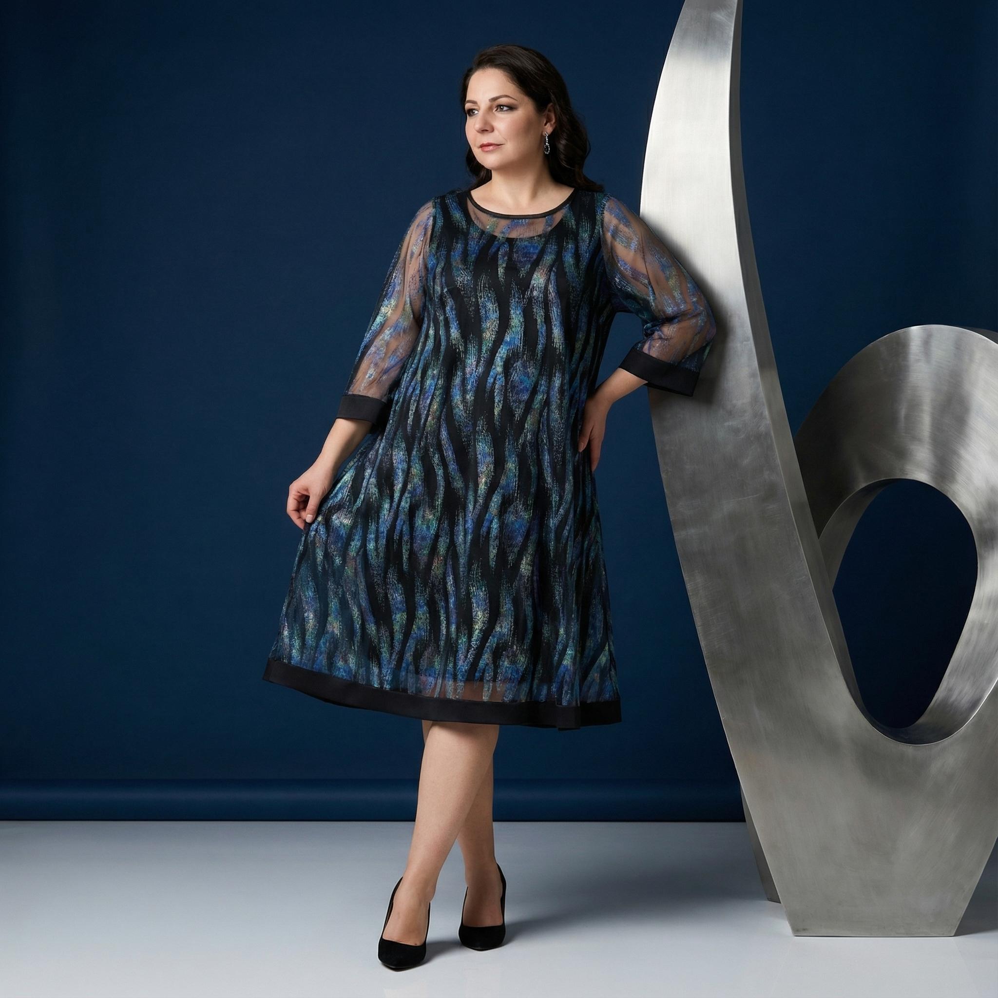 Открийте перфектния баланс между изискана класика и модерен блясък с тази официална макси рокля, създадена да подчертае вашата увереност. Моделът съчетава комфортна основа с права кройка в тъмносин цвят и ефирна горна част от шифон, която пада свободно и елегантно около тялото. Абстрактните вертикални щрихи с деликатен сребрист блясък визуално издължават силуета и придават празнично настроение. Уникалният характер на дрехата е подчертан от модерните детайли от еко кожа по ръкавите и подгъва, създаващи стилен контраст с ефирната материя. Тази рокля е идеалният избор за сватби, кръщенета или бизнес коктейли, където комфортът и стилът трябва да вървят ръка за ръка.