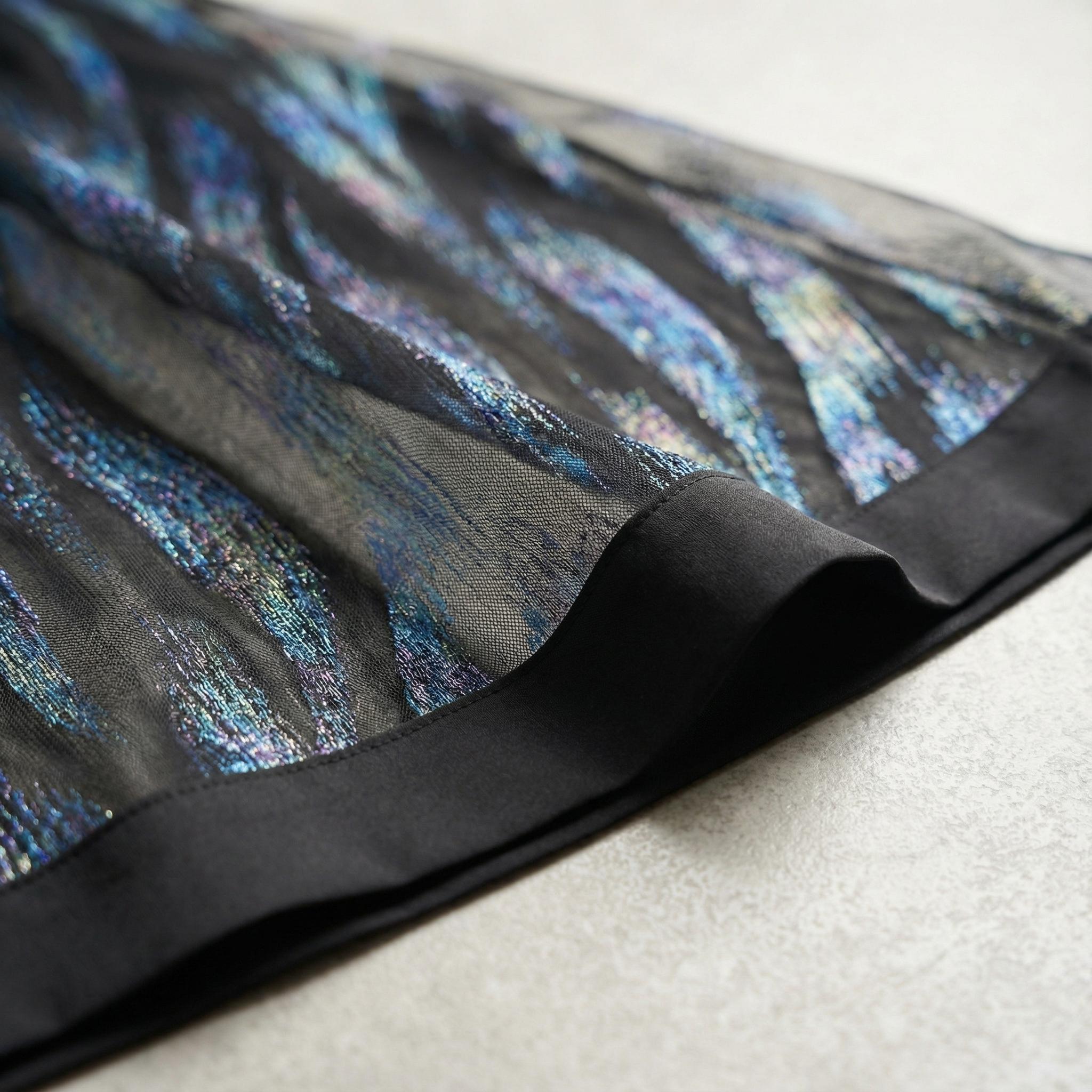 - Вертикалните блестящи мотиви създават изящен и издължен силует.