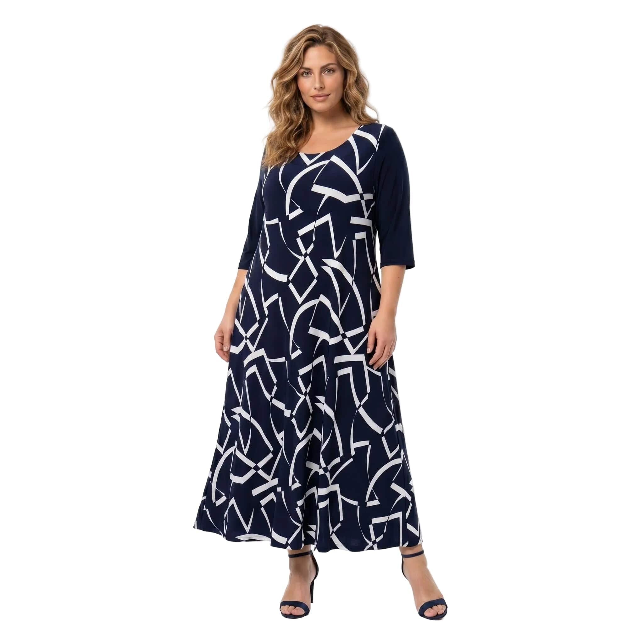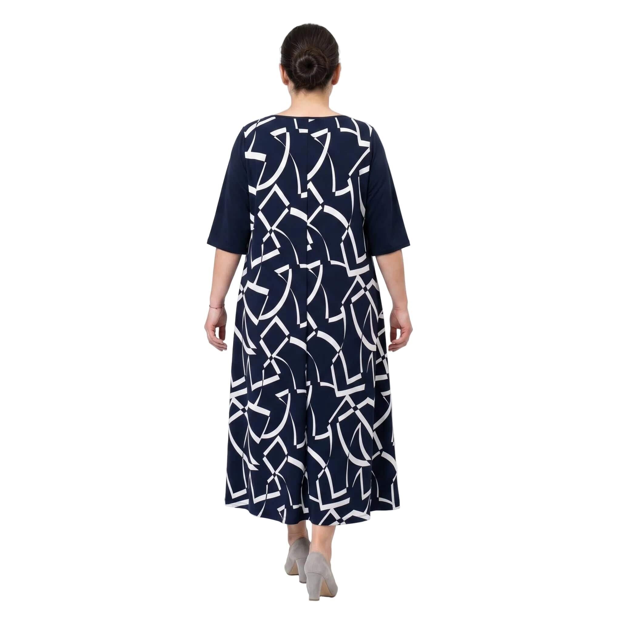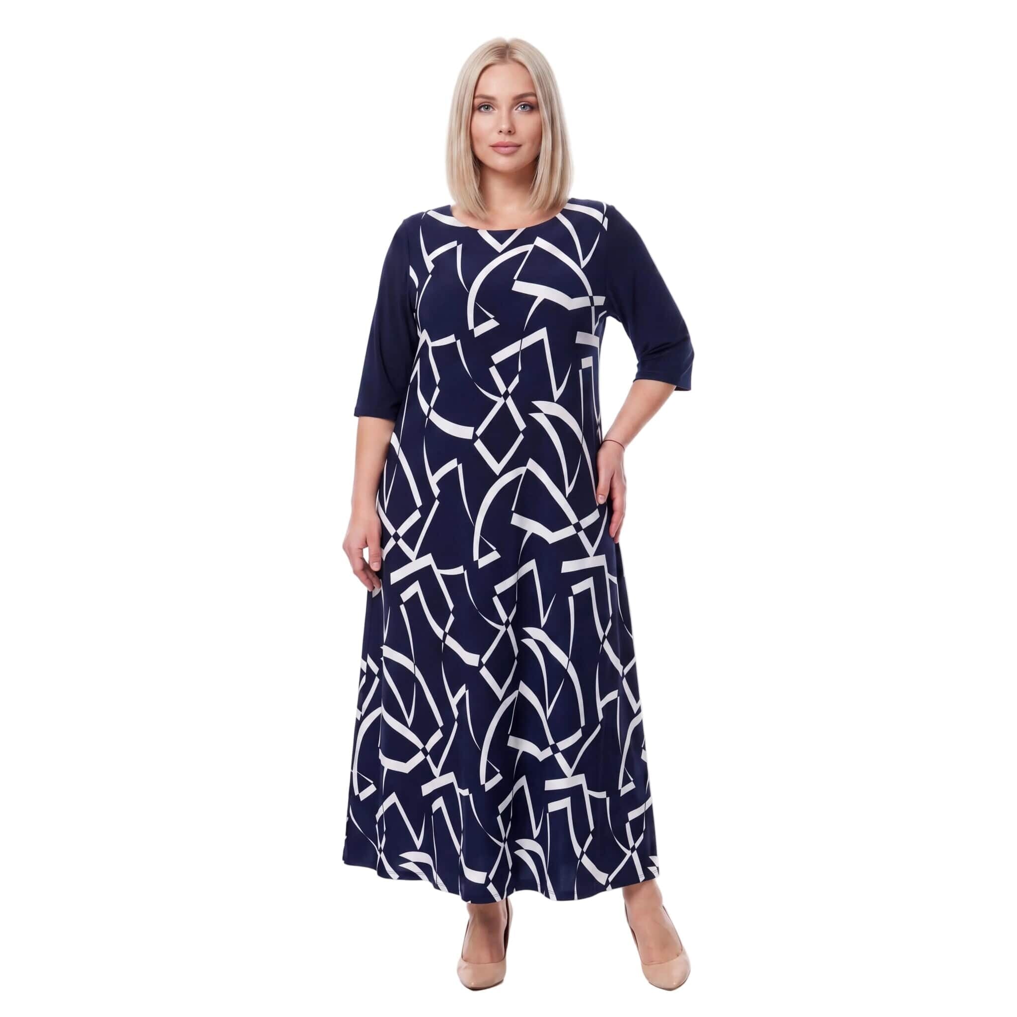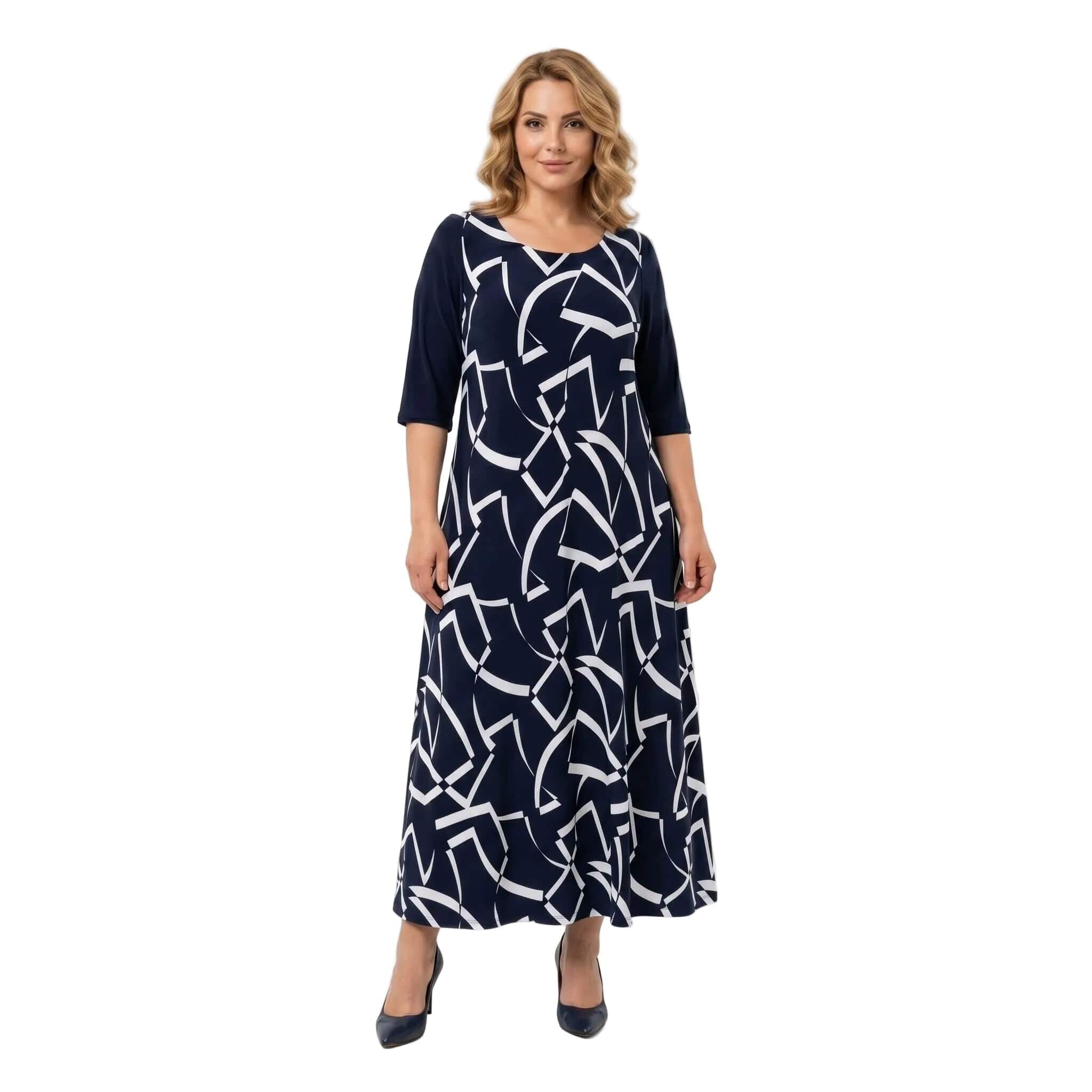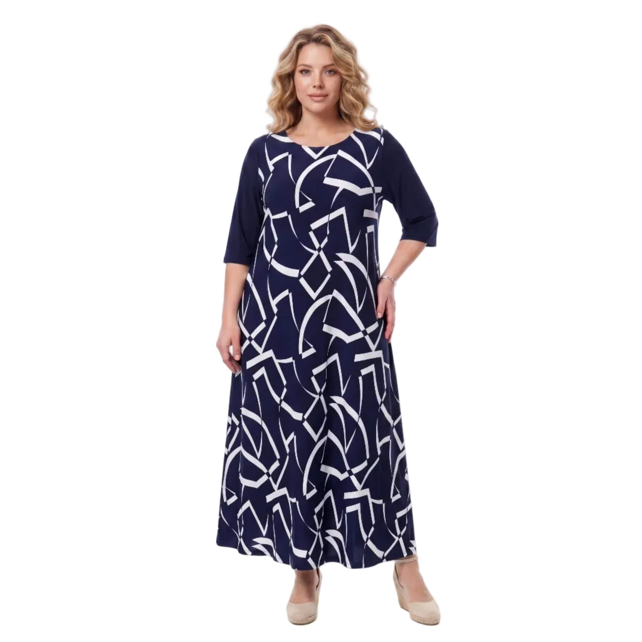 Елегантна и стилна, тази тъмносиня официална макси рокля е създадена, за да подчертае вашата женственост по време на всеки специален повод. Изработена от мека и приятно падаща еластична материя, тя предлага не само изискана визия, но и безкомпромисен целодневен комфорт. Моделът се отличава с нежно обло деколте, къси ръкави и красиво разкроен дълъг силует, който грациозно следва движенията на тялото през топлите пролетно-летни дни.