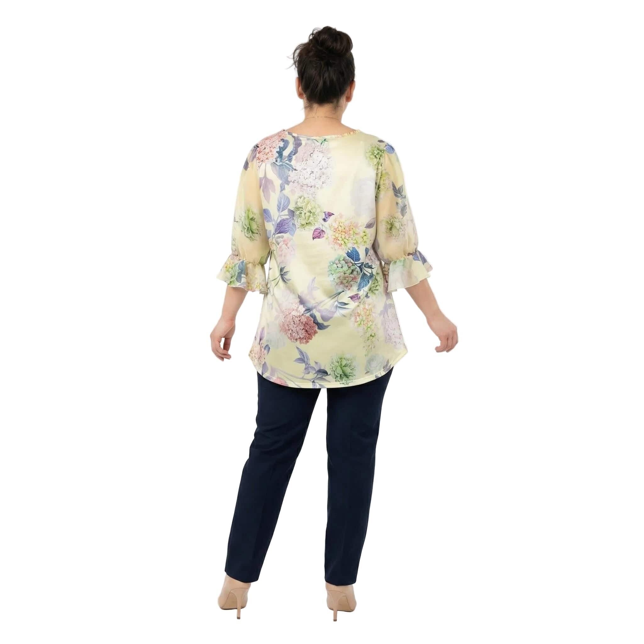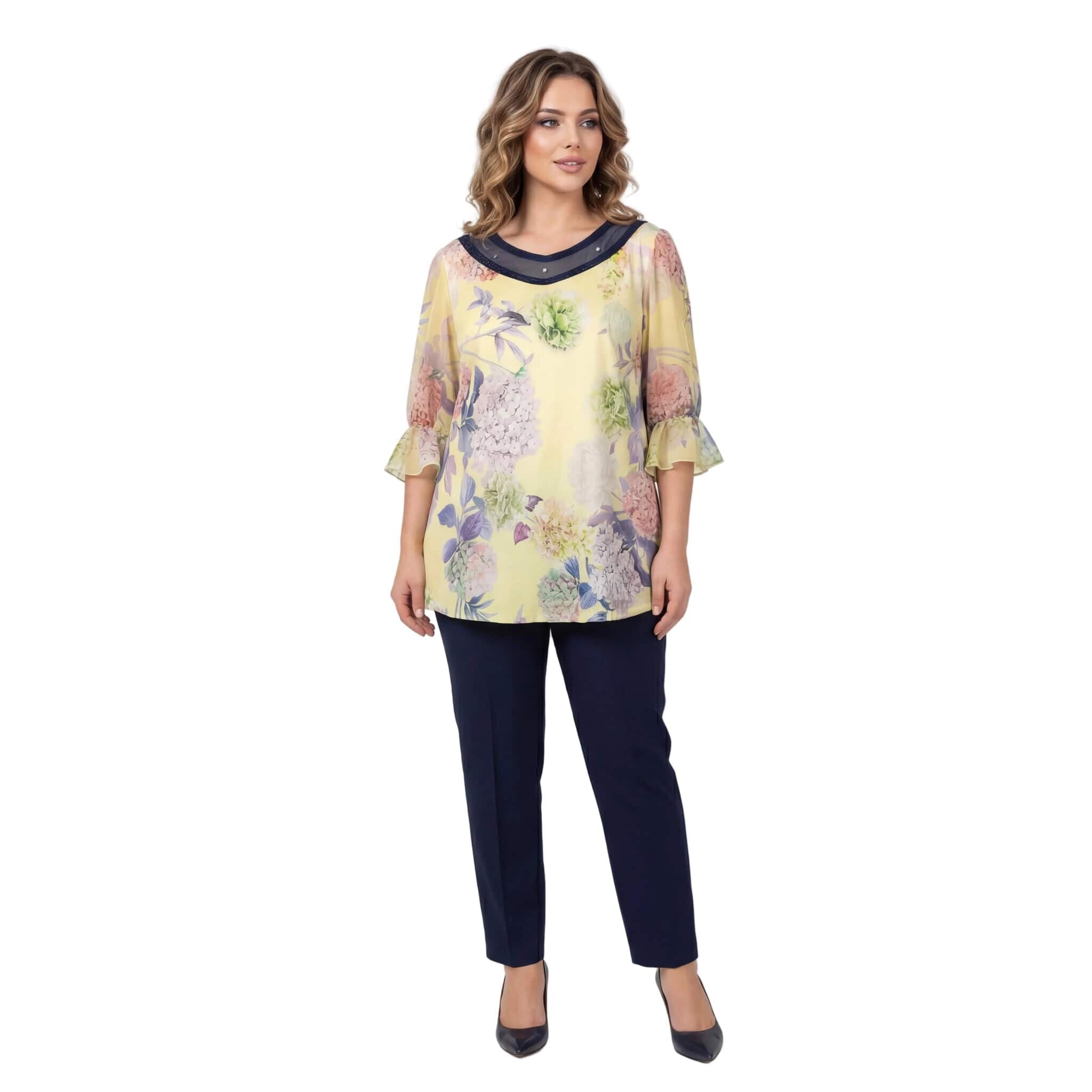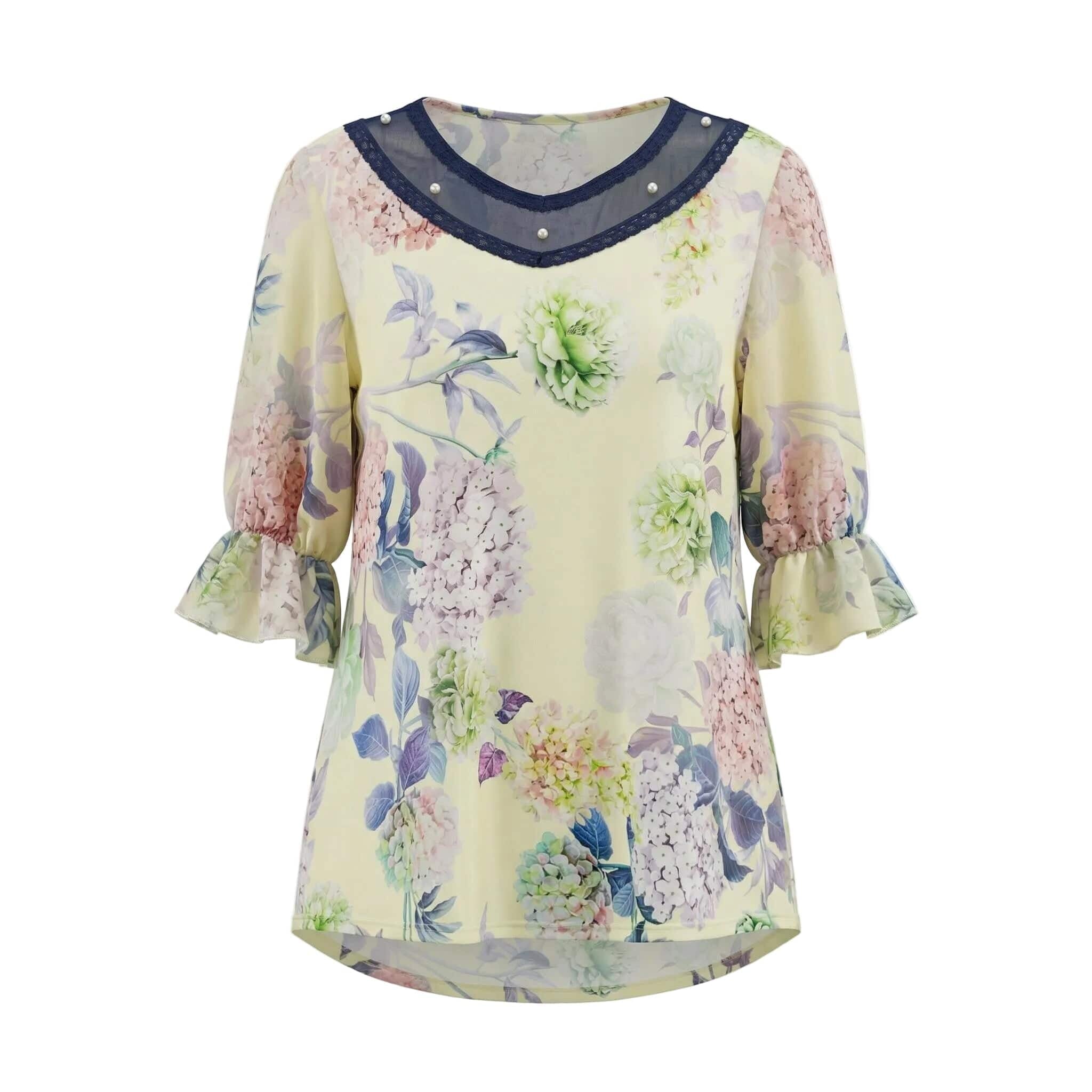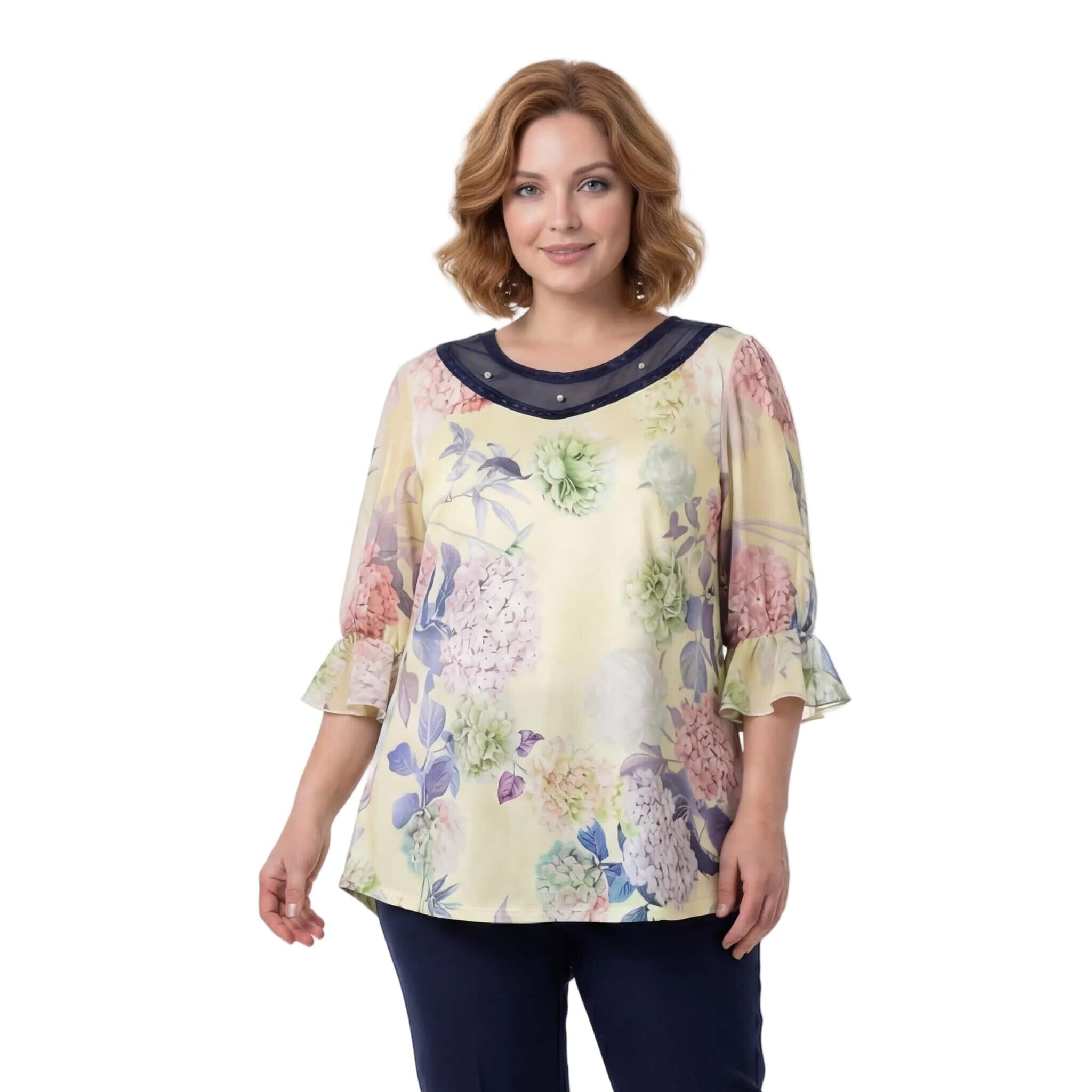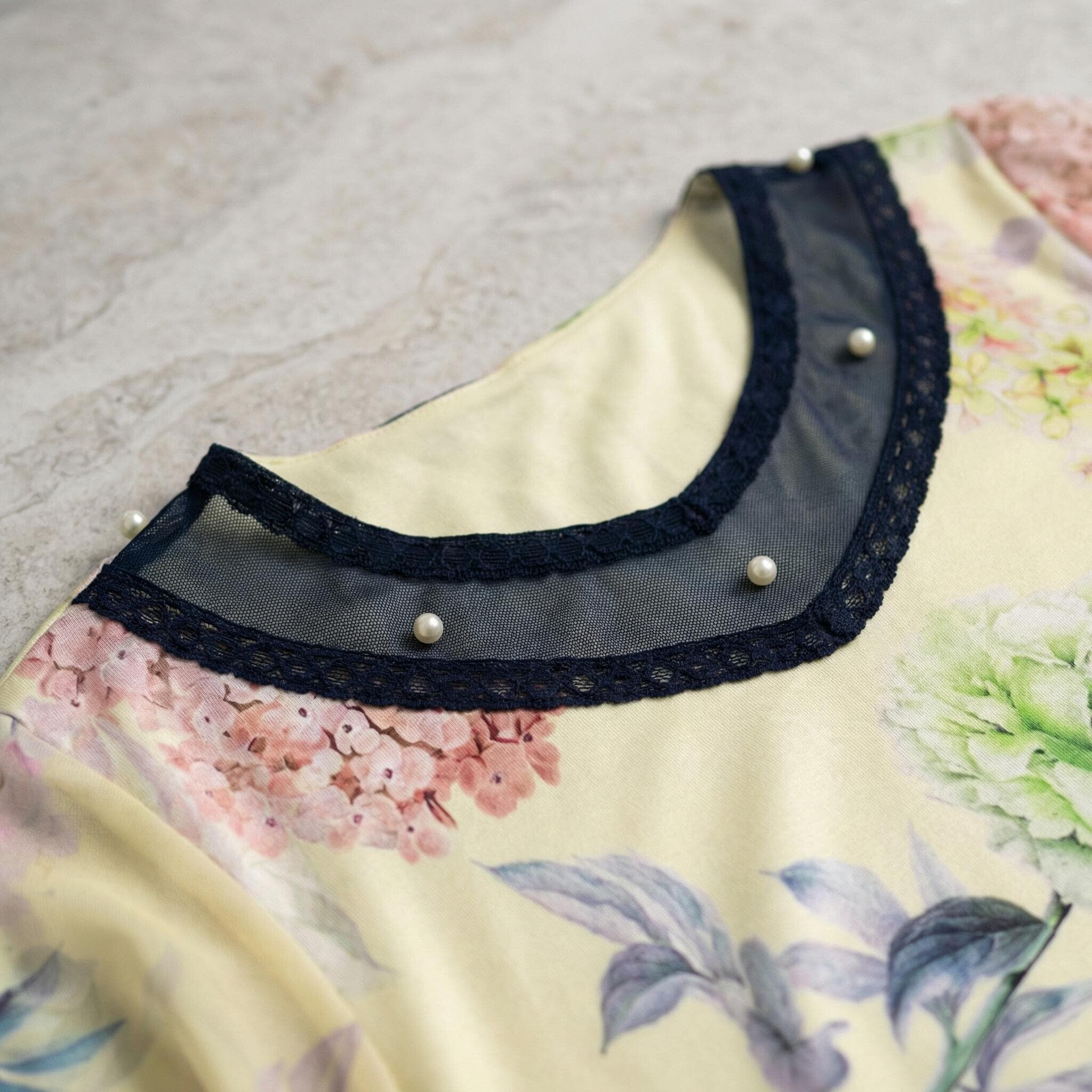 Tunică maxi evazată, oficială, cu flori galbene, perle și tul