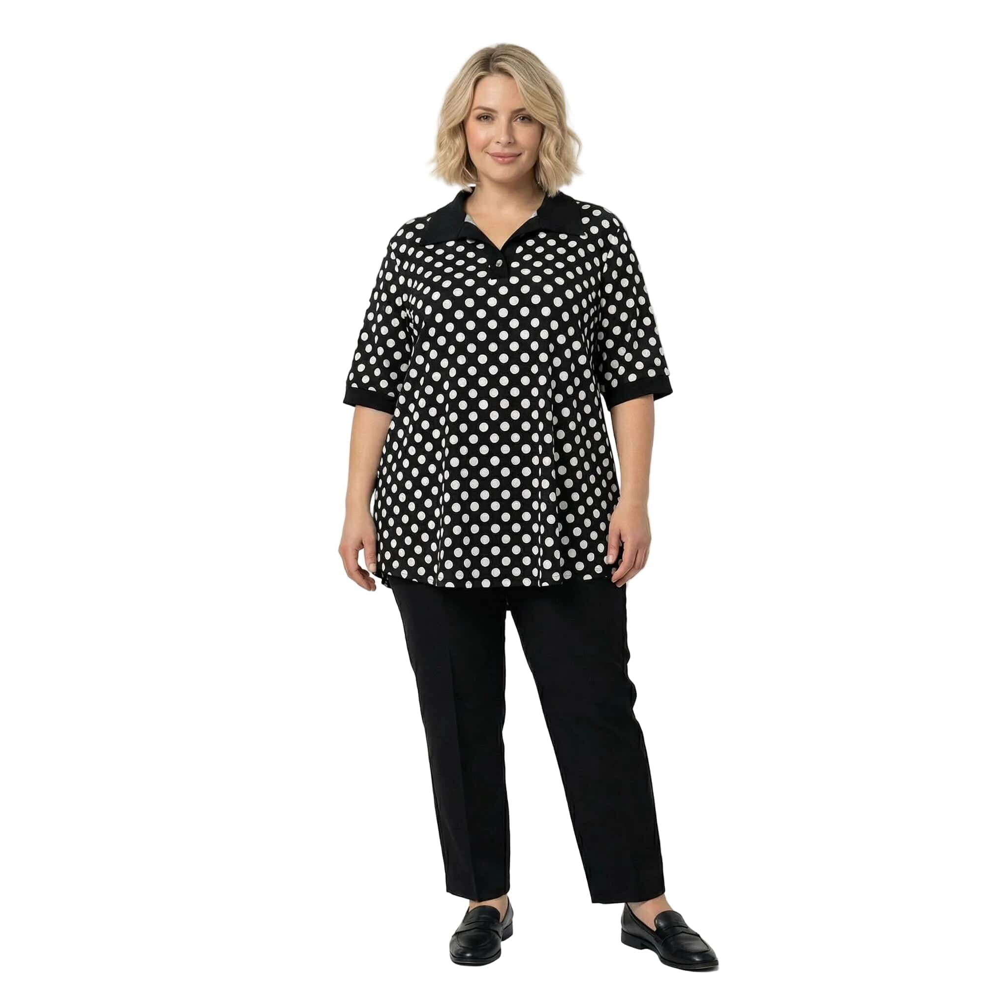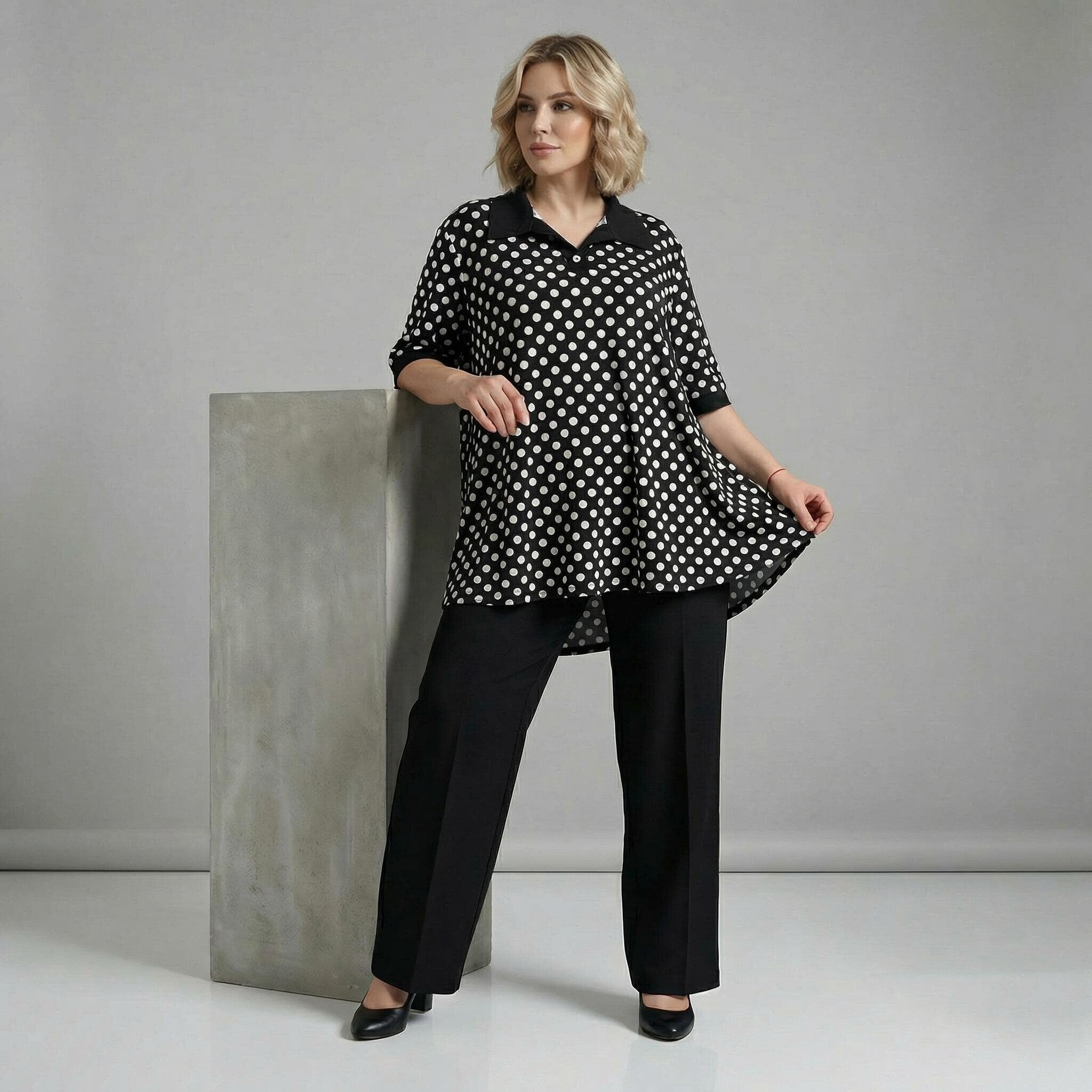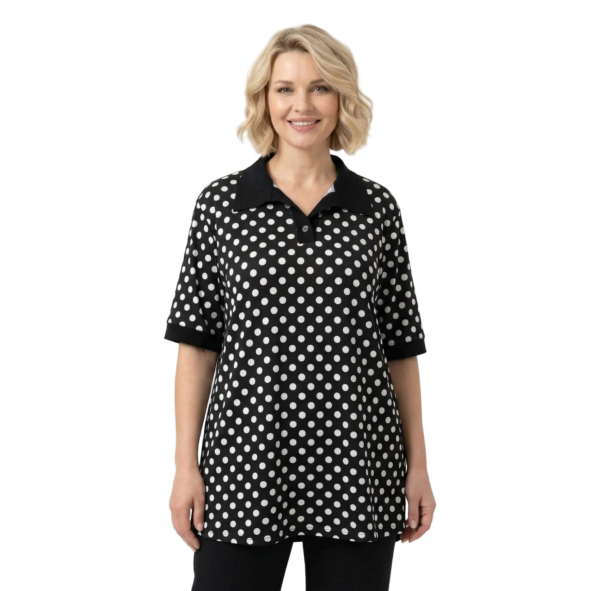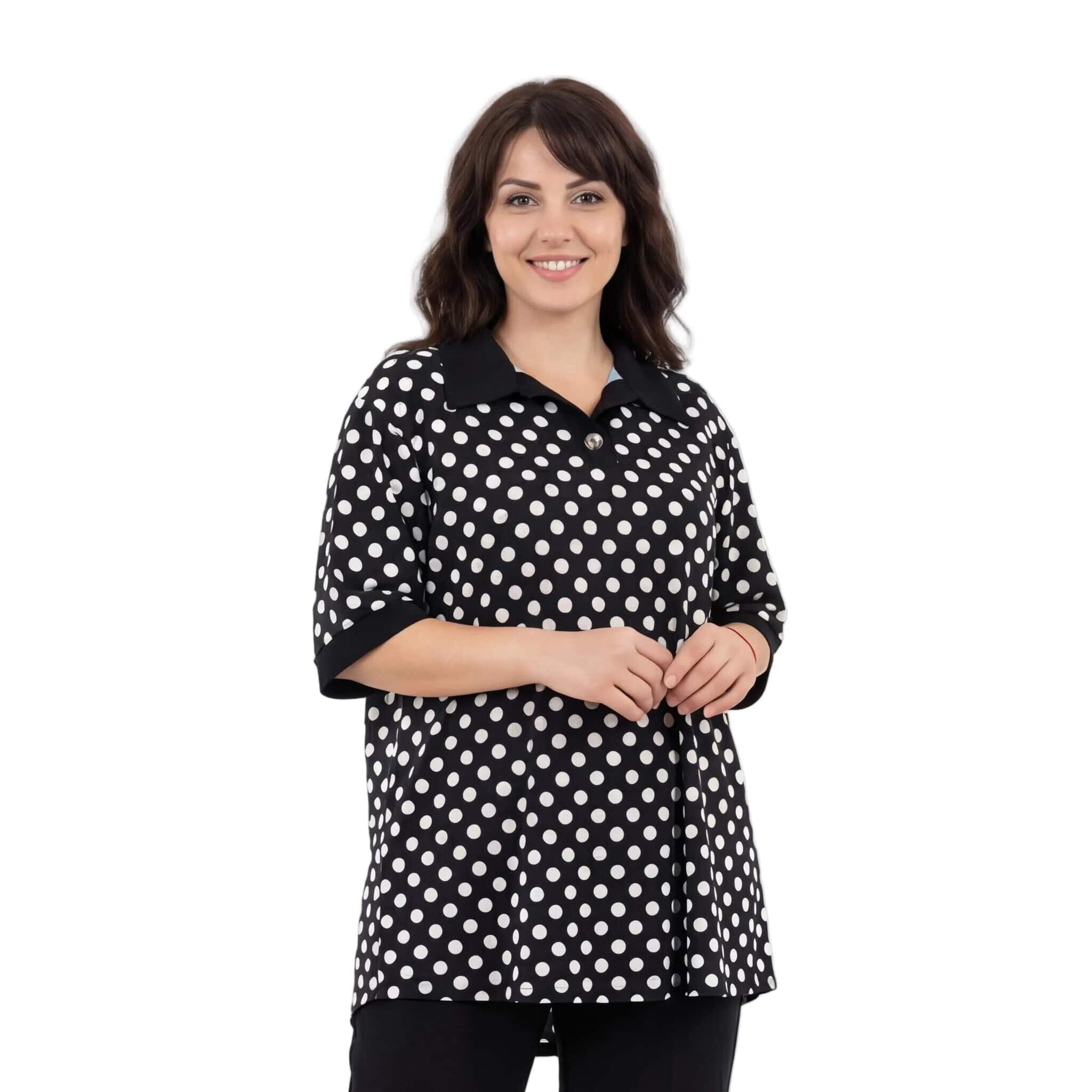 Tunică maxi neagră elegantă cu buline albe și guler