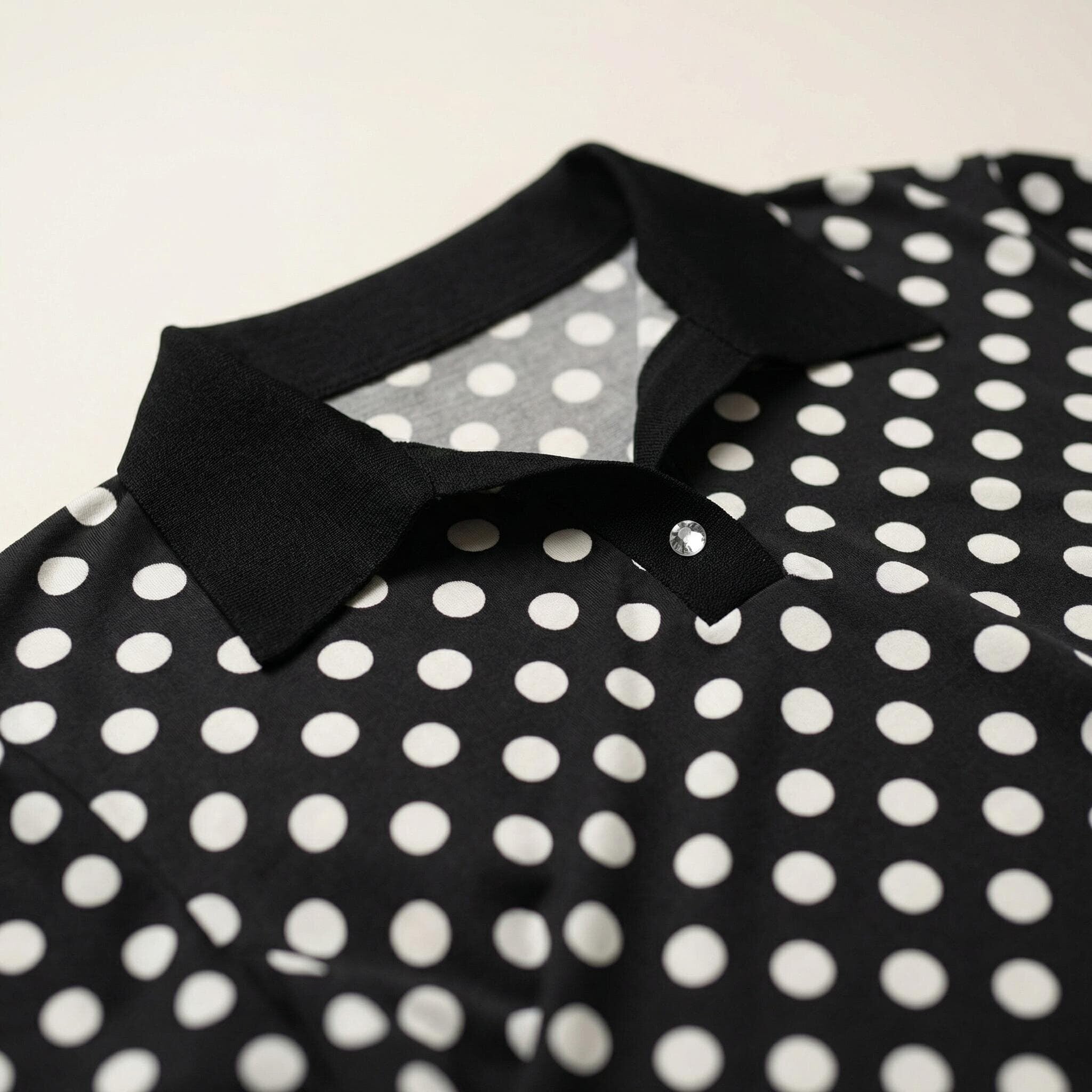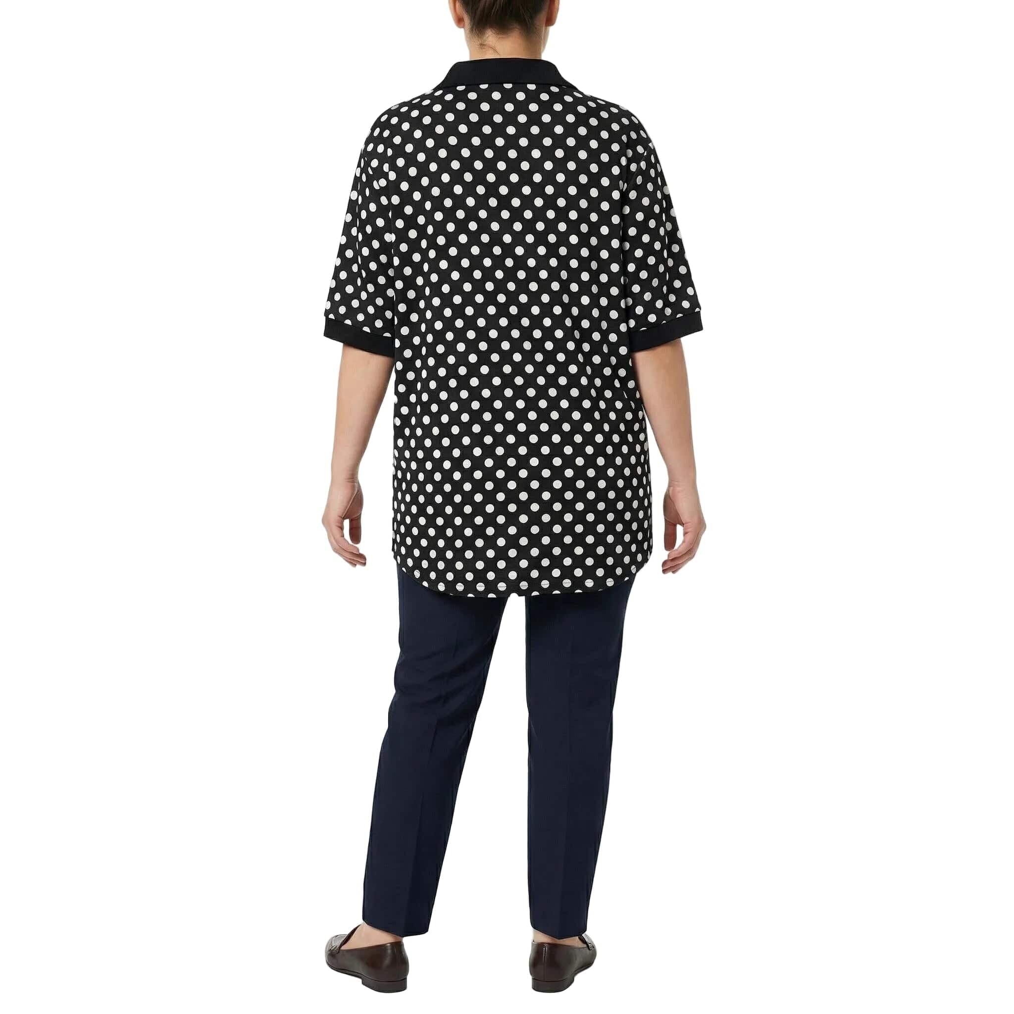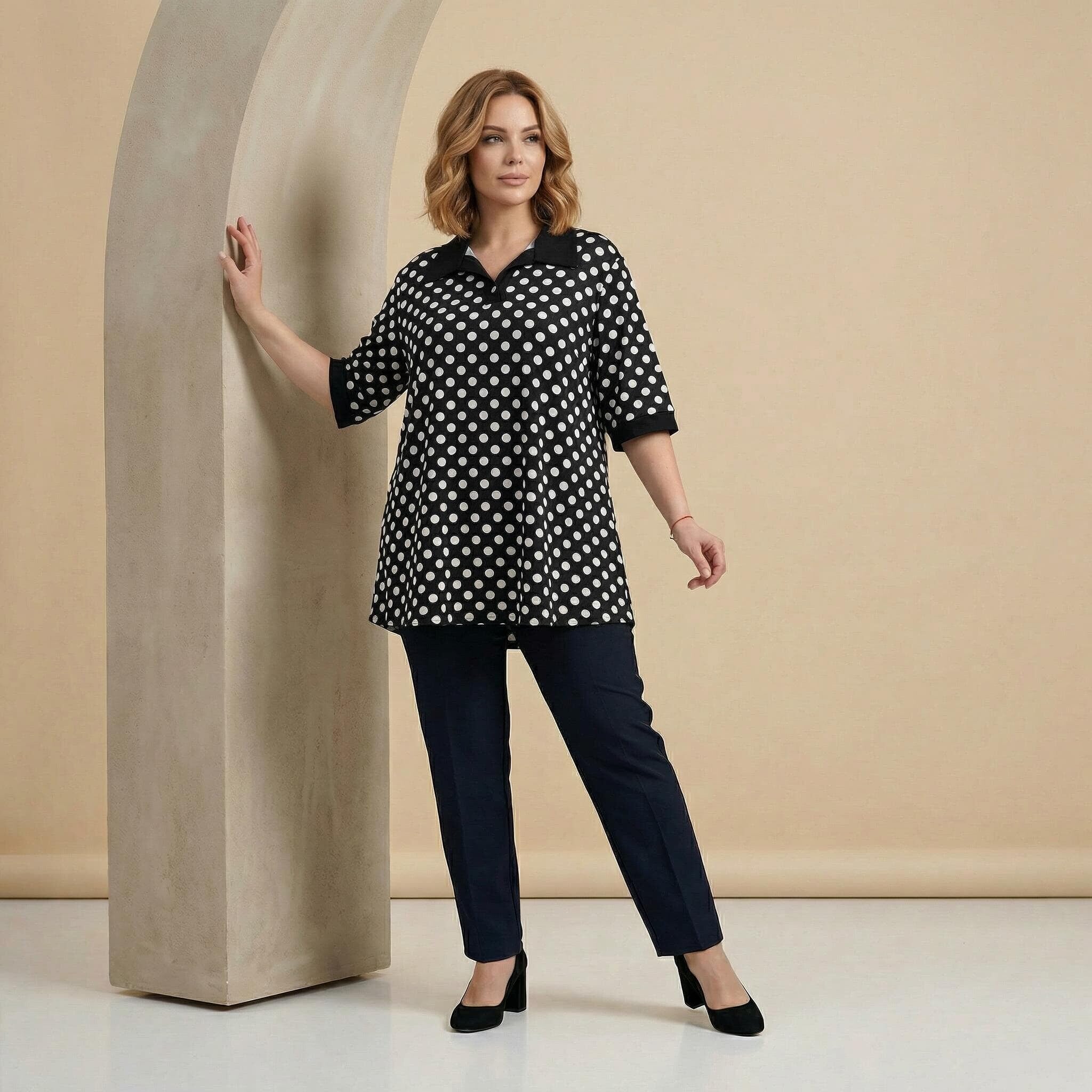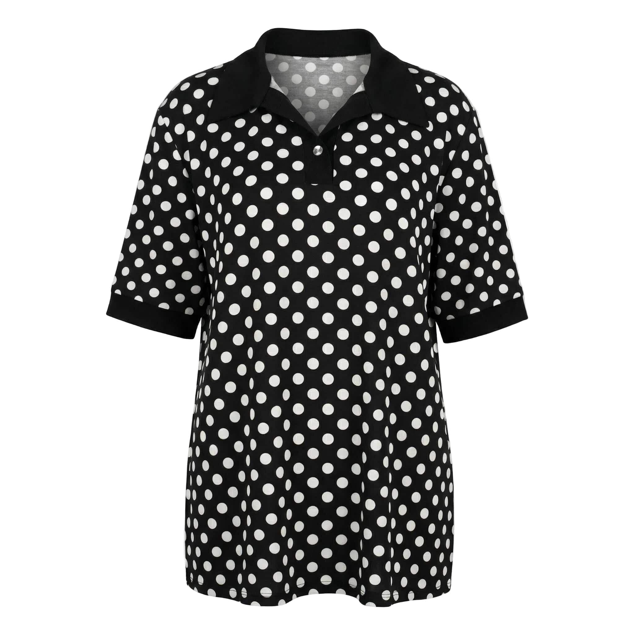 Tunică maxi neagră elegantă cu buline albe și guler