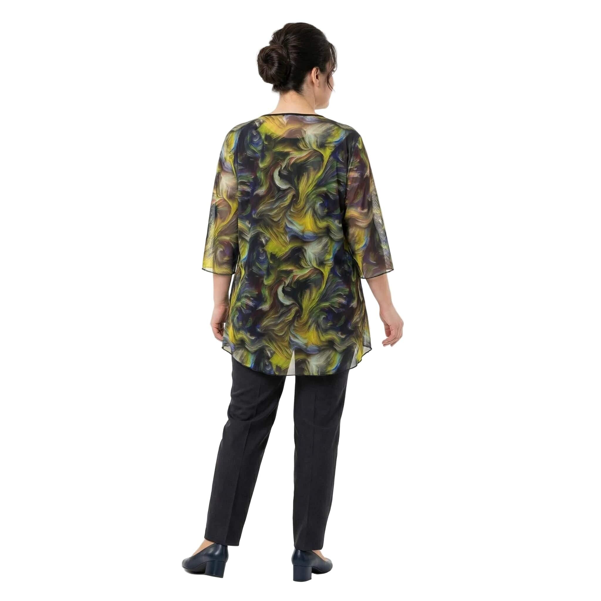 Представяме ви изискана официална макси туника от две части, създадена специално за дами, които ценят стила и комфорта. Този елегантен модел съчетава удобството на долна част тип потник с широка презрамка и ефирността на горна част от красив, пъстър шифон. Благодарение на високото съдържание на памук в състава, туниката е изключително приятна на допир и позволява на кожата да диша през топлите дни на пролетта и лятото. Разкроената кройка пада свободно около тялото, осигурявайки женствен силует и безупречна визия за всеки специален повод. Моделът е с 7/8 ръкав, който добавя допълнителна нотка на изтънченост.