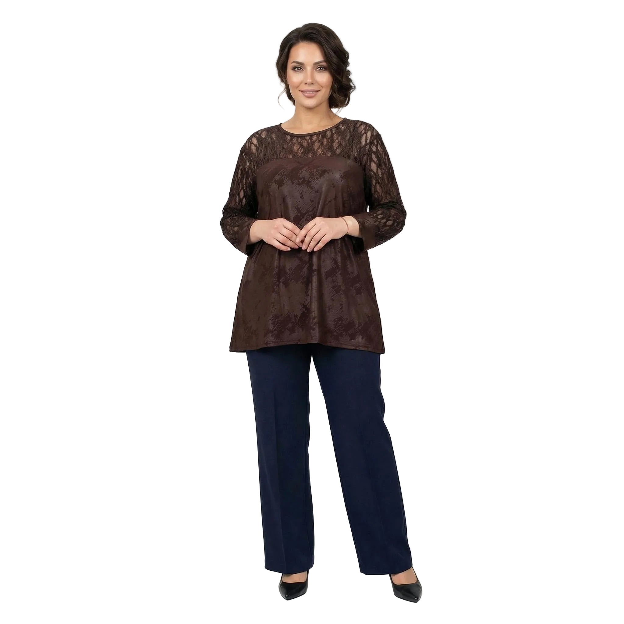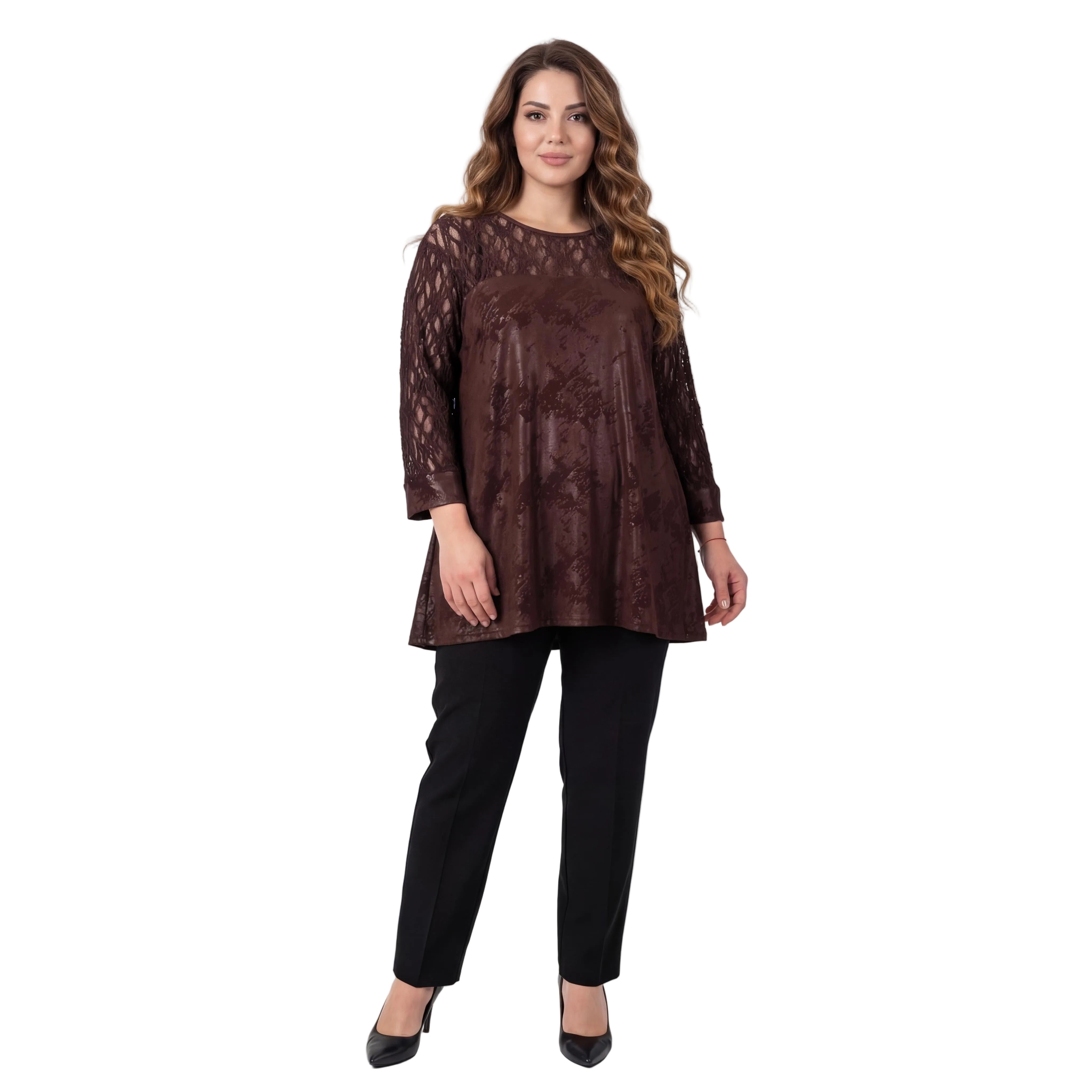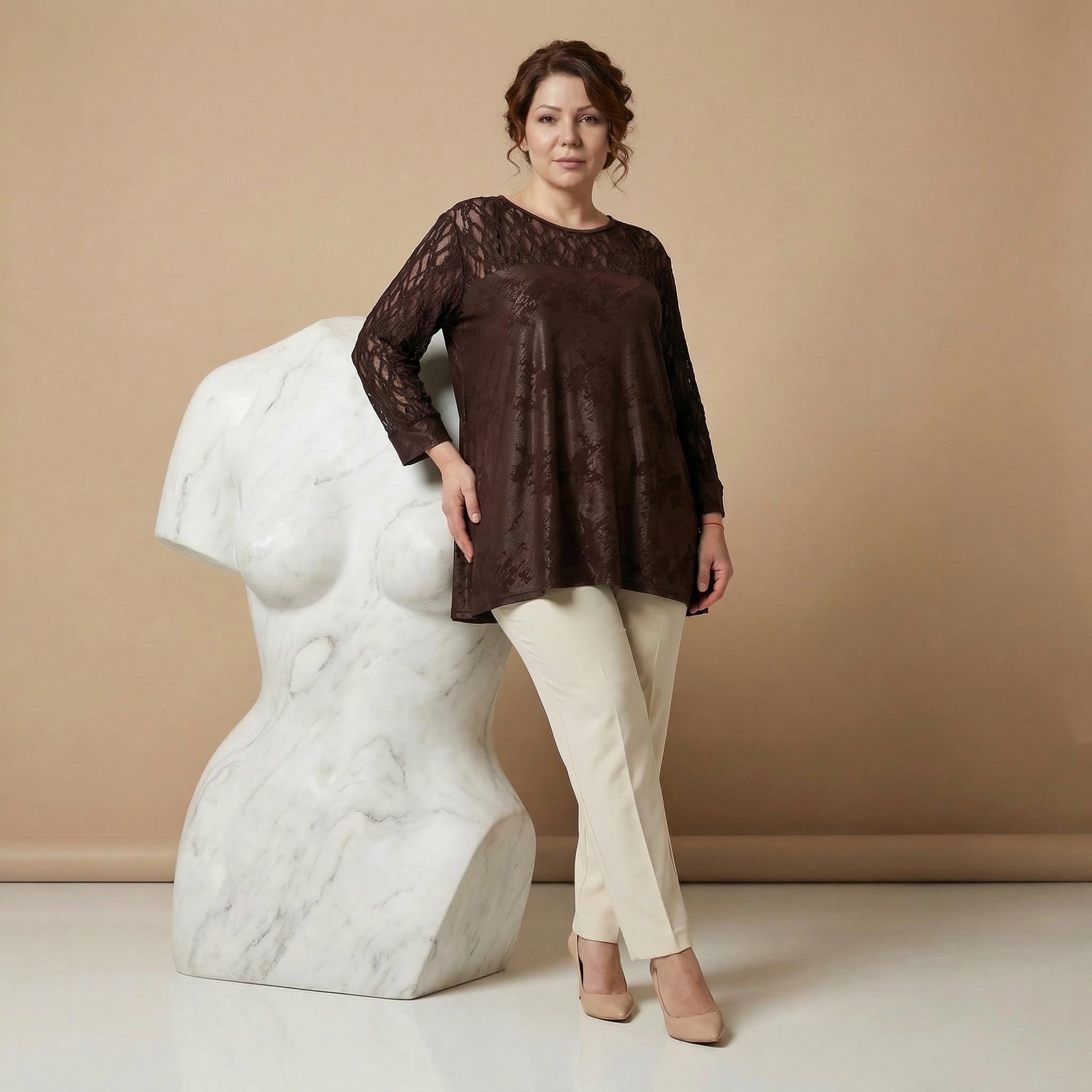 Преобразете визията си с тази елегантна официална макси туника в наситен кафяв цвят, украсена с фина и ефектна дантела. Създадена специално да подчертава женствеността, туниката се отличава с меко падаща, еластична основна материя с деликатен блясък и красив десен. Прозрачната дантелена платка около раменете и ефирните дантелени ръкави придават неподправена изтънченост и стил. Свободната и удобна разкроена кройка с обло деколте осигурява максимален комфорт и грация при всяко движение, правейки този модел идеален избор за сватба, официална вечеря или друг специален повод.